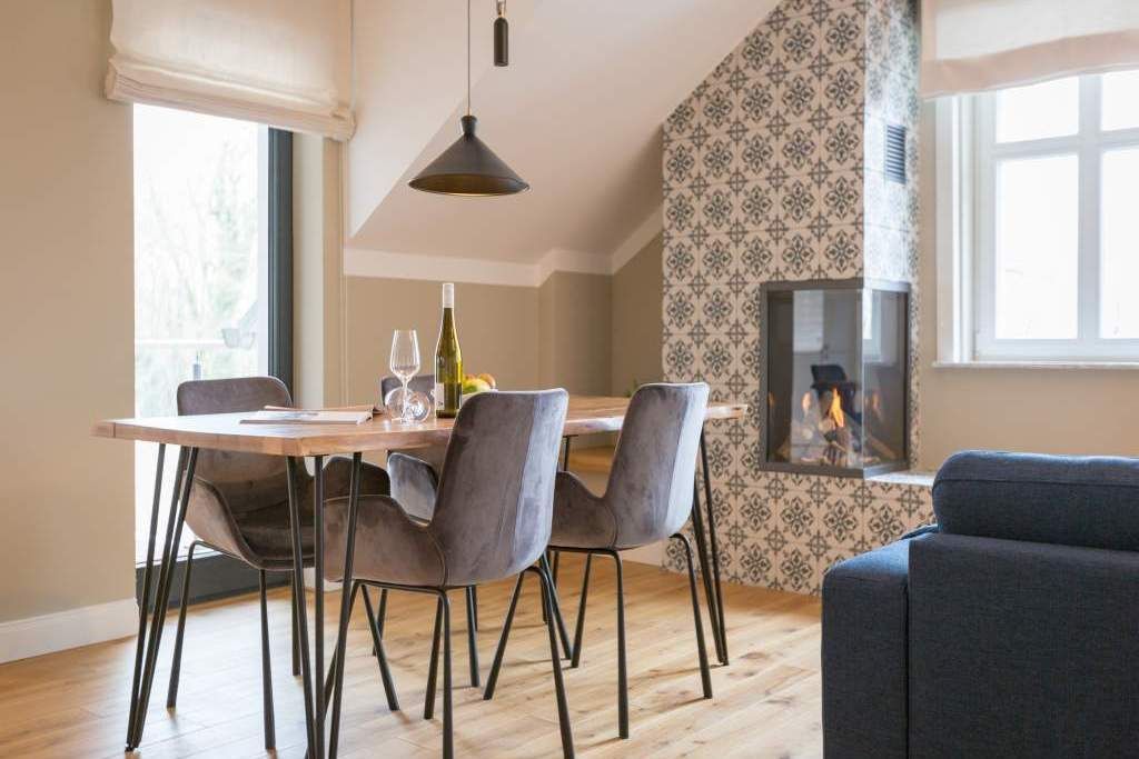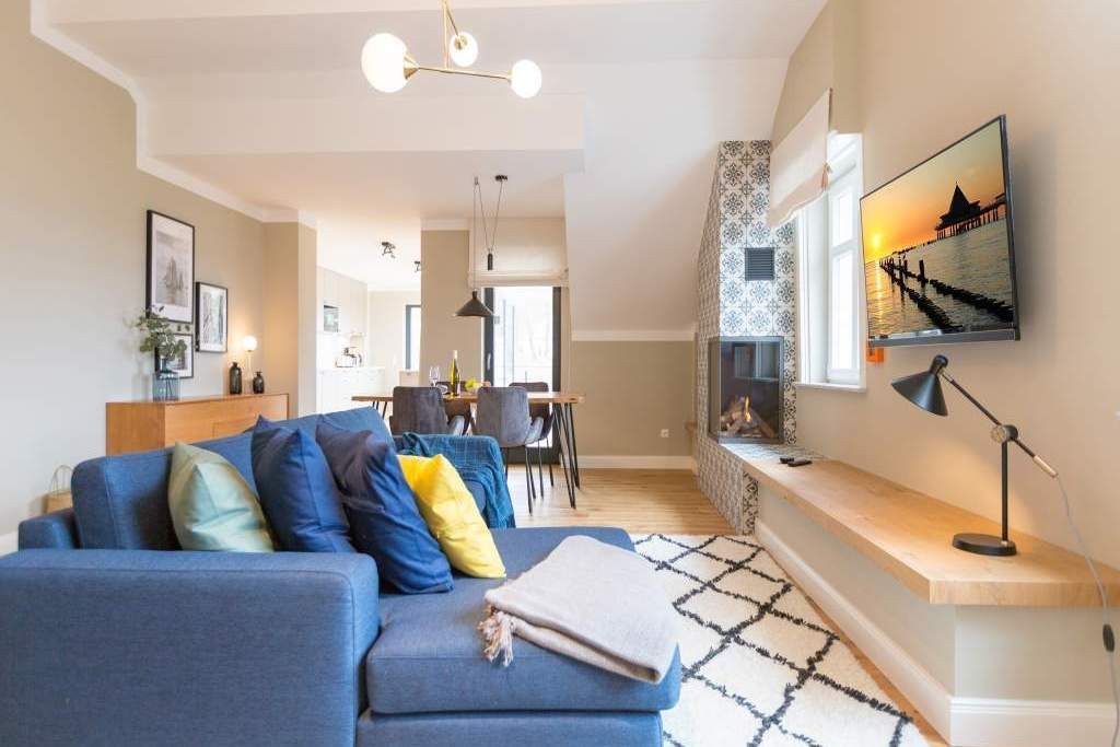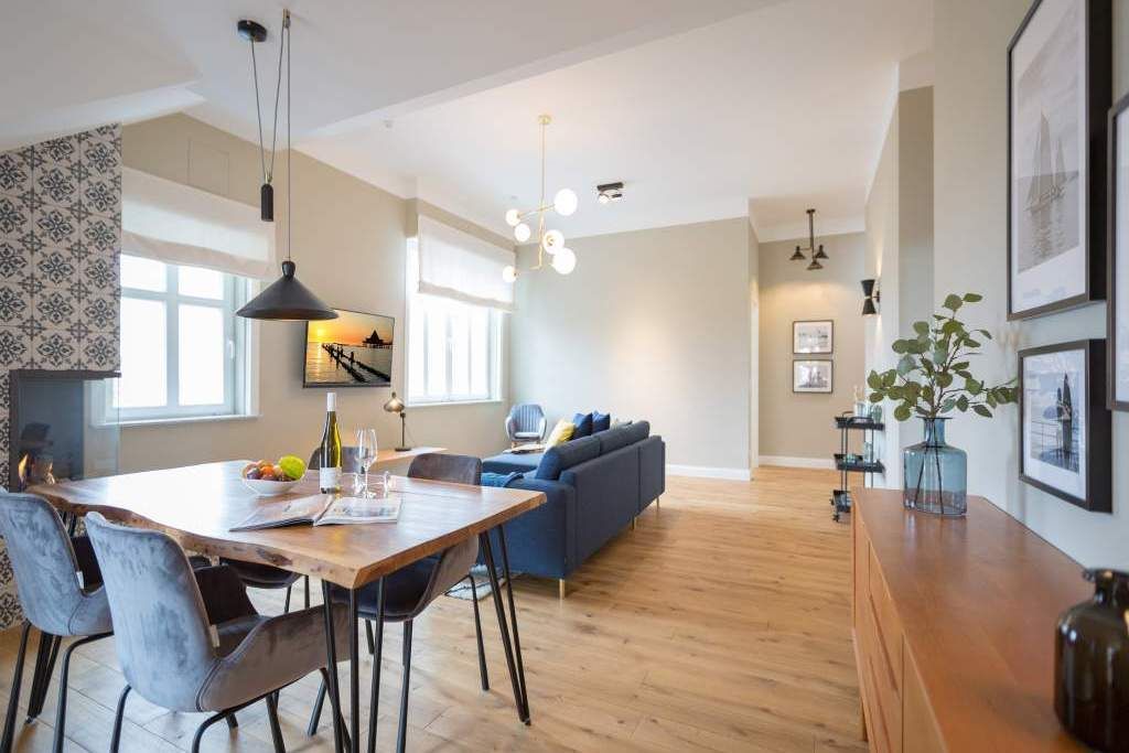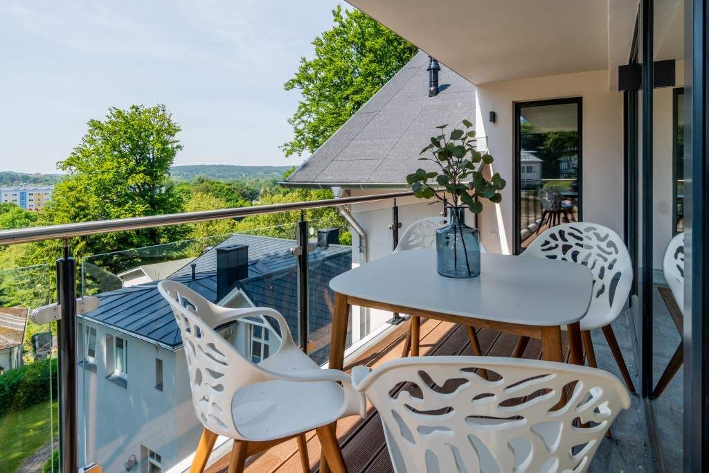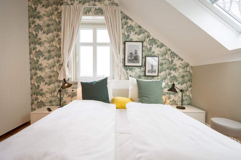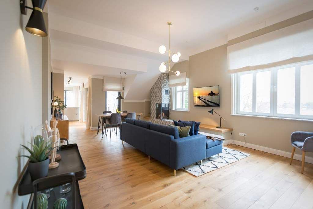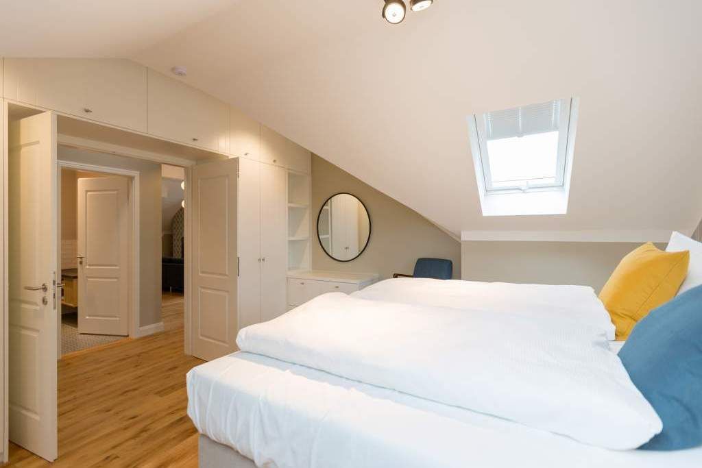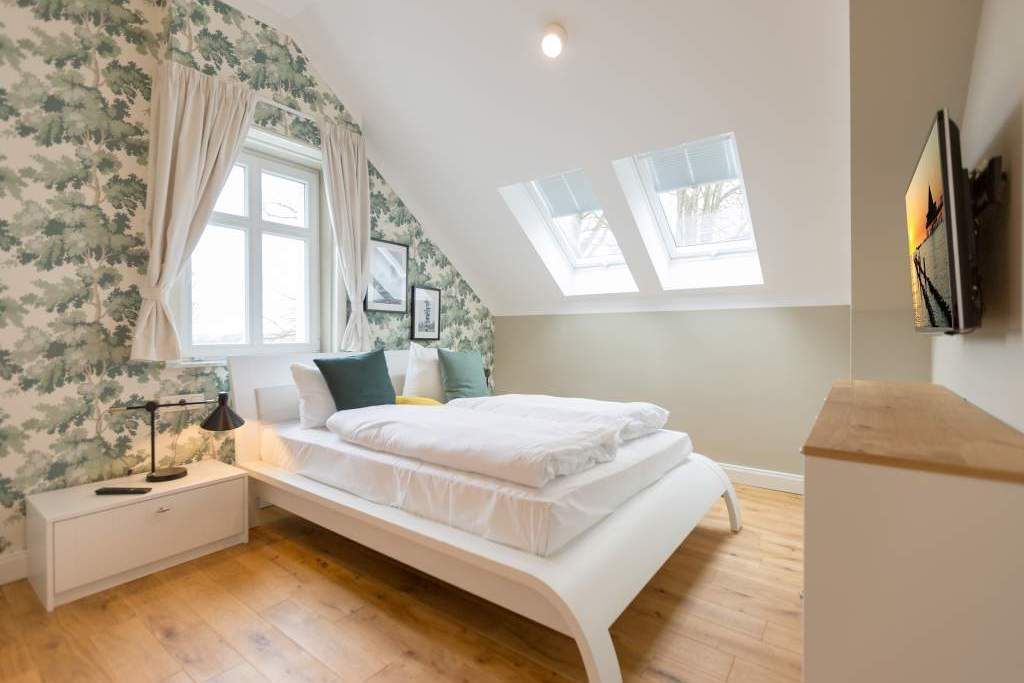 Sie wünschen sich mit Ihrer Familie oder Ihren Freunden eine wirklich exklusive Auszeit mitten im Herzen des Kaiserbades Heringsdorf? Ein Urlaubsdomizil der Extra-Klasse ist die Wohnung 7 im Dachgeschoss der aufwendig sanierten Bädervilla Bellevue. Hier werden Ferienträume wahr! Denn dieser stilvoll eingerichtete Wohntraum bietet auf seinen großzügigen 153 Quadratmetern Raum für vier Erwachsene und zwei Kinder bis drei Jahre (im Kinderreisebett). Jetzt müssen Sie sich nur noch einig werden, wer wo schläft. Denn das Drei-Raum-Appartement wartet mit zwei wunderschönen Schlafzimmern auf. Durch zwei große Flügeltüren gelangt man in das erste Schlafreich. Ein wenig erhöht, auf einem Podest wartet ein komfortables Boxspringdoppelbett (1,80 m x 2,00 m) darauf, Ihnen erholsames Schlafvergnügen zu bereiten. Wie ein Himmel öffnet sich über dem Bett der Giebel bis ins Dach hinein. Von diesem Zimmer aus haben Sie Zugang zum luxuriösen Masterbad. Die wunderschöne Vintagefliesen-Optik, eine frei stehende Badewanne in extravagantem Ei-Design, eine äußerst geräumige Dusche und die Panorama-Sauna definieren den Begriff Wellness neu. Auch das zweite Schlafzimmer ist elegant und exquisit eingerichtet. In dem schicken und bequemen Designer-Doppelbett (1,60 m x 2,00 m) macht nicht nur das Schlafen Spaß. Eine edle Tapete und die hellen Möbel verleihen dem Zimmer ein elegantes Flair. Ein zweites Bad ebenfalls mit Dusche, Waschtisch und WC ausgestattet sorgt für ein entspanntes Frischmachen. Der Wohnbereich ist eine Oase für Entspannungshungrige und Auszeitfreunde. Offen, hell und geschmackvoll designt hier stimmt alles. Angefangen von der großen Sofalandschaft, über die Mid-Century-Design-Klassiker, den schönen, großen Echtholztisch und den von Vintagefliesen eingerahmten Gas-Kamin bis hin zur stylischen und modernen Küche. Hochwertige Geräte und feinstes ASA-Geschirr machen das Kochen und gemeinsame Essen zu einem Erlebnis. In lockerer Atmosphäre können Sie sich am frei stehenden Küchentresen mit Barhockern unterhalten. Entertainment bietet zudem der 42-Zoll-Flat-TV. An das Wohnzimmer angeschlossen ist ein sonnenüberfluteter West-Balkon. Doch wenn Sie richtig Sonne tanken wollen, dann steigen Sie bitte aufs Dach. Über dem Appartement erstreckt sich eine 56 Quadratmeter große Dachterrasse. Hier oben, mit einem grandiosen Blick über die Dächer der schönen Bädervillen des Kulmbergs, vergessen Sie in Windeseile jede Hektik, jeden Stress. Sonnenbaden oder Dinieren beides ist hier möglich. Zur Wohnung gehören außerdem 2 Pkw-Stellplätze dazu. Das WLAN ist kostenfrei nutzbar. Und damit Sie sich wirklich um nichts zu kümmern brauchen, sind die Betten bei der Anreise bezogen und Handtücher liegen bereit.