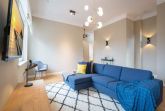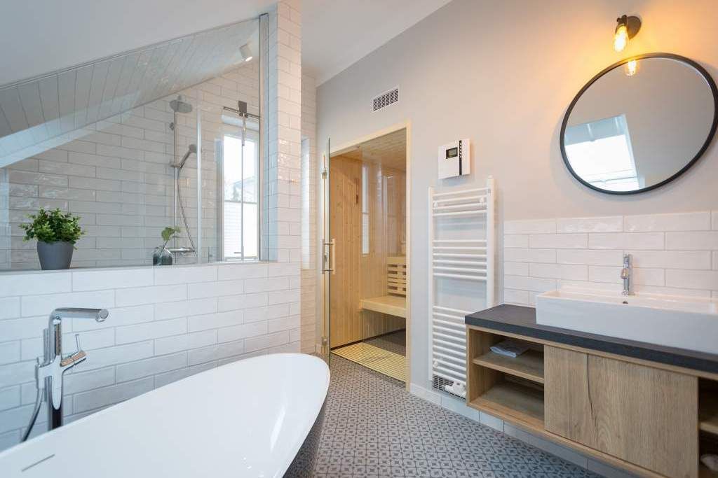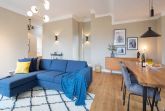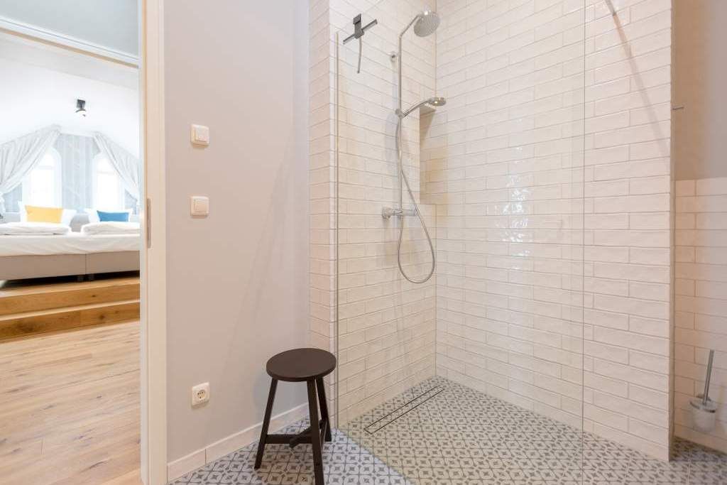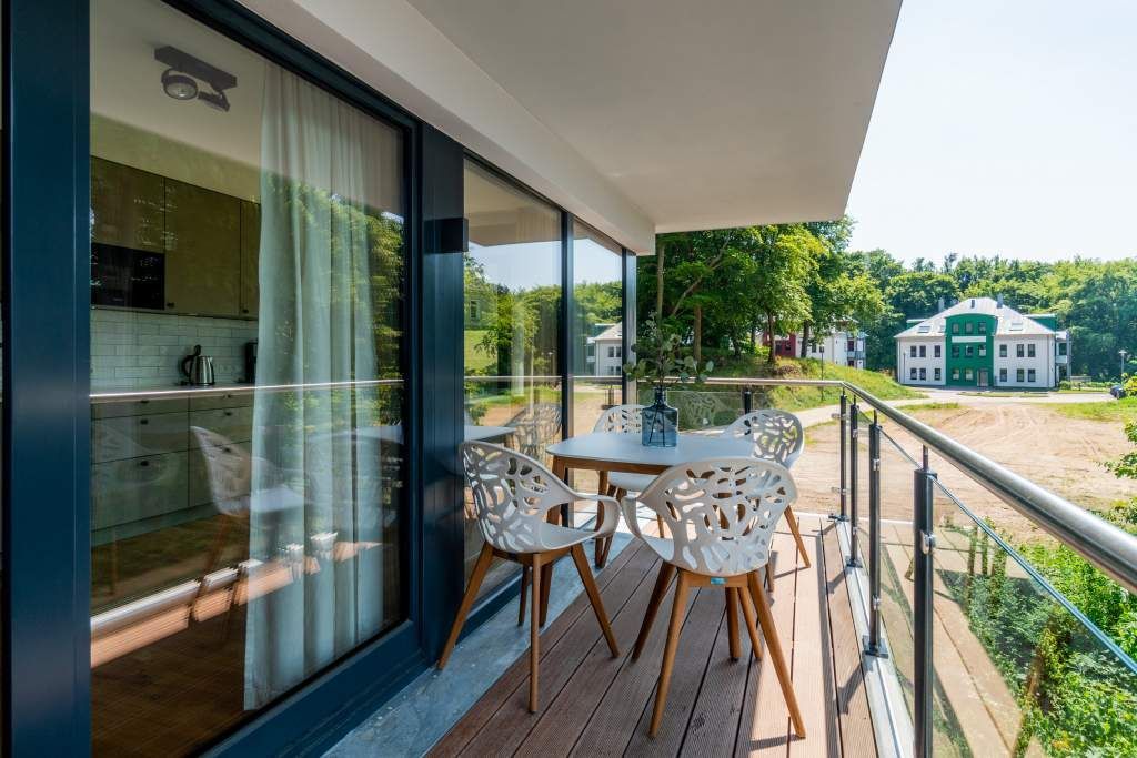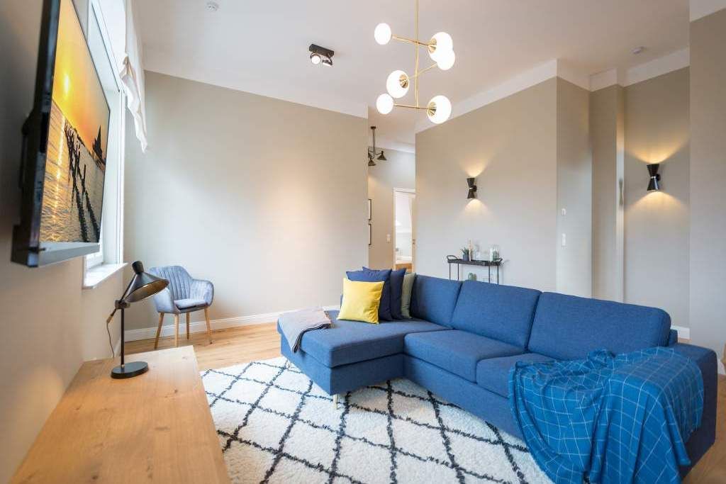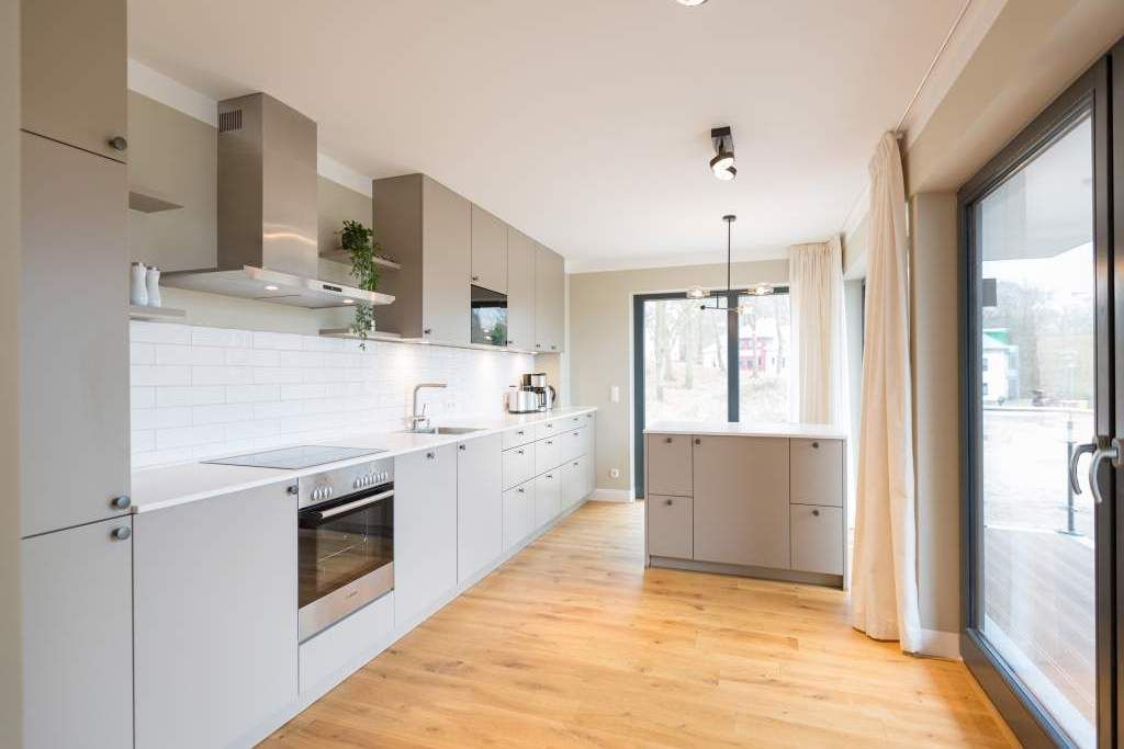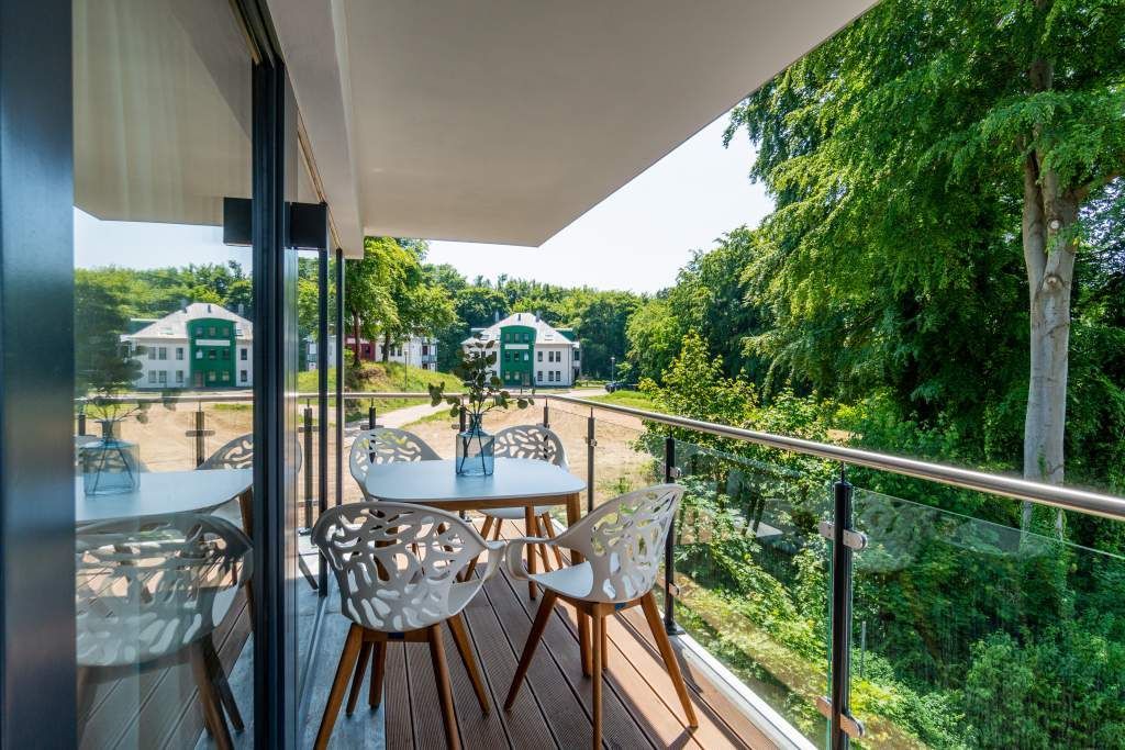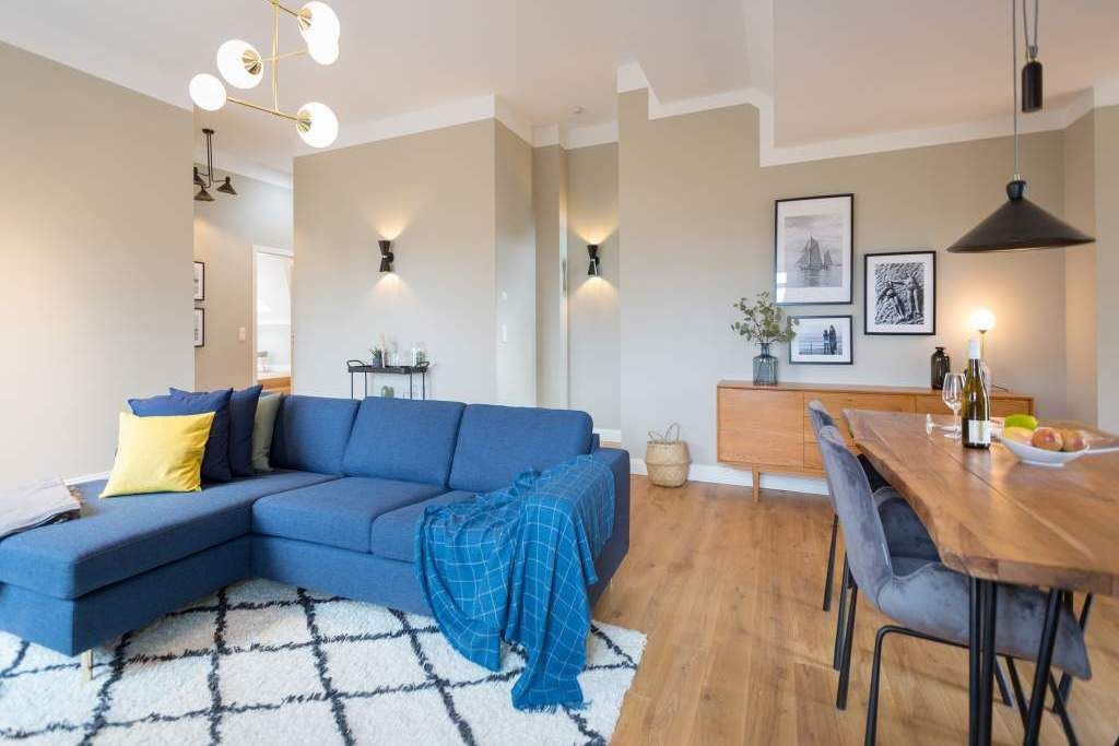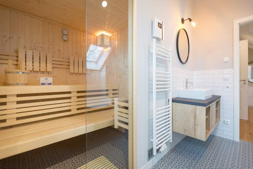 Sie wünschen sich mit Ihrer Familie oder Ihren Freunden eine wirklich exklusive Auszeit mitten im Herzen des Kaiserbades Heringsdorf? Ein Urlaubsdomizil der Extra-Klasse ist die Wohnung 7 im Dachgeschoss der aufwendig sanierten Bädervilla Bellevue. Hier werden Ferienträume wahr! Denn dieser stilvoll eingerichtete Wohntraum bietet auf seinen großzügigen 153 Quadratmetern Raum für vier Erwachsene und zwei Kinder bis drei Jahre (im Kinderreisebett). Jetzt müssen Sie sich nur noch einig werden, wer wo schläft. Denn das Drei-Raum-Appartement wartet mit zwei wunderschönen Schlafzimmern auf. Durch zwei große Flügeltüren gelangt man in das erste Schlafreich. Ein wenig erhöht, auf einem Podest wartet ein komfortables Boxspringdoppelbett (1,80 m x 2,00 m) darauf, Ihnen erholsames Schlafvergnügen zu bereiten. Wie ein Himmel öffnet sich über dem Bett der Giebel bis ins Dach hinein. Von diesem Zimmer aus haben Sie Zugang zum luxuriösen Masterbad. Die wunderschöne Vintagefliesen-Optik, eine frei stehende Badewanne in extravagantem Ei-Design, eine äußerst geräumige Dusche und die Panorama-Sauna definieren den Begriff Wellness neu. Auch das zweite Schlafzimmer ist elegant und exquisit eingerichtet. In dem schicken und bequemen Designer-Doppelbett (1,60 m x 2,00 m) macht nicht nur das Schlafen Spaß. Eine edle Tapete und die hellen Möbel verleihen dem Zimmer ein elegantes Flair. Ein zweites Bad ebenfalls mit Dusche, Waschtisch und WC ausgestattet sorgt für ein entspanntes Frischmachen. Der Wohnbereich ist eine Oase für Entspannungshungrige und Auszeitfreunde. Offen, hell und geschmackvoll designt hier stimmt alles. Angefangen von der großen Sofalandschaft, über die Mid-Century-Design-Klassiker, den schönen, großen Echtholztisch und den von Vintagefliesen eingerahmten Gas-Kamin bis hin zur stylischen und modernen Küche. Hochwertige Geräte und feinstes ASA-Geschirr machen das Kochen und gemeinsame Essen zu einem Erlebnis. In lockerer Atmosphäre können Sie sich am frei stehenden Küchentresen mit Barhockern unterhalten. Entertainment bietet zudem der 42-Zoll-Flat-TV. An das Wohnzimmer angeschlossen ist ein sonnenüberfluteter West-Balkon. Doch wenn Sie richtig Sonne tanken wollen, dann steigen Sie bitte aufs Dach. Über dem Appartement erstreckt sich eine 56 Quadratmeter große Dachterrasse. Hier oben, mit einem grandiosen Blick über die Dächer der schönen Bädervillen des Kulmbergs, vergessen Sie in Windeseile jede Hektik, jeden Stress. Sonnenbaden oder Dinieren beides ist hier möglich. Zur Wohnung gehören außerdem 2 Pkw-Stellplätze dazu. Das WLAN ist kostenfrei nutzbar. Und damit Sie sich wirklich um nichts zu kümmern brauchen, sind die Betten bei der Anreise bezogen und Handtücher liegen bereit.
