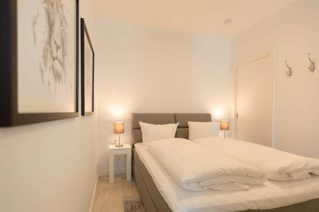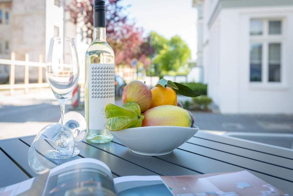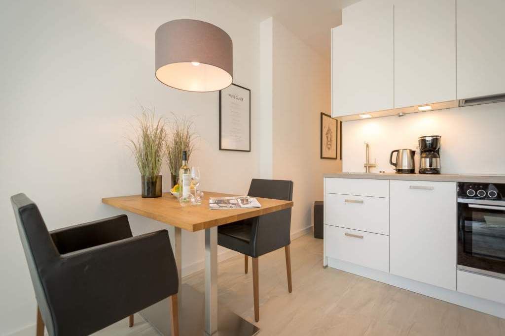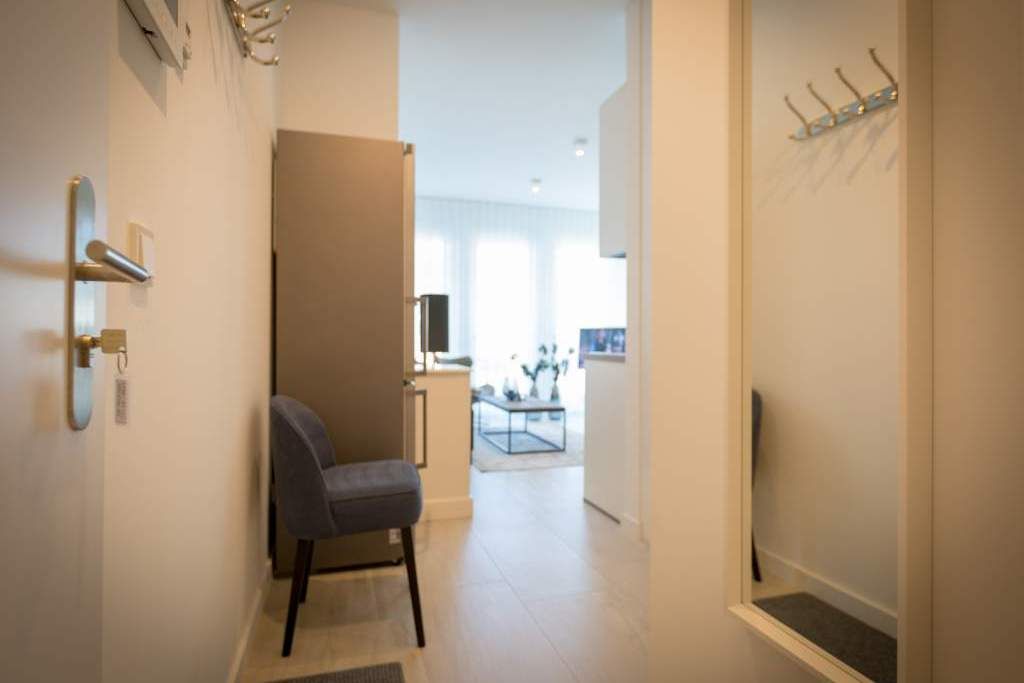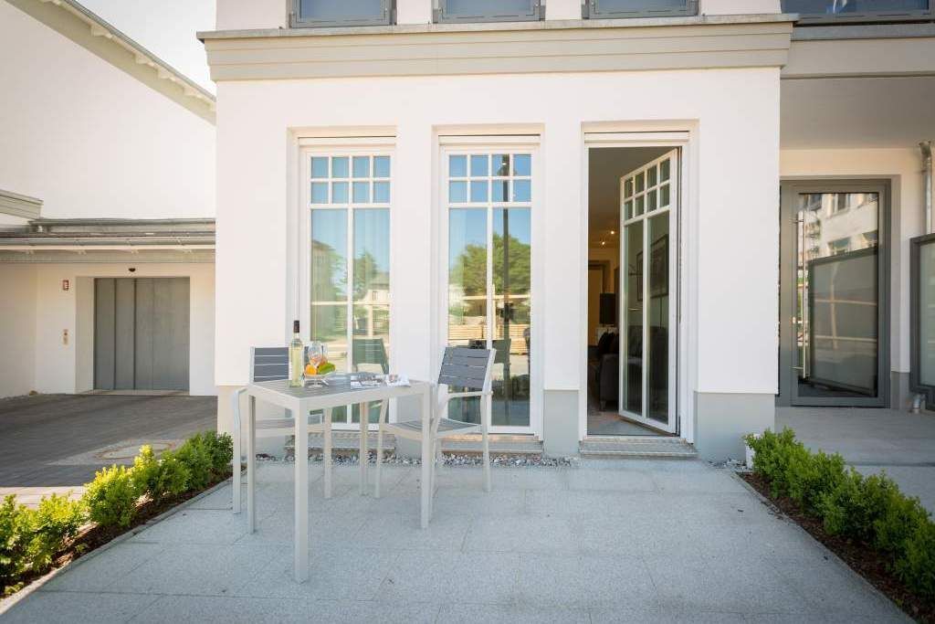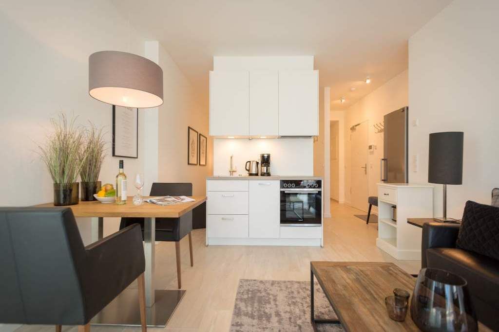 Ein kühles Getränk in der Hand, den lauen Sommerabend auf der Terrasse genießen. Unweit der Promenade mit Zugang zur Ostsee weht eine leichte Brise. Urlaubsgenuss pur mit einem Hauch von Salz in der Luft und jeder Menge Wohn-Style. Das Ein-Zimmer-Appartement Nummer 1 im Erdgeschoss des Westendpalais empfängt Sie mit einer eleganten und modernen Einrichtung. Zu zweit mit kleinem Kind bis zu drei Jahren im Kinderreisebett oder Ihrem geliebten Vierbeiner können Sie hier eine kuschelige und entspannte Auszeit am Meer erleben. Das helle und luftige Wohn-Esszimmer bietet allen Komfort, den man sich nur wünschen kann. Flat-TV, bequeme Sitz- und Relax-Möbel, einen schönen Essbereich, eine offene Küche, ausgestattet mit hochwertigen Geräten und Geschirr, eine kleine Terrasse mit seitlichem Blick in Richtung Meer hier dürfen Sie einfach ankommen. Schalten Sie ab und tanken Sie neue Energie. Der Schlafbereich ist vom offenen Wohnzimmer ein wenig abgeteilt. Das große und komfortable Boxspringdoppelbett (1,80 m x 2,00 m) verspricht nicht nur Schlafvergnügen. Der passgenaue Einbauschrank bietet Ablagefläche und beherbergt einen weiteren Flat-TV. Das Badezimmer ist geräumig, hat eine ebenerdige Regen-Dusche, in der Sie sogar zu zweit genügend Platz haben und wartet mit einem echten Highlight auf. Eine Finnische Sauna heizt Ihnen an kühlen Tagen und Abenden ordentlich ein. Damit Ihnen kuschelig warm wird. Das Appartement verfügt über einen Pkw-Stellplatz in der Tiefgarage. Für Ihren uneingeschränkten Komfort sind die Betten bezogen und Handtücher liegen bereit. Die Nutzung des WLAN-Netzes ist kostenfrei.