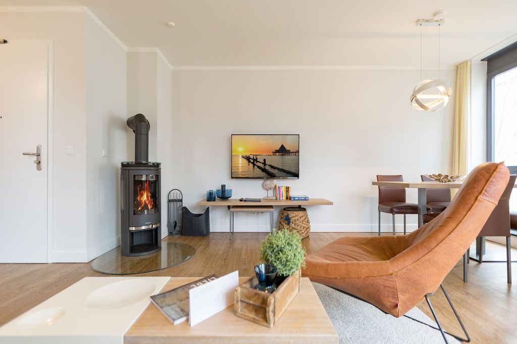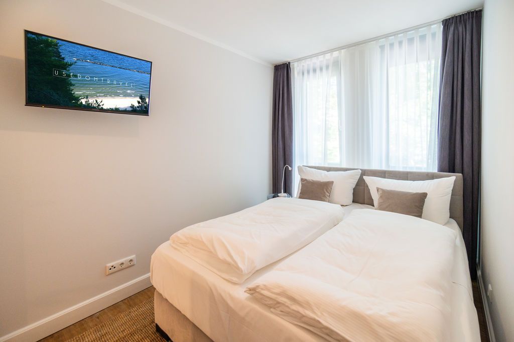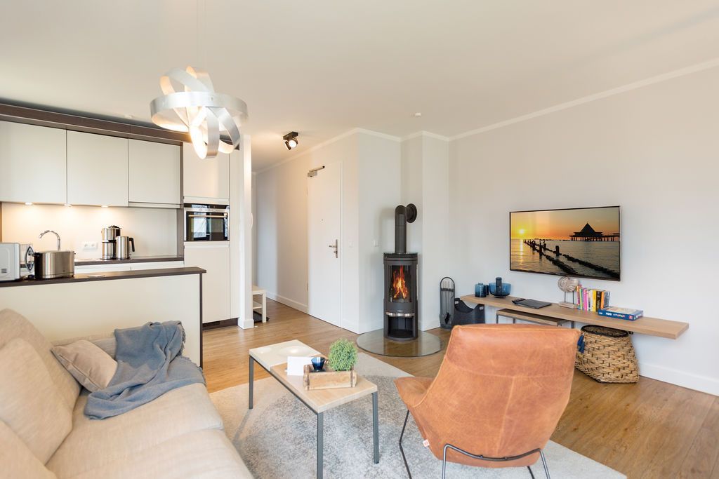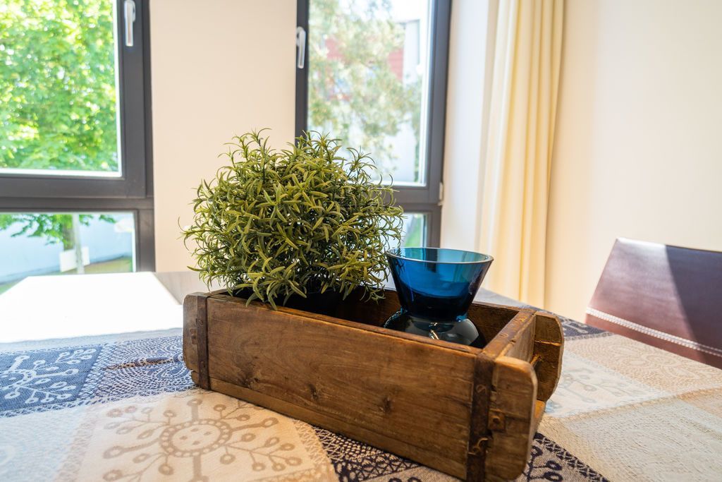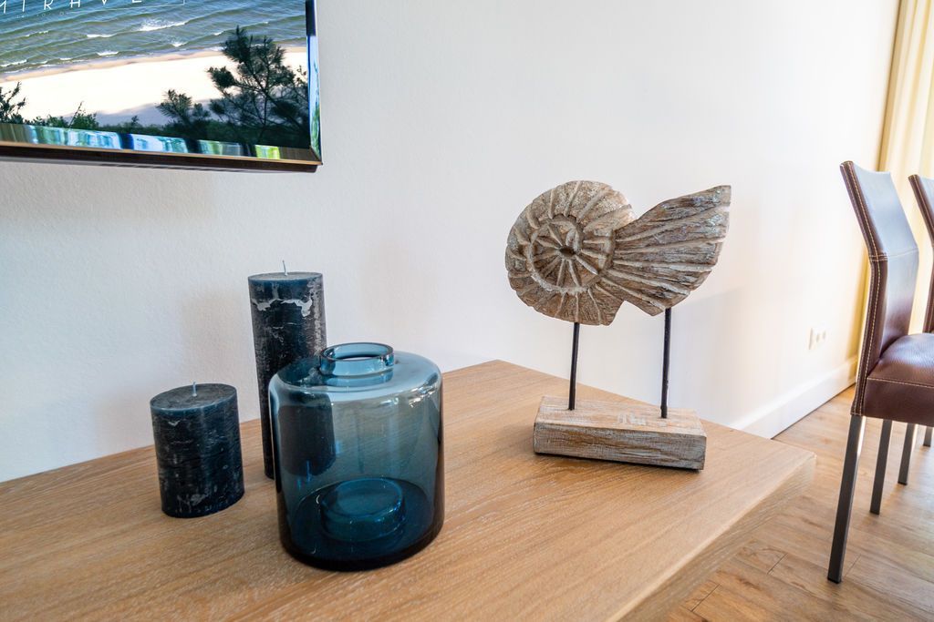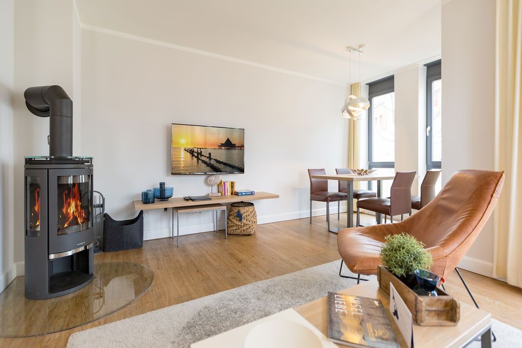 Maritime Farben, maritimes Flair im Appartement Nummer 3 im ersten Obergeschoss der Villa Maxim können Sie die Ostsee und den Strand förmlich spüren. Denn das Ambiente ist eigens auf die Farben Blau und Sand abgestimmt. Naturmaterialien geben der Wohnung einen echten Wohlfühlcharakter. Bis zu vier Personen und ein Kleinkind (im Kinderreisebett) haben auf den 70 Quadratmetern viel Platz. Das Appartement verfügt über zwei schöne Schlafzimmer mit bequemen Boxspringdoppelbetten (1,80 m x 2,00 m und 1,60 m x 2,00 m). Hier werden Sie schlafen wie auf Wolken. Das größere der beiden Schlafräume besitzt sogar einen eigenen kleinen Balkon an der Hausseite. Die Schränke bieten ausreichend Stauraum. Sollte der Schlaf doch einmal auf sich warten lassen oder Sie einen Tag im Bett verbringen wollen, sorgt der Flat-TV in jedem Zimmer für Unterhaltung. Doch nun zum eigentlichen Highlight der Wohnung: dem geräumigen Wohn-Esszimmer. Hier finden Sie alles, was Sie zum Ausspannen brauchen. Eine gemütliche Sofaecke mit Flat-TV und sogar einen Kaminofen, der Ihnen an kühlen Tagen und Abenden wohlige Wärme spendet. Allein dem Flammenspiel zuzuschauen, ist schon Erholung. Am Esstisch befinden sich vier bequeme Leder-Stühle. Lassen Sie sich hier oder am Tisch auf dem sonnigen Süd-Balkon zum Essen oder gemeinsamen Plauschen nieder. So beginnt der Urlaubstag schon beim Frühstücken relaxed. Zum Zubereiten und Kochen jeglicher Gerichte finden Sie alles in der offenen Wohnküche. Hochwertige Geräte wie Kühlschrank mit Gefriermöglichkeit, Herd, Backofen, Mikrowelle oder Kaffeemaschine erleichtern die Arbeit. Auch edles Geschirr befindet sich in den Schränken. Das geräumige Badezimmer ist mit einer ebenerdigen Dusche, einem Waschtisch und einem WC ausgestattet. Sie brauchen auch im Urlaub einen Internetanschluss? Kein Problem. In der Wohnung steht Ihnen kostenfrei WLAN zur Verfügung. Ein zusätzliches Guddi ist die kleine Wellness-Oase mit zwei Saunen, einem Relax Raum und Duschen im Erdgeschoss der Villa, die Sie gern unentgeltlich mitbenutzen können. Für Ihren Pkw gibt es einen Außenstellplatz. Bei Anreise liegen Handtücher für Sie bereit und die Betten sind natürlich schon bezogen.