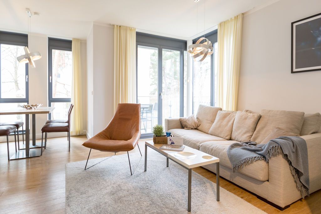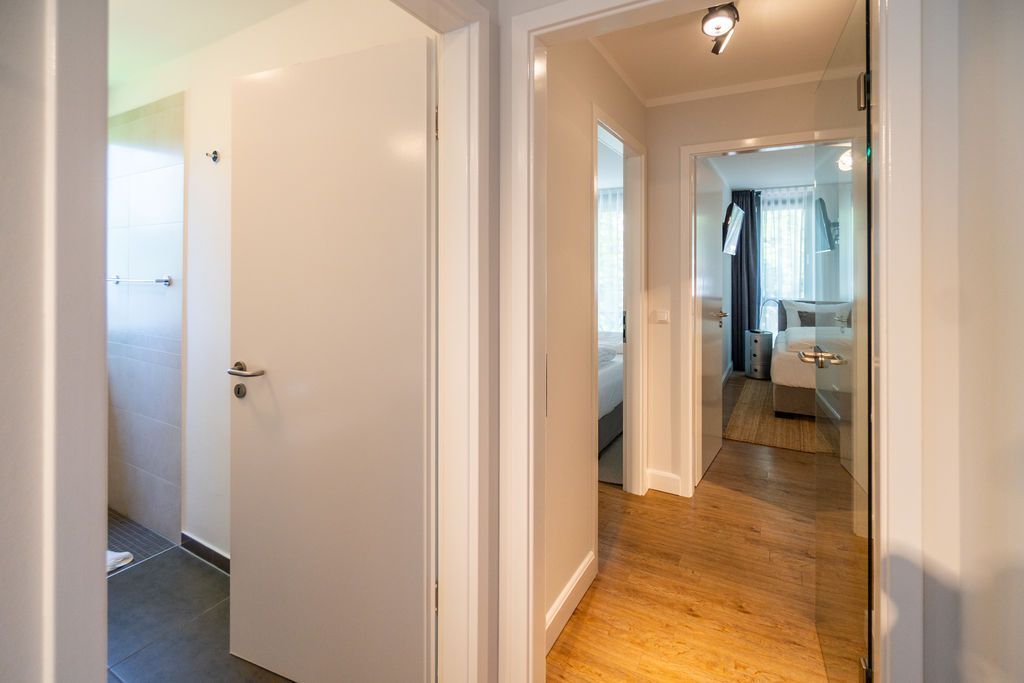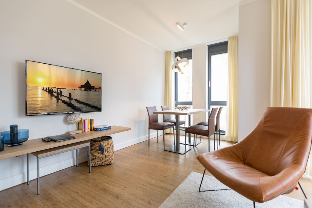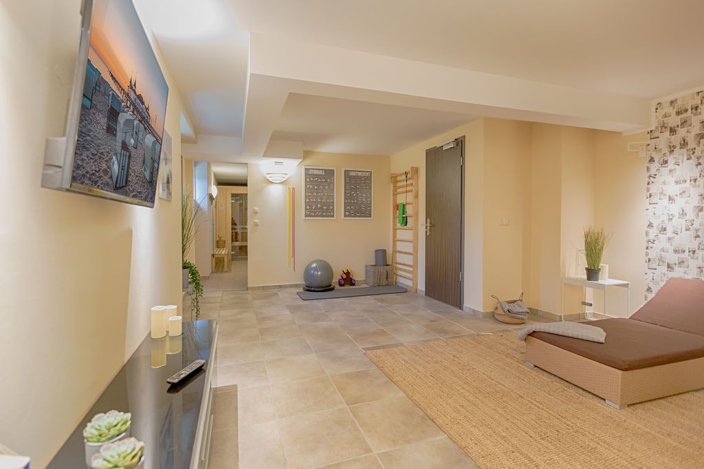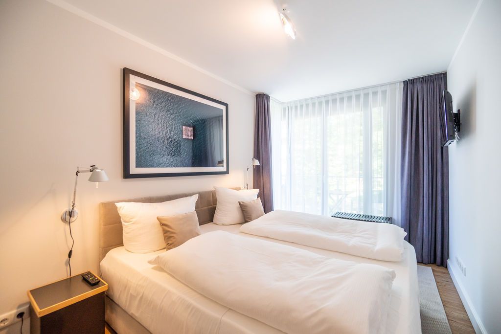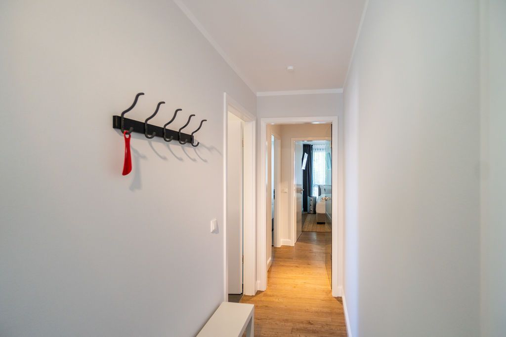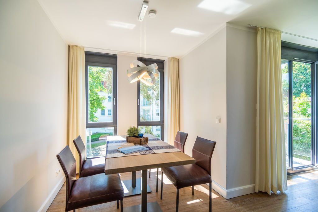 Maritime Farben, maritimes Flair im Appartement Nummer 3 im ersten Obergeschoss der Villa Maxim können Sie die Ostsee und den Strand förmlich spüren. Denn das Ambiente ist eigens auf die Farben Blau und Sand abgestimmt. Naturmaterialien geben der Wohnung einen echten Wohlfühlcharakter. Bis zu vier Personen und ein Kleinkind (im Kinderreisebett) haben auf den 70 Quadratmetern viel Platz. Das Appartement verfügt über zwei schöne Schlafzimmer mit bequemen Boxspringdoppelbetten (1,80 m x 2,00 m und 1,60 m x 2,00 m). Hier werden Sie schlafen wie auf Wolken. Das größere der beiden Schlafräume besitzt sogar einen eigenen kleinen Balkon an der Hausseite. Die Schränke bieten ausreichend Stauraum. Sollte der Schlaf doch einmal auf sich warten lassen oder Sie einen Tag im Bett verbringen wollen, sorgt der Flat-TV in jedem Zimmer für Unterhaltung. Doch nun zum eigentlichen Highlight der Wohnung: dem geräumigen Wohn-Esszimmer. Hier finden Sie alles, was Sie zum Ausspannen brauchen. Eine gemütliche Sofaecke mit Flat-TV und sogar einen Kaminofen, der Ihnen an kühlen Tagen und Abenden wohlige Wärme spendet. Allein dem Flammenspiel zuzuschauen, ist schon Erholung. Am Esstisch befinden sich vier bequeme Leder-Stühle. Lassen Sie sich hier oder am Tisch auf dem sonnigen Süd-Balkon zum Essen oder gemeinsamen Plauschen nieder. So beginnt der Urlaubstag schon beim Frühstücken relaxed. Zum Zubereiten und Kochen jeglicher Gerichte finden Sie alles in der offenen Wohnküche. Hochwertige Geräte wie Kühlschrank mit Gefriermöglichkeit, Herd, Backofen, Mikrowelle oder Kaffeemaschine erleichtern die Arbeit. Auch edles Geschirr befindet sich in den Schränken. Das geräumige Badezimmer ist mit einer ebenerdigen Dusche, einem Waschtisch und einem WC ausgestattet. Sie brauchen auch im Urlaub einen Internetanschluss? Kein Problem. In der Wohnung steht Ihnen kostenfrei WLAN zur Verfügung. Ein zusätzliches Guddi ist die kleine Wellness-Oase mit zwei Saunen, einem Relax Raum und Duschen im Erdgeschoss der Villa, die Sie gern unentgeltlich mitbenutzen können. Für Ihren Pkw gibt es einen Außenstellplatz. Bei Anreise liegen Handtücher für Sie bereit und die Betten sind natürlich schon bezogen.