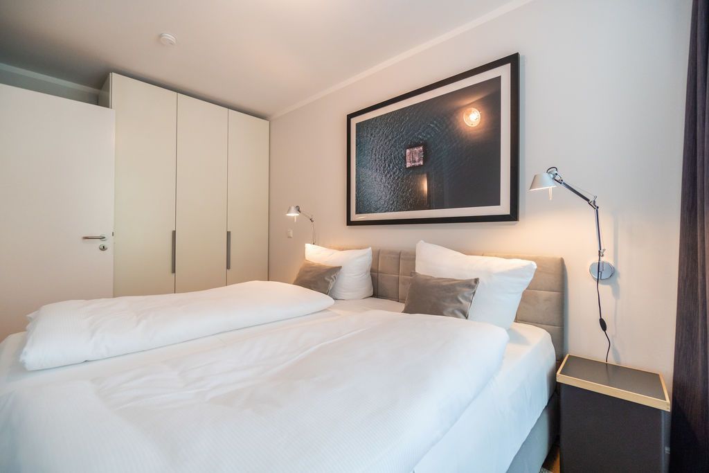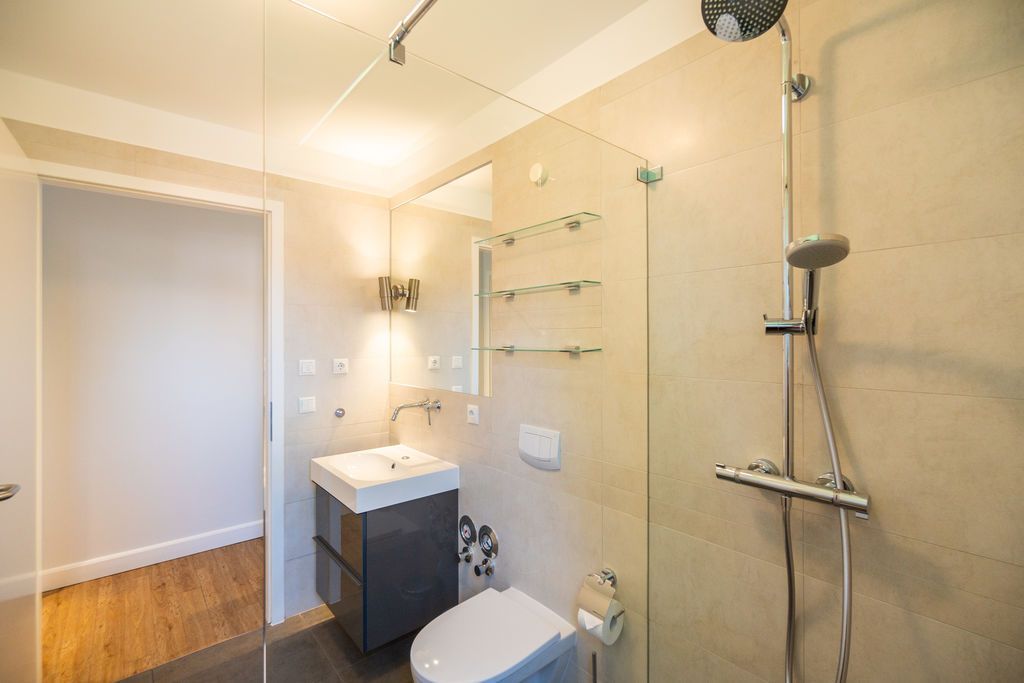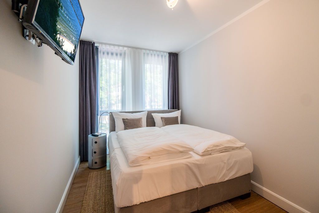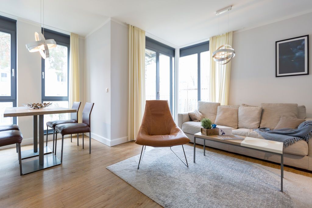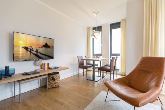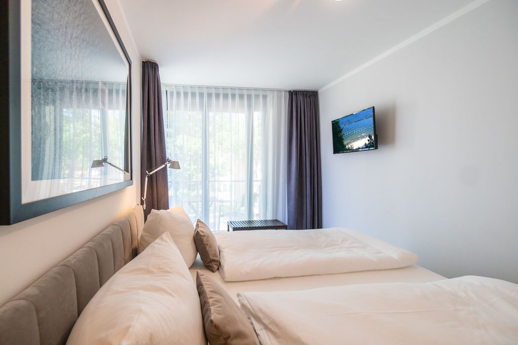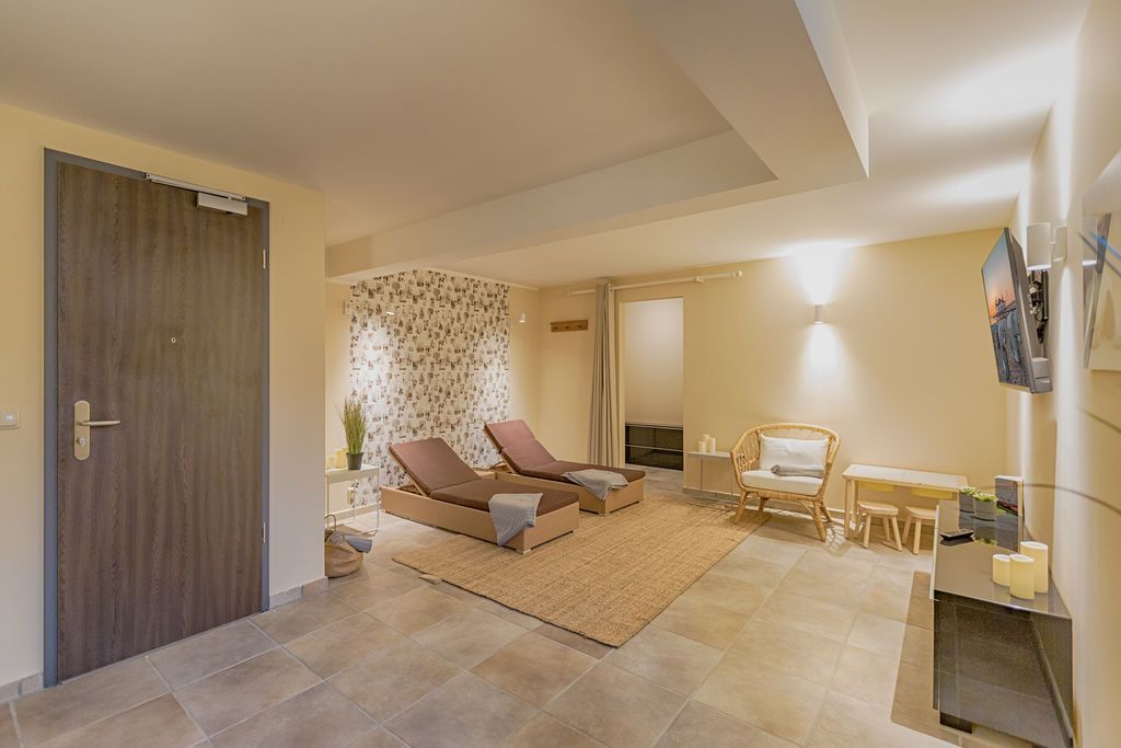 Maritime Farben, maritimes Flair im Appartement Nummer 3 im ersten Obergeschoss der Villa Maxim können Sie die Ostsee und den Strand förmlich spüren. Denn das Ambiente ist eigens auf die Farben Blau und Sand abgestimmt. Naturmaterialien geben der Wohnung einen echten Wohlfühlcharakter. Bis zu vier Personen und ein Kleinkind (im Kinderreisebett) haben auf den 70 Quadratmetern viel Platz. Das Appartement verfügt über zwei schöne Schlafzimmer mit bequemen Boxspringdoppelbetten (1,80 m x 2,00 m und 1,60 m x 2,00 m). Hier werden Sie schlafen wie auf Wolken. Das größere der beiden Schlafräume besitzt sogar einen eigenen kleinen Balkon an der Hausseite. Die Schränke bieten ausreichend Stauraum. Sollte der Schlaf doch einmal auf sich warten lassen oder Sie einen Tag im Bett verbringen wollen, sorgt der Flat-TV in jedem Zimmer für Unterhaltung. Doch nun zum eigentlichen Highlight der Wohnung: dem geräumigen Wohn-Esszimmer. Hier finden Sie alles, was Sie zum Ausspannen brauchen. Eine gemütliche Sofaecke mit Flat-TV und sogar einen Kaminofen, der Ihnen an kühlen Tagen und Abenden wohlige Wärme spendet. Allein dem Flammenspiel zuzuschauen, ist schon Erholung. Am Esstisch befinden sich vier bequeme Leder-Stühle. Lassen Sie sich hier oder am Tisch auf dem sonnigen Süd-Balkon zum Essen oder gemeinsamen Plauschen nieder. So beginnt der Urlaubstag schon beim Frühstücken relaxed. Zum Zubereiten und Kochen jeglicher Gerichte finden Sie alles in der offenen Wohnküche. Hochwertige Geräte wie Kühlschrank mit Gefriermöglichkeit, Herd, Backofen, Mikrowelle oder Kaffeemaschine erleichtern die Arbeit. Auch edles Geschirr befindet sich in den Schränken. Das geräumige Badezimmer ist mit einer ebenerdigen Dusche, einem Waschtisch und einem WC ausgestattet. Sie brauchen auch im Urlaub einen Internetanschluss? Kein Problem. In der Wohnung steht Ihnen kostenfrei WLAN zur Verfügung. Ein zusätzliches Guddi ist die kleine Wellness-Oase mit zwei Saunen, einem Relax Raum und Duschen im Erdgeschoss der Villa, die Sie gern unentgeltlich mitbenutzen können. Für Ihren Pkw gibt es einen Außenstellplatz. Bei Anreise liegen Handtücher für Sie bereit und die Betten sind natürlich schon bezogen.