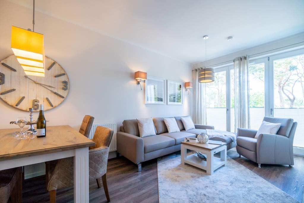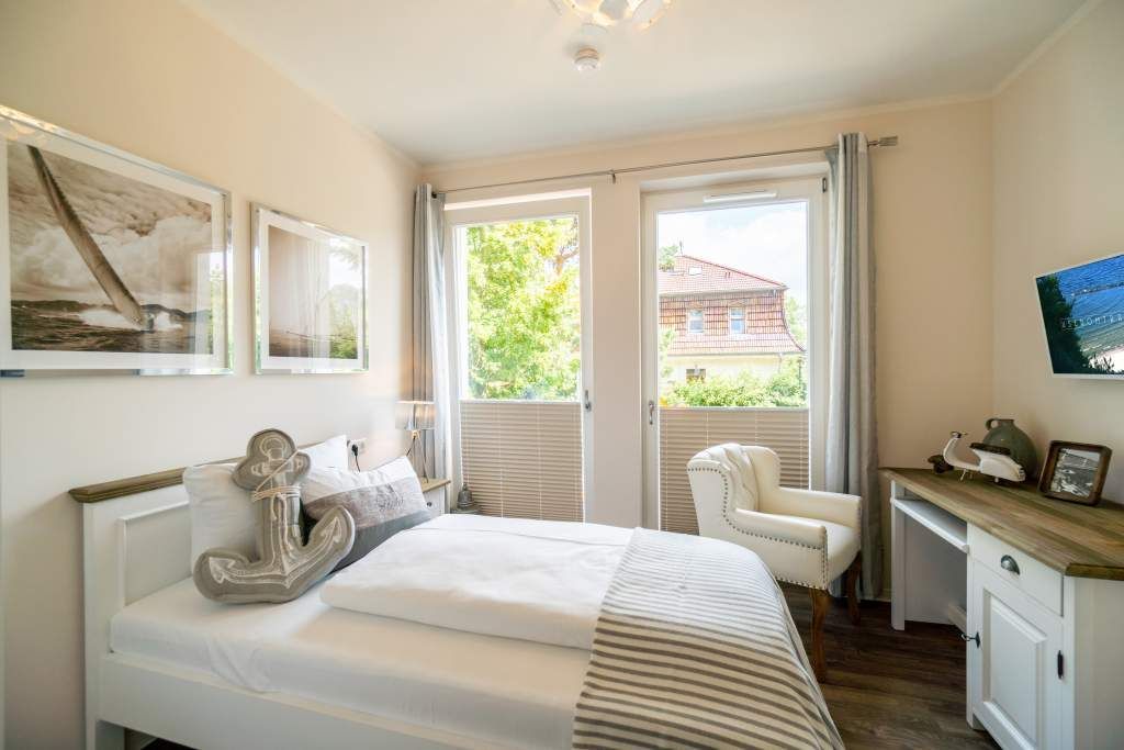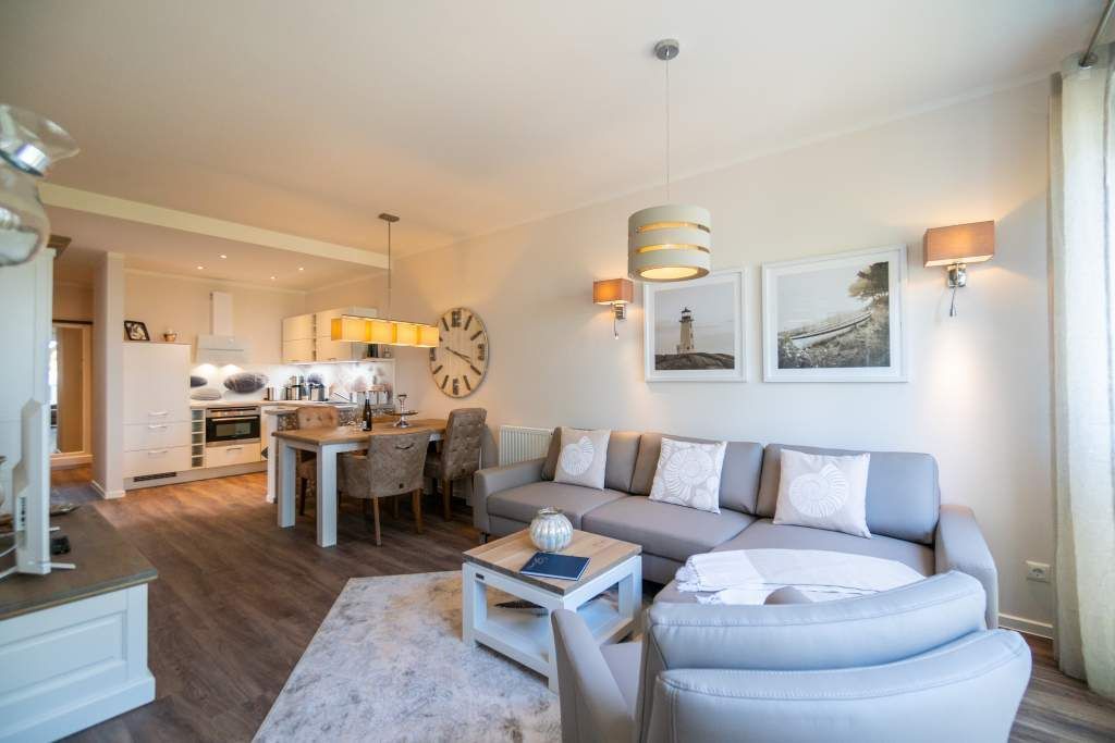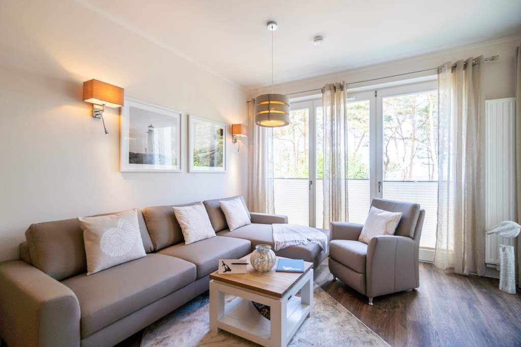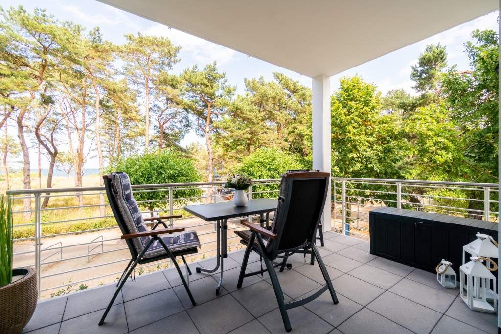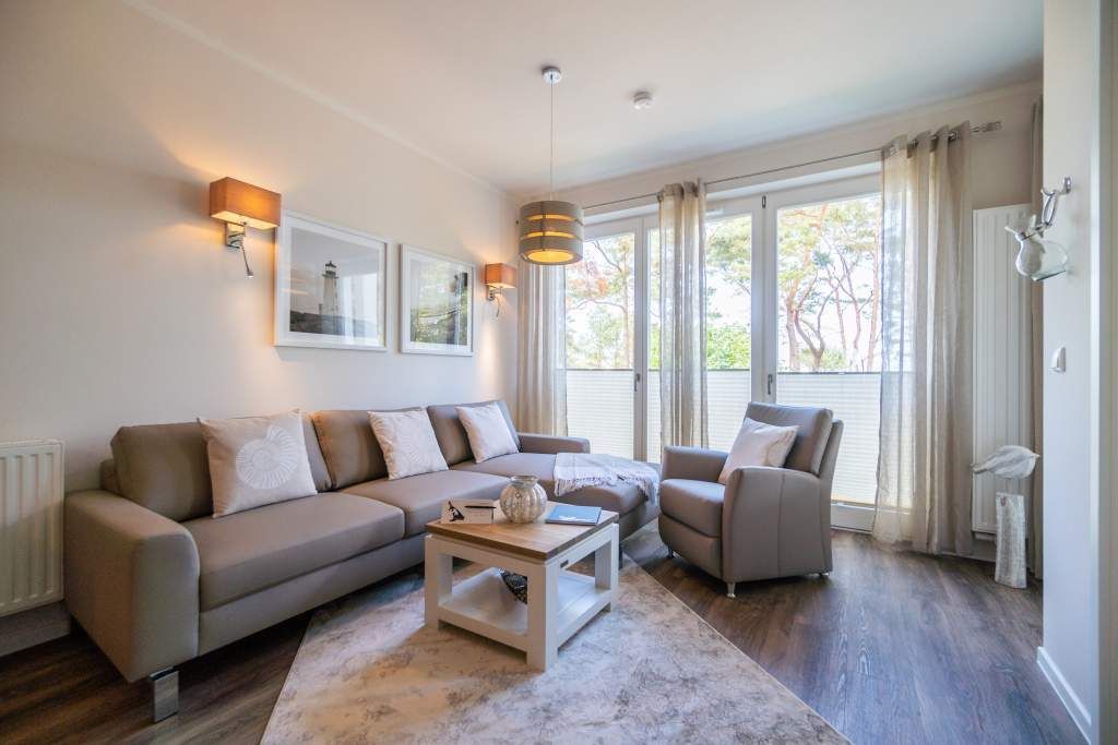 Strandresidenz der Name des Hauses ist Programm. Der feine, weiße Ostseestrand ist so dicht, dass Sie das Meer in Ihrem Urlaubsdomizil riechen, hören und sehen können. Und das fast aus der gesamten Wohnung. Es gibt nichts Entspannenderes als vom sanften Rauschen der Wellen in den Schlaf getragen zu werden und des Morgens davon wieder geweckt zu werden. Vor allem, wenn man direkt nach dem Aufstehen auf den Balkon hinaustritt und die Nähe der Ostsee unmittelbar spüren kann. Das 65 Quadratmeter große Appartement in der ersten Etage, das bis zu drei Erwachsenen (keine Kleinkinder) Platz bietet, ist hell und modern eingerichtet. Stilvolle Möbel sorgen für eine Wohlfühlatmosphäre. Das offene Wohn-Esszimmer mit Echtleder-Sofa lädt zum Relaxen vor dem Flat-TV ein. Die Küchenzeile ist mit hochwertigen Geräten wie Herd, Backofen, Kühlschrank mit Gefriermöglichkeit, Spülmaschine und Mikrowelle ausgestattet. Geschirr finden Sie in den Schränken. Am schönen Essplatz mit Tisch und Stühlen lässt es sich nicht nur wunderbar dinieren. Plaudern, spielen, diskutieren er ist ein Garant für gemütliche Stunden. Die Wohnung verfügt über zwei Schlafzimmer. Eines besitzt ein komfortables Boxspringdoppelbett (1,80 m x 2,00 m), einen Flat-TV und einen großen Kleiderschrank. Im zweiten Zimmer stehen ein Einzelbett (1,00 m x 2,00 m) und ebenfalls ein Flat-TV. Außerdem bietet auch hier ein Schrank genügend Ablagefläche. Für kleine Schreibtätigkeiten steht in diesem Schlafzimmer auch ein Schreibtisch zur Verfügung. Das Badezimmer ist modern gestaltet und mit Regen-Dusche, Waschtisch und WC ausgestattet. Für den rundum sorglosen Urlaubskomfort sind die Betten bezogen und Handtücher liegen für Sie bereit. Zum Appartement gehört ein Tiefgaragenstellplatz. Tiefgarage mit Doppelparker, Fahrzeughöhe max. 1,90 m