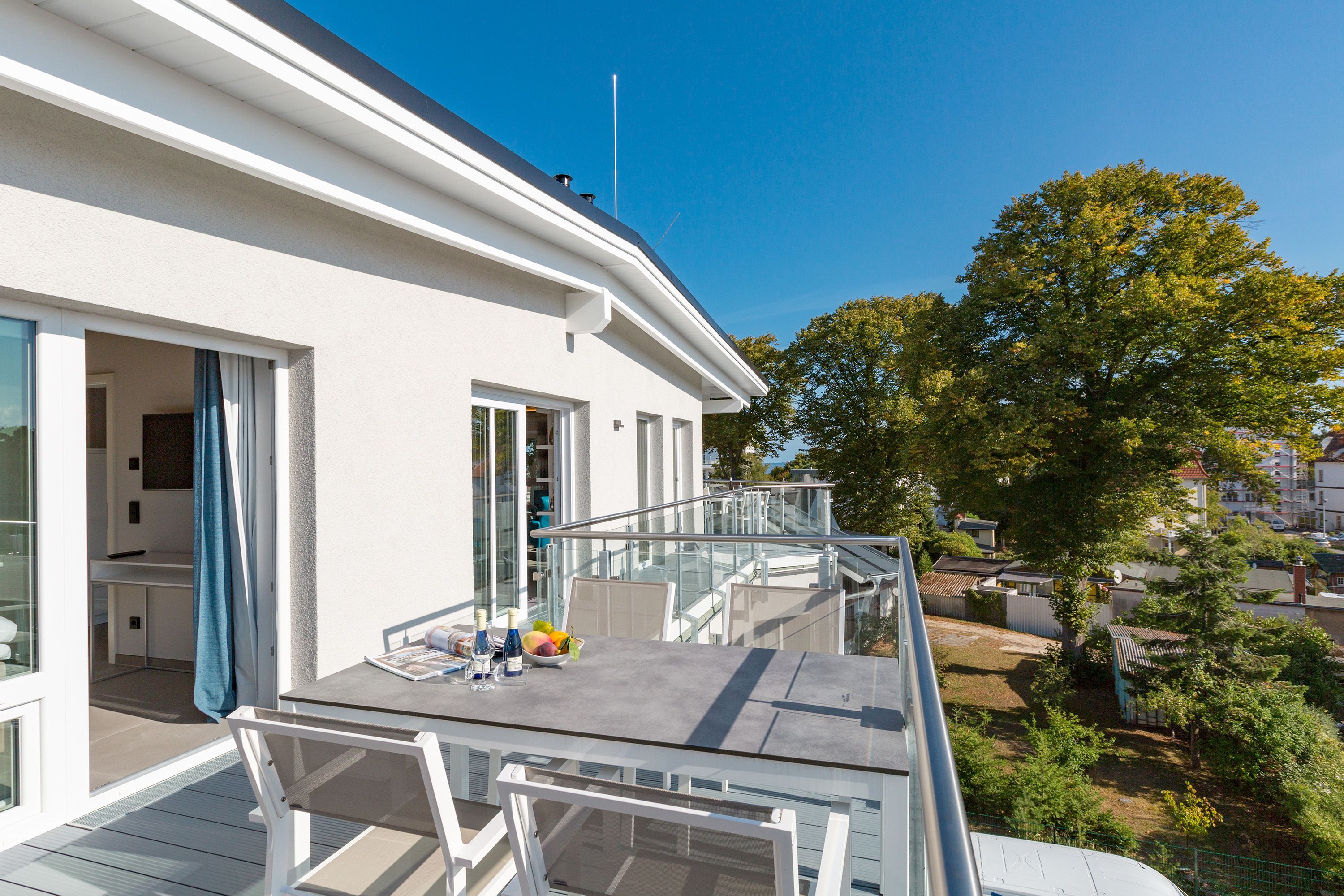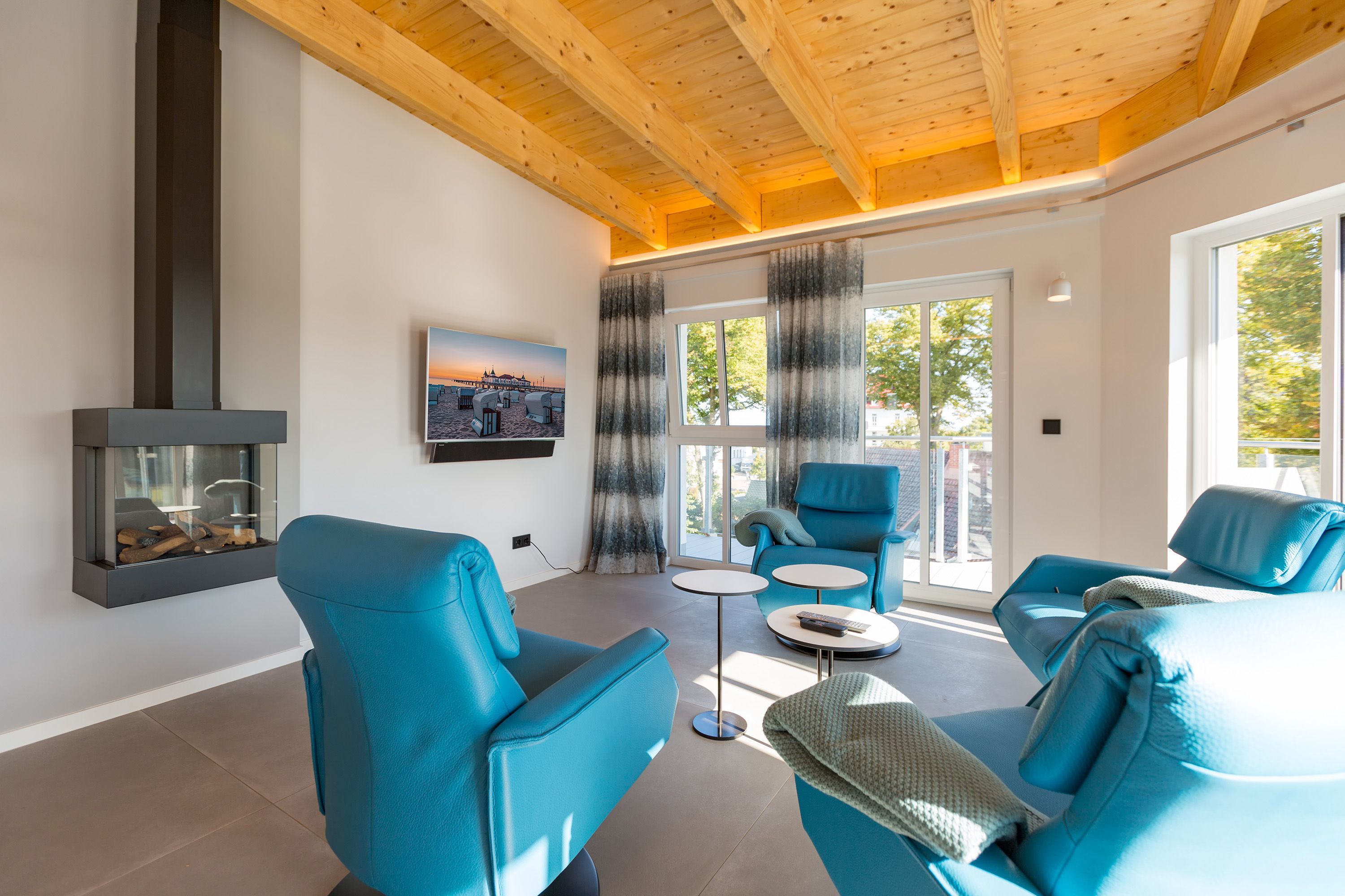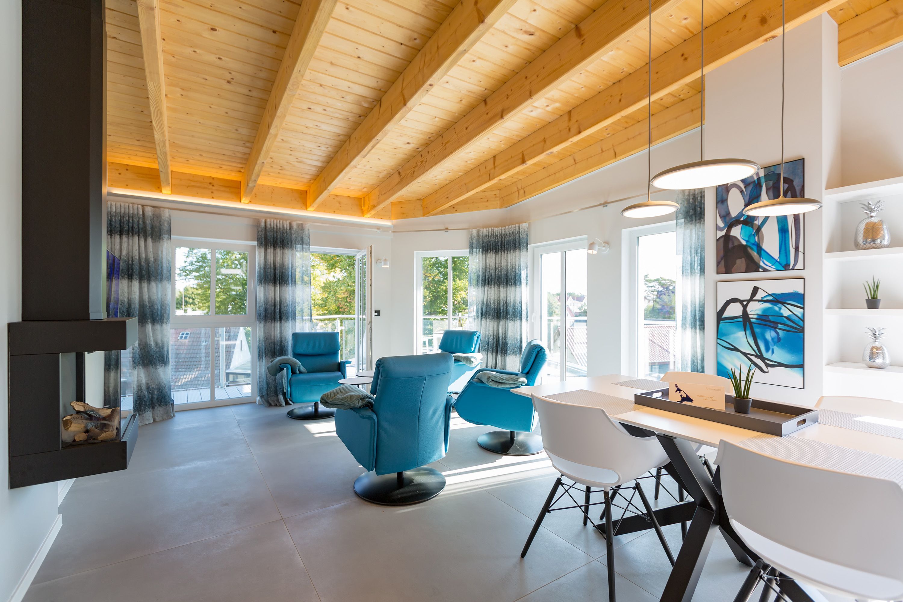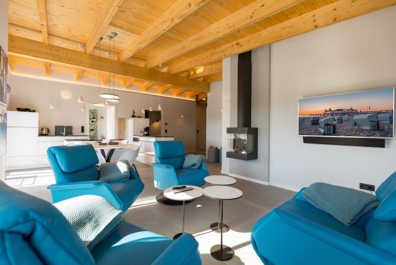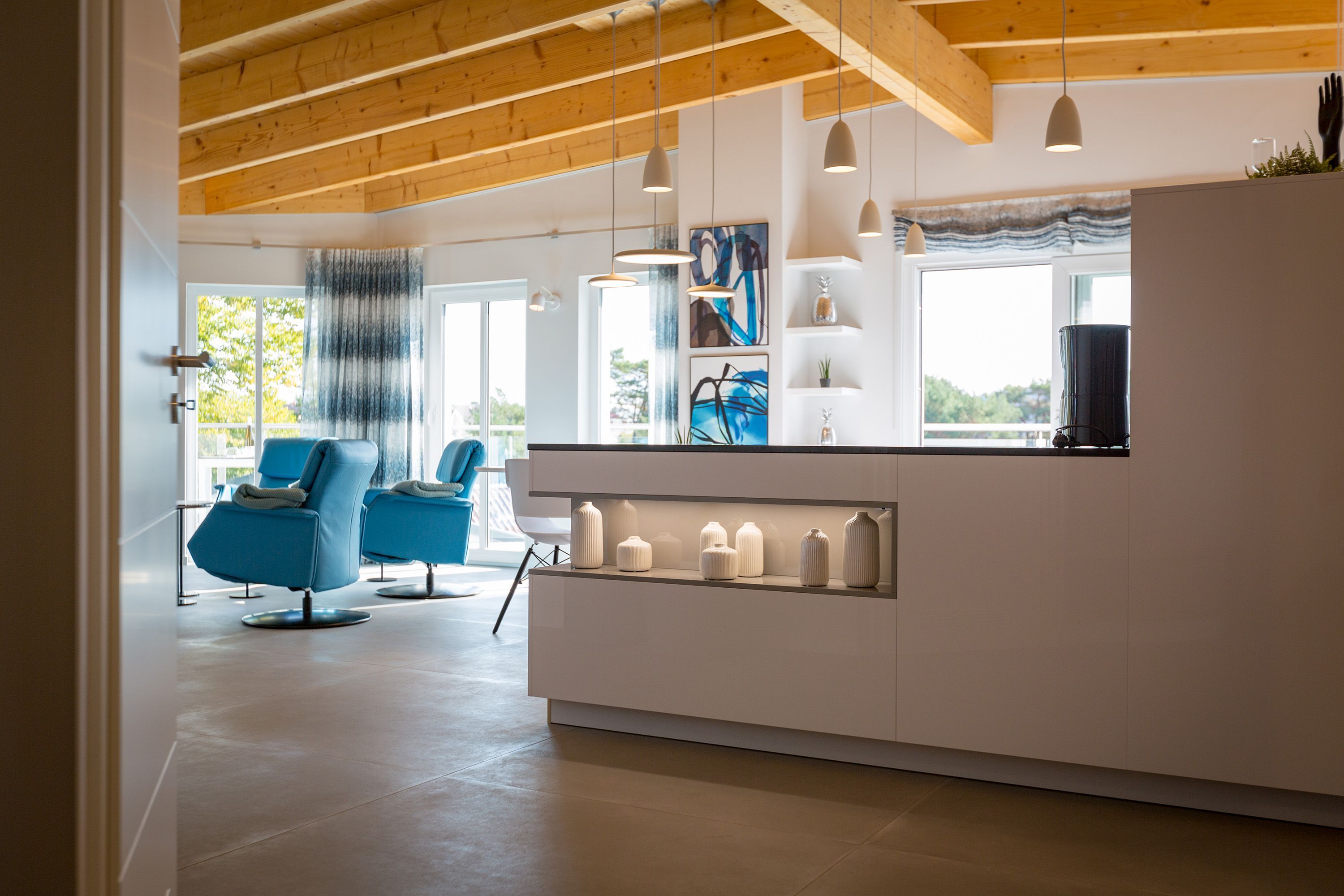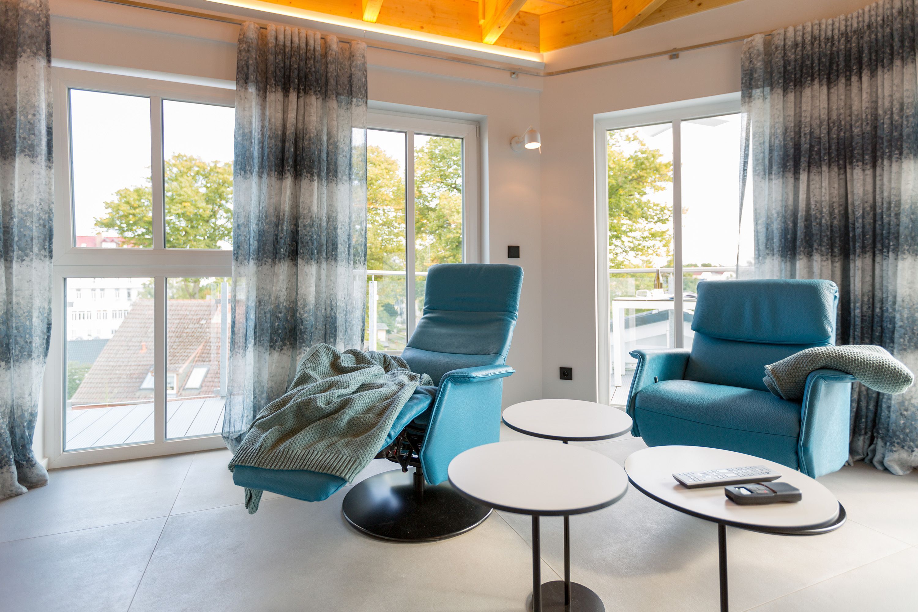 Exklusives und modernes Wohnflair mit Meerblick bietet dieses 84 Quadratmeter große barrierefreie Urlaubsparadies in seinen drei Räumen im Penthouse des Domizils Düne 8. Entspannen Sie hier mit bis zu 4 Personen und einem Kleinkind bis 3 Jahre (im Kinderreisebett). Eine hohe, offene Holzbalkendecke, stylische Designmöbel, ein moderner Gas-Kamin eine Wohlfühlwelt, in der man wunderbar abschalten kann. Eine umlaufende Sonnenterrasse mit Meerblick (ges. 33m²)lädt zum Verweilen ein. So entspannend sollte Urlaub sein! Im Inneren erwarten Sie lichte und hohe Räume. Die Ledersessel vor dem großen Flat-TV im offenen und großzügig geschnittenen Wohn-Ess-Zimmer lassen sich bequem in eine Liegeposition verstellen, so dass jeder seine eigene, kleine Relax-Area bekommt. Verbindungsglied zwischen dem Wohnbereich und der mit hochwertigen Markengeräten voll ausgestatteten Küche ist ein wunderschöner Essplatz mit stylischem Esstisch im Industriallook und bequemen Schalensesseln. Die Küche ist absolut modern mit einer freistehenden Kochinsel, High End-Kochfeld mit integriertem Dunstabzug und edlem Geschirr eingerichtet. Die beiden Schlafzimmer eines sogar mit Zugang zur großen Terrasse verwöhnen mit Behaglichkeit und viel Stauraum. Komfortable Boxspringdoppelbetten (1,80 m x 2,00 m) sorgen für Schlafvergnügen und die passgenauen Einbauschränke bieten ausreichend Ablagefläche. In beiden Zimmern gibt es einen Flat-TV. Die beiden Tageslicht-Bäder verfügen über eine Regendusche, einen Waschtisch und ein WC. Ein kleines Highlight wartet darüber hinaus zusätzlich in einem der Badezimmer auf Sie: Entspannen und genießen Sie Ihre Auszeit erst so richtig in der eigenen, Finnischen Sauna. Da freut man sich sogar auf kühlere Abende oder ungemütliche Herbst- oder Wintertage. Sie wollen auch im Urlaub im Internet surfen? Kein Problem! Das WLAN ist kostenfrei. Für Ihren Komfort sind die Betten bei Ihrer Anreise bezogen. Und auch für Ihr Auto ist gesorgt. Einen überdachten Pkw-Außenstellplatz gibt es am Haus. Außerdem gehört zu der Wohnung ein eigener Fahrradabstellraum.