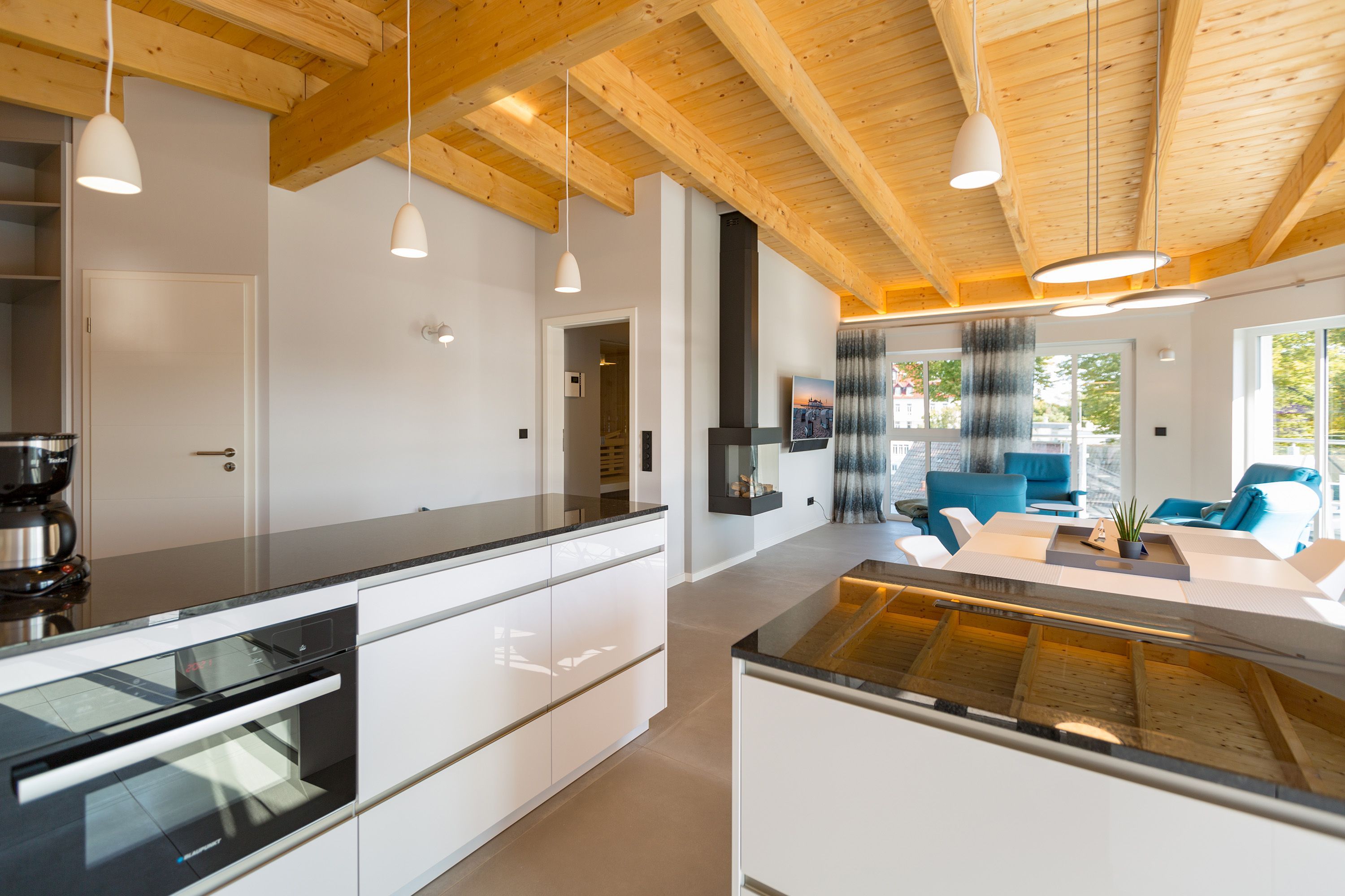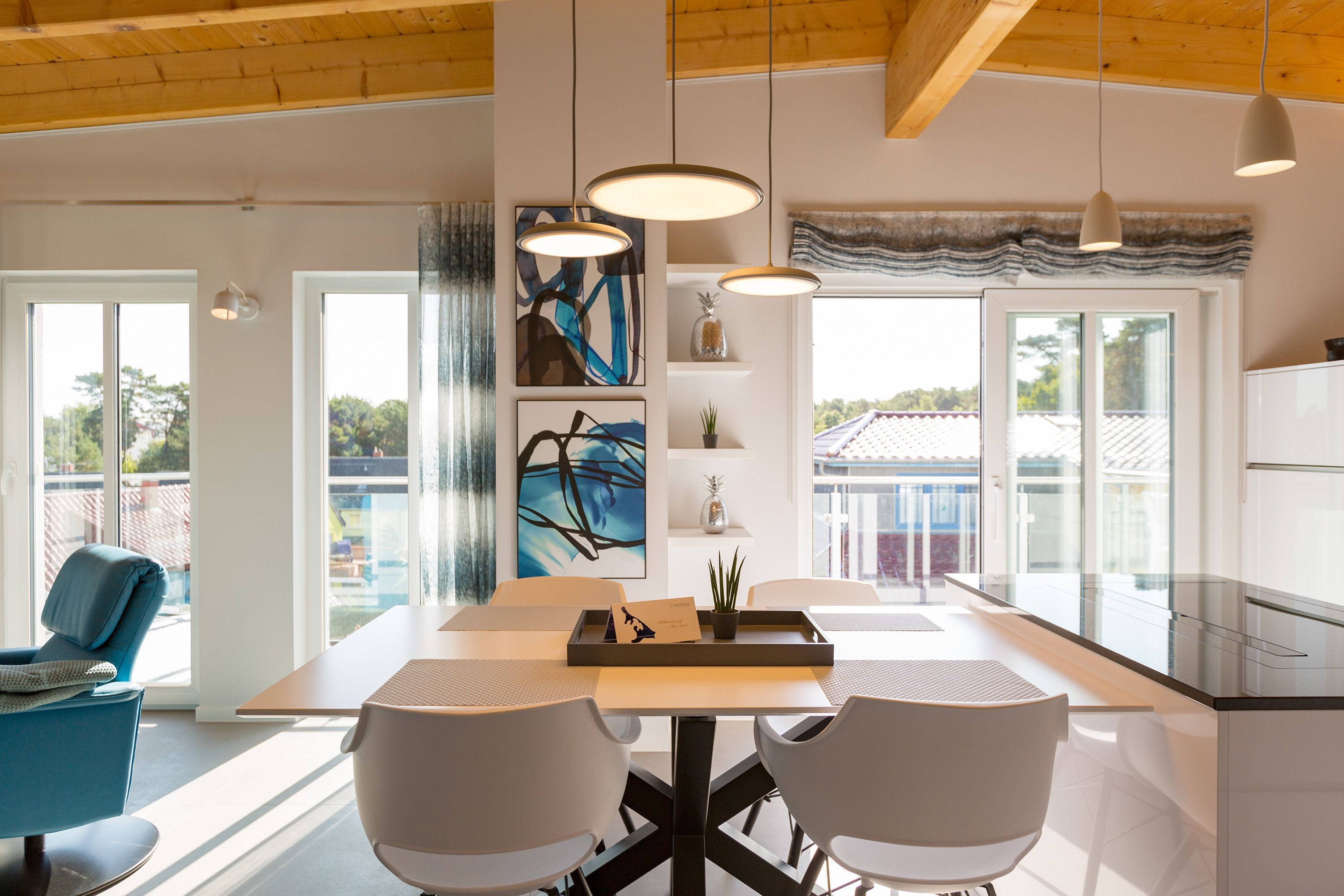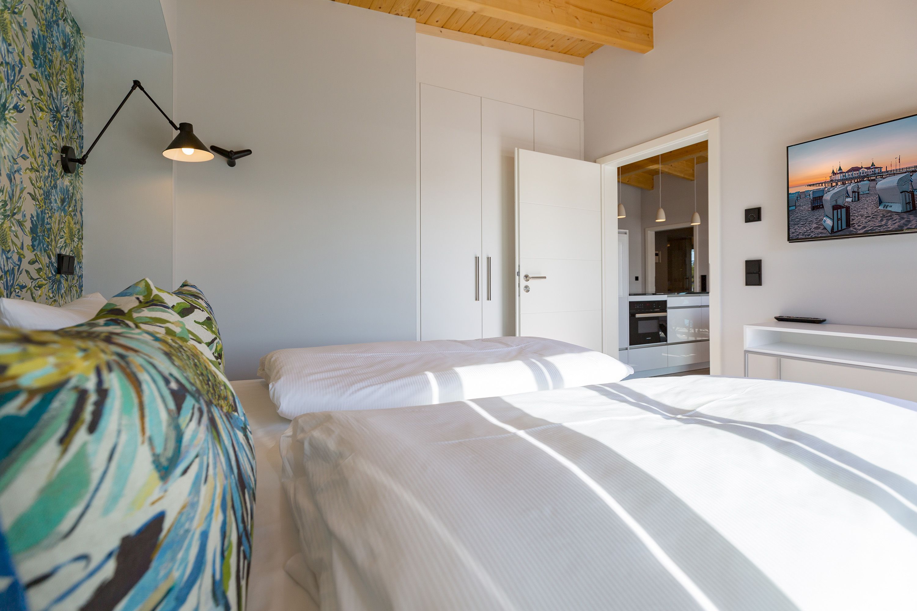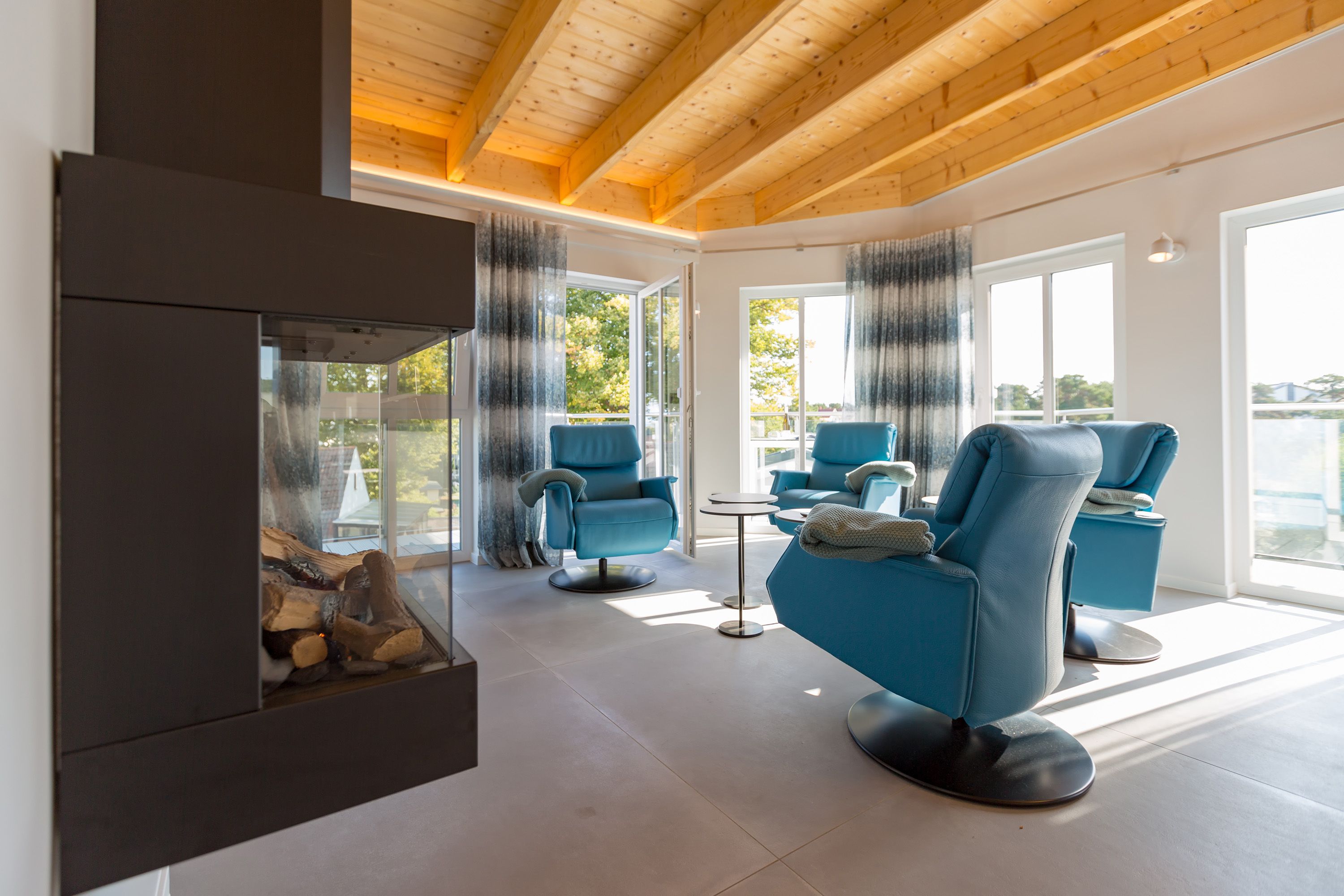 Exklusives und modernes Wohnflair mit Meerblick bietet dieses 84 Quadratmeter große barrierefreie Urlaubsparadies in seinen drei Räumen im Penthouse des Domizils Düne 8. Entspannen Sie hier mit bis zu 4 Personen und einem Kleinkind bis 3 Jahre (im Kinderreisebett). Eine hohe, offene Holzbalkendecke, stylische Designmöbel, ein moderner Gas-Kamin eine Wohlfühlwelt, in der man wunderbar abschalten kann. Eine umlaufende Sonnenterrasse mit Meerblick (ges. 33m²)lädt zum Verweilen ein. So entspannend sollte Urlaub sein! Im Inneren erwarten Sie lichte und hohe Räume. Die Ledersessel vor dem großen Flat-TV im offenen und großzügig geschnittenen Wohn-Ess-Zimmer lassen sich bequem in eine Liegeposition verstellen, so dass jeder seine eigene, kleine Relax-Area bekommt. Verbindungsglied zwischen dem Wohnbereich und der mit hochwertigen Markengeräten voll ausgestatteten Küche ist ein wunderschöner Essplatz mit stylischem Esstisch im Industriallook und bequemen Schalensesseln. Die Küche ist absolut modern mit einer freistehenden Kochinsel, High End-Kochfeld mit integriertem Dunstabzug und edlem Geschirr eingerichtet. Die beiden Schlafzimmer eines sogar mit Zugang zur großen Terrasse verwöhnen mit Behaglichkeit und viel Stauraum. Komfortable Boxspringdoppelbetten (1,80 m x 2,00 m) sorgen für Schlafvergnügen und die passgenauen Einbauschränke bieten ausreichend Ablagefläche. In beiden Zimmern gibt es einen Flat-TV. Die beiden Tageslicht-Bäder verfügen über eine Regendusche, einen Waschtisch und ein WC. Ein kleines Highlight wartet darüber hinaus zusätzlich in einem der Badezimmer auf Sie: Entspannen und genießen Sie Ihre Auszeit erst so richtig in der eigenen, Finnischen Sauna. Da freut man sich sogar auf kühlere Abende oder ungemütliche Herbst- oder Wintertage. Sie wollen auch im Urlaub im Internet surfen? Kein Problem! Das WLAN ist kostenfrei. Für Ihren Komfort sind die Betten bei Ihrer Anreise bezogen. Und auch für Ihr Auto ist gesorgt. Einen überdachten Pkw-Außenstellplatz gibt es am Haus. Außerdem gehört zu der Wohnung ein eigener Fahrradabstellraum.