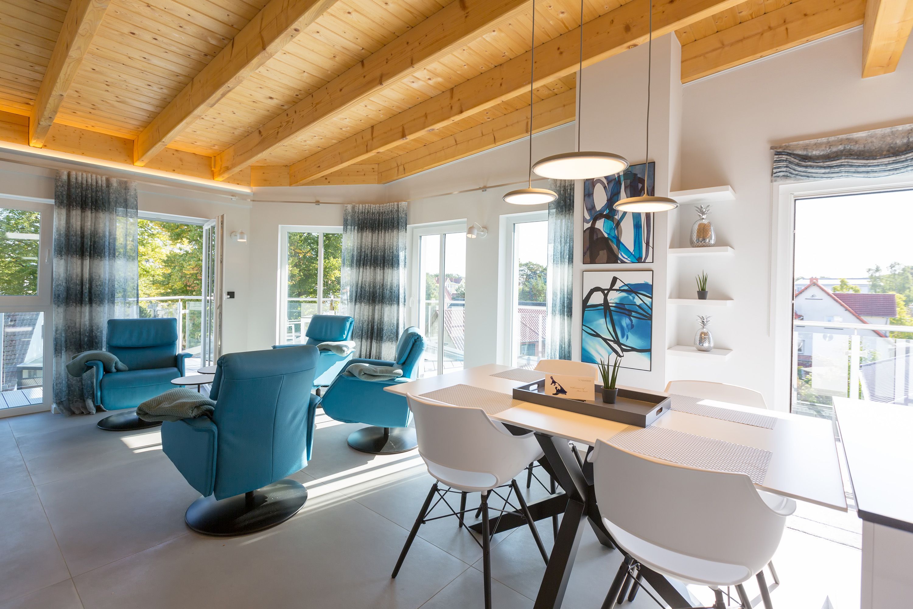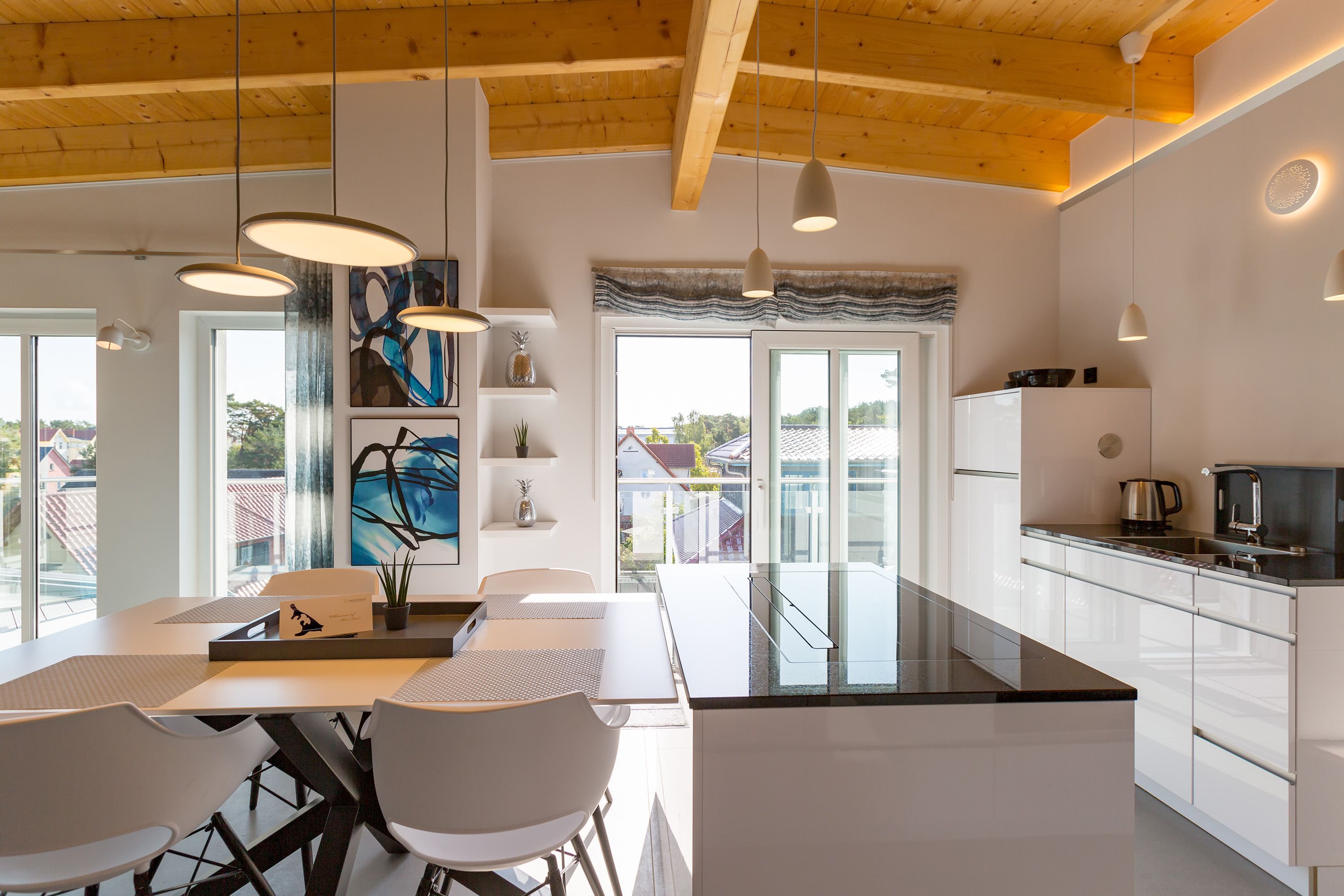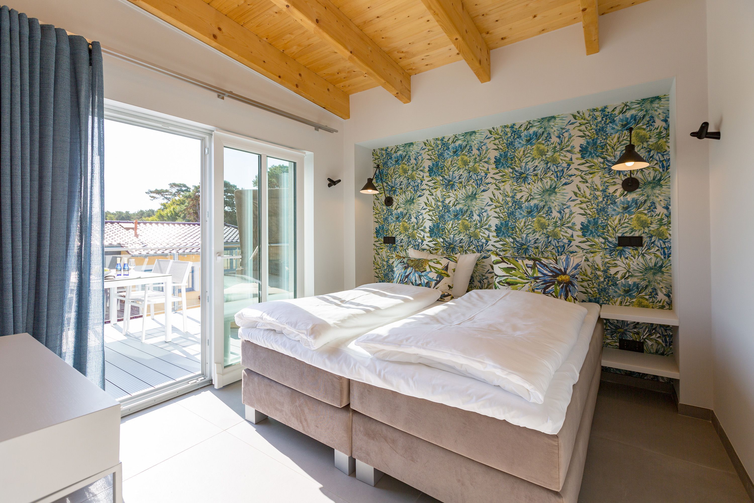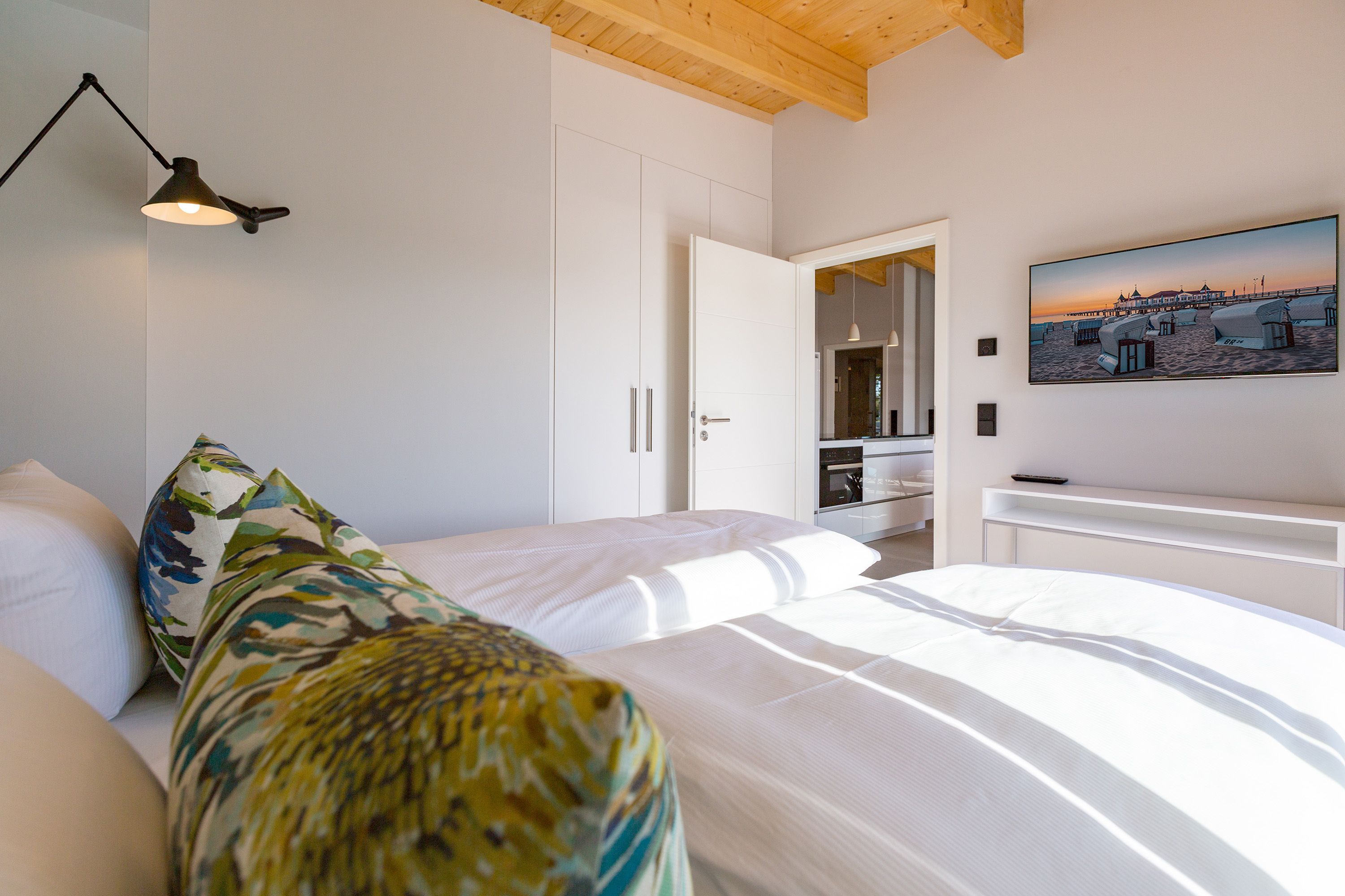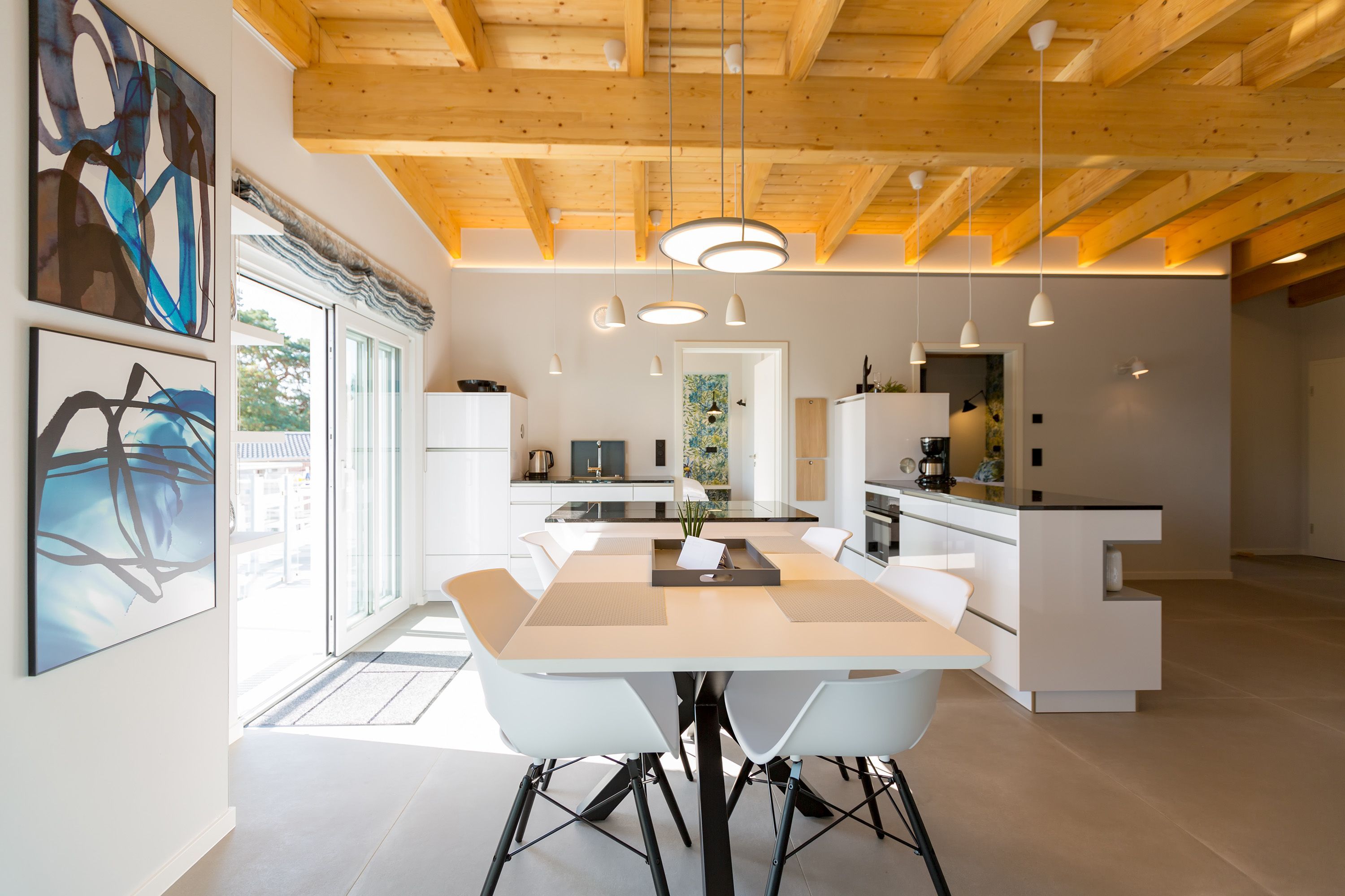 Exklusives und modernes Wohnflair mit Meerblick bietet dieses 84 Quadratmeter große barrierefreie Urlaubsparadies in seinen drei Räumen im Penthouse des Domizils Düne 8. Entspannen Sie hier mit bis zu 4 Personen und einem Kleinkind bis 3 Jahre (im Kinderreisebett). Eine hohe, offene Holzbalkendecke, stylische Designmöbel, ein moderner Gas-Kamin eine Wohlfühlwelt, in der man wunderbar abschalten kann. Eine umlaufende Sonnenterrasse mit Meerblick (ges. 33m²)lädt zum Verweilen ein. So entspannend sollte Urlaub sein! Im Inneren erwarten Sie lichte und hohe Räume. Die Ledersessel vor dem großen Flat-TV im offenen und großzügig geschnittenen Wohn-Ess-Zimmer lassen sich bequem in eine Liegeposition verstellen, so dass jeder seine eigene, kleine Relax-Area bekommt. Verbindungsglied zwischen dem Wohnbereich und der mit hochwertigen Markengeräten voll ausgestatteten Küche ist ein wunderschöner Essplatz mit stylischem Esstisch im Industriallook und bequemen Schalensesseln. Die Küche ist absolut modern mit einer freistehenden Kochinsel, High End-Kochfeld mit integriertem Dunstabzug und edlem Geschirr eingerichtet. Die beiden Schlafzimmer eines sogar mit Zugang zur großen Terrasse verwöhnen mit Behaglichkeit und viel Stauraum. Komfortable Boxspringdoppelbetten (1,80 m x 2,00 m) sorgen für Schlafvergnügen und die passgenauen Einbauschränke bieten ausreichend Ablagefläche. In beiden Zimmern gibt es einen Flat-TV. Die beiden Tageslicht-Bäder verfügen über eine Regendusche, einen Waschtisch und ein WC. Ein kleines Highlight wartet darüber hinaus zusätzlich in einem der Badezimmer auf Sie: Entspannen und genießen Sie Ihre Auszeit erst so richtig in der eigenen, Finnischen Sauna. Da freut man sich sogar auf kühlere Abende oder ungemütliche Herbst- oder Wintertage. Sie wollen auch im Urlaub im Internet surfen? Kein Problem! Das WLAN ist kostenfrei. Für Ihren Komfort sind die Betten bei Ihrer Anreise bezogen. Und auch für Ihr Auto ist gesorgt. Einen überdachten Pkw-Außenstellplatz gibt es am Haus. Außerdem gehört zu der Wohnung ein eigener Fahrradabstellraum.