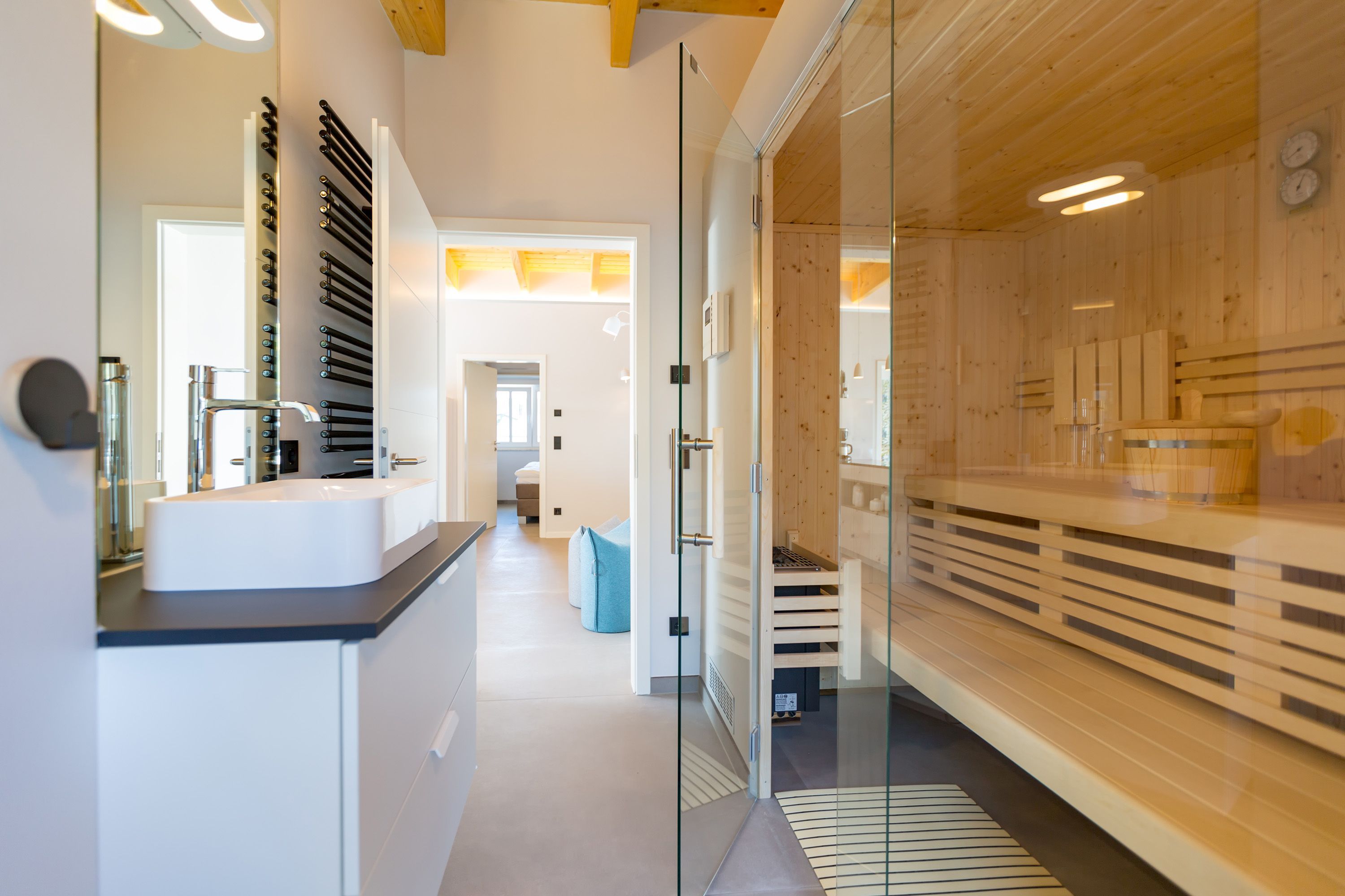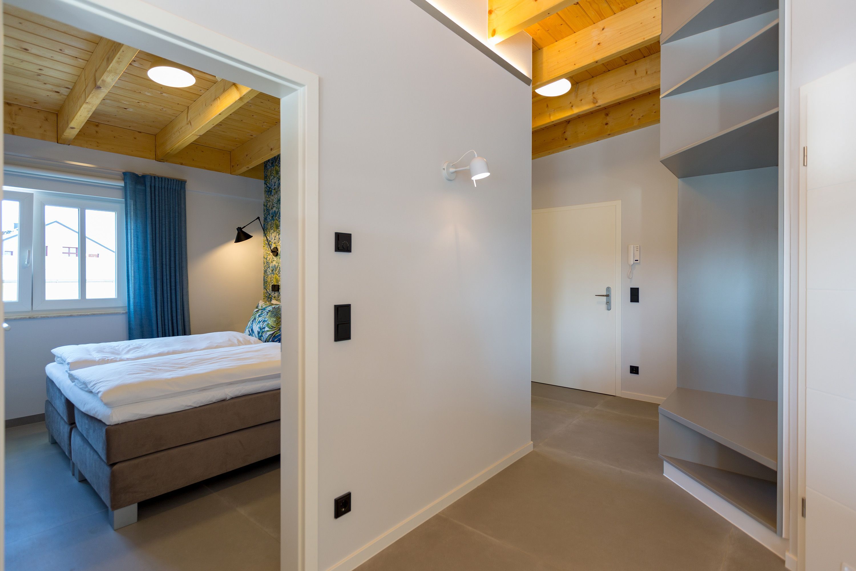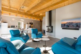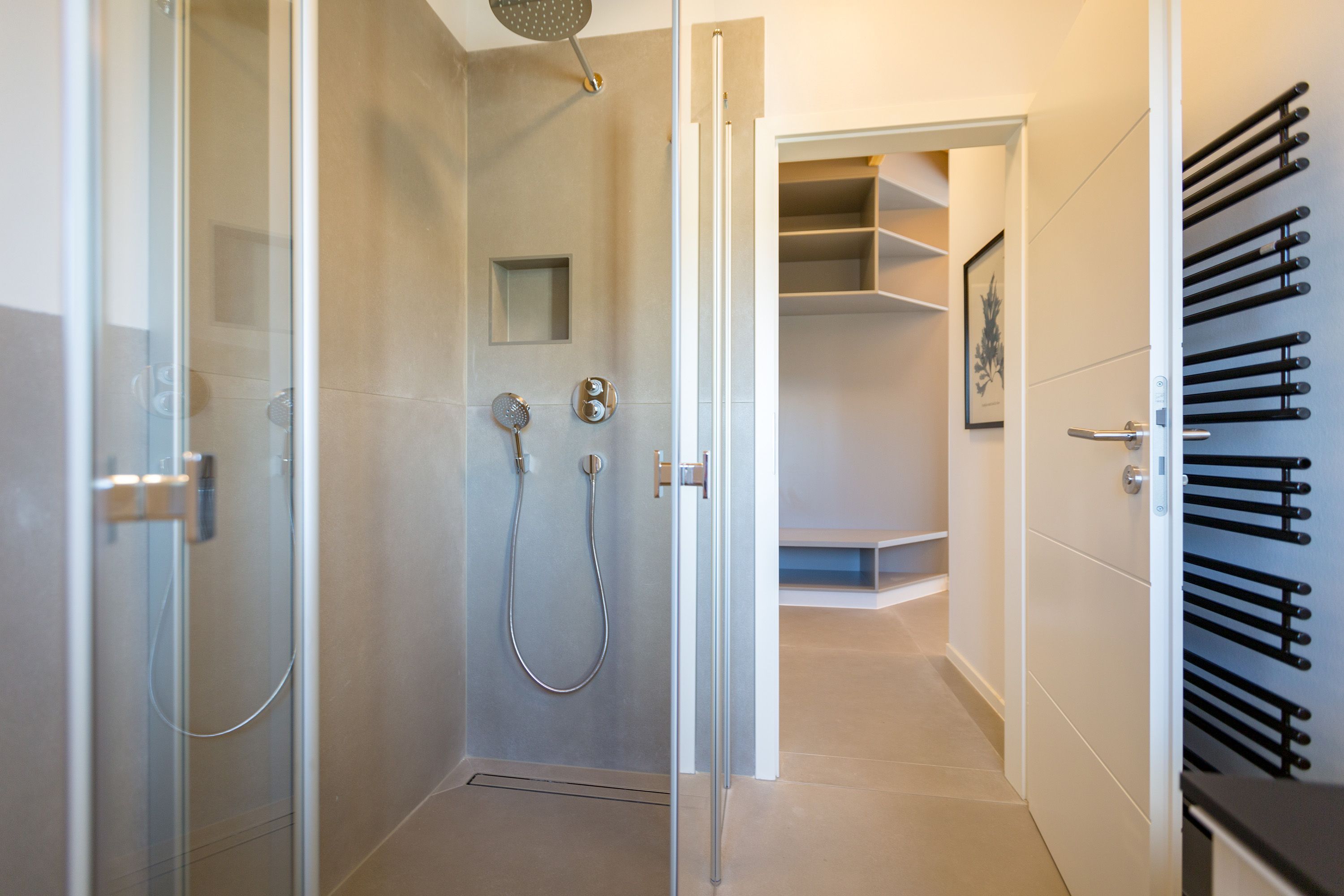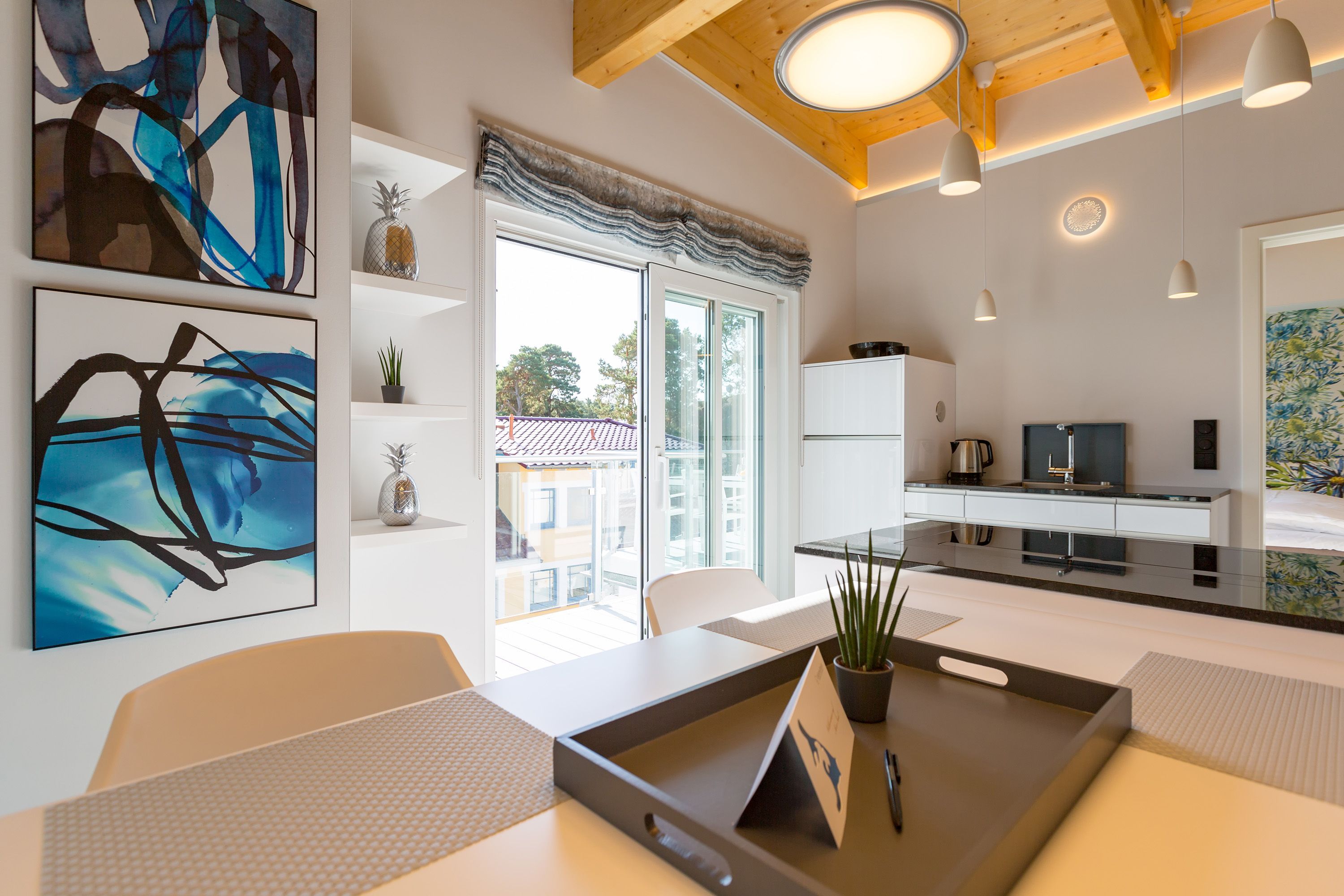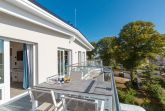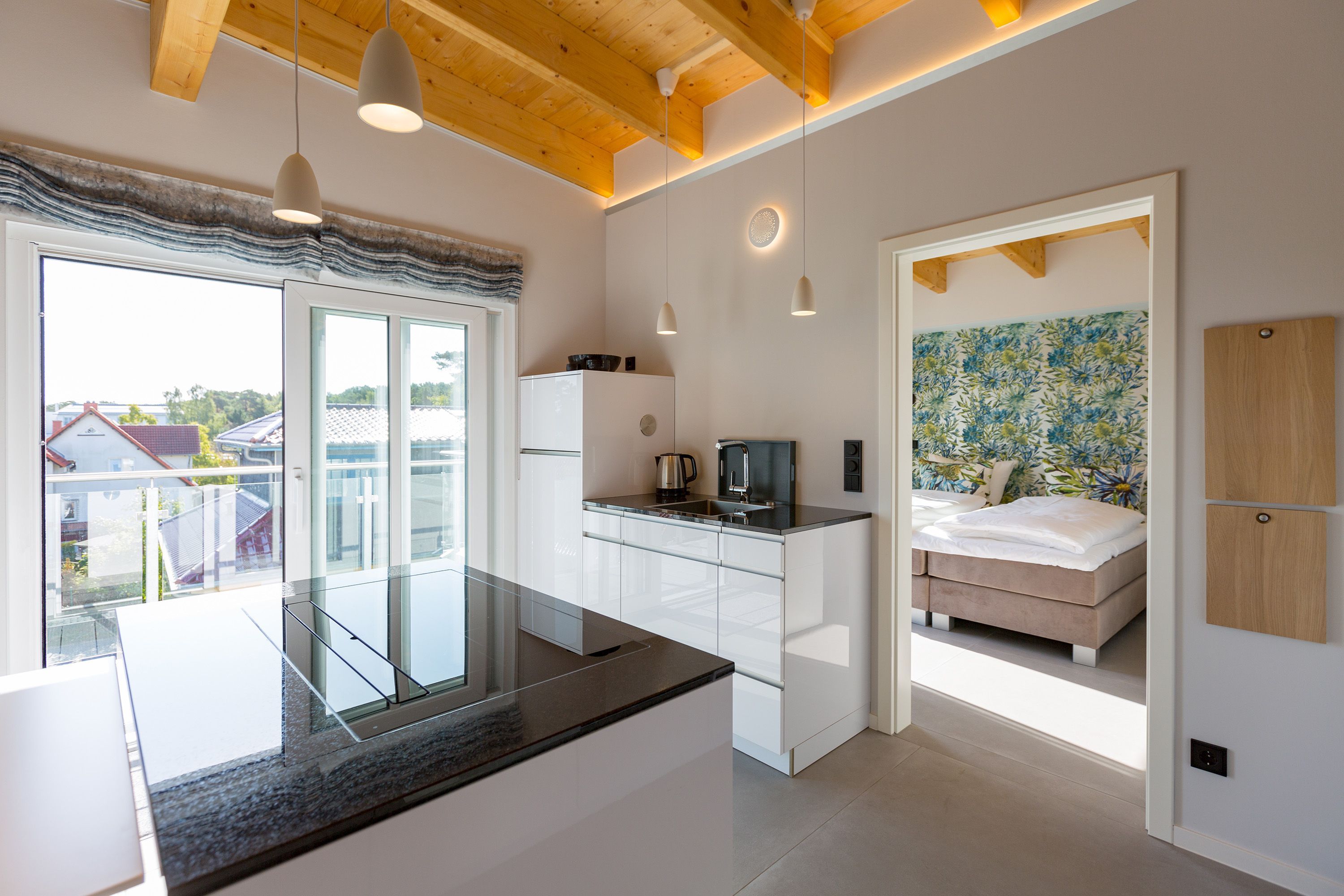 Exklusives und modernes Wohnflair mit Meerblick bietet dieses 84 Quadratmeter große barrierefreie Urlaubsparadies in seinen drei Räumen im Penthouse des Domizils Düne 8. Entspannen Sie hier mit bis zu 4 Personen und einem Kleinkind bis 3 Jahre (im Kinderreisebett). Eine hohe, offene Holzbalkendecke, stylische Designmöbel, ein moderner Gas-Kamin eine Wohlfühlwelt, in der man wunderbar abschalten kann. Eine umlaufende Sonnenterrasse mit Meerblick (ges. 33m²)lädt zum Verweilen ein. So entspannend sollte Urlaub sein! Im Inneren erwarten Sie lichte und hohe Räume. Die Ledersessel vor dem großen Flat-TV im offenen und großzügig geschnittenen Wohn-Ess-Zimmer lassen sich bequem in eine Liegeposition verstellen, so dass jeder seine eigene, kleine Relax-Area bekommt. Verbindungsglied zwischen dem Wohnbereich und der mit hochwertigen Markengeräten voll ausgestatteten Küche ist ein wunderschöner Essplatz mit stylischem Esstisch im Industriallook und bequemen Schalensesseln. Die Küche ist absolut modern mit einer freistehenden Kochinsel, High End-Kochfeld mit integriertem Dunstabzug und edlem Geschirr eingerichtet. Die beiden Schlafzimmer eines sogar mit Zugang zur großen Terrasse verwöhnen mit Behaglichkeit und viel Stauraum. Komfortable Boxspringdoppelbetten (1,80 m x 2,00 m) sorgen für Schlafvergnügen und die passgenauen Einbauschränke bieten ausreichend Ablagefläche. In beiden Zimmern gibt es einen Flat-TV. Die beiden Tageslicht-Bäder verfügen über eine Regendusche, einen Waschtisch und ein WC. Ein kleines Highlight wartet darüber hinaus zusätzlich in einem der Badezimmer auf Sie: Entspannen und genießen Sie Ihre Auszeit erst so richtig in der eigenen, Finnischen Sauna. Da freut man sich sogar auf kühlere Abende oder ungemütliche Herbst- oder Wintertage. Sie wollen auch im Urlaub im Internet surfen? Kein Problem! Das WLAN ist kostenfrei. Für Ihren Komfort sind die Betten bei Ihrer Anreise bezogen. Und auch für Ihr Auto ist gesorgt. Einen überdachten Pkw-Außenstellplatz gibt es am Haus. Außerdem gehört zu der Wohnung ein eigener Fahrradabstellraum.