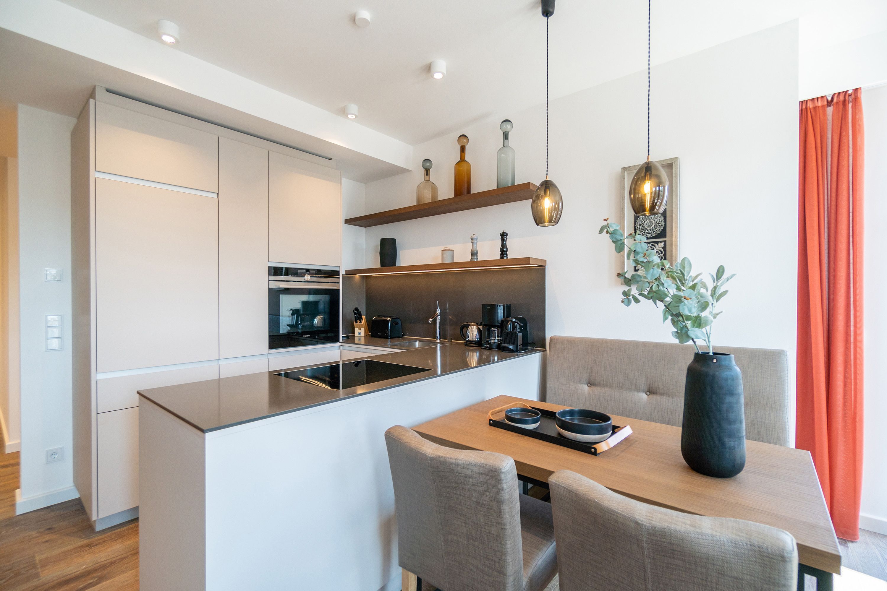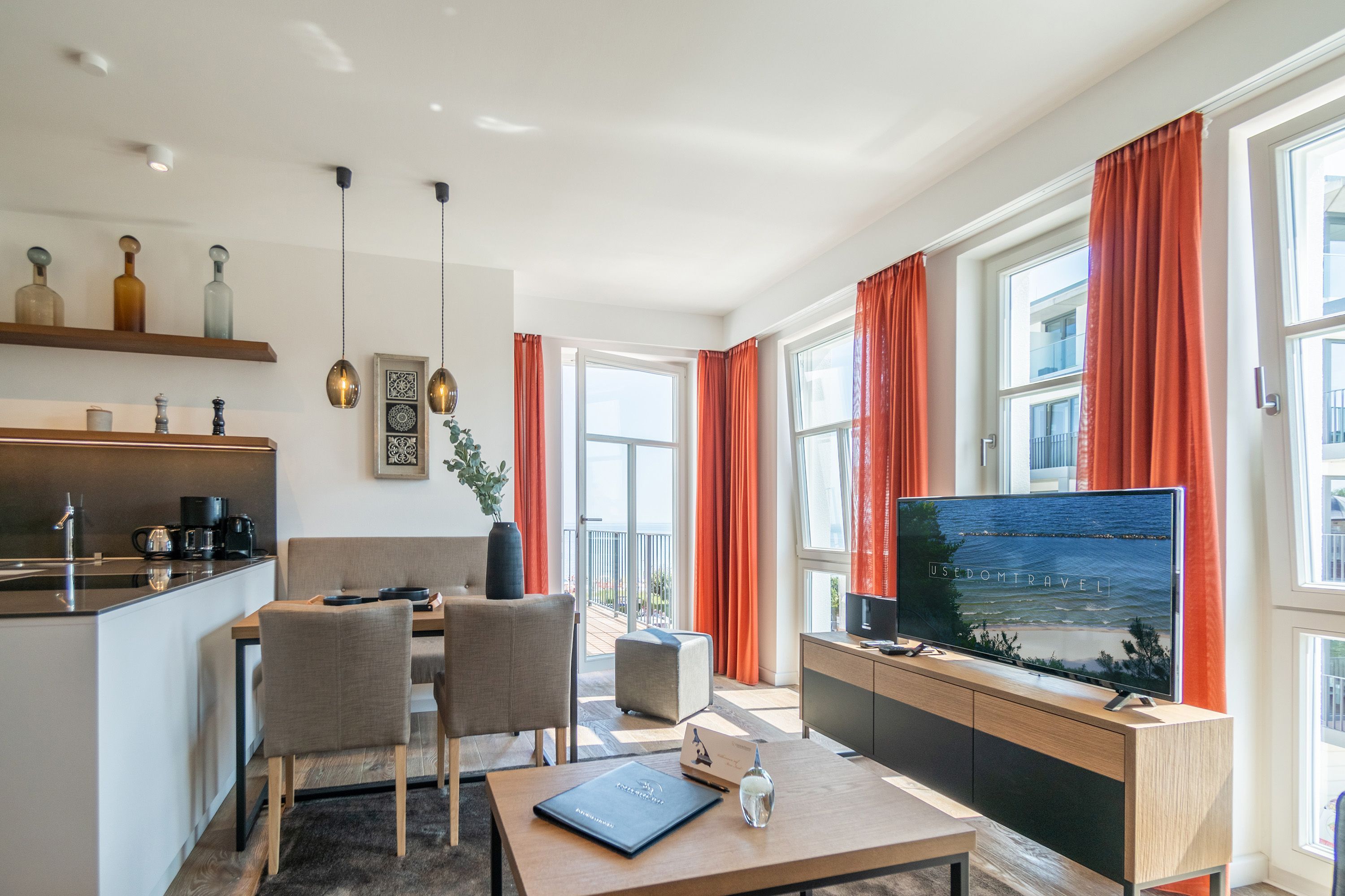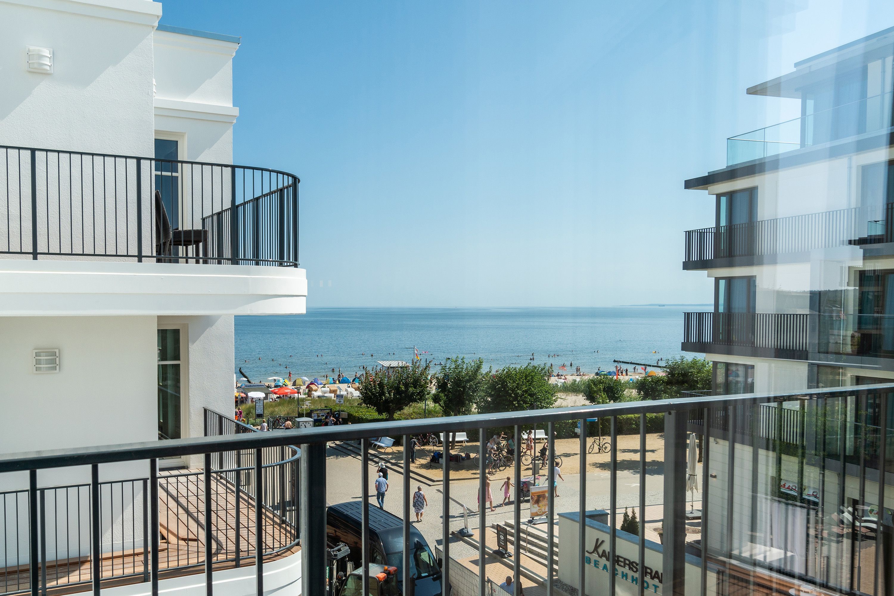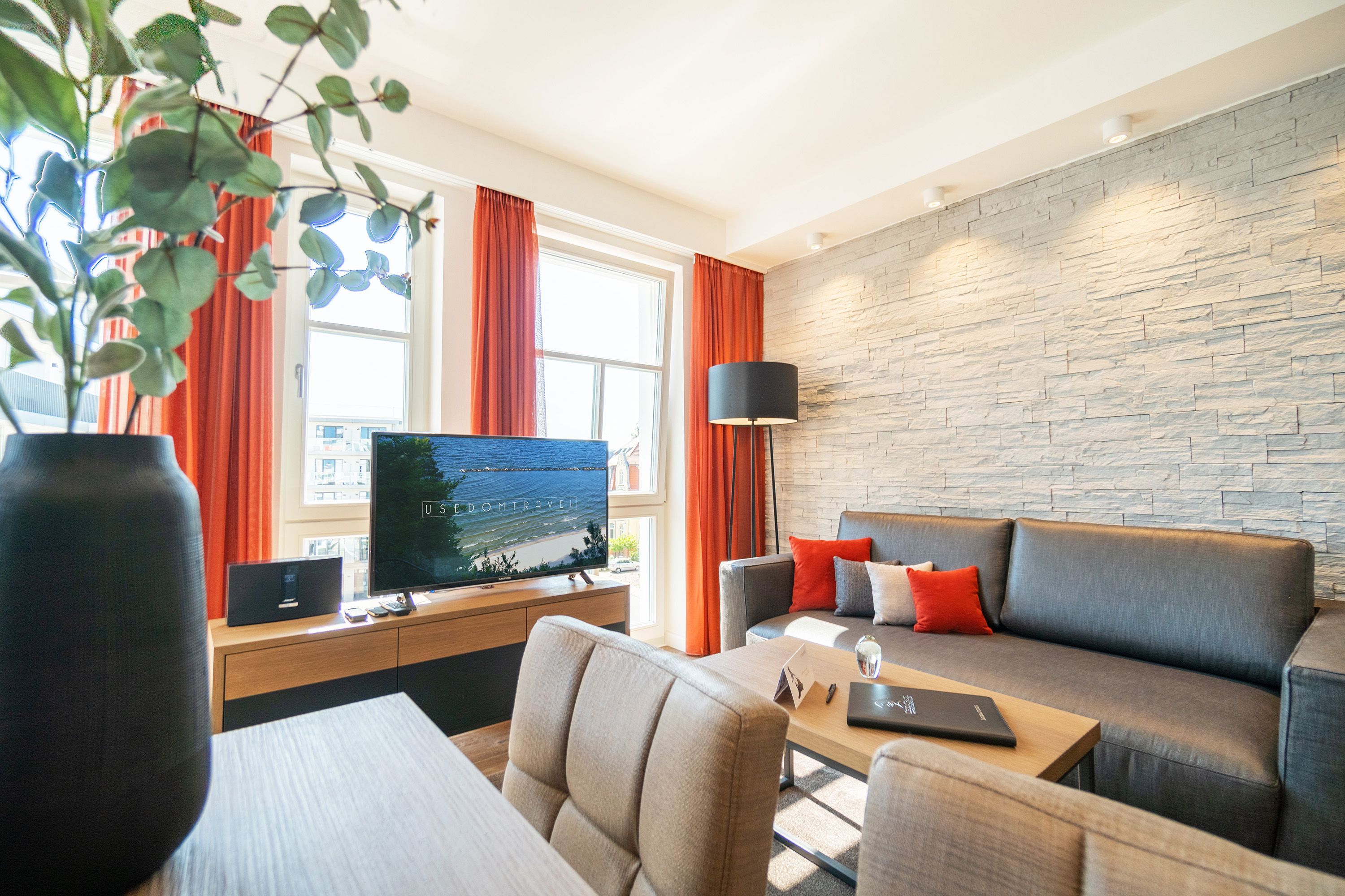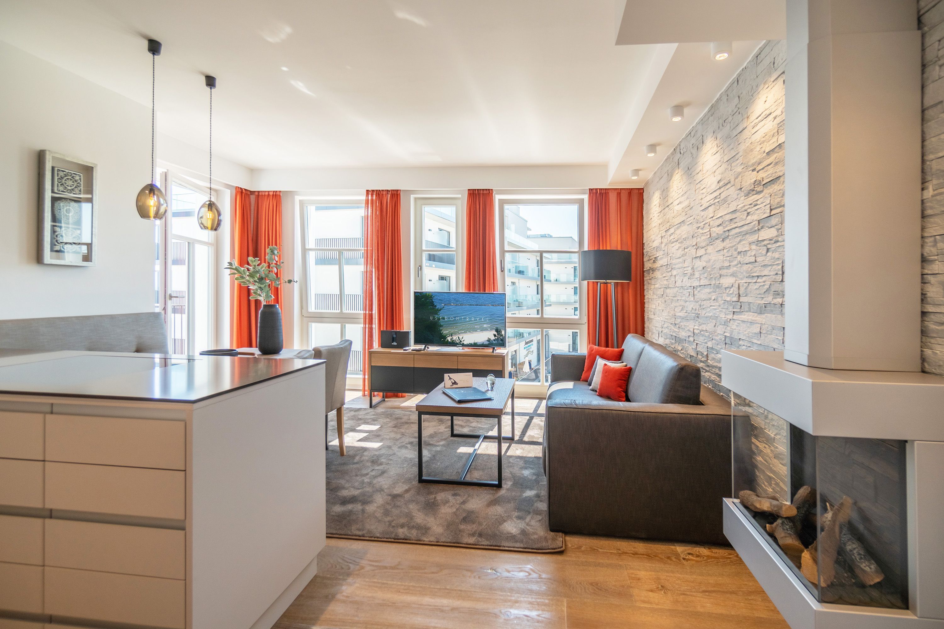 Ob mit der Familie oder mit Freunden auf diesen 69 Quadratmetern Urlaubsparadies wird Ihre Auszeit zu einem ganz besonderen Erlebnis. Allein der Blick vom Süd-Ost-Balkon über die endlose Weite der Ostsee ist Erholung pur. Tanken Sie hier schon morgens beim Frühstück Sonne satt. Bis zu vier Personen und ein Kleinkind bis drei Jahre (im Kinderreisebett) werden sich in den drei Räumen dieses stylischen Appartements pudelwohl fühlen. Erlesen und edel ist die Inneneinrichtung vom Innenarchitekten konzipiert und arrangiert. Ein geräumiges Wohn-Ess-Zimmer wartet nur darauf, Ihnen alle Annehmlichkeiten zu bieten, die Sie sich wünschen können: Vom Home-Entertainment des großen Flat-TVs und der Bose-Soundanlage, die Sie via Bluetooth mit Ihrem Handy bedienen können, über das bequeme Sofa zum Relaxen, den kuscheligen Gas-Kamin, der Gemütlichkeit auf Knopfdruck zaubert, bis hin zum edlen und schönen Esstisch, an dem Sie gemeinsam viele Muße- und Genussstunden verbringen können. Die Steinwand, die im Wohnzimmer einen absolut trendigen Akzent setzt, verleiht dem Raum durch ihre raue Naturstruktur das gewisse Etwas. Für kulinarische Urlaubsgenüsse sorgt die voll ausgestattete Küche. Kochen und vergnügen Sie sich an der freistehenden Kochinsel. Erlesenes Geschirr rundet die Gaumenfreuden mit optischem Pfiff ab. Wenn der Wunsch nach Rückzug aufkommt, bieten die beiden Schlafzimmer mit bequemen Boxspringdoppelbetten (einmal 1,80 m x 2,00 m und einmal 1,60 m x 2,00 m) die ideale Fläche für entspannende Stunden. Von beiden Schlafzimmern aus können Sie auf die Ostsee hinaus schauen. Von einem Schlafzimmer aus sogar via Balkon. Viel Ablageflächen finden Sie in den Schränken. Zwei Flat-TVs sorgen für digitale Unterhaltung. Das Appartement verfügt gar über zwei Badezimmer, die jeweils mit geräumiger Regendusche, großzügigem Waschtisch und WC ausgestattet sind. Zeigt die Ostsee einmal ihr stürmisch ungemütliches Gesicht, können Sie in der Finnischen Sauna, die zu der Wohnung gehört und direkt in eines der Bäder eingebaut ist, bei wohliger Wärme ausspannen und entspannen. Genießen Sie Ihren Urlaub! Wir kümmern uns um den Rest. So sind bei Ihrer Ankunft die Betten für Sie bezogen und Handtücher liegen bereit. In einem kleinen Hauswirtschaftsraum finden Sie einen Waschtrockner. Das WLAN ist natürlich kostenfrei. In der ultramodernen Parkgarage ist für Ihr Feriendomizil der Pkw-Stellplatz Nr. 22 reserviert.