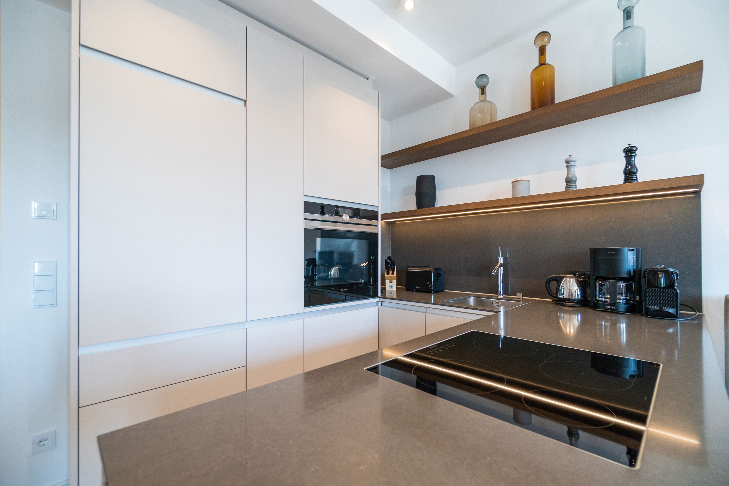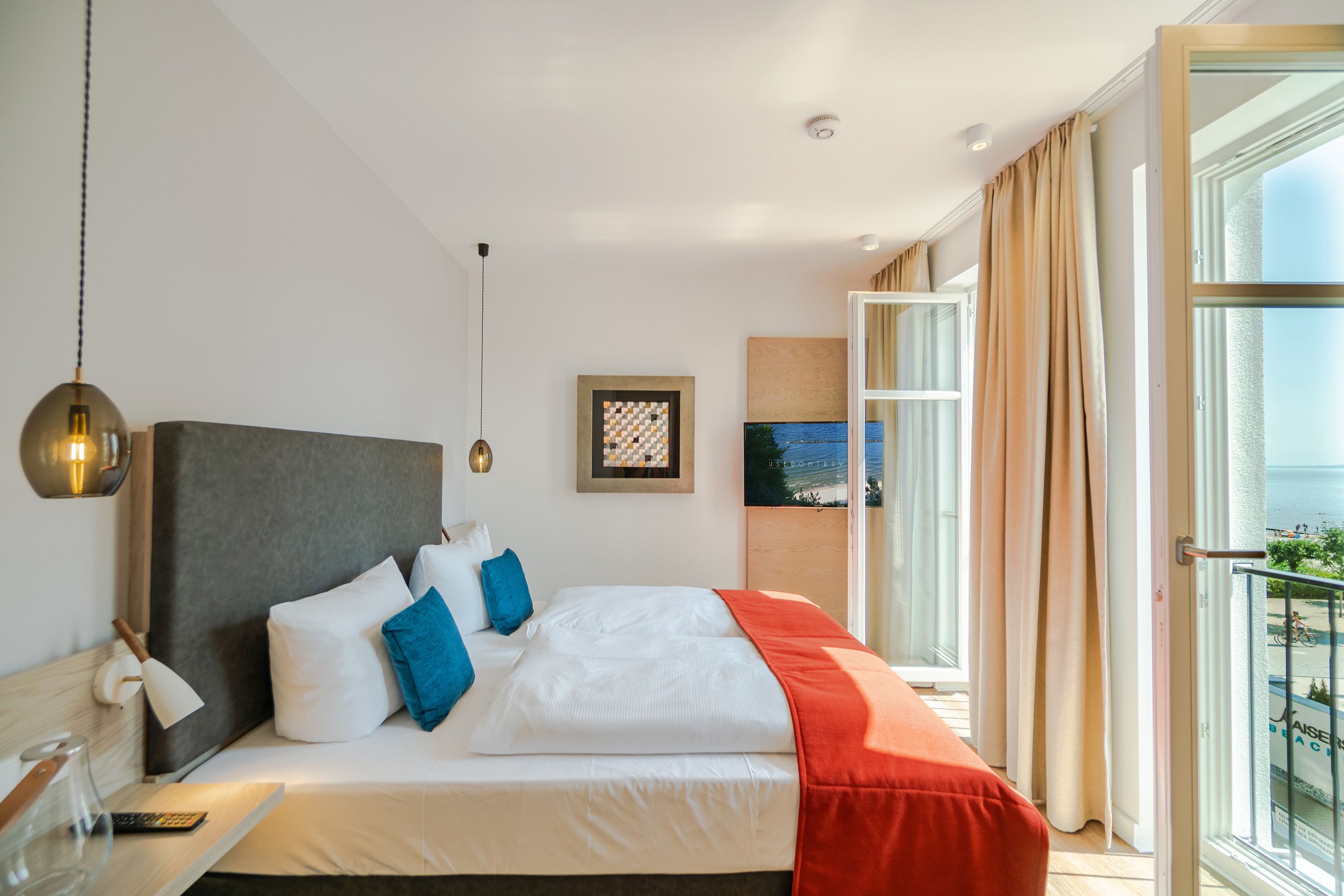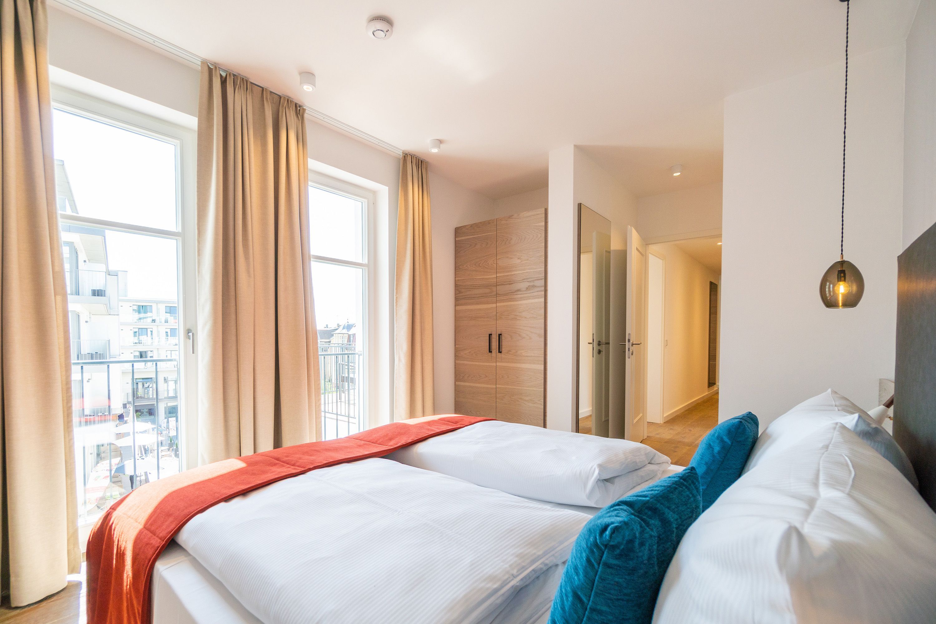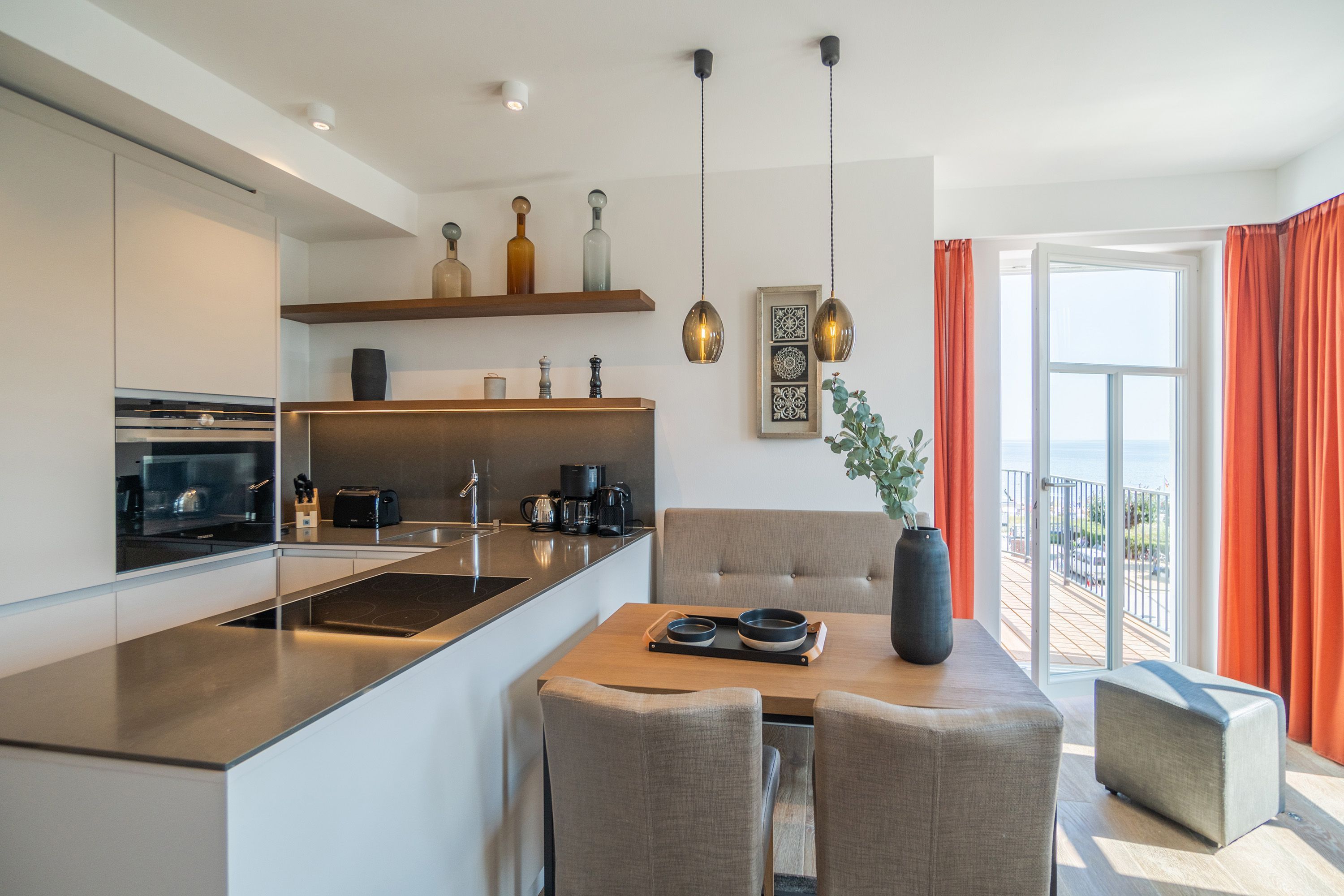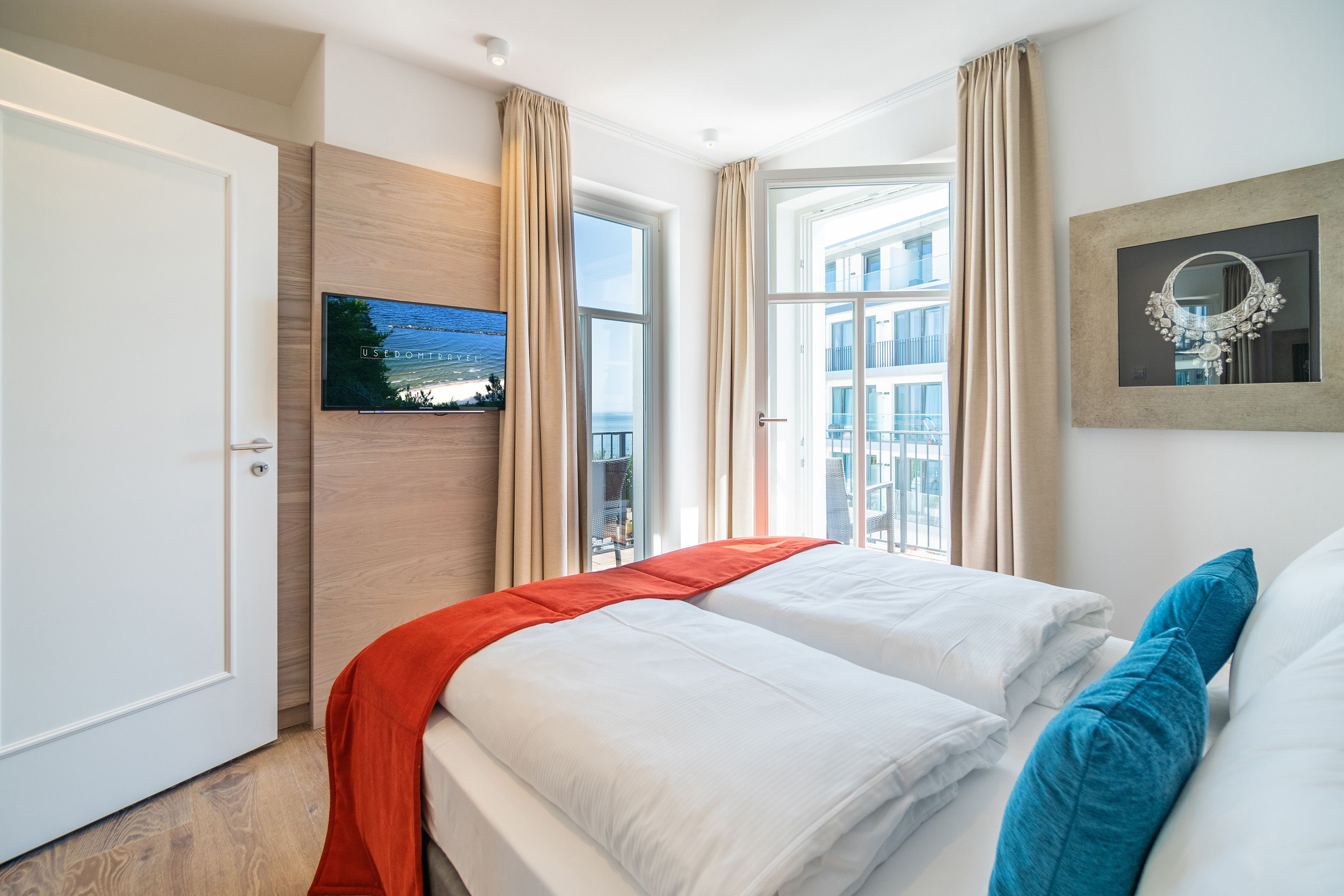 Ob mit der Familie oder mit Freunden auf diesen 69 Quadratmetern Urlaubsparadies wird Ihre Auszeit zu einem ganz besonderen Erlebnis. Allein der Blick vom Süd-Ost-Balkon über die endlose Weite der Ostsee ist Erholung pur. Tanken Sie hier schon morgens beim Frühstück Sonne satt. Bis zu vier Personen und ein Kleinkind bis drei Jahre (im Kinderreisebett) werden sich in den drei Räumen dieses stylischen Appartements pudelwohl fühlen. Erlesen und edel ist die Inneneinrichtung vom Innenarchitekten konzipiert und arrangiert. Ein geräumiges Wohn-Ess-Zimmer wartet nur darauf, Ihnen alle Annehmlichkeiten zu bieten, die Sie sich wünschen können: Vom Home-Entertainment des großen Flat-TVs und der Bose-Soundanlage, die Sie via Bluetooth mit Ihrem Handy bedienen können, über das bequeme Sofa zum Relaxen, den kuscheligen Gas-Kamin, der Gemütlichkeit auf Knopfdruck zaubert, bis hin zum edlen und schönen Esstisch, an dem Sie gemeinsam viele Muße- und Genussstunden verbringen können. Die Steinwand, die im Wohnzimmer einen absolut trendigen Akzent setzt, verleiht dem Raum durch ihre raue Naturstruktur das gewisse Etwas. Für kulinarische Urlaubsgenüsse sorgt die voll ausgestattete Küche. Kochen und vergnügen Sie sich an der freistehenden Kochinsel. Erlesenes Geschirr rundet die Gaumenfreuden mit optischem Pfiff ab. Wenn der Wunsch nach Rückzug aufkommt, bieten die beiden Schlafzimmer mit bequemen Boxspringdoppelbetten (einmal 1,80 m x 2,00 m und einmal 1,60 m x 2,00 m) die ideale Fläche für entspannende Stunden. Von beiden Schlafzimmern aus können Sie auf die Ostsee hinaus schauen. Von einem Schlafzimmer aus sogar via Balkon. Viel Ablageflächen finden Sie in den Schränken. Zwei Flat-TVs sorgen für digitale Unterhaltung. Das Appartement verfügt gar über zwei Badezimmer, die jeweils mit geräumiger Regendusche, großzügigem Waschtisch und WC ausgestattet sind. Zeigt die Ostsee einmal ihr stürmisch ungemütliches Gesicht, können Sie in der Finnischen Sauna, die zu der Wohnung gehört und direkt in eines der Bäder eingebaut ist, bei wohliger Wärme ausspannen und entspannen. Genießen Sie Ihren Urlaub! Wir kümmern uns um den Rest. So sind bei Ihrer Ankunft die Betten für Sie bezogen und Handtücher liegen bereit. In einem kleinen Hauswirtschaftsraum finden Sie einen Waschtrockner. Das WLAN ist natürlich kostenfrei. In der ultramodernen Parkgarage ist für Ihr Feriendomizil der Pkw-Stellplatz Nr. 22 reserviert.