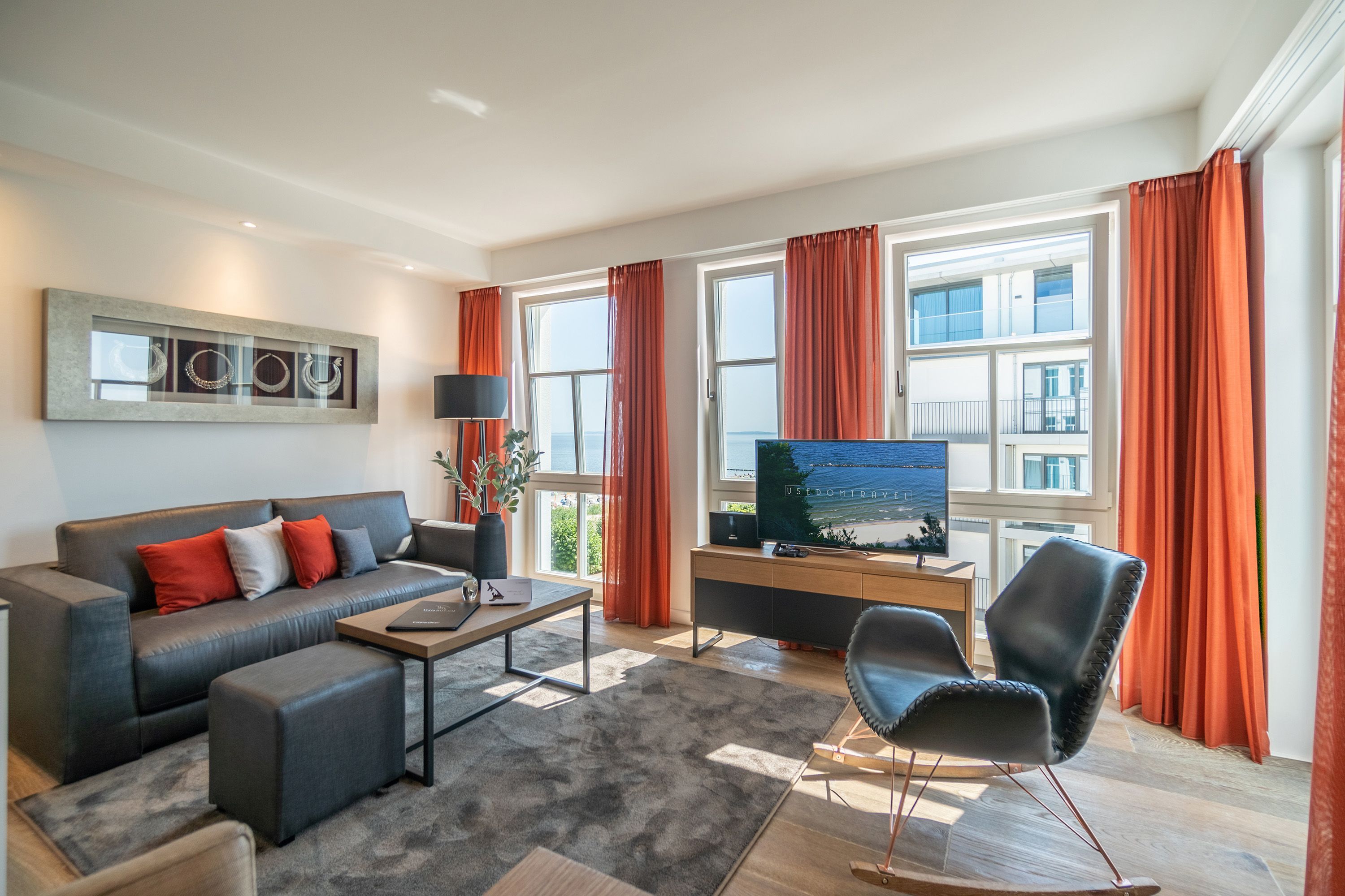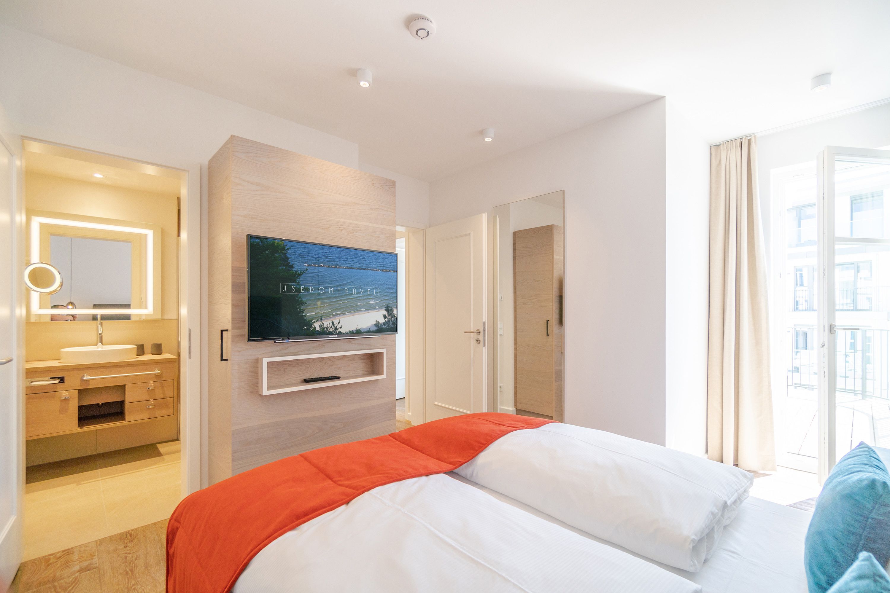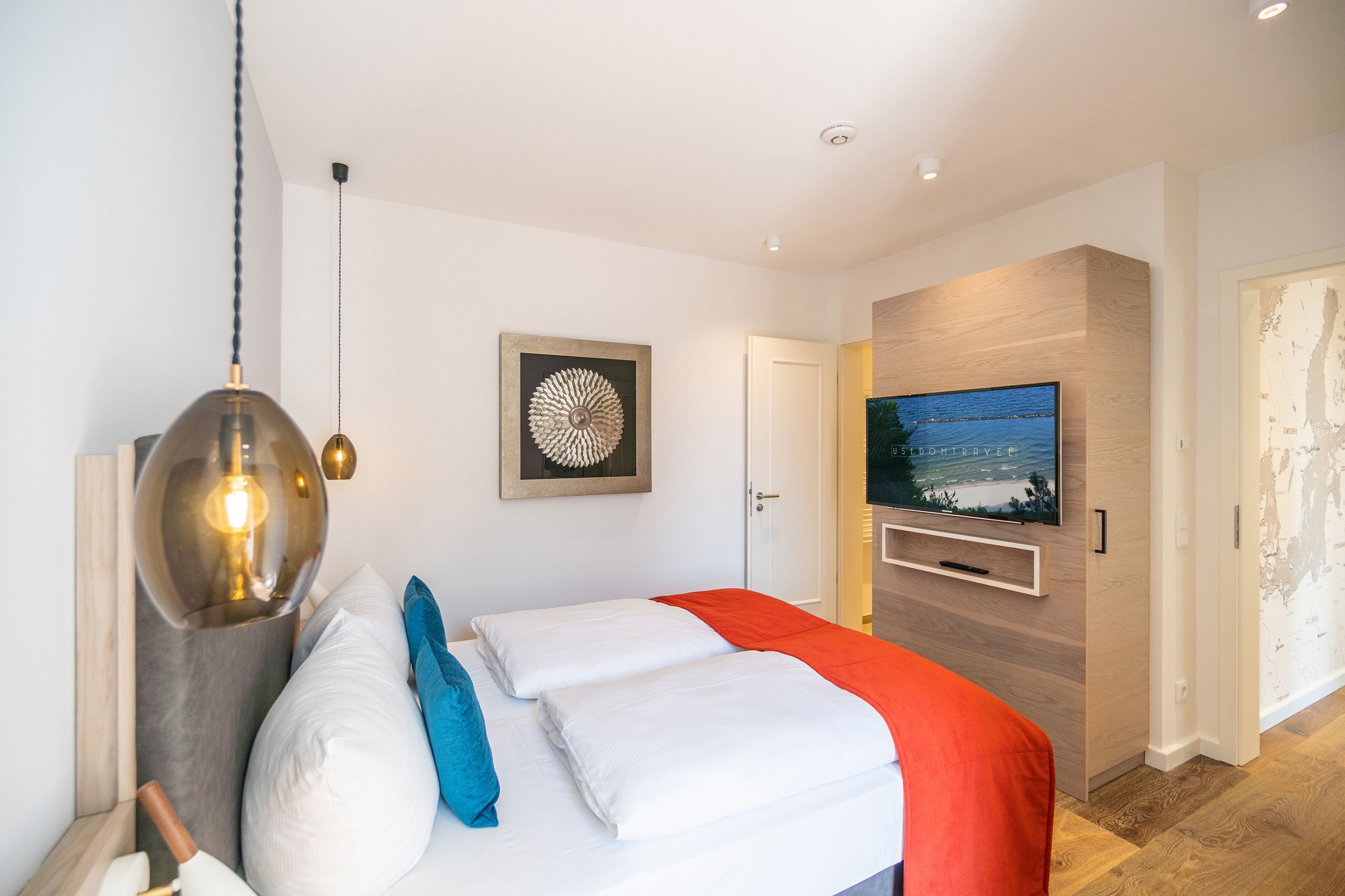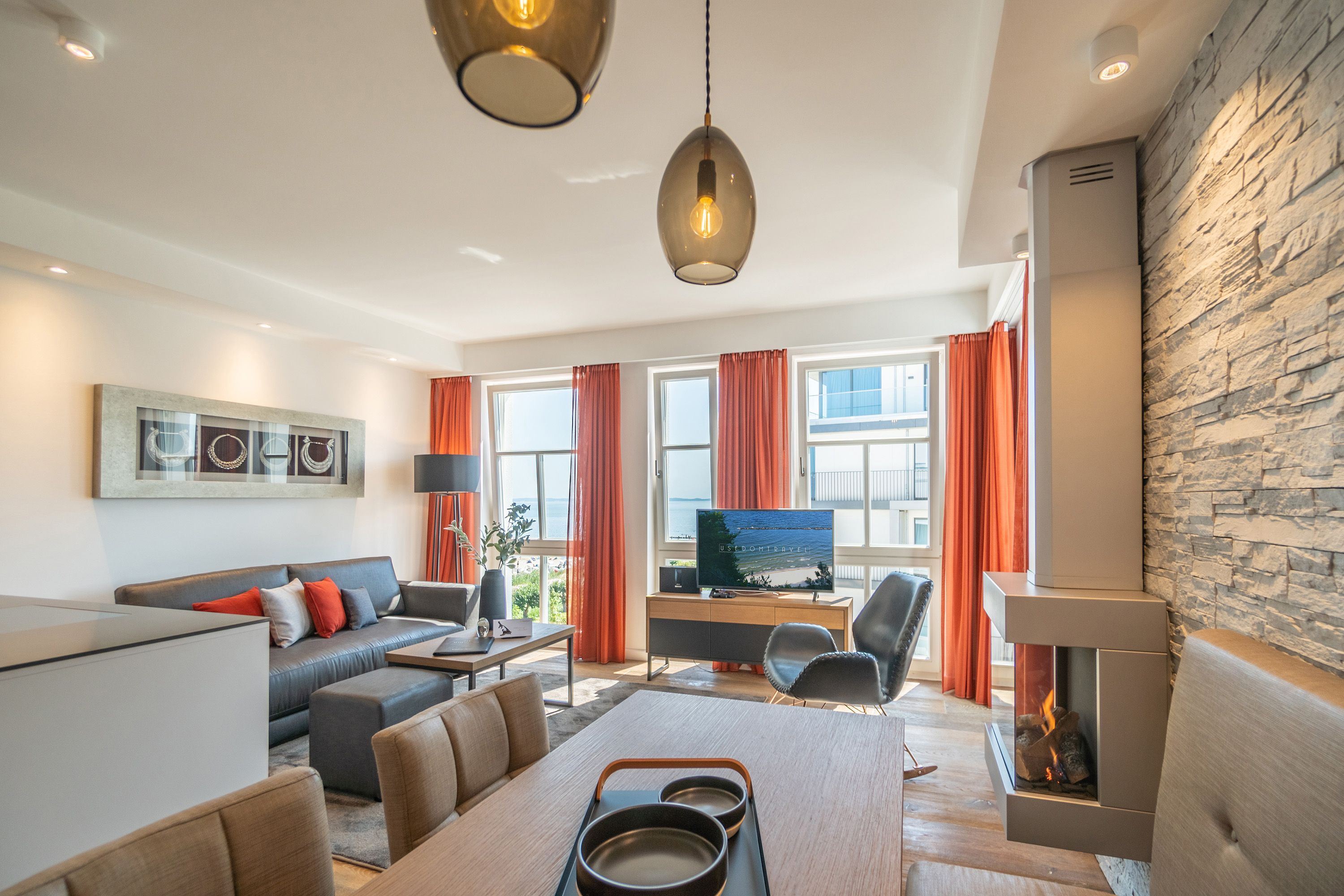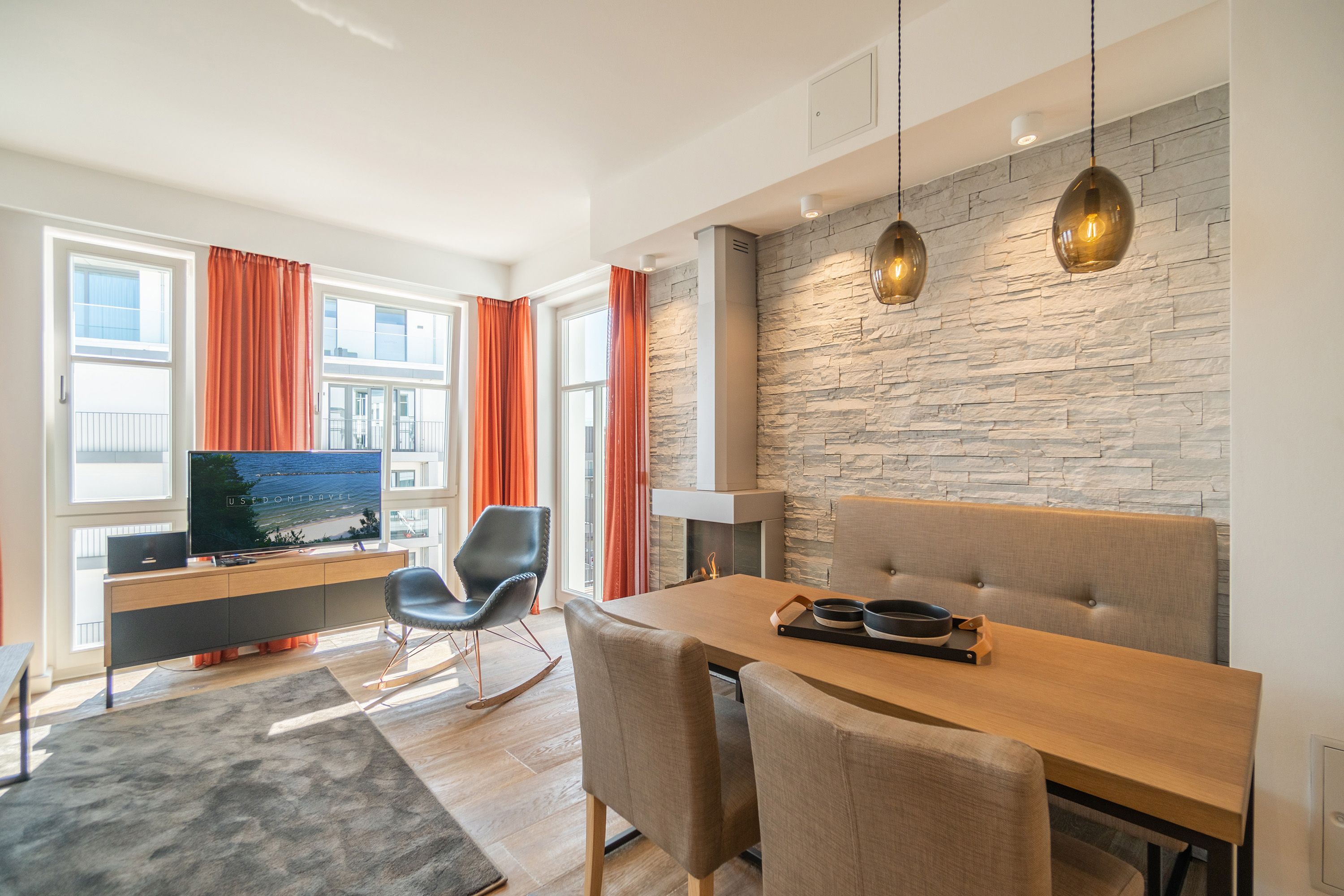 Von der Sonne verwöhnt wird dieses wunderschöne, 66 Quadratmeter große Appartement im 3. Obergeschoss. Schon direkt nach dem Aufstehen können Sie auf dem Balkon nicht nur die Morgensonne, sondern auch den Blick auf die glitzernde Ostsee genießen. Schöner kann der Urlaubstag doch nicht beginnen. Hell und sonnendurchflutet sind auch die drei Räume Ihres Urlaubsdomizils. Exklusivität und modernes Wohndesign treffen hier auf Leichtigkeit und Behaglichkeit. Ausgesuchte Design-Möbel, ein Bose-Soundsystem, das über das Handy bedienbar keine Klangwünsche offen lässt, ein Gas-Kamin, der auf Knopfdruck eine wohlige Kuschelatmosphäre verbreitet die Liste an besonderen Annehmlichkeiten, die dieses Appartement zu bieten hat, ist lang. Das offene Wohn-Esszimmer verfügt über einen riesigen Flat-TV, eine gemütliche Sofa-Sitzgruppe mit Schaukelstuhl, einen schönen, großen Esstisch und eine voll ausgestattete Küche. In dieser werden begeisterte Kochherzen höher schlagen. Denn hochwertige Markengeräte, edles Geschirr von ASA, eine von drei Seiten zugängige Kochinsel alles in modernem und zeitlos schlichtem Design warten nur darauf, dass sie damit ihre kreativen Gaumenfreuden in die Tat umsetzen. Die beiden Schlafzimmer sind mit bequemen Boxspringdoppelbetten (1,60 x 2,00), ablagefreudigen Schränken, Flat-TV und einem Zugang zum umlaufenden Süd-Ost-Balkon ausgestattet. Lassen Sie sich einfach fallen. Den Rest erledigt die wunderbare Wohlfühlatmosphäre. In zwei Bädern können sich Auszeithungrige frisch machen. Beide Badezimmer besitzen geräumige Regen-Duschen, einen großzügigen Waschtisch und ein WC. Wellness-Highlight des Masterbades ist eine Panoramasauna, die eine ganz private Entspannungsauszeit an kühlen Tagen oder Abenden erlaubt. In der Wohnung gibt es einen kleinen Abstellraum mit einem Waschtrockner. Bei uns wird Rundum-sorglos groß geschrieben. Darum sind bei Ihrer Anreise die Betten bezogen und Handtücher liegen für Sie bereit. Zudem ist das WLAN in der Wohnung kostenfrei. In der hochmodernen Tiefgarage ist für Sie der Pkw-Stellplatz Nr. 21 reserviert.