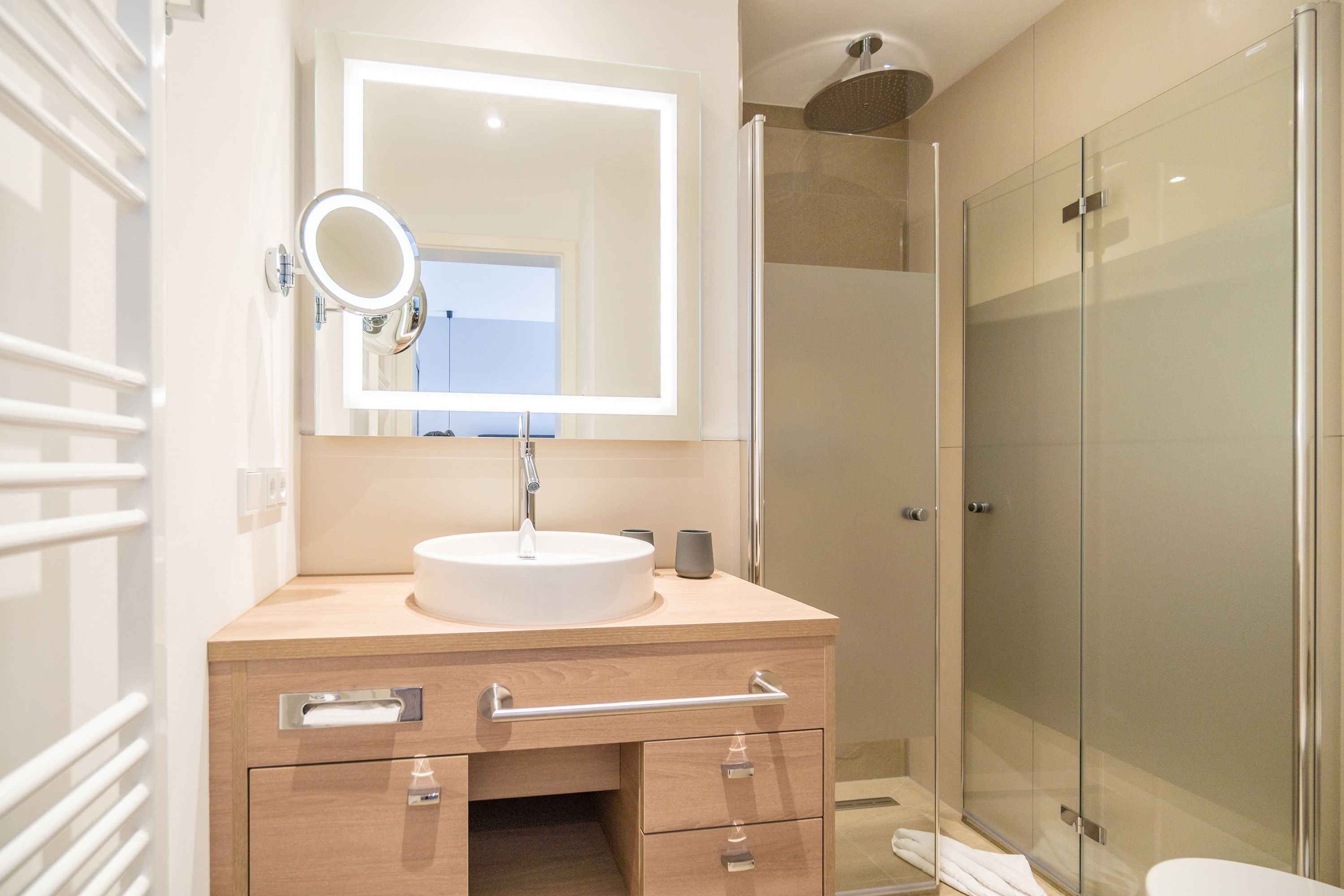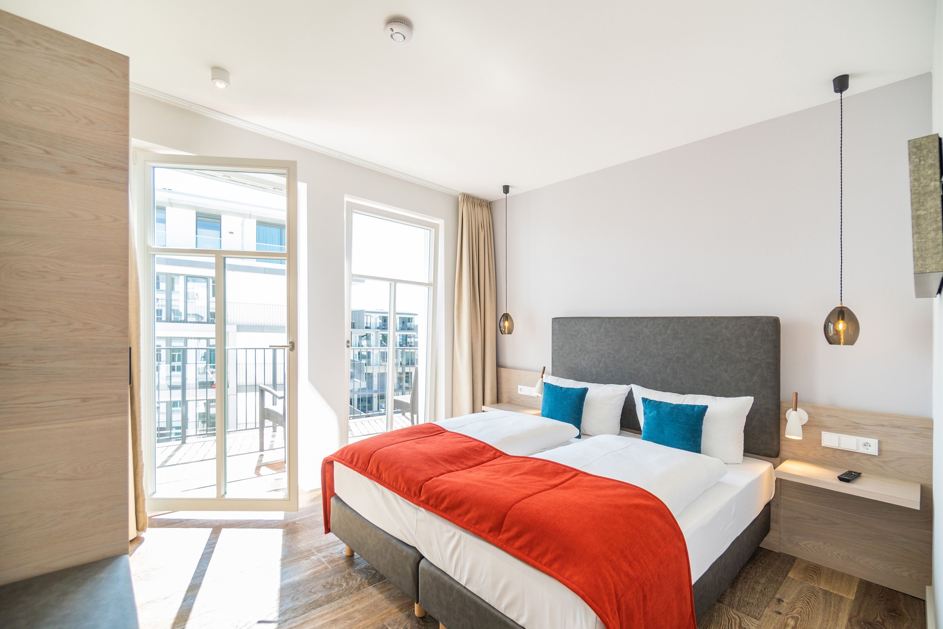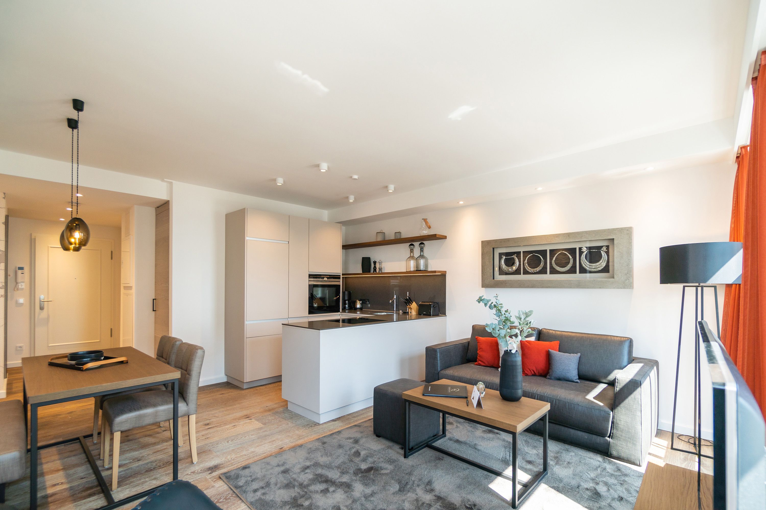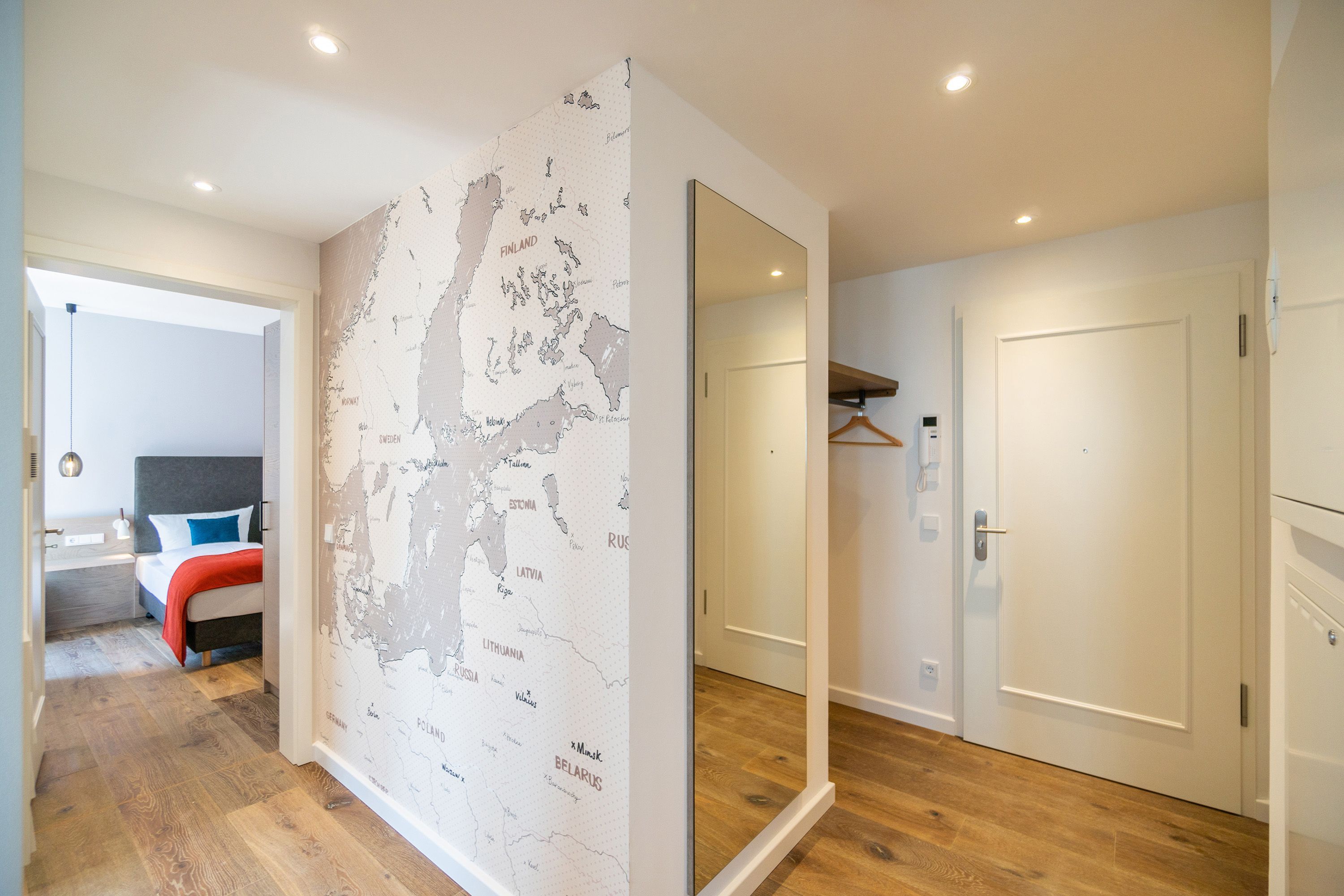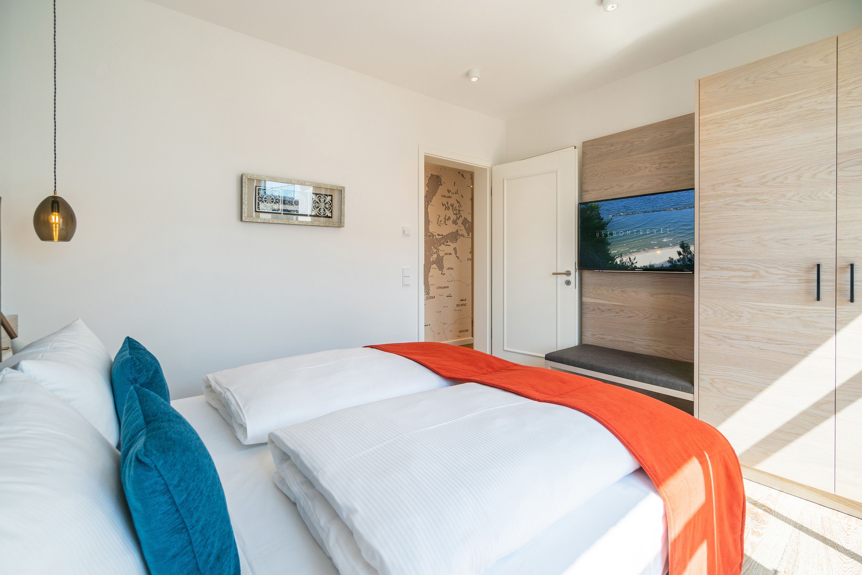 Von der Sonne verwöhnt wird dieses wunderschöne, 66 Quadratmeter große Appartement im 3. Obergeschoss. Schon direkt nach dem Aufstehen können Sie auf dem Balkon nicht nur die Morgensonne, sondern auch den Blick auf die glitzernde Ostsee genießen. Schöner kann der Urlaubstag doch nicht beginnen. Hell und sonnendurchflutet sind auch die drei Räume Ihres Urlaubsdomizils. Exklusivität und modernes Wohndesign treffen hier auf Leichtigkeit und Behaglichkeit. Ausgesuchte Design-Möbel, ein Bose-Soundsystem, das über das Handy bedienbar keine Klangwünsche offen lässt, ein Gas-Kamin, der auf Knopfdruck eine wohlige Kuschelatmosphäre verbreitet die Liste an besonderen Annehmlichkeiten, die dieses Appartement zu bieten hat, ist lang. Das offene Wohn-Esszimmer verfügt über einen riesigen Flat-TV, eine gemütliche Sofa-Sitzgruppe mit Schaukelstuhl, einen schönen, großen Esstisch und eine voll ausgestattete Küche. In dieser werden begeisterte Kochherzen höher schlagen. Denn hochwertige Markengeräte, edles Geschirr von ASA, eine von drei Seiten zugängige Kochinsel alles in modernem und zeitlos schlichtem Design warten nur darauf, dass sie damit ihre kreativen Gaumenfreuden in die Tat umsetzen. Die beiden Schlafzimmer sind mit bequemen Boxspringdoppelbetten (1,60 x 2,00), ablagefreudigen Schränken, Flat-TV und einem Zugang zum umlaufenden Süd-Ost-Balkon ausgestattet. Lassen Sie sich einfach fallen. Den Rest erledigt die wunderbare Wohlfühlatmosphäre. In zwei Bädern können sich Auszeithungrige frisch machen. Beide Badezimmer besitzen geräumige Regen-Duschen, einen großzügigen Waschtisch und ein WC. Wellness-Highlight des Masterbades ist eine Panoramasauna, die eine ganz private Entspannungsauszeit an kühlen Tagen oder Abenden erlaubt. In der Wohnung gibt es einen kleinen Abstellraum mit einem Waschtrockner. Bei uns wird Rundum-sorglos groß geschrieben. Darum sind bei Ihrer Anreise die Betten bezogen und Handtücher liegen für Sie bereit. Zudem ist das WLAN in der Wohnung kostenfrei. In der hochmodernen Tiefgarage ist für Sie der Pkw-Stellplatz Nr. 21 reserviert.
