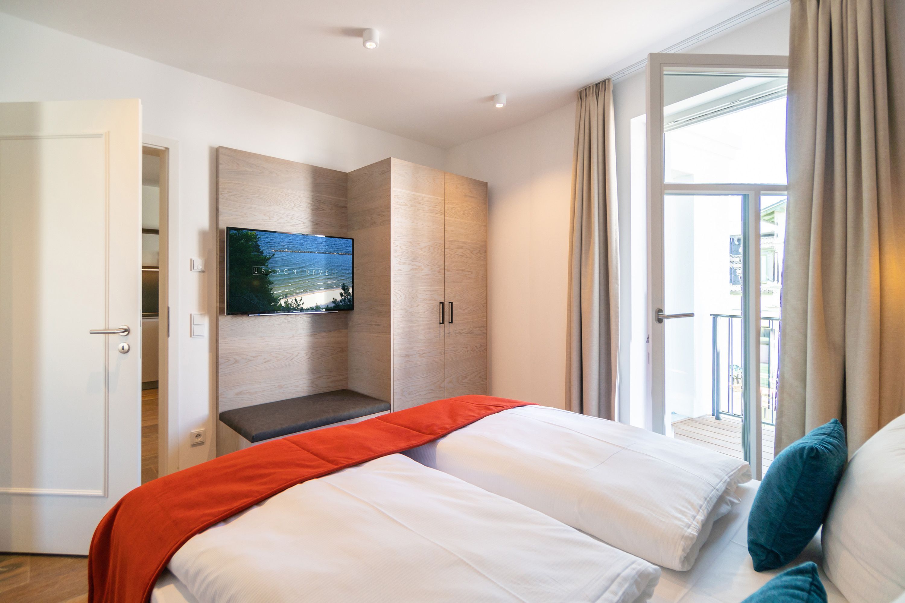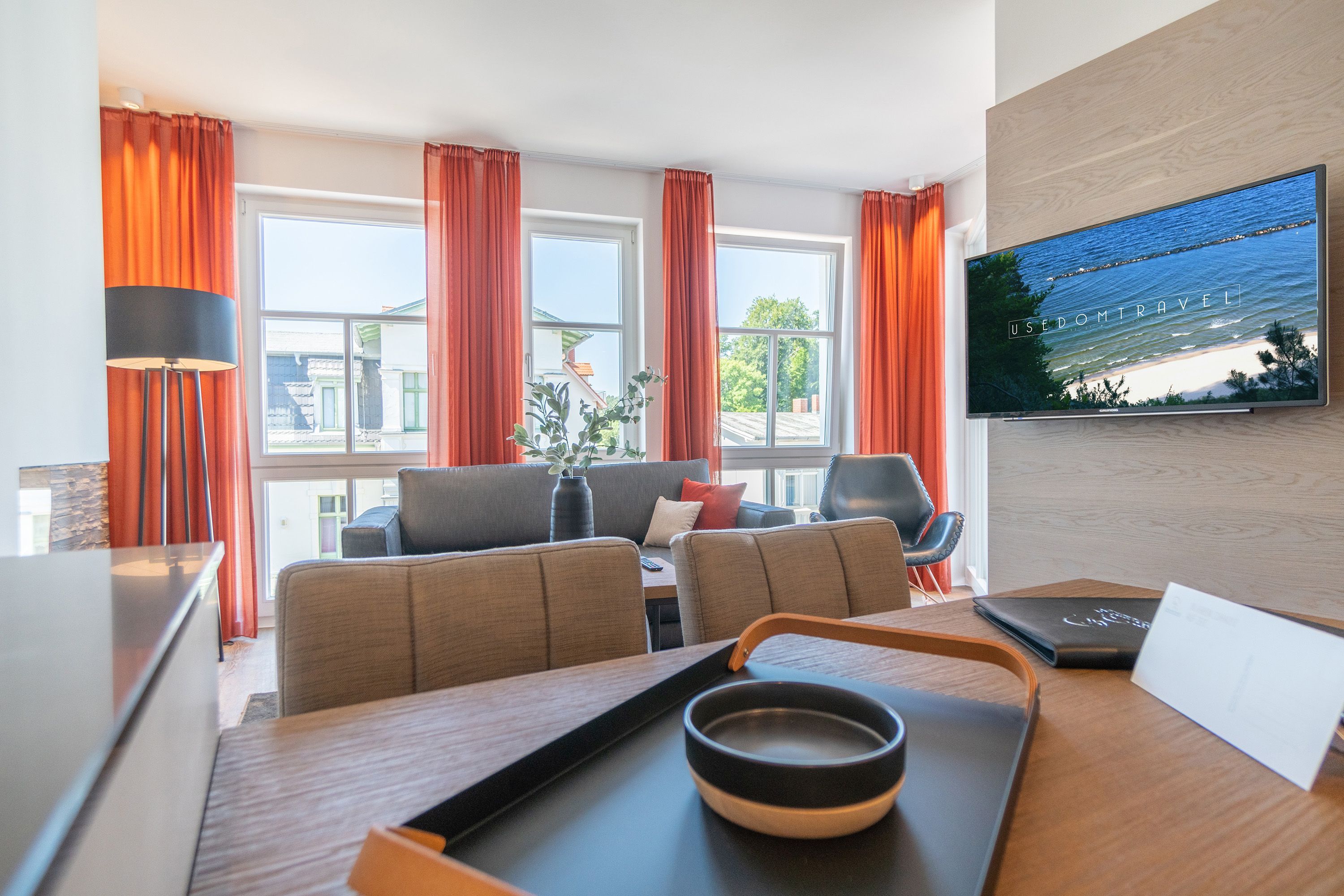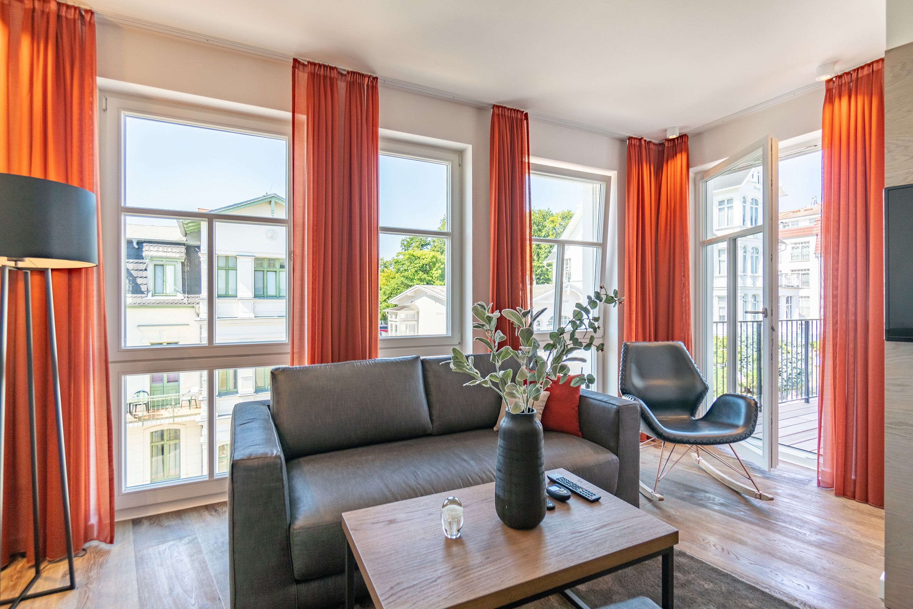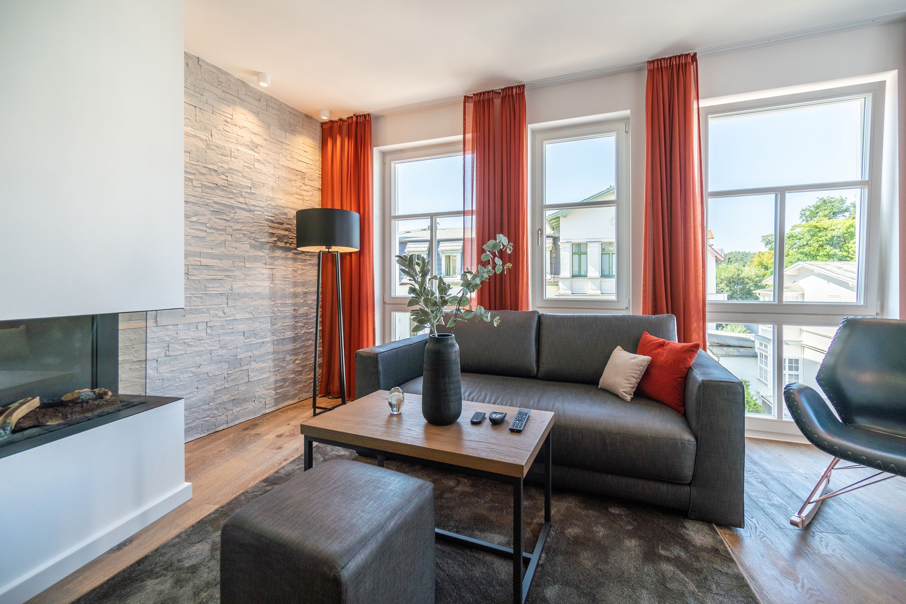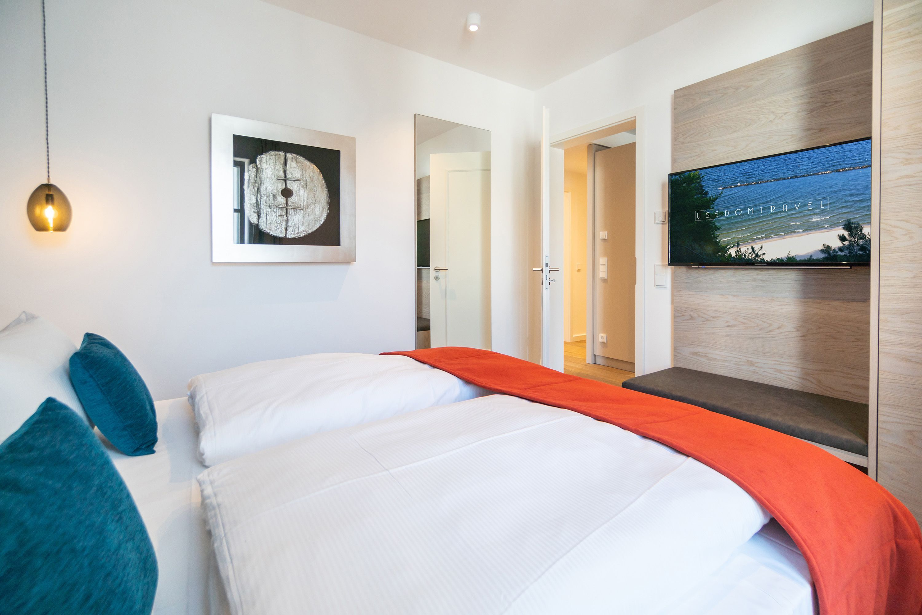 68 Quadratmeter groß ist dieses stylische Urlaubsparadies für vier Personen und ein Kleinkind bis drei Jahre (im Kinderreisebett). Ein Fahrstuhl bringt Sie bis in den dritten Stock. Wohnkomfort vom Feinsten, ausgesuchte und extra angefertigte Möbel, hochwertige Technik in diesen drei Zimmern wird Ihr Urlaub zu einer unvergesslich schönen Zeit. Mitten im Herzen des Kaiserbades Bansin und doch hier oben, im dritten Stock, hoch genug, um dem Trubel auch wieder zu entfliehen und eine erholsame Zeit in einem wunderschönen Ambiente zu verbringen. Von Designerhand konzipiert, erwartet Sie in diesem Appartement zeitlose Eleganz. Naturmaterialien wie Holz und Stein sowie ein angenehmes Farbkonzept sorgen für viel Harmonie. Entspannen Sie auf dem Sofa oder dem Schaukelstuhl vor dem Kamin, dessen Flammenspiel Sie per Knopfdruck steuern können. Große Flat-TVs in jedem Zimmer, eine Hi-Fi-Anlage mit Bluetooth-Funktion, kostenloses WLAN hier wird es Ihnen an Nichts fehlen. Die offene Wohnküche verspricht genussvolles Zubereiten und Essen. Denn sie ist mit sämtlichen Gerätschaften und dazu mit erlesenem Geschirr ausgestattet. Der schöne Esstisch ist für gesellige Stunden bestens geeignet. Jedes der drei Zimmer hat einen Zugang zum neun Quadratmeter großen Balkon in Süd-West-Ausrichtung, von dem aus Sie auf wunderschöne alte Bädervillen schauen. In den romantischsten Farben sind von hier aus die Sonnenuntergänge zu beobachten. Und auch die Ostsee haben Sie von hier immer im Blick. Zwei komfortable Boxspringdoppelbetten (1,80 m x 2,00 m) verhelfen Ihnen zu wahrem Schlafvergnügen. Große Schränke bieten viel Platz für den Kofferinhalt. Gleich mit zwei Bädern wartet Ihr Urlaubsdomizil auf. Beide verfügen über eine ebenerdige Regendusche, einen Waschtisch und ein WC. Darüber hinaus empfängt Sie im Masterbad eine Finnische Sauna. Hier können Sie es sich an tristen Tagen oder ungemütlichen Abenden so richtig gut gehen lassen. Ausspannen der Extra-Klasse. Für Handtücher ist gesorgt und die Betten sind bei Ihrer Ankunft bezogen. In einem kleinen Hauswirtschaftsraum steht ein Wasch-Trockner. Der Stellplatz Nr. 24 in der Tiefgarage gehört zur Wohnung Nummer 24.