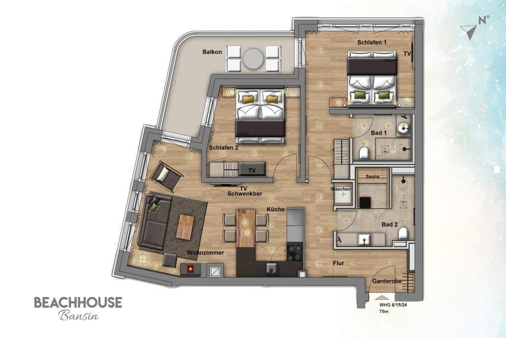 Im Erdgeschoss befindet sich neben einer Bäckerei auch das bekannte und belebte Fischrestaurant Gosch. Dieses bietet neben seinem gastronomischen Angebot auch Live-Veranstaltungen und Tanzabende. Balkone und Erker erlauben wunderschöne Ausblicke schon zum Sonnenaufgang und laden zum Relaxen ein. Stilvoll geht es auch im Inneren des Beachhouses zu. Innenarchitekten und Designer haben ein jedes Appartement mit Fingerspitzengefühl und viel Liebe zum Detail konzipiert. Verarbeitet wurden nur hochwertige Materialien. Die Farben sind in jeder Wohnung ganz individuell und harmonisch aufeinander abgestimmt. Alle Appartements verfügen über Fußbodenheizung sowie über eine eigene Sauna. Und das Schönste: Der Strand befindet sich direkt vor der Haustür! Für Ihren Pkw steht in der Tiefgarage (Einfahrtshöhe 2,00 m, untere Ebene 1,85 m), teilweise mit Doppelparker (max. Höhe 1,90) ein Stellplatz zur Verfügung. Sie brauchen also nur noch ankommen, abschalten und Ihre Auszeit in Bansin in einem Wohlfühlparadies genießen, aus dem Sie nicht wieder wegwollen. Natürlich müssen Sie auch nicht auf den Komfort eines Neubaus verzichten, Aufzug und kostenfreies WLAN sind hier selbstverständlich.