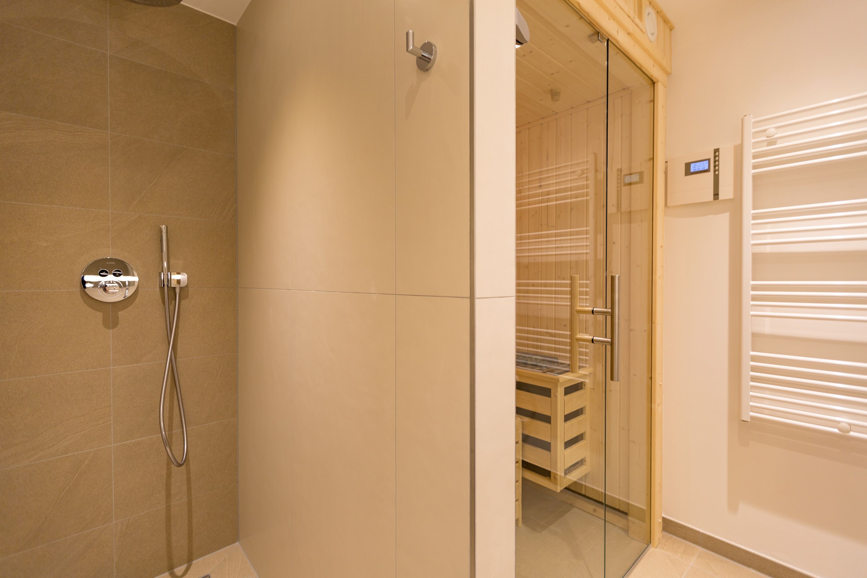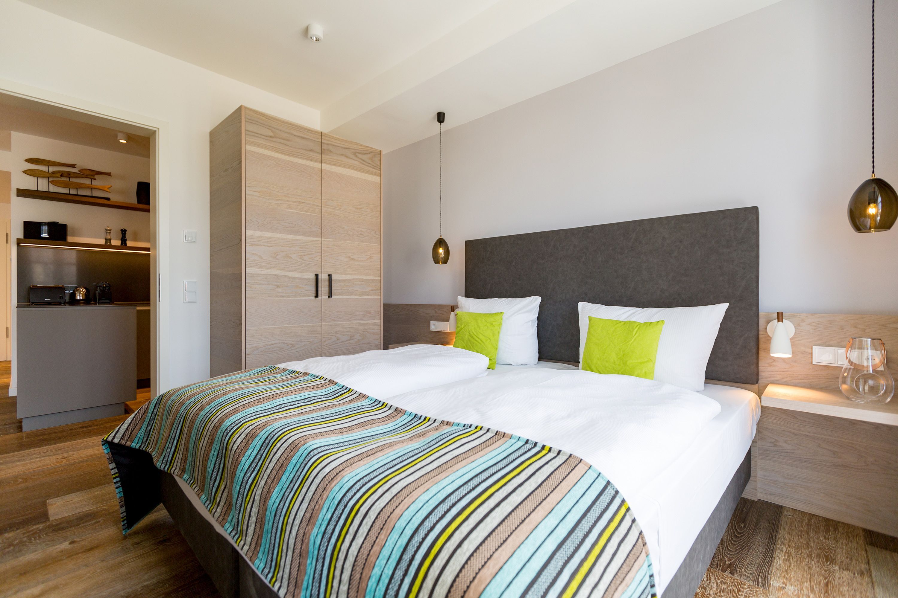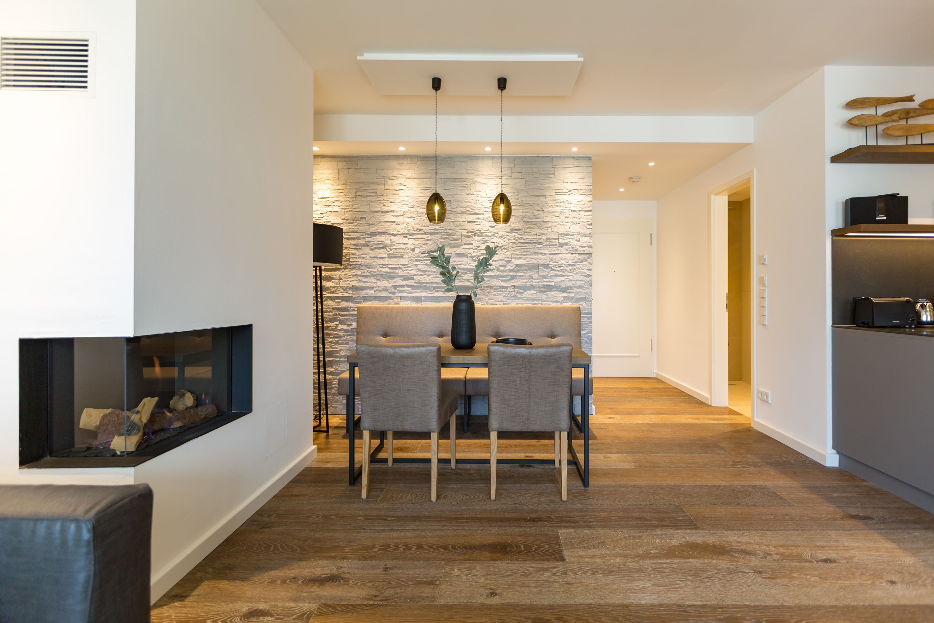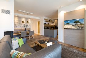 Modernes Design, exklusiver Wohnkomfort und die Ostsee vor der Haustür das Appartement Nummer 16 im 2. Stock bietet auf seinen 52 Quadratmetern für zwei Personen einen Urlaub der Extra-Klasse. Eine kuschelige Wohlfühlzone, die zum Entspannen einlädt. Zwei Zimmer, die Ihnen eine unvergesslich schöne Zeit bescheren. Reißen Sie die bodentiefen Fenster weit auf! Und lassen sie die frische Ostseebrise hinein. Atmen Sie die frische Luft, die vom nur ein paar Meter entfernten Strand zu Ihnen herüberweht, tief ein und genießen Sie den Blick über das endlos weite Blau vom Balkon (7 Quadratmeter groß), der mit seinen Möbeln auch zum entspannten Sitzen einlädt. Das Wohnzimmer ist hell und geräumig. Hier ist alles ins richtige Licht gerückt. Auch, wenn die Sonne hinter den schönen Bädervillen von Bansin verschwunden ist, spenden die ausgewählten Design-Lampen viel warmes Licht. Ein Gas-Kamin sorgt für Gemütlichkeit. Genauso wie das bequeme Sofa. Hier können Sie kuscheln, was das Zeug hält. Erlesene Naturmaterialien wie das Holz des Fußbodens oder der Stein der Wandverkleidung verleihen dem Ambiente einen warmen und natürlichen Grundton. Der schöne Esstisch mit den Stühlen und der urigen Bank eignet sich ideal zum Schlemmen und für gemeinsame Stunden. Eine offene Küche schließt sich dem Wohnzimmer unmittelbar an. Hier finden Sie alles, was für die Zubereitung eines feinen Essens, fürs ausgiebige Frühstück oder einen schnellen Snack zwischendurch benötigt wird. Die Geräte wie Herd, Backofen, Kaffeemaschine oder Geschirrspüler sind hochwertige Markengeräte. Edles Geschirr finden Sie in den dazugehörenden Schränken. Das große Boxspringdoppelbett (1,80 m x 2,00 m) im Schlafzimmer verführt zu wundervoll erholsamen Träumen. Ein geräumiger Schrank bietet viel Platz für die Urlaubsgarderobe. Sowohl vom Schlafzimmer als auch vom Wohnzimmer aus haben Sie Zugang zum Balkon. Die Wohnung ist elektronisch hochwertig ausgerüstet. Zwei Flat-TVs bieten Home-Entertainment vom Feinsten. Eine Bose-Soundanlage mit Bluetooth-Funktion bringt Ihre Lieblingsmusik mit sattem Sound zum Klingen. Das WLAN ist kostenfrei. Im Badezimmer erwartet Sie eine kleine Wellness-Oase mit einer Finnischen Sauna, einer Regendusche, einem Waschtisch und WC. Für den rundum sorglosen Urlaub haben wir die Betten für Sie bezogen und Handtücher bereit gelegt. In einem separaten Hauswirtschaftsraum können Sie Ihre Wäsche im Waschtrockner reinigen. In der modernen Tiefgarage ist für Sie der Stellplatz Nr. 16 im Doppelparker unten (max. Höhe 1,85 m, max. Länge 5,10 m, max. Breite 2,50 m, max. Last 2.600 kg) reserviert.