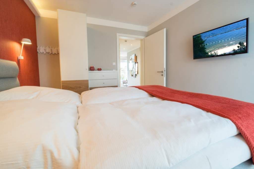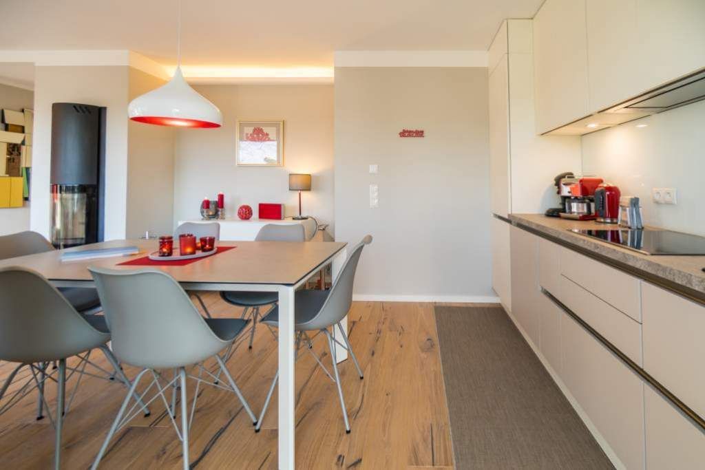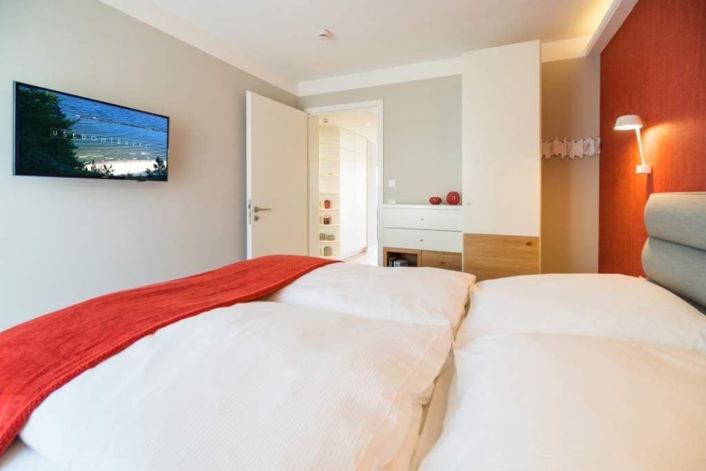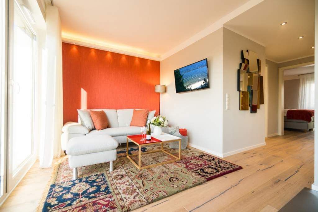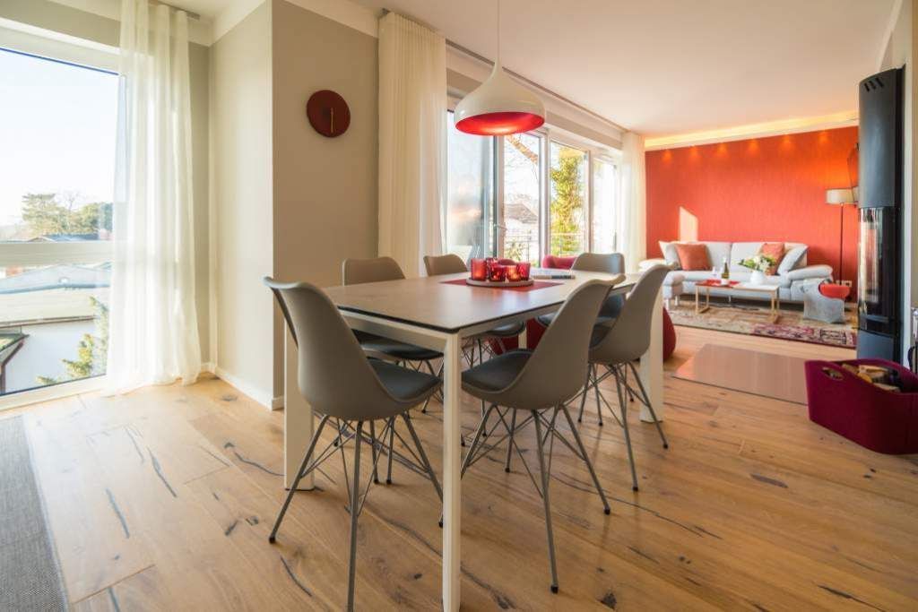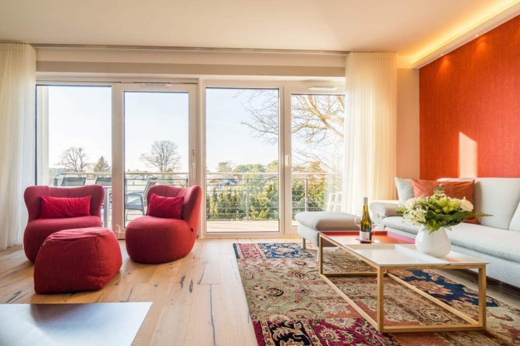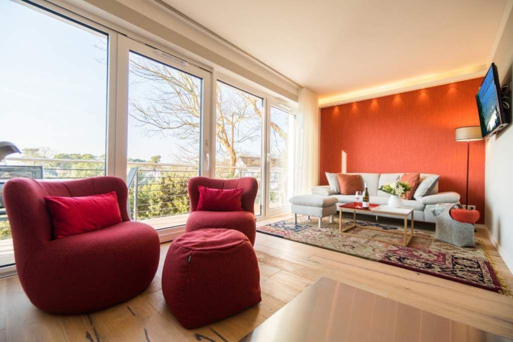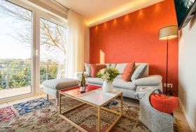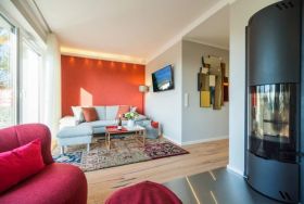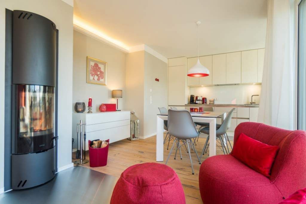 Sie lieben das Besondere und schätzen Design und Geschmack? Dann ist das zeitlos und noble Ferienappartement im Quartier am Fischerstrand Nummer 4 genau richtig für Sie, denn es ist von Innenarchitekten designt und lässt keine Wünsche offen. Bodentiefe, große Fenster lassen viel Licht in dieses Urlaubsdomizil für 4 Personen. Viel Weiß in Verbindung mit wohlgesetzten Farbakzenten in Orange und Rot bringen Leichtigkeit und Luftigkeit hinein. Hier können Sie tief durchatmen, sich wohlfühlen und ihren Urlaub in vollen Zügen genießen. Denn die 72 Quadratmeter sind geräumig, wunderbar hell und machen es zum idealen Urlauben, wo Sie Hektik und Stress schnell vergessen können. Vom großen Balkon aus vor Ihrem Wohnzimmer haben Sie einen weiten Blick über die Schönheit der alten Bädervillen von Heringsdorf. Genießen Sie von hier die frische Ostseebrise, relaxen Sie bei einem kühlen Getränk am Balkontisch oder auf der Sofalandschaft, die hinter den Glasscheiben nur darauf wartet, Ihnen entspannte Mußestunden zu schenken. An kühlen Tagen wärmt ein echter Kaminofen und verbreitet mit dem wohligen Knacken der brennenden Holzscheite urige Gemütlichkeit. Die offene Küche ist voll ausgestattet mit hochwertigen Geräten und Geschirr und verfügt über einen schönen großzügigen Essplatz. Zwei Schlafzimmer warten mit komfortablen Boxspring-Doppelbetten (beide 1,60 x 2,00 m) zum Schlafen und Kuscheln auf Sie. Schränke und Kommoden bieten viel Platz. Jedes Schlafzimmer besitzt wie auch das Wohnzimmer einen Flat-TV. Zur Wohnung gehört ein geräumiges Tageslichtbad mit einer großen geräumigen Dusche. Ein echtes Highlight an ungemütlichen Tagen ist die ins Bad integrierte Panoramasauna. Ein zweites Bad ist ebenfalls mit Dusche und WC ausgestattet. Für einen entspannten Urlaub haben wir Ihre Betten bereits bezogen. Handtücher liegen bereit. Zur Wohnung gehört ein Pkw-Stellplatz am Haus. Ein Abstellplatz für Ihre Fahrräder ist im Keller vorhanden. Das WLAN kann kostenfrei genutzt werden.