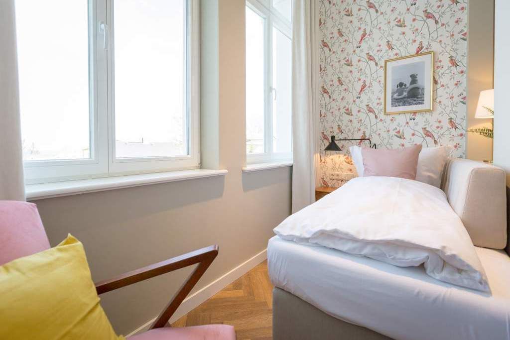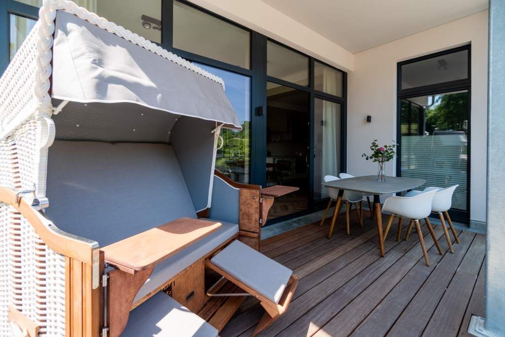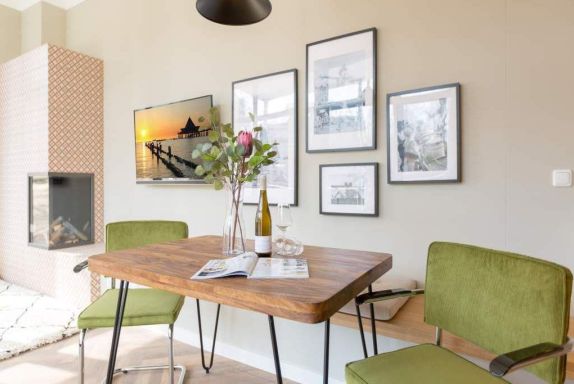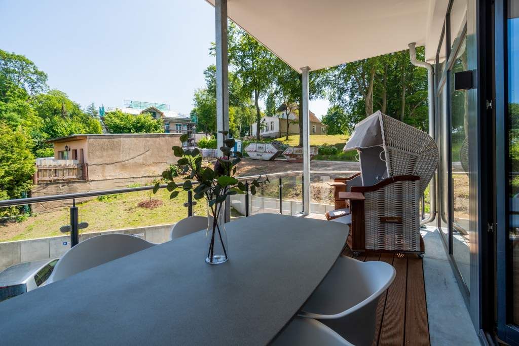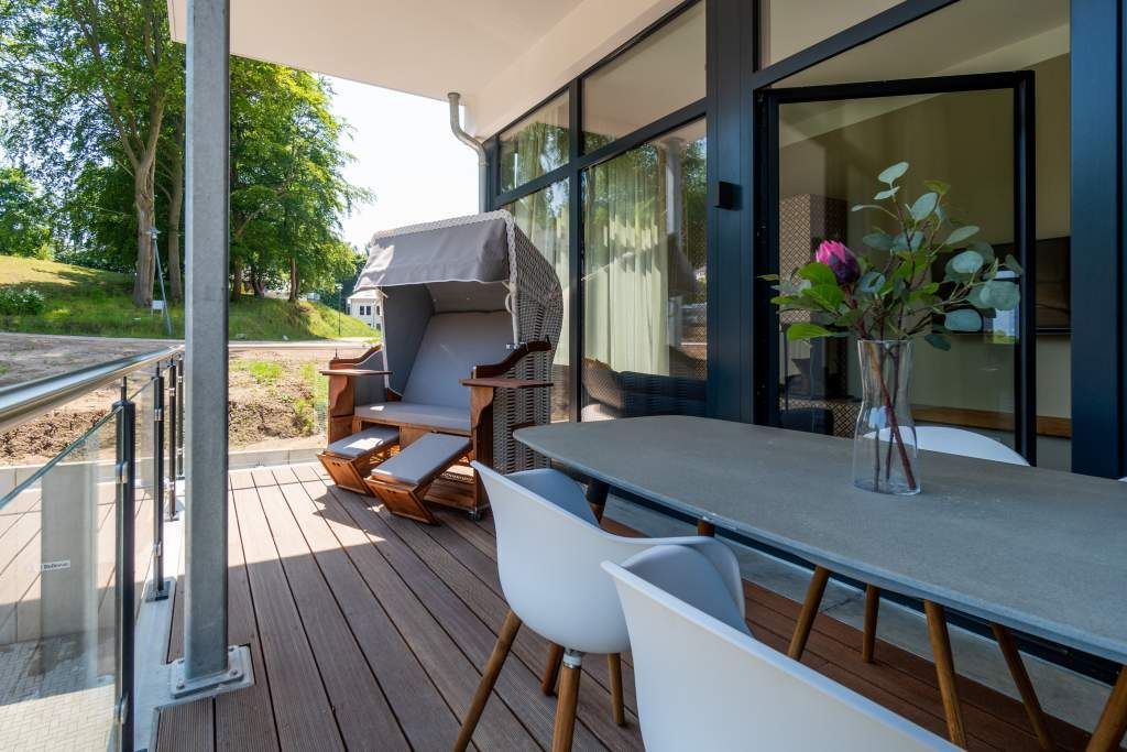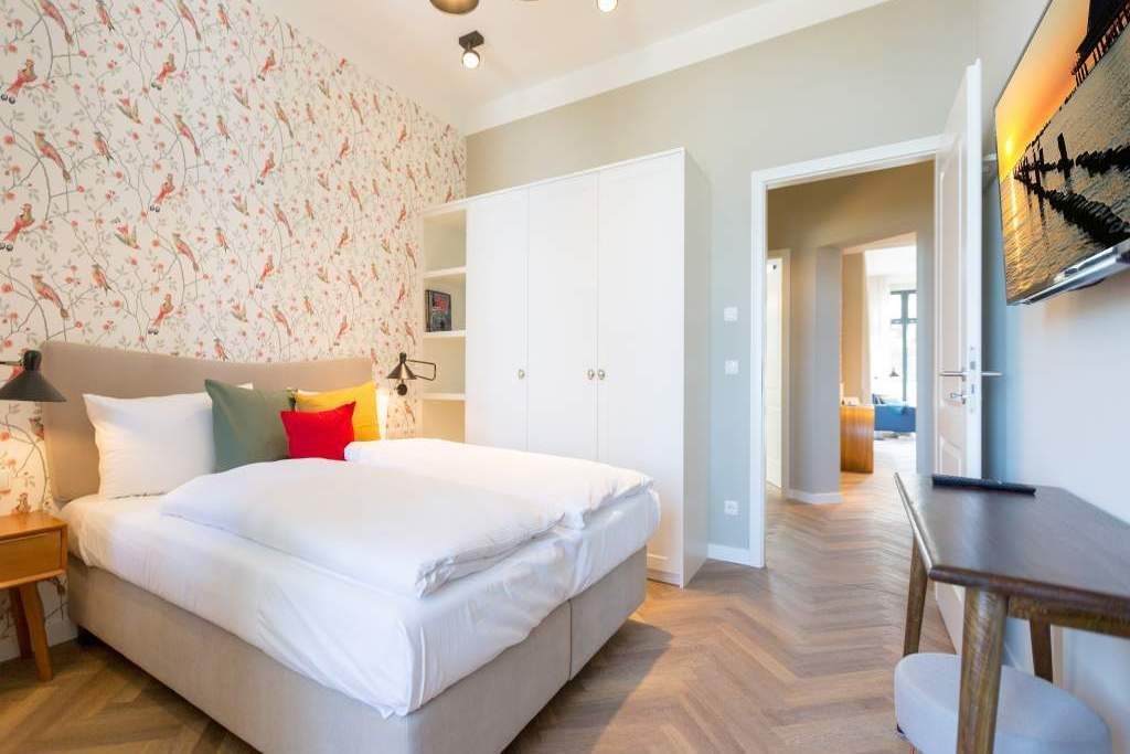 Ein gemütliches und in skandinavischem Design konzipiertes Urlaubsdomizil erwartet Auszeitfreudige im Appartement 4 im Obergeschoss der Villa Bellevue. Zweieinhalb stilvoll eingerichtete Zimmer bietet die 72 Quadratmeter große Wohnung. Hochwertige Materialien wie das edle Fischgrät-Parkett oder die stylischen Design-Möbel, der wunderschöne Gas-Kamin oder die edlen Tapeten geben Ihrem Urlaub einen exklusiven Rahmen. Bis zu drei Personen und ein Kleinkind bis drei Jahre (im Kinderreisebett) können es sich hier gut gehen lassen, am schönen Esstisch mit den Retro-Freischwingern dinieren oder auf der Sofalandschaft vor dem Kamin entspannen. Im Wohnzimmer sowie dem großen Schlafzimmer befinden sich Flat-TVs. Die Küche ist modern und voll ausgestattet. Markengeräte und erlesenes Geschirr machen das Kochen zum Erlebnis. Das Hauptschlafzimmer verfügt über ein komfortables Boxspringdoppelbett (1,60 m x 2,00 m) und einen großen, geräumigen Schrank. Zum Schlafzimmer gehört eine Veranda, in der ein zweites Boxspringbett (0,90 m x 2,00 m) in erholsame Urlaubsträume entführt. Das wahrhaft großzügige Badzimmer – mit einer traumhaften Kombination aus Vintage- und Metrofliesen gestaltet – bietet eine Regendusche, einen Waschtisch und ein WC. Tageslicht lässt diesen Raum schon morgens hell und freundlich erscheinen. Als kleines Schmankerl können Sie von hier aus genauso wie auch aus dem Wohnzimmer auf den Balkon treten. Atmen Sie hier die Morgensonne und die frische Brise, die von der nur 400 Meter entfernten Ostsee herüberweht, tief in sich ein. Damit Sie sich in Ihrem Urlaub um nichts kümmern müssen, sind die Betten für Sie bereits bezogen und Handtücher liegen bereit. Zu der Wohnung gehört ein Pkw-Stellplatz.