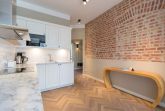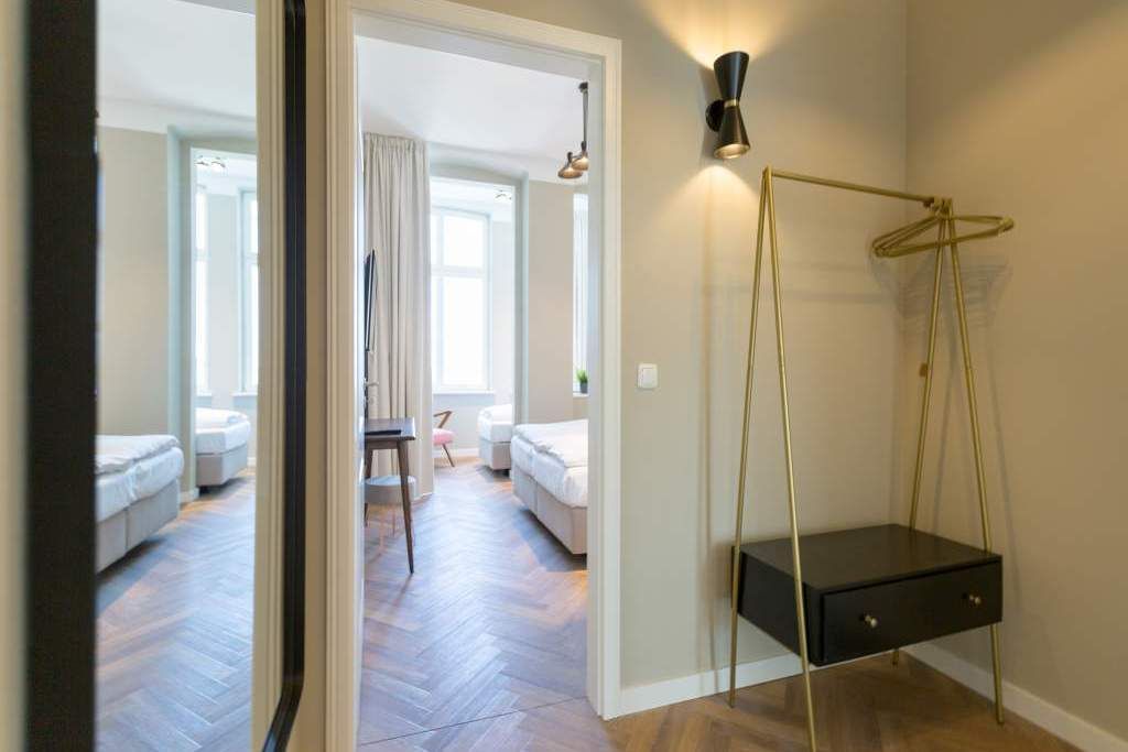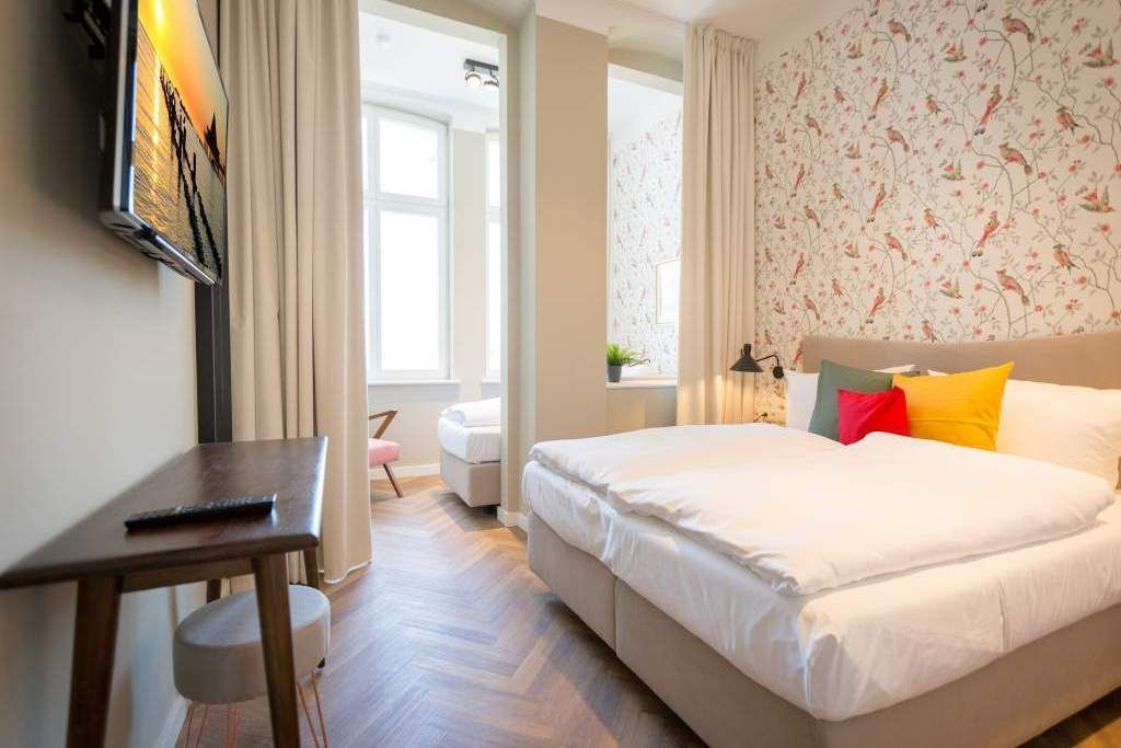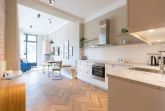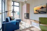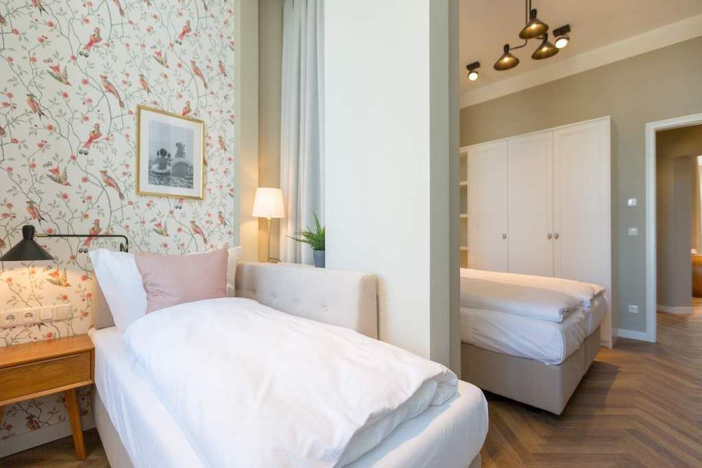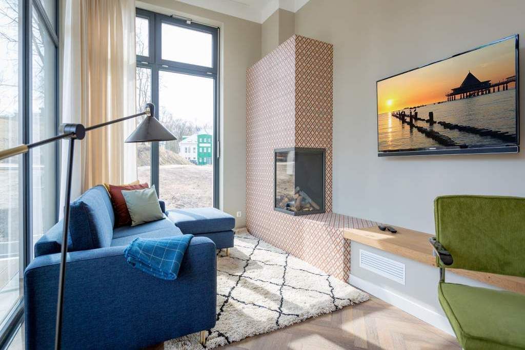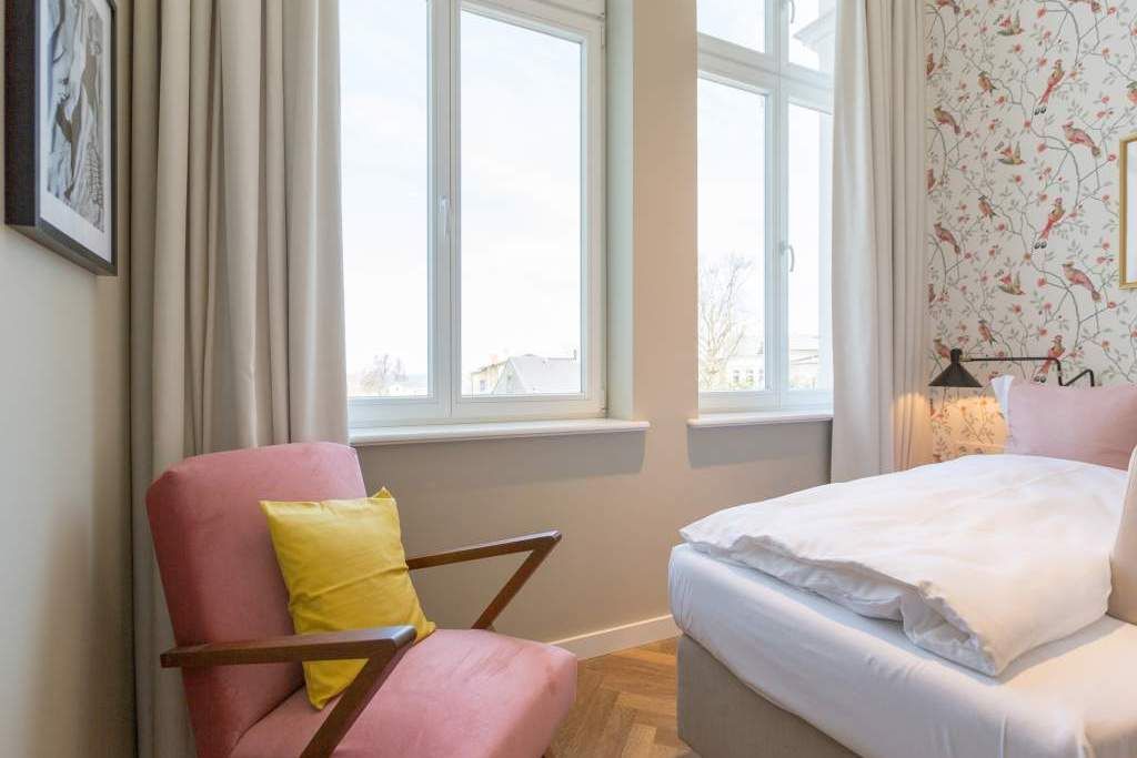 Ein gemütliches und in skandinavischem Design konzipiertes Urlaubsdomizil erwartet Auszeitfreudige im Appartement 4 im Obergeschoss der Villa Bellevue. Zweieinhalb stilvoll eingerichtete Zimmer bietet die 72 Quadratmeter große Wohnung. Hochwertige Materialien wie das edle Fischgrät-Parkett oder die stylischen Design-Möbel, der wunderschöne Gas-Kamin oder die edlen Tapeten geben Ihrem Urlaub einen exklusiven Rahmen. Bis zu drei Personen und ein Kleinkind bis drei Jahre (im Kinderreisebett) können es sich hier gut gehen lassen, am schönen Esstisch mit den Retro-Freischwingern dinieren oder auf der Sofalandschaft vor dem Kamin entspannen. Im Wohnzimmer sowie dem großen Schlafzimmer befinden sich Flat-TVs. Die Küche ist modern und voll ausgestattet. Markengeräte und erlesenes Geschirr machen das Kochen zum Erlebnis. Das Hauptschlafzimmer verfügt über ein komfortables Boxspringdoppelbett (1,60 m x 2,00 m) und einen großen, geräumigen Schrank. Zum Schlafzimmer gehört eine Veranda, in der ein zweites Boxspringbett (0,90 m x 2,00 m) in erholsame Urlaubsträume entführt. Das wahrhaft großzügige Badzimmer – mit einer traumhaften Kombination aus Vintage- und Metrofliesen gestaltet – bietet eine Regendusche, einen Waschtisch und ein WC. Tageslicht lässt diesen Raum schon morgens hell und freundlich erscheinen. Als kleines Schmankerl können Sie von hier aus genauso wie auch aus dem Wohnzimmer auf den Balkon treten. Atmen Sie hier die Morgensonne und die frische Brise, die von der nur 400 Meter entfernten Ostsee herüberweht, tief in sich ein. Damit Sie sich in Ihrem Urlaub um nichts kümmern müssen, sind die Betten für Sie bereits bezogen und Handtücher liegen bereit. Zu der Wohnung gehört ein Pkw-Stellplatz.