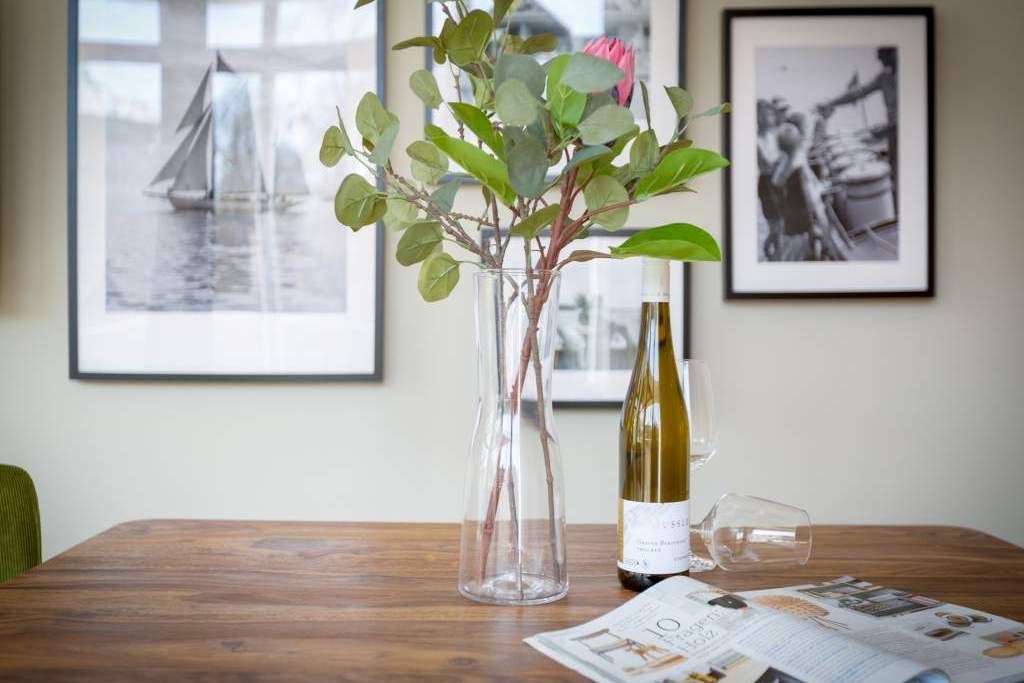 Ein gemütliches und in skandinavischem Design konzipiertes Urlaubsdomizil erwartet Auszeitfreudige im Appartement 4 im Obergeschoss der Villa Bellevue. Zweieinhalb stilvoll eingerichtete Zimmer bietet die 72 Quadratmeter große Wohnung. Hochwertige Materialien wie das edle Fischgrät-Parkett oder die stylischen Design-Möbel, der wunderschöne Gas-Kamin oder die edlen Tapeten geben Ihrem Urlaub einen exklusiven Rahmen. Bis zu drei Personen und ein Kleinkind bis drei Jahre (im Kinderreisebett) können es sich hier gut gehen lassen, am schönen Esstisch mit den Retro-Freischwingern dinieren oder auf der Sofalandschaft vor dem Kamin entspannen. Im Wohnzimmer sowie dem großen Schlafzimmer befinden sich Flat-TVs. Die Küche ist modern und voll ausgestattet. Markengeräte und erlesenes Geschirr machen das Kochen zum Erlebnis. Das Hauptschlafzimmer verfügt über ein komfortables Boxspringdoppelbett (1,60 m x 2,00 m) und einen großen, geräumigen Schrank. Zum Schlafzimmer gehört eine Veranda, in der ein zweites Boxspringbett (0,90 m x 2,00 m) in erholsame Urlaubsträume entführt. Das wahrhaft großzügige Badzimmer mit einer traumhaften Kombination aus Vintage- und Metrofliesen gestaltet bietet eine Regendusche, einen Waschtisch und ein WC. Tageslicht lässt diesen Raum schon morgens hell und freundlich erscheinen. Als kleines Schmankerl können Sie von hier aus genauso wie auch aus dem Wohnzimmer auf den Balkon treten. Atmen Sie hier die Morgensonne und die frische Brise, die von der nur 400 Meter entfernten Ostsee herüberweht, tief in sich ein. Damit Sie sich in Ihrem Urlaub um nichts kümmern müssen, sind die Betten für Sie bereits bezogen und Handtücher liegen bereit. Zu der Wohnung gehört ein Pkw-Stellplatz.