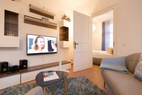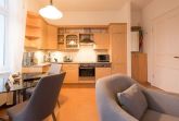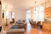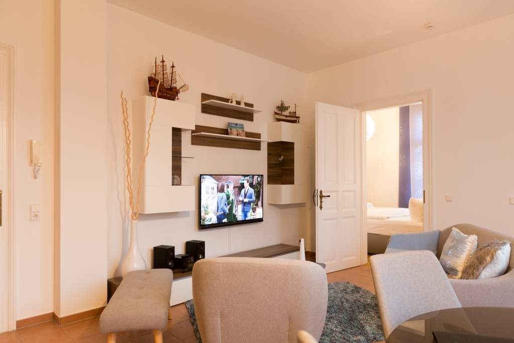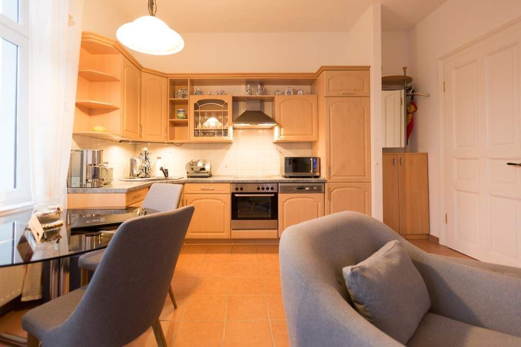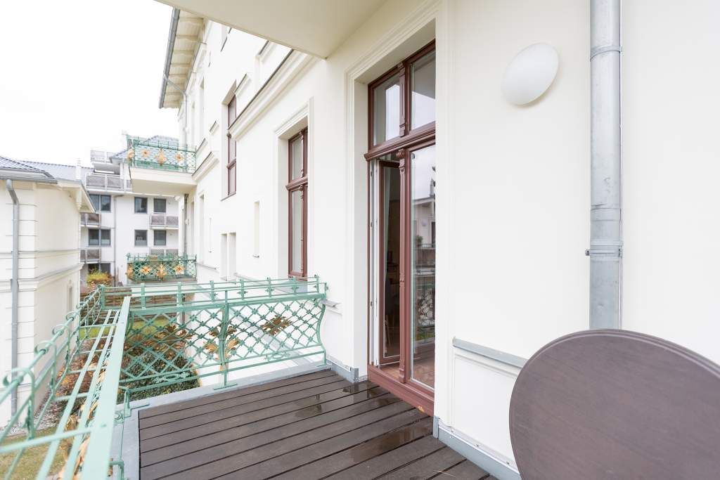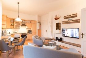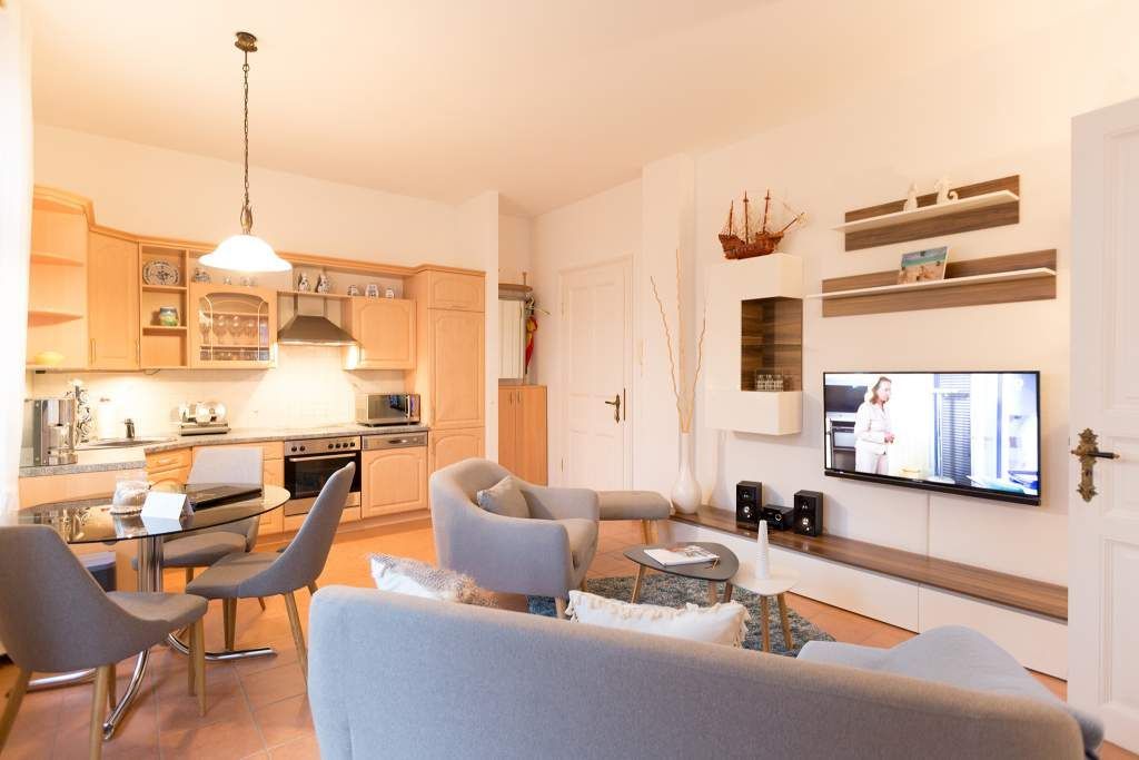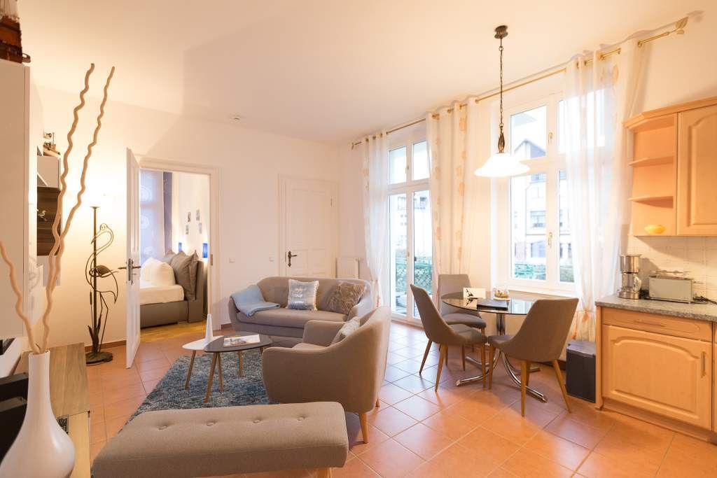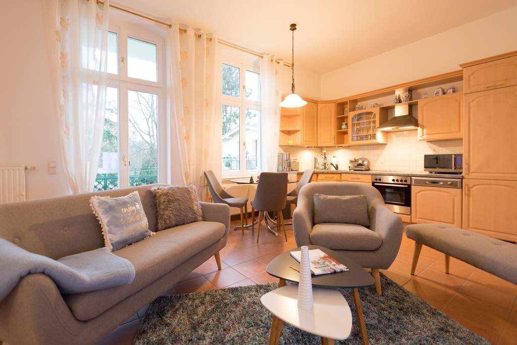 Ein kleines und behagliches Urlaubsparadies ist die Wohnung 8 mit ihren 50 Quadratmetern in der wunderschön sanierten alten Villa Medici in Heringsdorf. In den zwei Zimmern können zwei Erwachsene und ein Kleinkind bis drei Jahre im Kinderreisebett ausspannen, entspannen und sich einfach nur wohlfühlen. Genießen Sie Ihre Auszeit in dem schönen und in modernem Design gestalteten Wohnzimmer auf dem Sofa oder dem Sessel. Hier steht auch ein Flat-TV. In den Wohnbereich integriert, ist eine vollausgestattete Küche mit Essbereich. An dem großen Glastisch lässt es sich wunderbar frühstücken oder dinieren. An sonnigen Tagen jedoch und das hat Usedom zumeist zu bieten lädt ein schöner Südbalkon zum Verweilen und Essen ein. Das Schlafzimmer verfügt über ein großes und bequemes Boxspringdoppelbett (1,80 m x 2,00 m) und im Kleiderschrank über viel Ablagefläche. In das Zimmer passt auch ein Kinderreisebett hinein. Das Badezimmer ist überaus geräumig, wartet neben dem Waschtisch und WC sogar mit einer Badewanne mit Duschfunktion und einem Bidet auf. Für einen rundum sorglosen Urlaub liegen Handtücher bereit und das Bett ist bezogen. Zum Appartement gehört ein Pkw-Außenstellplatz. Das WLAN-Netz ist kostenfrei nutzbar.