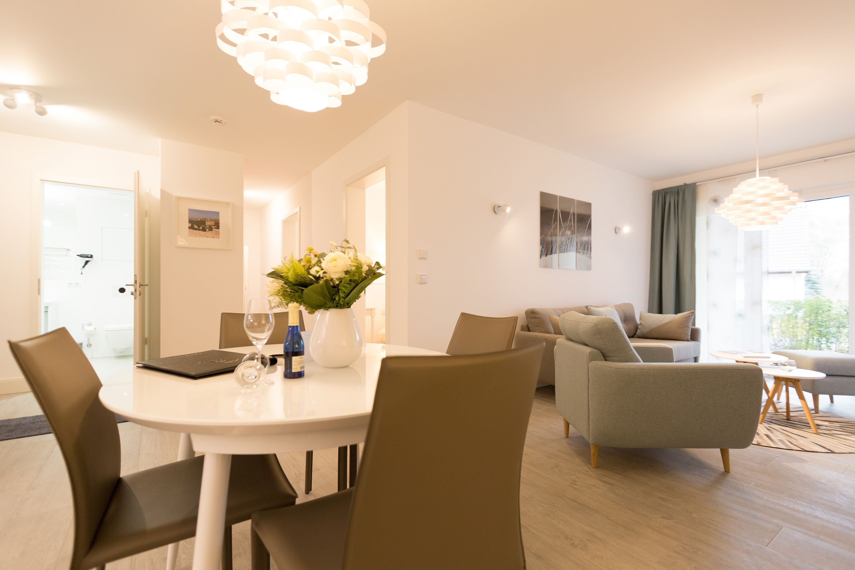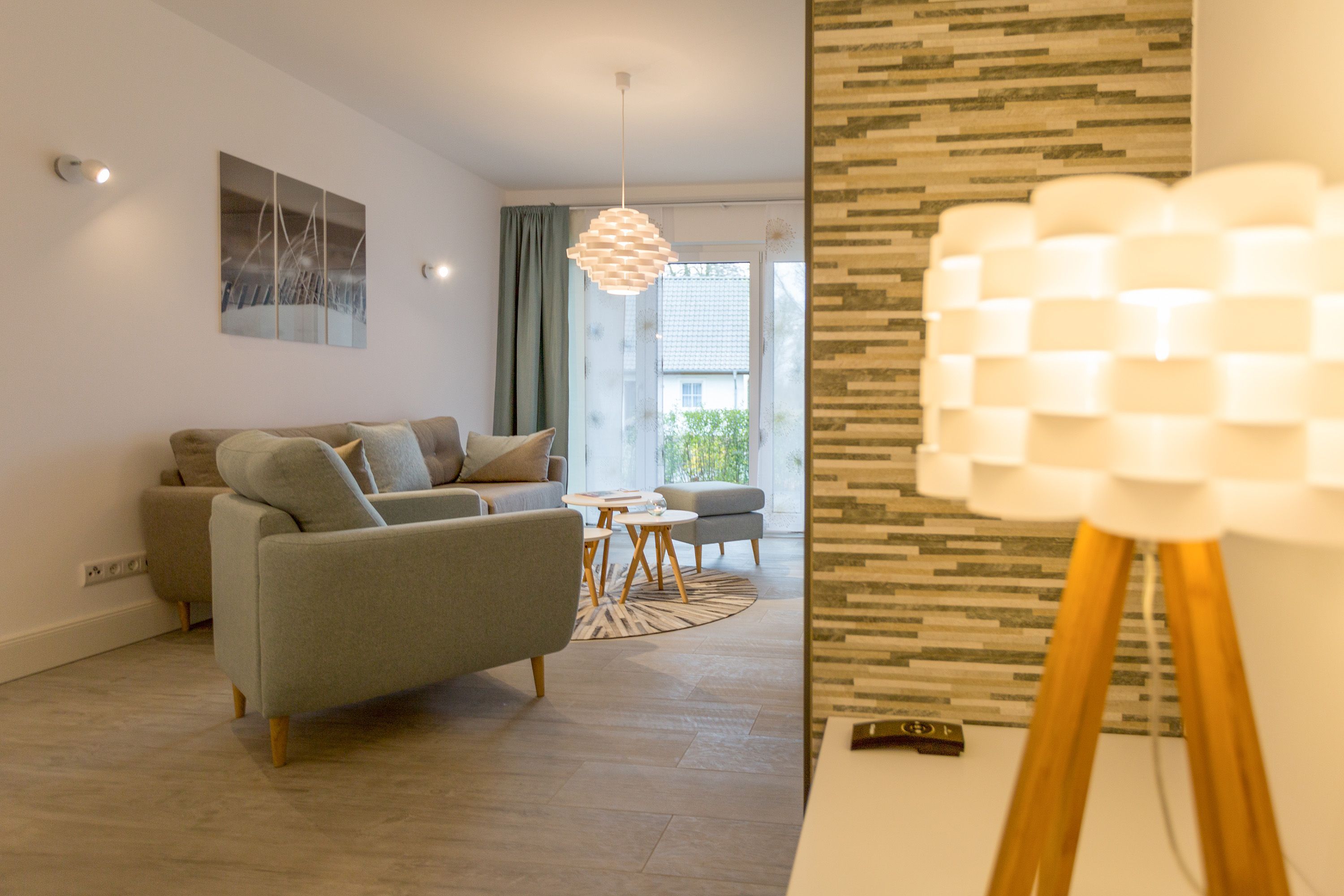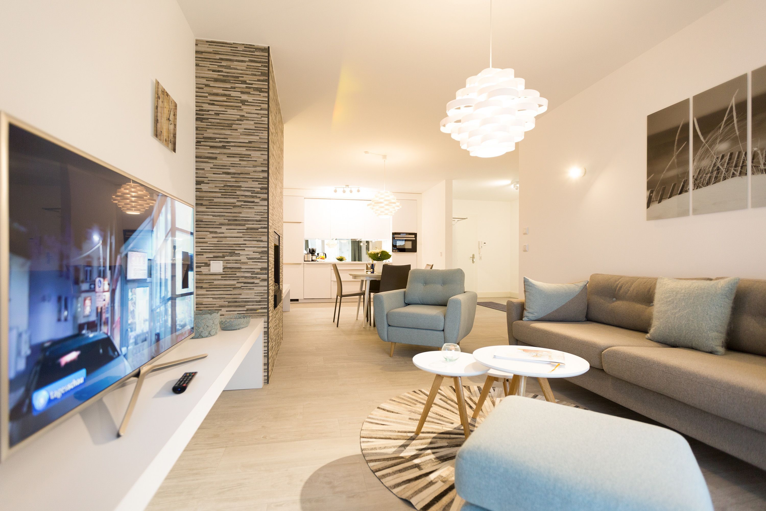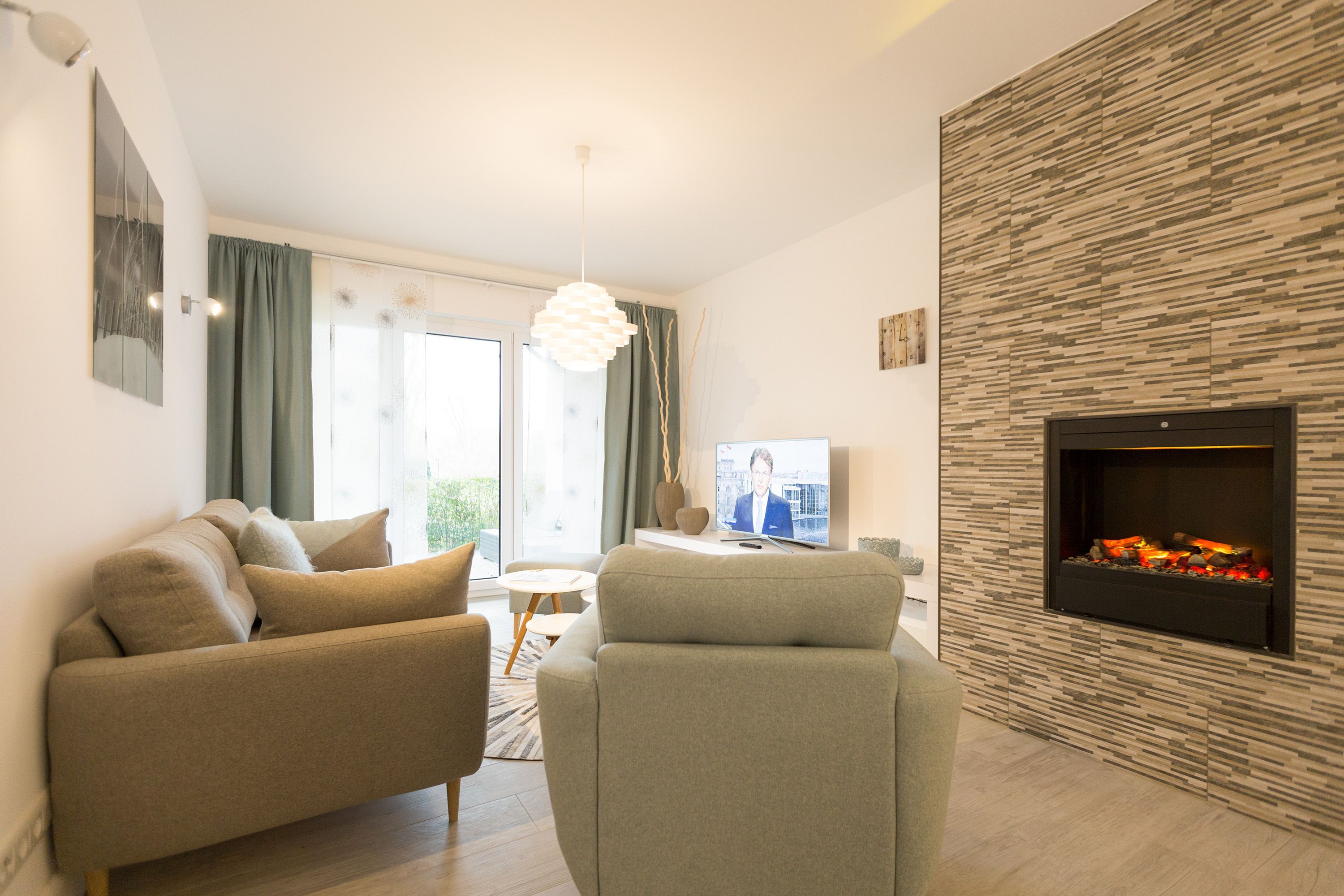 Er ist ein echter Hingucker schon beim Eintreten in dieses elegante und stilvolle Urlaubsappartement im Erdgeschoss der Dünenresidenz Heringsdorf der große, in Stein gefasste Elektro-Kamin. Sein warmes Licht sorgt nicht nur an kühlen Tagen für wohlige Behaglichkeit. Es wartet eine Wohlfühlwelt auf Sie, die auf 80 Quadratmetern reichlich Platz für bis zu vier Erwachsene bietet. Das gesamte Interieur ist harmonisch aufeinander abgestimmt. Stylisch sind auf alle Fälle die nordischen Design-Lampen. Abschalten und den Alltagsstress vergessen, lässt es sich auf der Sitzgruppe mit gemütlicher Couch und Blick auf den Kamin oder den großen Flat-TV wunderbar. Machen Sie die großen, bodentiefen Wohnzimmerfenster auf, lassen sie das Meeresrauschen vom nur 50 Meter entfernten Ostseestrand und die lichten Sonnenstrahlen in ihr Domizil oder entspannen Sie auf der 20 Quadratmeter großen Südterrasse. Zum Wohnbereich gehört eine helle, offene Küche mit großem Esstisch. Mit allem ausgestattet, was das Kochherz höher schlagen lässt, können Sie hier das gemütliche Zusammensitzen und Schlemmen wahrhaft zelebrieren. Haben Sie Spaß und einen erholsamen Schlaf in den beiden Schlafzimmern. Denn hier locken bequeme Doppelboxspringbetten (einmal 1,80 m x 2,00 m und einmal 1,60 m x 2,00 m), um Ihnen die Nächte zu versüßen. Das Badezimmer ist sehr geräumig und mit Waschtisch, WC und großer Echtglas-Dusche ausgestattet. Die Betten sind bezogen und Handtücher liegen bei Ankunft bereit. Zu der Wohnung gehört ein Pkw-Stellplatz in der Tiefgarage (max. Einfahrtshöhe 1,93 m).