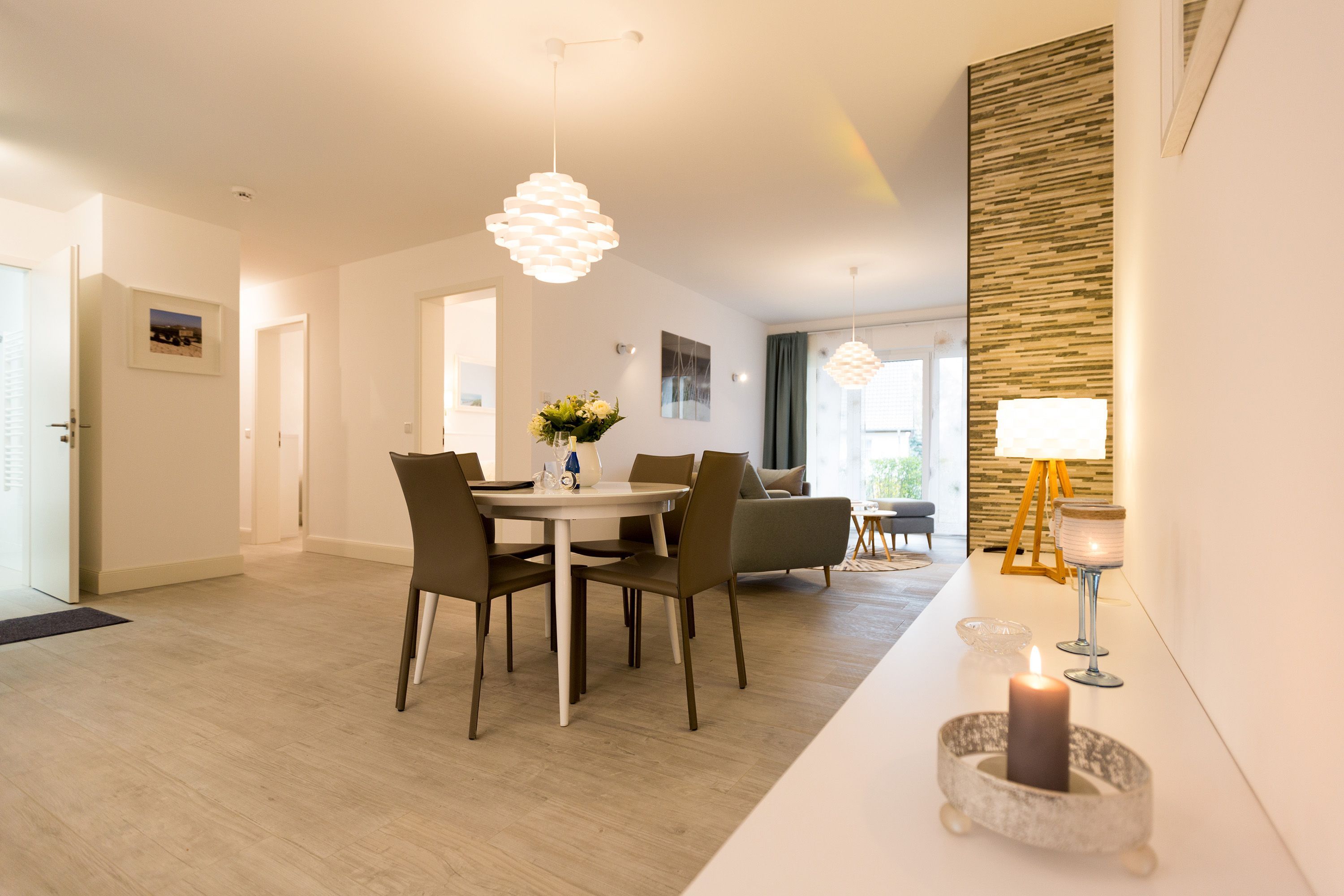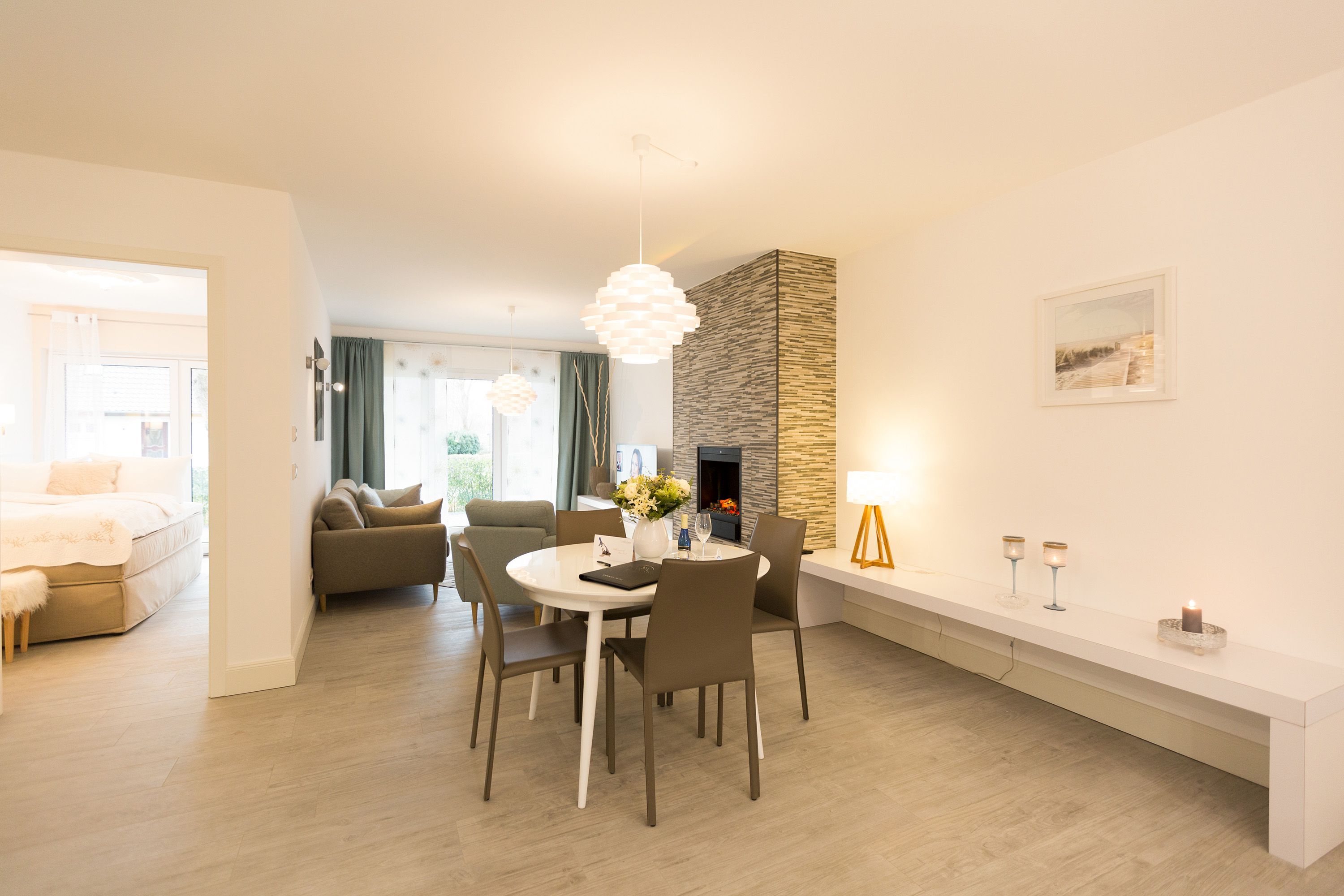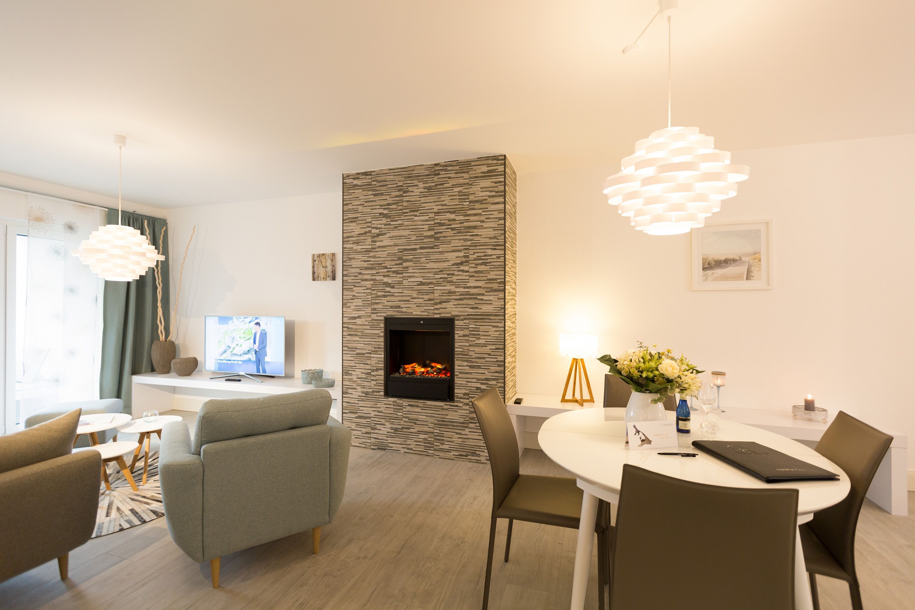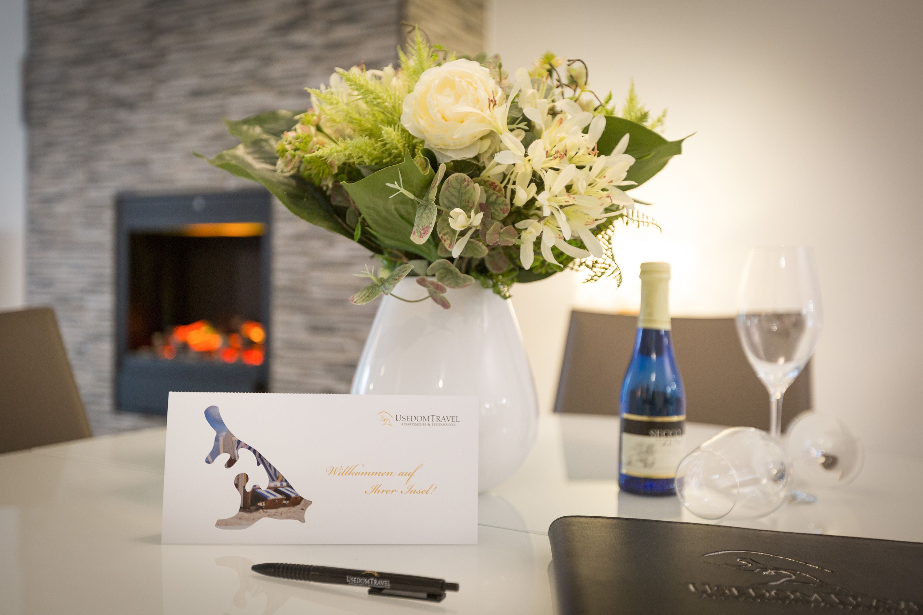 Er ist ein echter Hingucker schon beim Eintreten in dieses elegante und stilvolle Urlaubsappartement im Erdgeschoss der Dünenresidenz Heringsdorf der große, in Stein gefasste Elektro-Kamin. Sein warmes Licht sorgt nicht nur an kühlen Tagen für wohlige Behaglichkeit. Es wartet eine Wohlfühlwelt auf Sie, die auf 80 Quadratmetern reichlich Platz für bis zu vier Erwachsene bietet. Das gesamte Interieur ist harmonisch aufeinander abgestimmt. Stylisch sind auf alle Fälle die nordischen Design-Lampen. Abschalten und den Alltagsstress vergessen, lässt es sich auf der Sitzgruppe mit gemütlicher Couch und Blick auf den Kamin oder den großen Flat-TV wunderbar. Machen Sie die großen, bodentiefen Wohnzimmerfenster auf, lassen sie das Meeresrauschen vom nur 50 Meter entfernten Ostseestrand und die lichten Sonnenstrahlen in ihr Domizil oder entspannen Sie auf der 20 Quadratmeter großen Südterrasse. Zum Wohnbereich gehört eine helle, offene Küche mit großem Esstisch. Mit allem ausgestattet, was das Kochherz höher schlagen lässt, können Sie hier das gemütliche Zusammensitzen und Schlemmen wahrhaft zelebrieren. Haben Sie Spaß und einen erholsamen Schlaf in den beiden Schlafzimmern. Denn hier locken bequeme Doppelboxspringbetten (einmal 1,80 m x 2,00 m und einmal 1,60 m x 2,00 m), um Ihnen die Nächte zu versüßen. Das Badezimmer ist sehr geräumig und mit Waschtisch, WC und großer Echtglas-Dusche ausgestattet. Die Betten sind bezogen und Handtücher liegen bei Ankunft bereit. Zu der Wohnung gehört ein Pkw-Stellplatz in der Tiefgarage (max. Einfahrtshöhe 1,93 m).