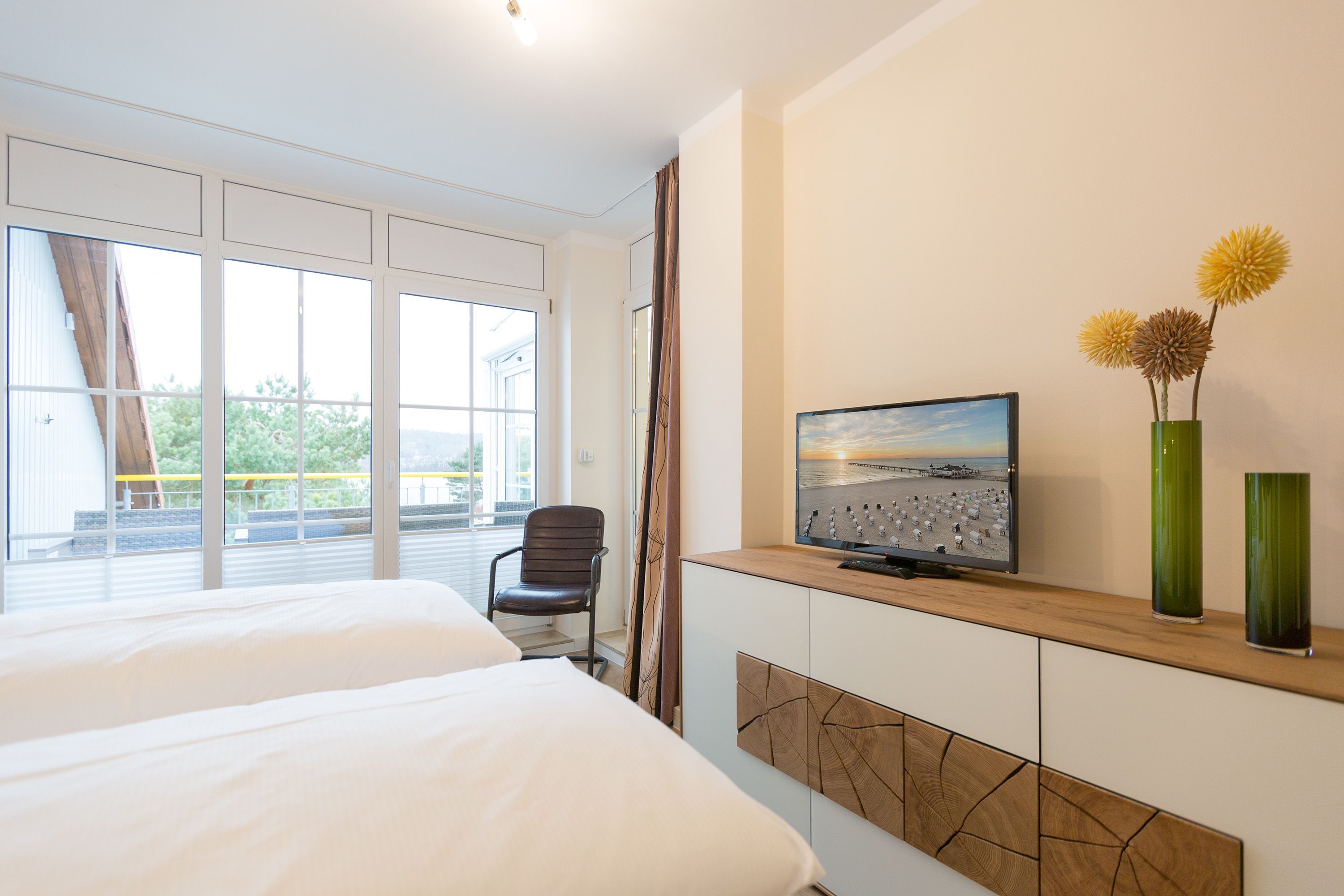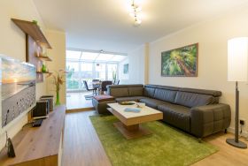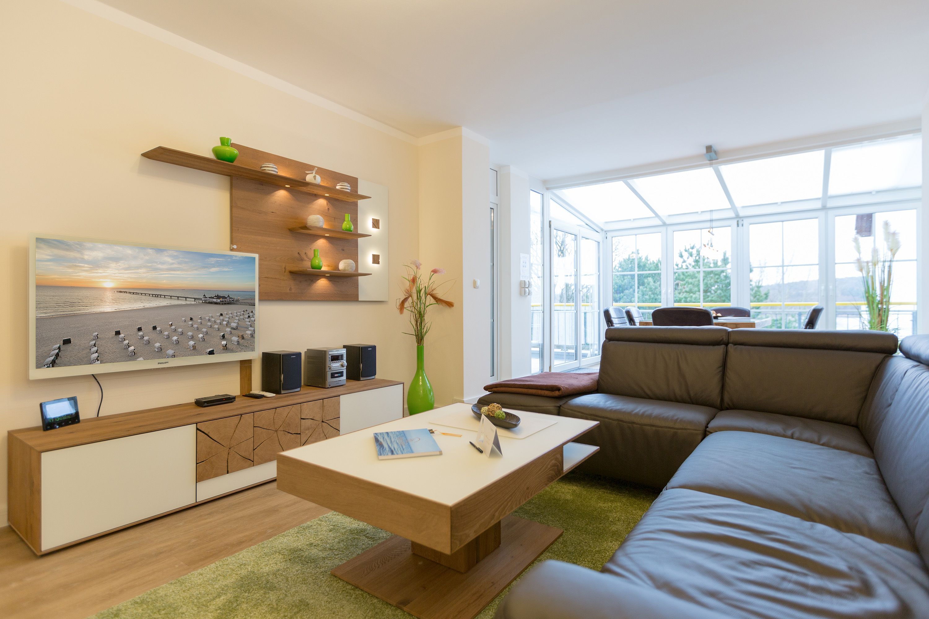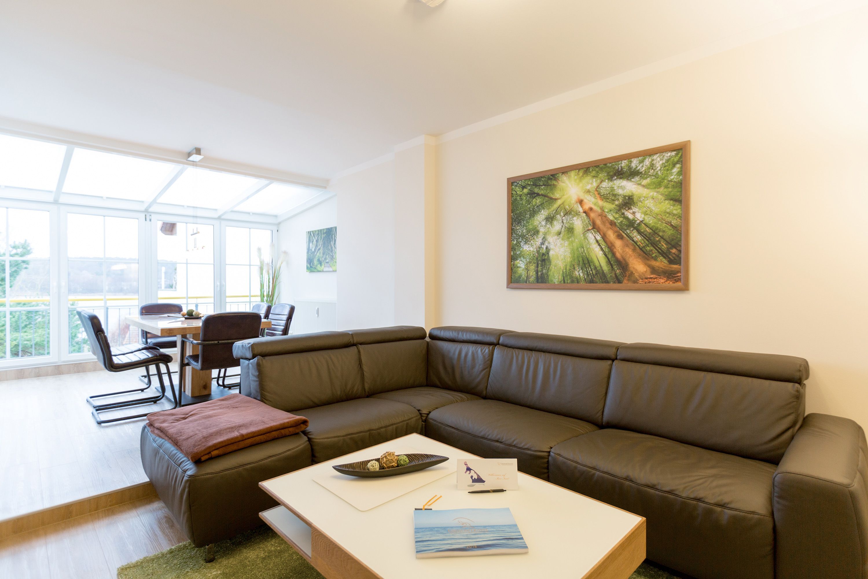 Ankommen und Wohlfühlen! Sie wohnen in ruhiger Lage in der Maxim Gorki Straße, nur wenige Schritte vom Strand und der Promenade entfernt. Im Dachgeschoss des Hauses empfängt Sie die moderne 3-Raum-Ferienwohnung (71 qm) für 4 Personen und ein Kleinkind ( bis 3 Jahre im Kinderreisebett). Das schöne Appartement glänzt in neuen Farben, denn es wurde erst kürzlich komplett renoviert und neu ausgestattet. Helle Farben, abgestimmte Stoffe und wertige Holzmöbel schaffen hier ein stimmiges Urlaubsdomizil. Im Wohnbereich auf der großen Ledersitzgruppe lässt es sich wunderbar Relaxen und TV schauen. Lichtdurchflutet und mit tollem Ausblick auf den Schloonsee schließt sich hier der Wintergarten an, in dem der schöne Essplatz integriert ist. Von hier aus hat man Zugang zum Balkon. Ein großzügiges Schlafzimmer mit einem hochwertigen Doppelboxspringbett (1,80 m x 2,00m ) und zusätzlichem Flat-TV sorgt für erholsame Nächte. Das zweite Schlafzimmer ist mit zwei bequemen Einzelboxspringbetten ( 0,90 m x 2,00 m) ausgestattet, ein idealer Rückzugort für zwischendrin. Die separate Küche ist selbstverständlich hochwertig eingerichtet. Ein modernes Duschbad mit WC ergänzt die Wohnung. Auf dem Westbalkon, der mit hochwertigen Loungemöbeln ausgestattet ist, tanken Sie Usedomer Sonne und genießen den Ausblick ins Grüne und auf den Schloonsee. Für die Wohnung steht ein PKW-Stellplatz in einer separaten Garage ( Höhe 2,10m, Breite 2,50m) zur Verfügung, für Fahrräder gibt es einen Abstellraum im Keller des Hauses. Waschmaschine und Trockner (im Untergeschoss) im Haus sind kostenfrei nutzbar, auch das Wlan-Netz ist kostenfrei verfügbar.