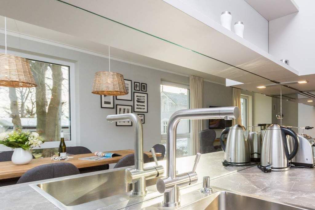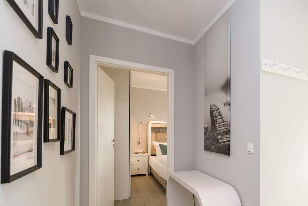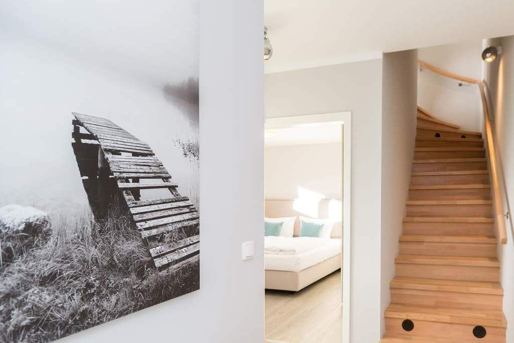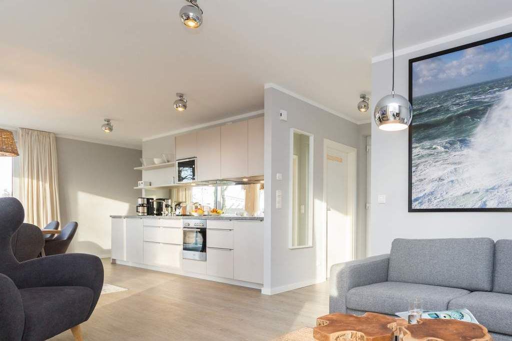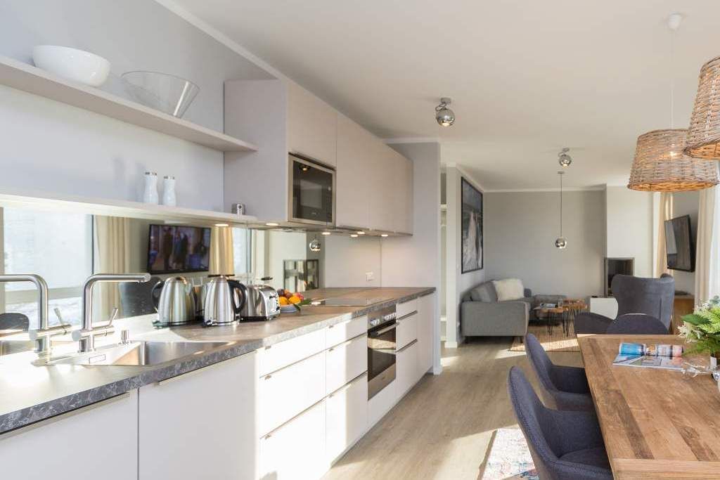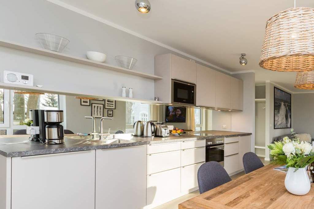 Von hier oben auf dem Heringsdorfer Hausberg Kulm, aus diesem wunderschönen modernen Appartement Nummer 8, haben Sie einen weiten Blick über die Dächer der alten Bädervillen. Hell scheint die Sonne durch die großen, bodentiefen Fenster in das stylische Wohnzimmer und offenbart eine exklusive Wohlfühloase auf 86 Quadratmetern. Interieur und Gestaltung passen harmonisch zueinander. Noble Designmöbel und helle Farben verströmen ein ausgewogenes und federleichtes Flair. Platz ist auf den zwei Etagen für 4 Personen und bis zu 2 Kleinkinder bis etwa drei Jahre im Kinderreisebett. Neben einem gemütlichen Wohnbereich mit 42 Zoll Flat-TV, einer großen Wohnlandschaft, einem urigen Ohrensessel und einem Gas-Kamin lädt die offene Küche zum geselligen Beisammensein ein. Ein schöner großer Echtholztisch eignet sich wunderbar für üppige Mahlzeiten zubereitet in der voll ausgestatteten und via Spiegelverglasung sehr stylischen Küche. Vor dem Wohnzimmer befindet sich ein Balkon (Hochterrasse), der mit seinem weiten Blick das Gefühl grenzenloser Freiheit zaubert. Gleich zwei Schlafzimmer mit komfortablen Boxspringdoppelbetten (1,80 m x 2,00 m) sorgen für jede Menge Schlafkomfort. Auch zum Duschen und Schickmachen gibts reichlich Platz. Die Wohnung verfügt über ein Gäste-WC sowie ein Bad mit Dusche und WC. Für einen entspannten Urlaub sind die Betten bei Ihrer Anreise bereits bezogen und Handtücher liegen bereit. Am Haus steht Ihnen ein Pkw-Stellplatz zur Verfügung.