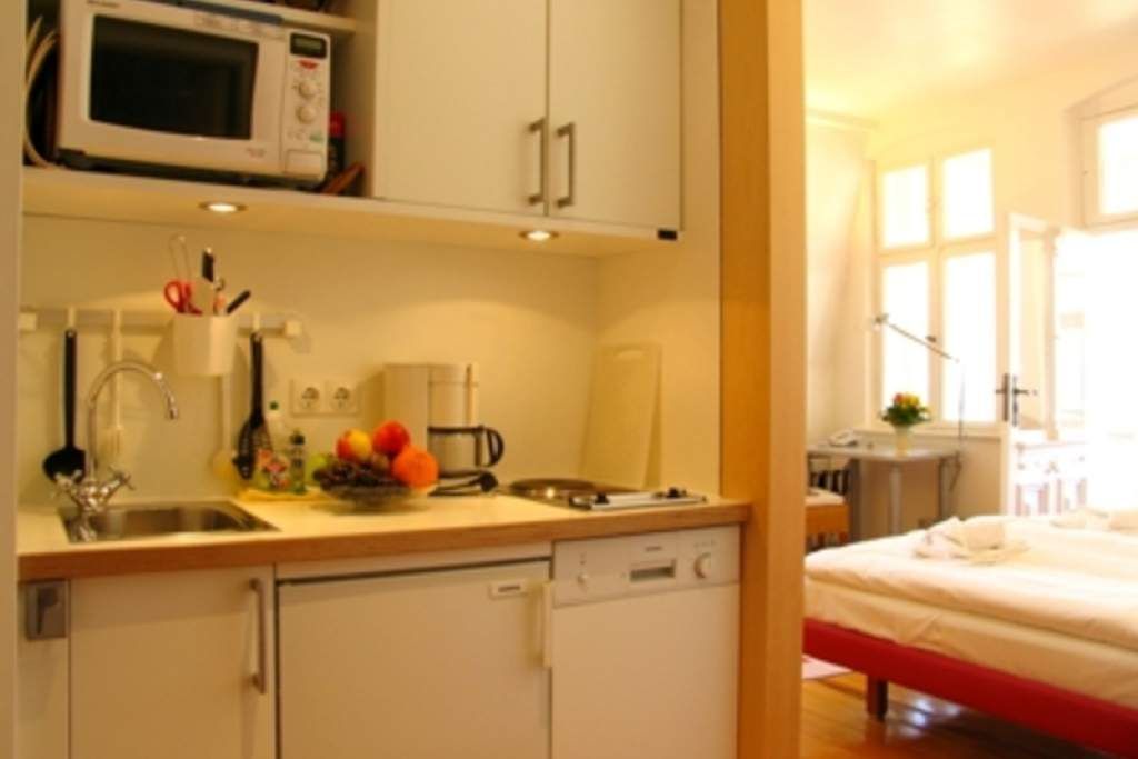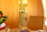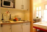 Durch fünf Fenster erhellt das klare Licht des Nordens diese Räume. Die Ostsee ist von fast jedem Platz in der Wohnung zu sehen, am schönsten jedoch ohne Frage von der Veranda aus, denn hier kann man es sich so richtig gemütlich machen. Vom Teetisch oder auch vom Sofa lässt es sich hier herrlich versonnen auf das Meer blicken. Im Schlaf- und Wohnzimmer gibt es einen Schreibtisch mit Arbeitslampe und ein geräumiges Doppelbett. Die kleine Küchenzeile komplettiert das Appartement.