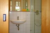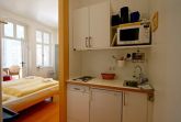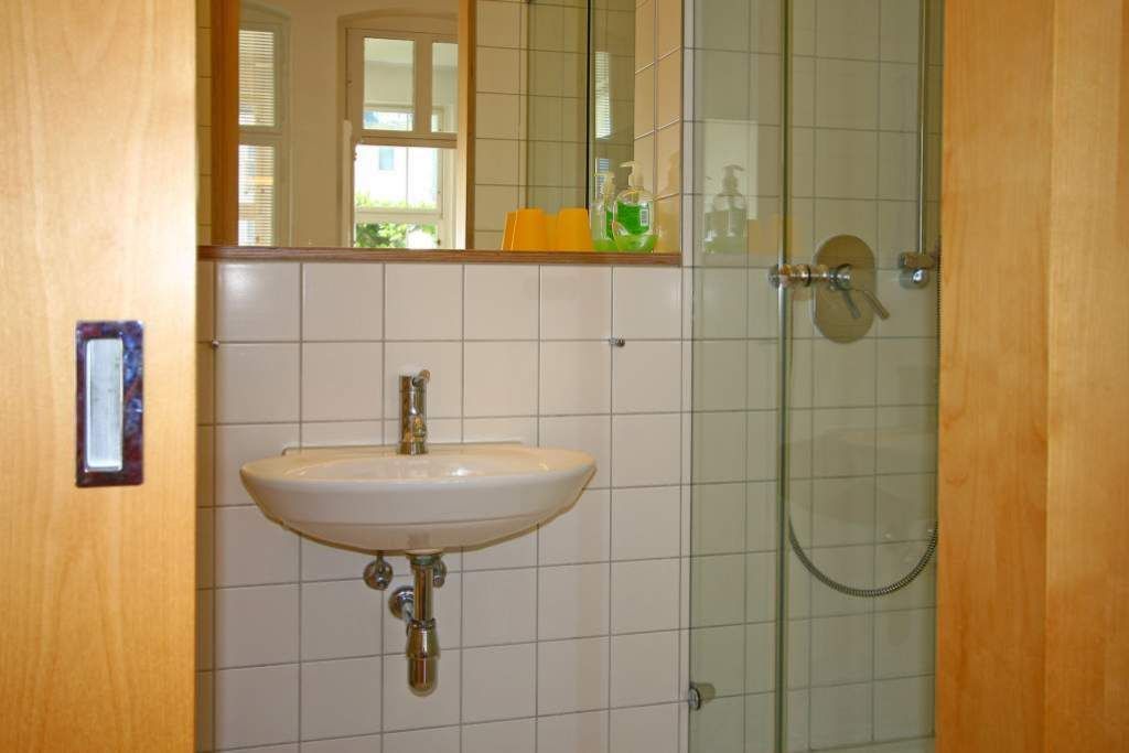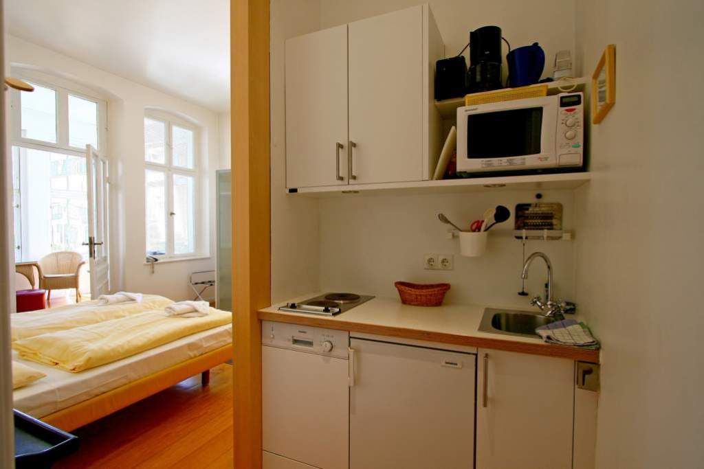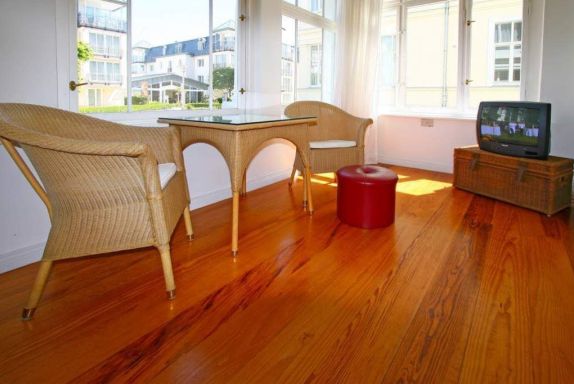 Durch fünf Fenster erhellt das klare Licht des Nordens diese Räume. Die Ostsee ist von fast jedem Platz in der Wohnung zu sehen, am schönsten jedoch ohne Frage von der Veranda aus, denn hier kann man es sich so richtig gemütlich machen. Vom Teetisch oder auch vom Sofa lässt es sich hier herrlich versonnen auf das Meer blicken. Im Schlaf- und Wohnzimmer gibt es einen Schreibtisch mit Arbeitslampe und ein geräumiges Doppelbett. Die kleine Küchenzeile komplettiert das Appartement.