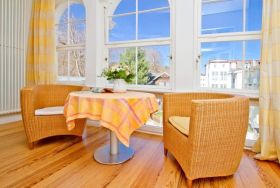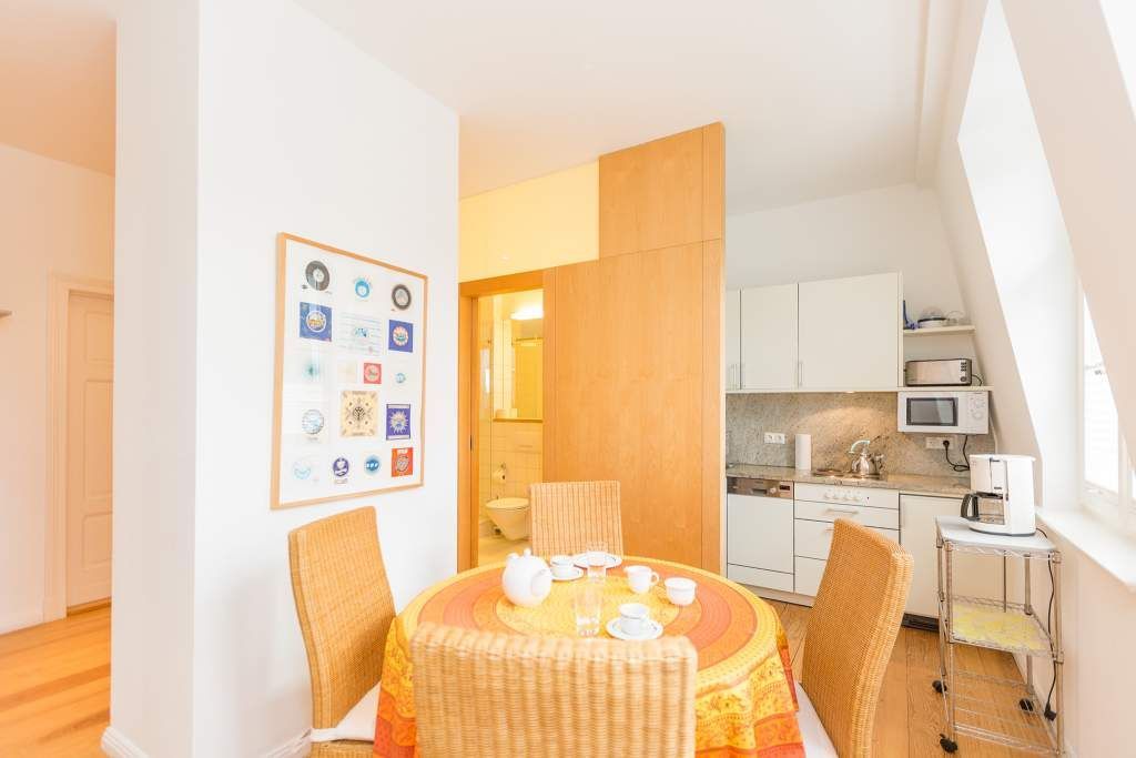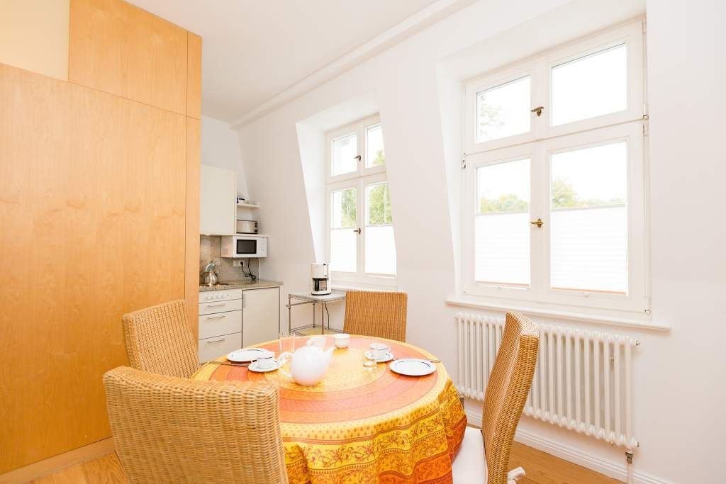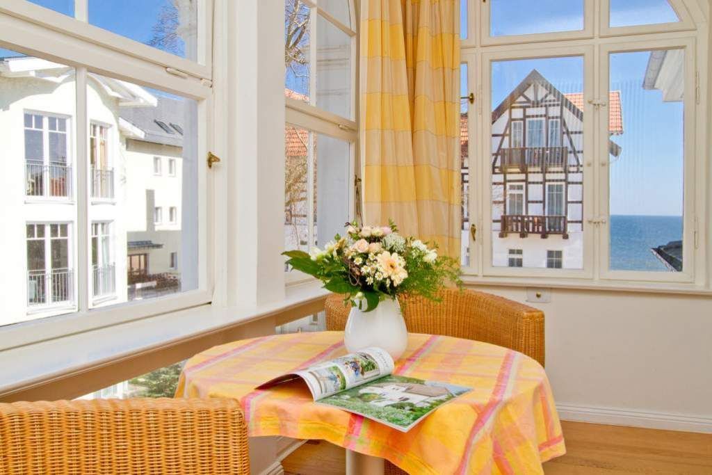 Die großzügigsten Wohnungen in der Villa Astrid. Ein Schlafraum mit drei beliebig kombinierbaren Betten und Licht von zwei Seiten lädt zum Rückzug ein. Im Wohnzimmer versteckt ein japanischer Schrank geschickt den Fernseher, damit auf der eleganten Schlafcouch eine Teestunde genauso schön ist, wie ein gemütlicher Fernsehabend. Die transparente Veranda bietet den Blick auf die Ostsee und einen wunderbaren Platz fürs Frühstück, das in der gut ausgestatteten Küche mit Esstisch und Ausblick auf den Wald mühelos zubereitet werden kann. Ein DVD-Player kann Ihnen auf Anfrage zur Verfügung gestellt werden.