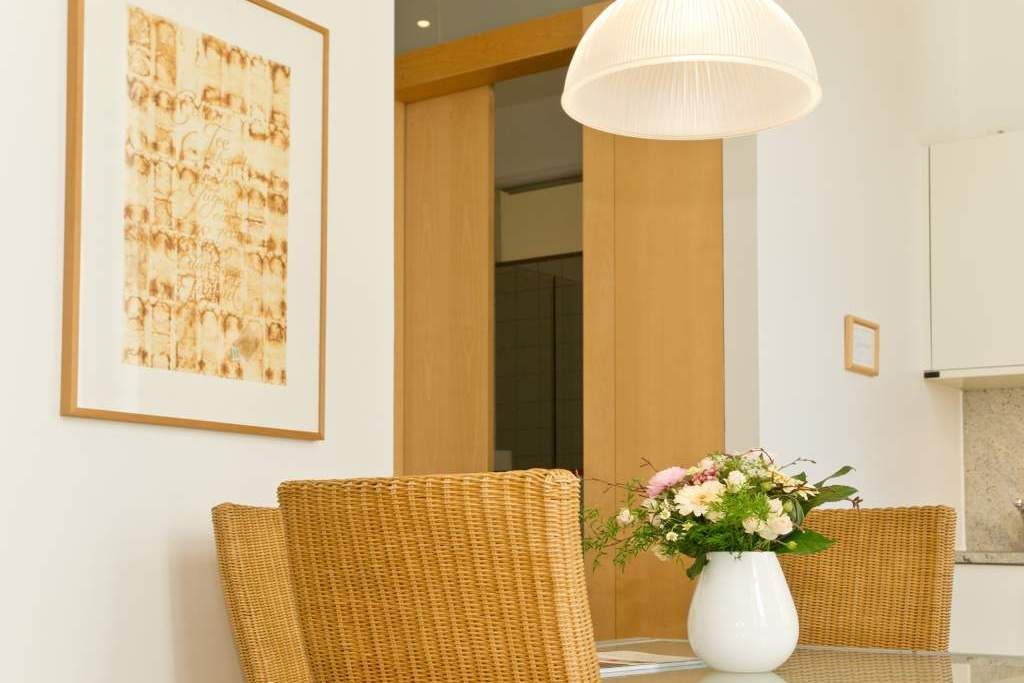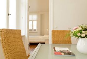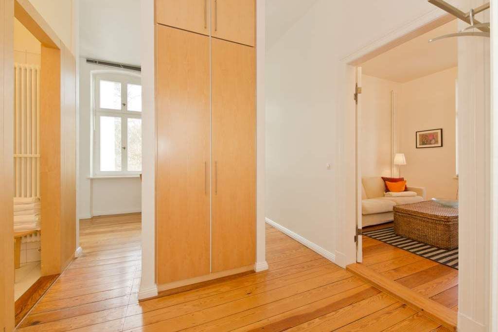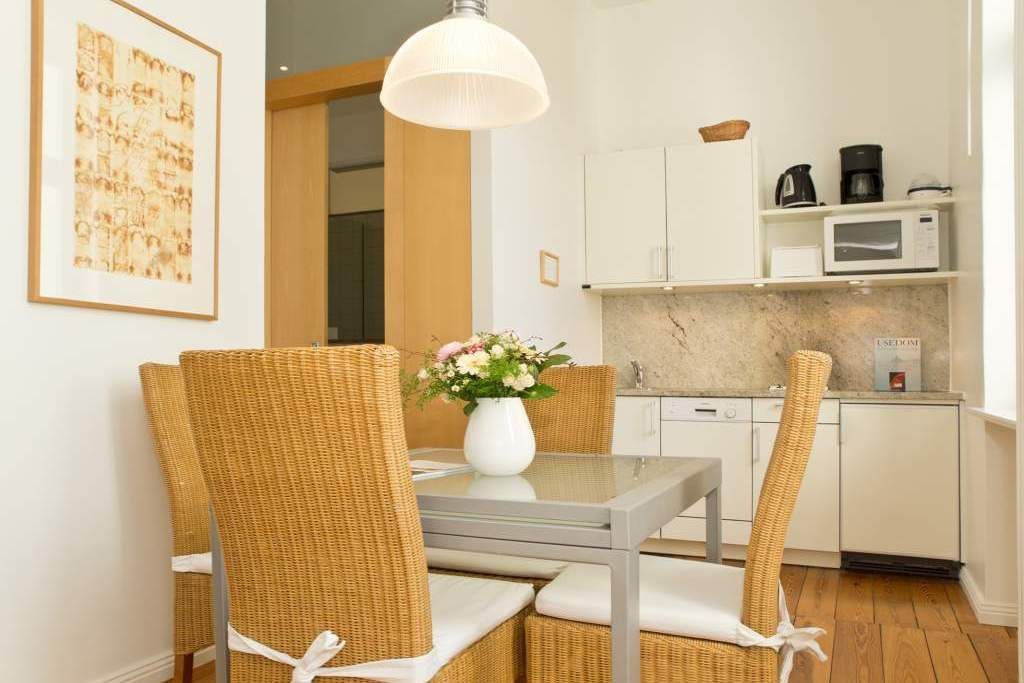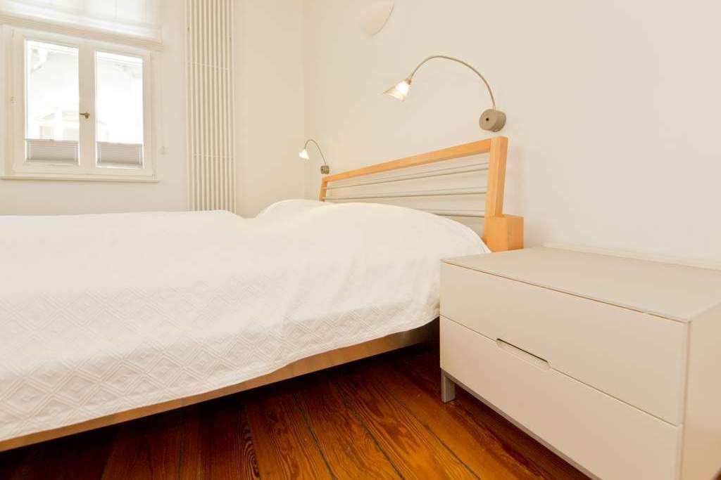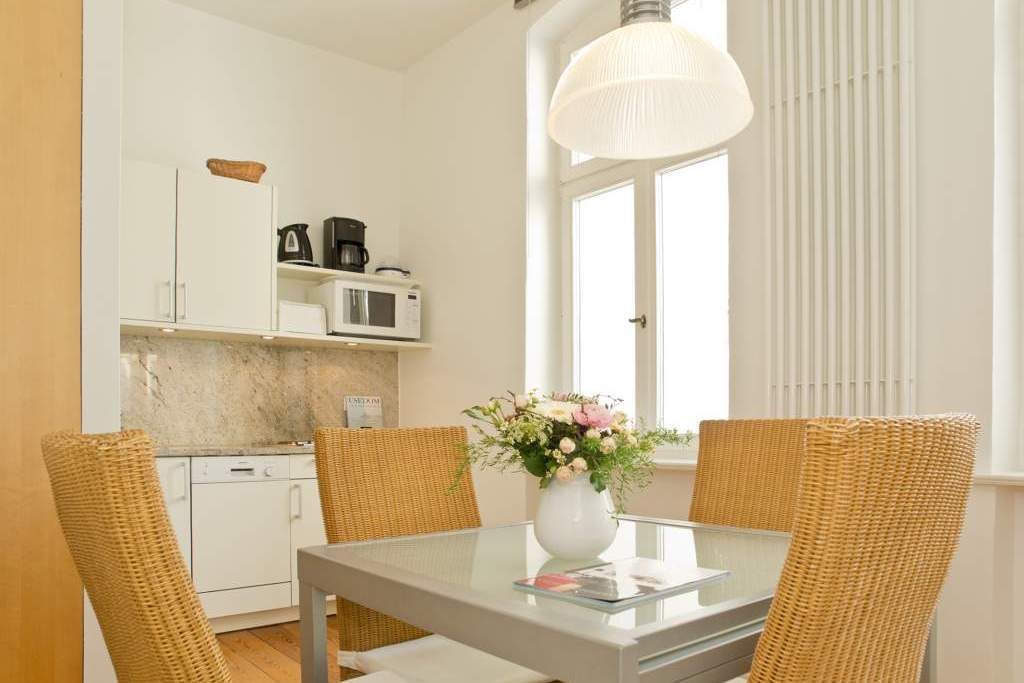 Die großzügigsten Wohnungen in der Villa Astrid. Ein Schlafraum mit drei beliebig kombinierbaren Betten und Licht von zwei Seiten lädt zum Rückzug ein. Im Wohnzimmer versteckt ein japanischer Schrank geschickt den Fernseher, damit auf der eleganten Schlafcouch eine Teestunde genauso schön ist, wie ein gemütlicher Fernsehabend. Die transparente Veranda bietet den Blick auf die Ostsee und einen wunderbaren Platz fürs Frühstück, das in der gut ausgestatteten Küche mit Esstisch und Ausblick auf den Wald mühelos zubereitet werden kann. Ein DVD-Player kann Ihnen auf Anfrage zur Verfügung gestellt werden.