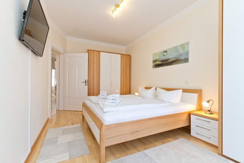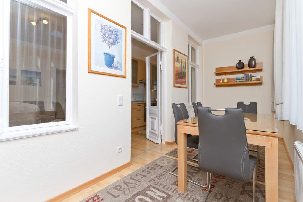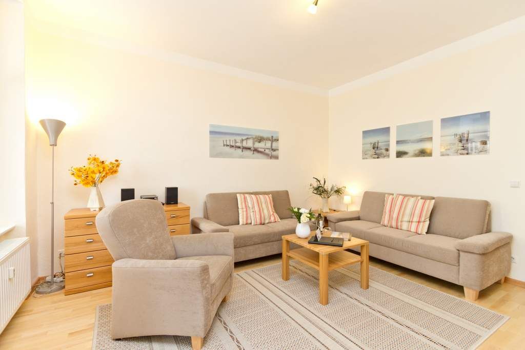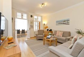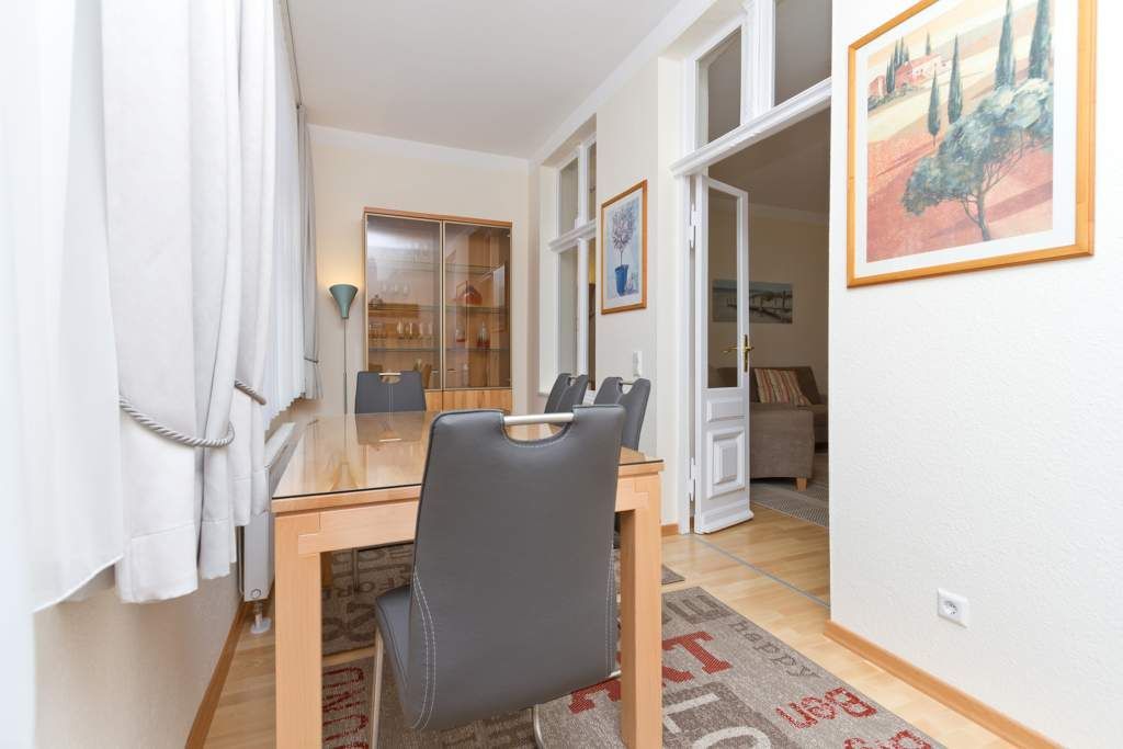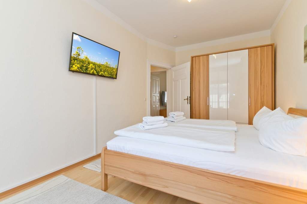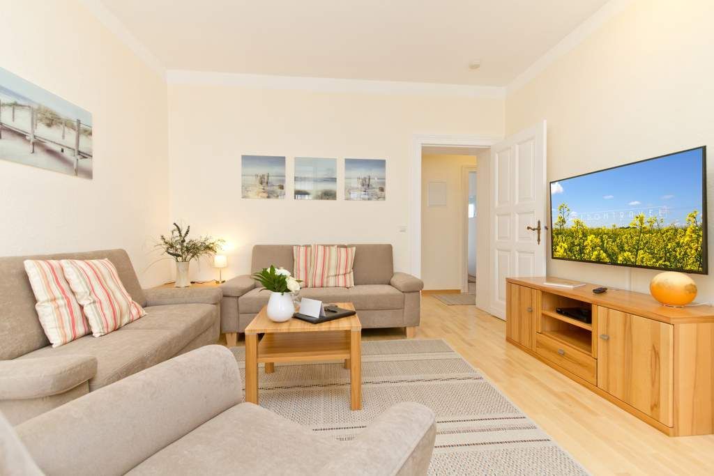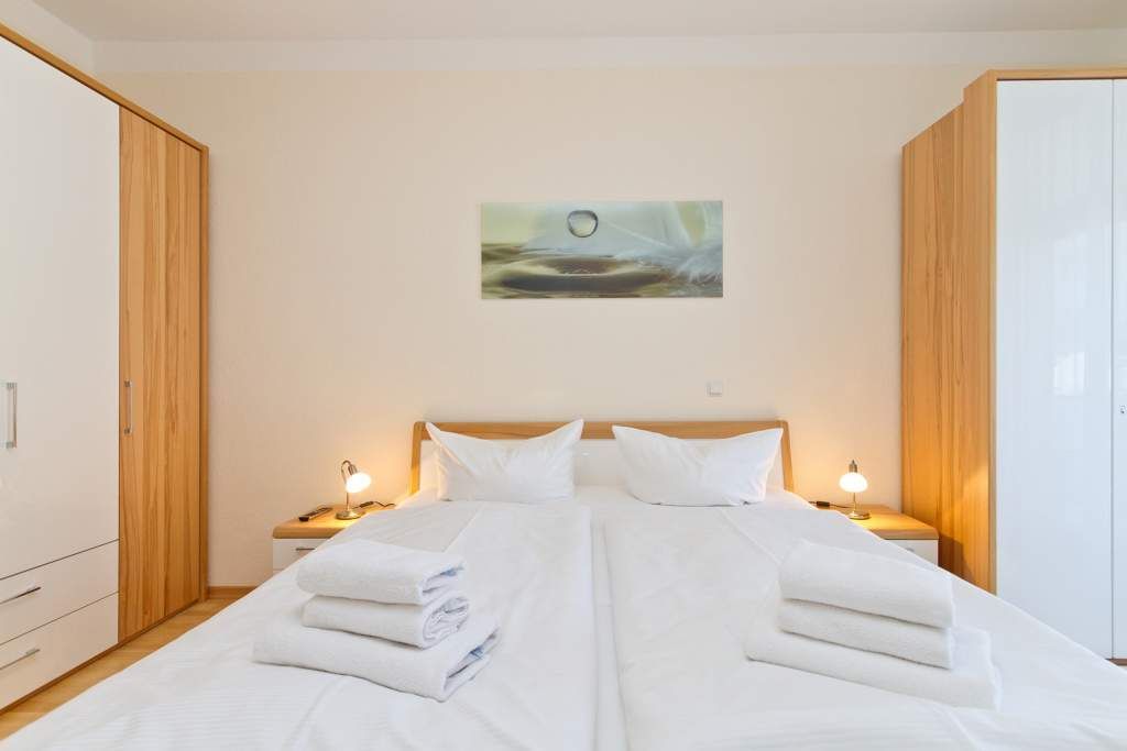Diese schöne 3-Raum-Ferienwohnung im Erdgeschoss ist modern und sehr komfortabel eingerichtet. Die Wohnung bietet Ihnen ein großes Wohnzimmer, eine verglaste Veranda mit Essbereich, eine komplett ausgestattete Küchenzeile, ein Schlafzimmer mit Doppelbett, ein zweites Schlafzimmer mit Schlafcouch (1,50m x 2,00 m). Beide Schlafzimmer sind mit einem Fernseher ausgestattet. Das Bad ist komfortabel mit Dusche, WC, BD, Föhn und Schminkspiegel ausgestattet. Auf Ihrem großzügigen Balkon genießen Sie die Morgensonne.