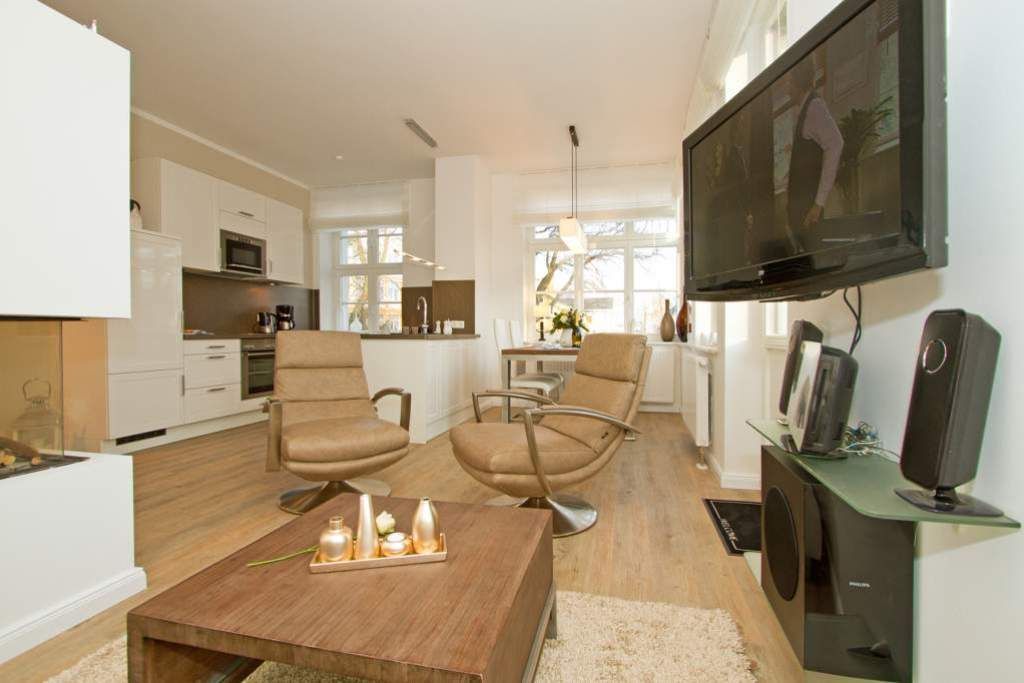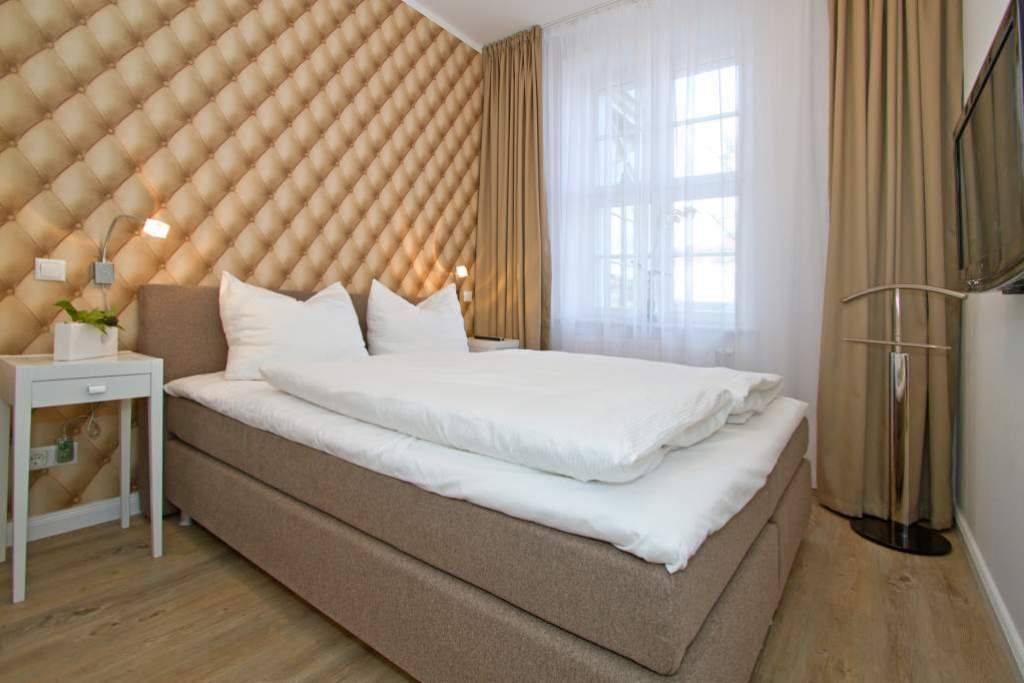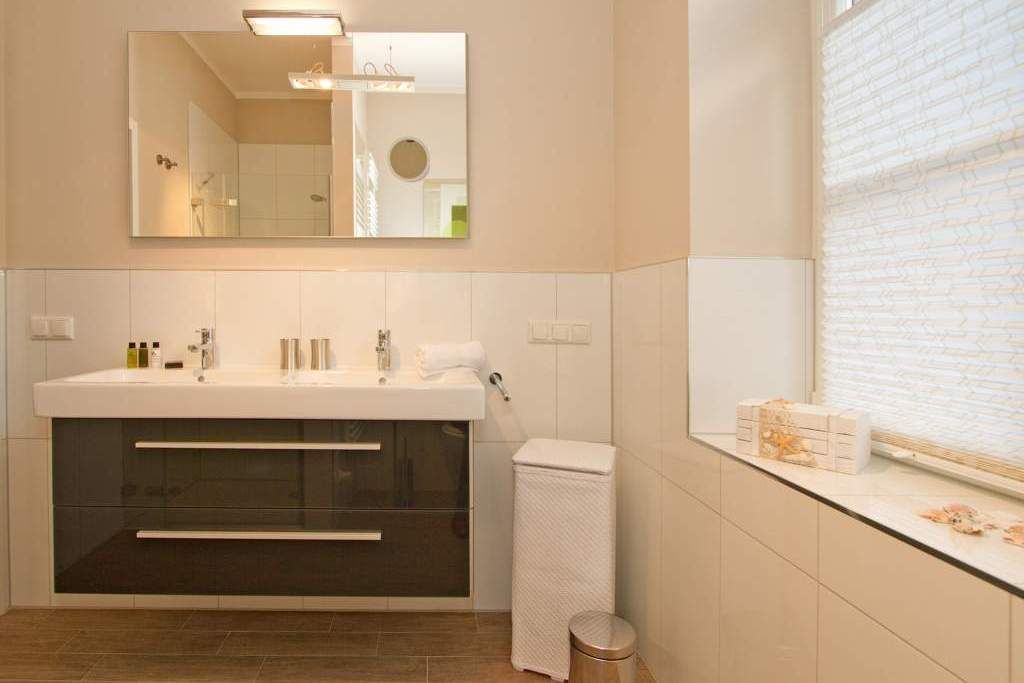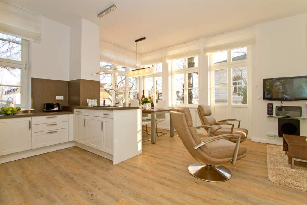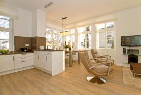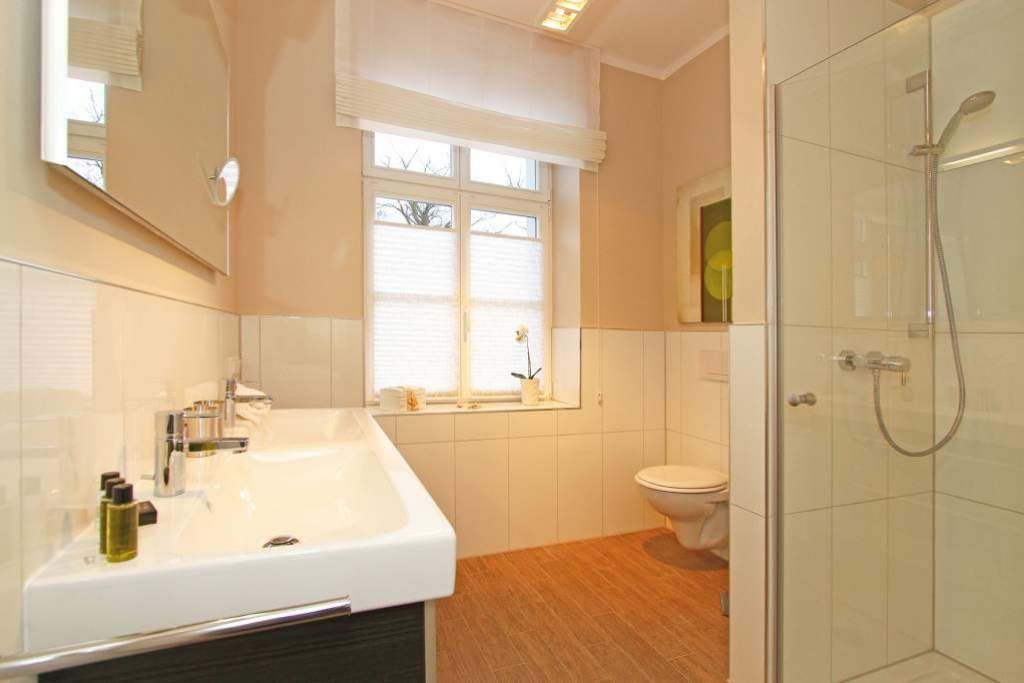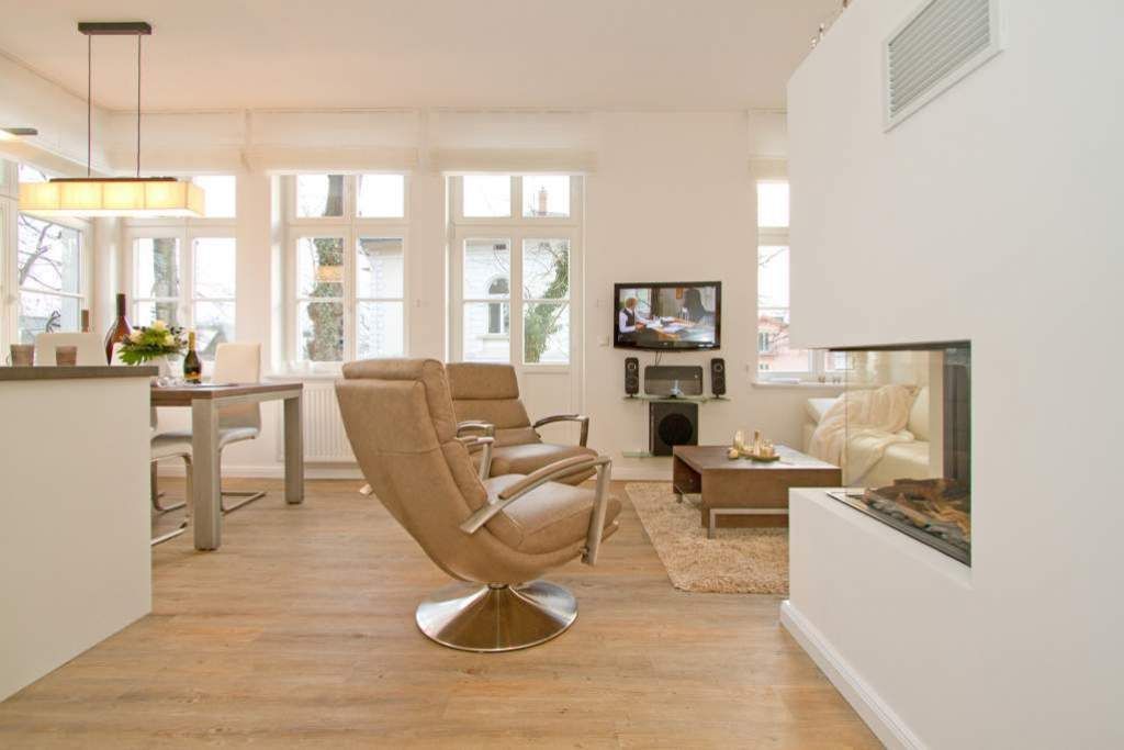 Edle Ausstattung und charmante Details! Willkommen in Ihrem Waldschloss - Urlaubsdomizil! Die großzügige 3-Raum-Ferienwohnung ( 75 qm) für 4 Personen und ein Kleinkind ( bis 3 Jahre im Kinderreisebett) im Erdgeschoss bietet neben ausreichend Platz, eine luxuriöse Ausstattung und Möblierung, die viel Urlaubsflair versprüht. Ausstattungstechnisch wurde selbstverständlich an alles gedacht. Der geschmackvoll möblierte Wohnbereich mit Flat-TV bietet auch einen per Fernbedienung bedienbaren Gas-Designkamin. Ein Highlight besonders in der kalten Jahreszeit. An den schönen Essbereich in der verglasten Veranda, schließt sich eine offene, komplett ausgestattete Küche (auch Waschmaschine vorhanden) an. Auch die beiden Schlafzimmer mit Boxspringbetten ( 1,60 m) für erholsamen Schlaf sind mit je einem Flat-TV ausgestattet. Für Ihren Komfort steht die Erstausstattung Wäsche (Bettwäsche, 1 Duschtuch & 2 kleine Handtücher) für Sie bereit. Ergänzt wird die Wohnung durch ein schönes Bad mit Doppelwaschtisch und Echtglasdusche und ein Gäste-WC. Wer keine Lust auf Strand hat, macht es sich auf den beiden großen und sonnigen Terrassen gemütlich, bequeme Gartenmöbel, ein eigener Strandkorb und eine Sonnenliege warten hier auf Sie. Für Kleinkinder können ein Kinderreisebett (ohne Matratze und Kinderbettzeug) und ein Kinderhochstuhl gegen einen Aufpreis bestellt werden. Das WLAN-Netz im Haus kann kostenfrei genutzt werden.