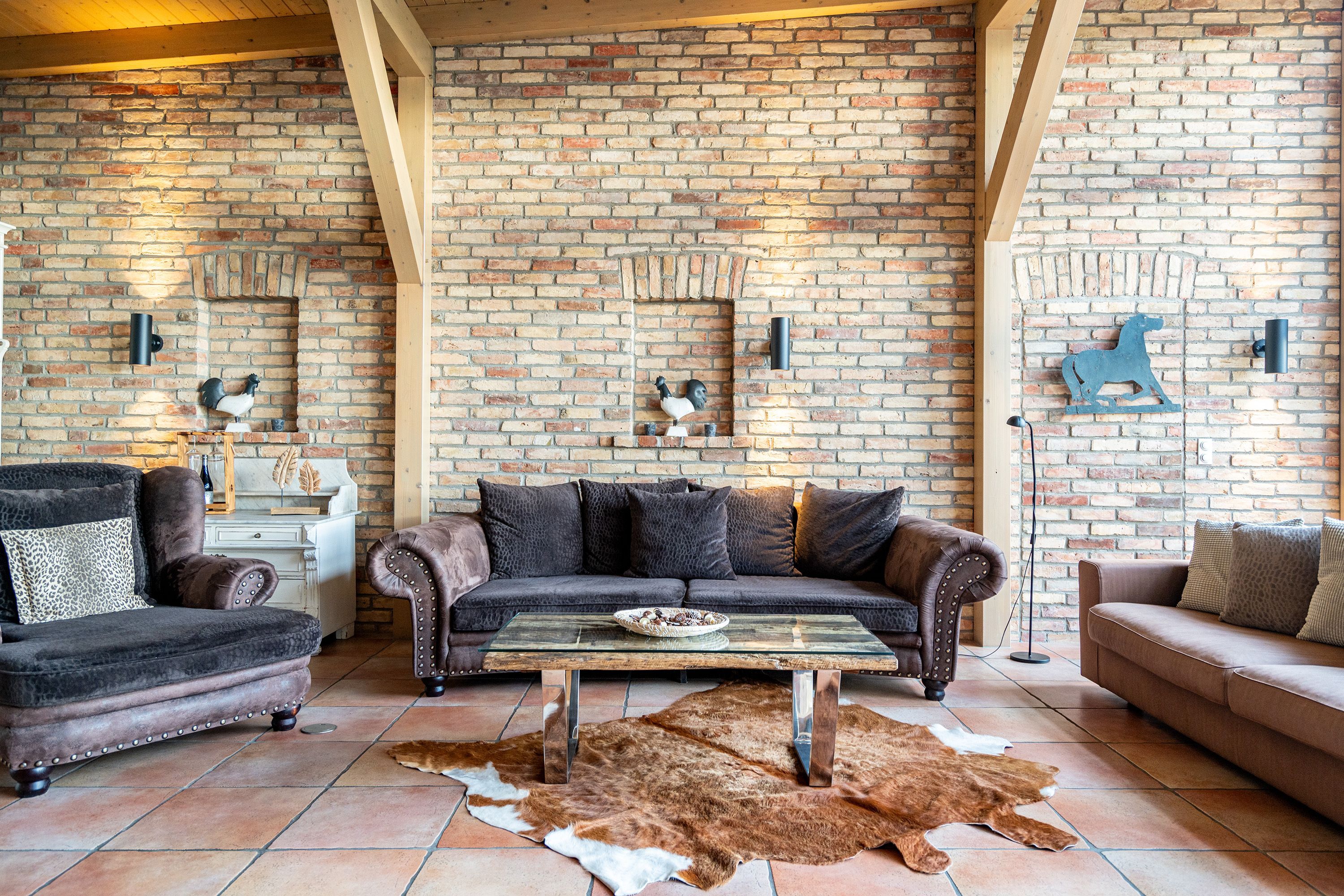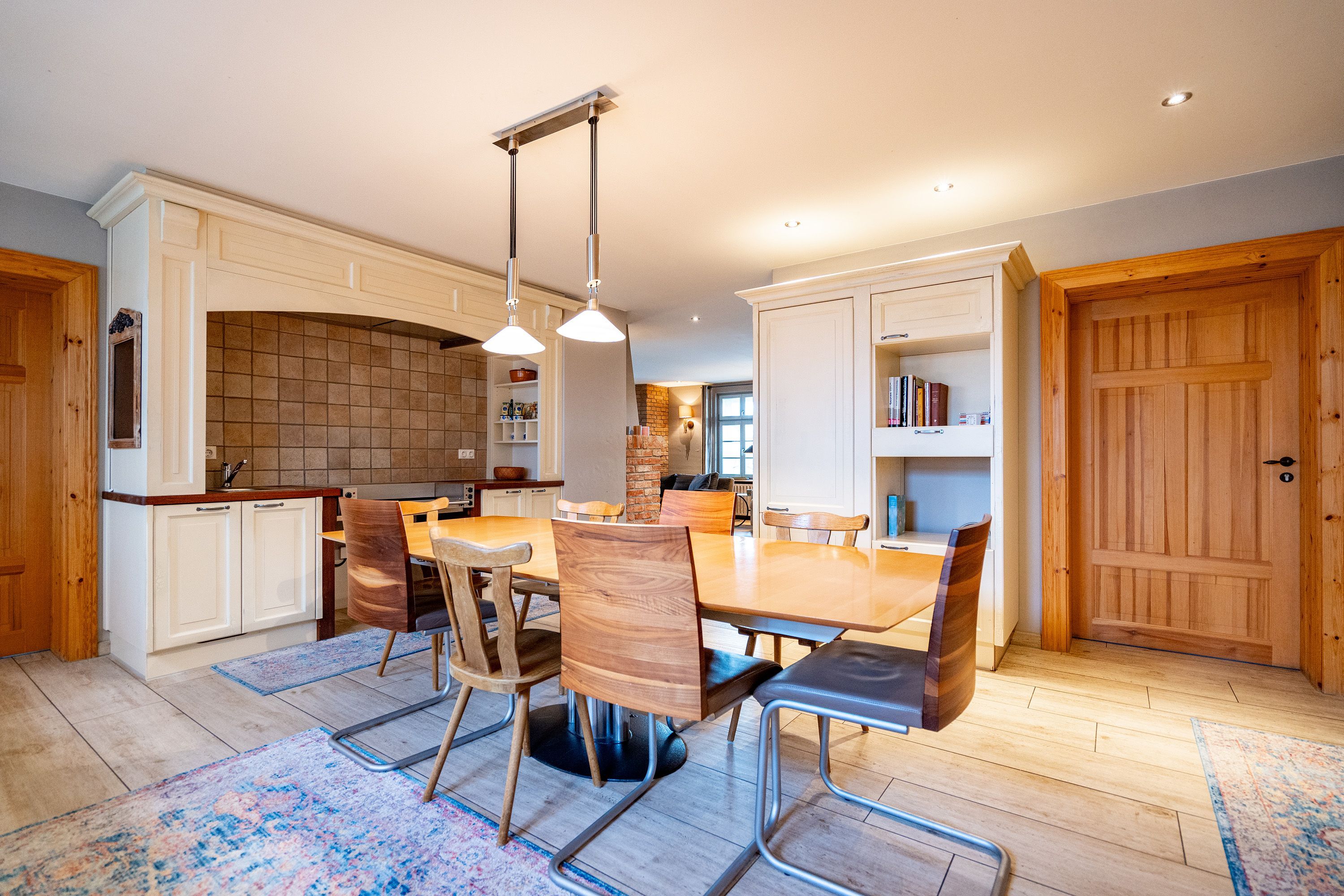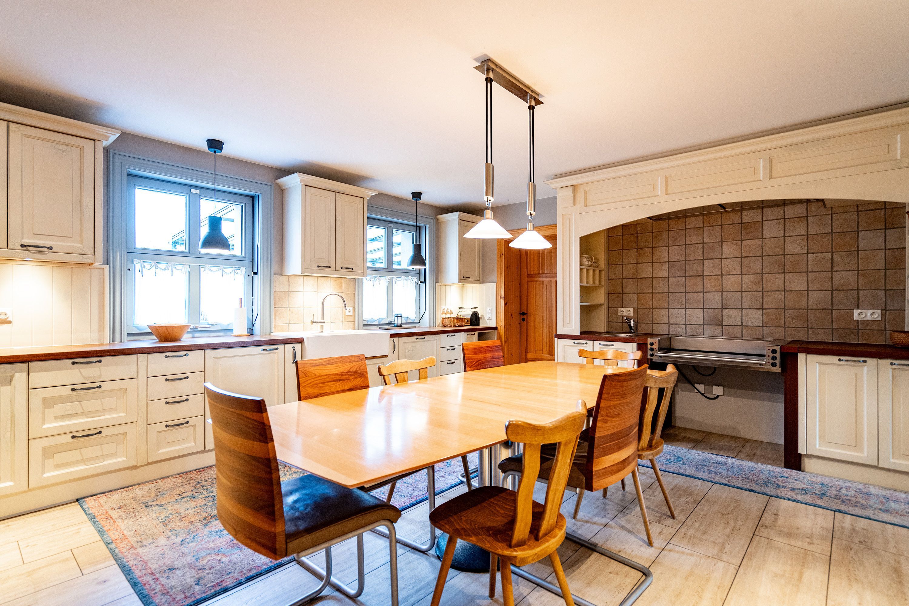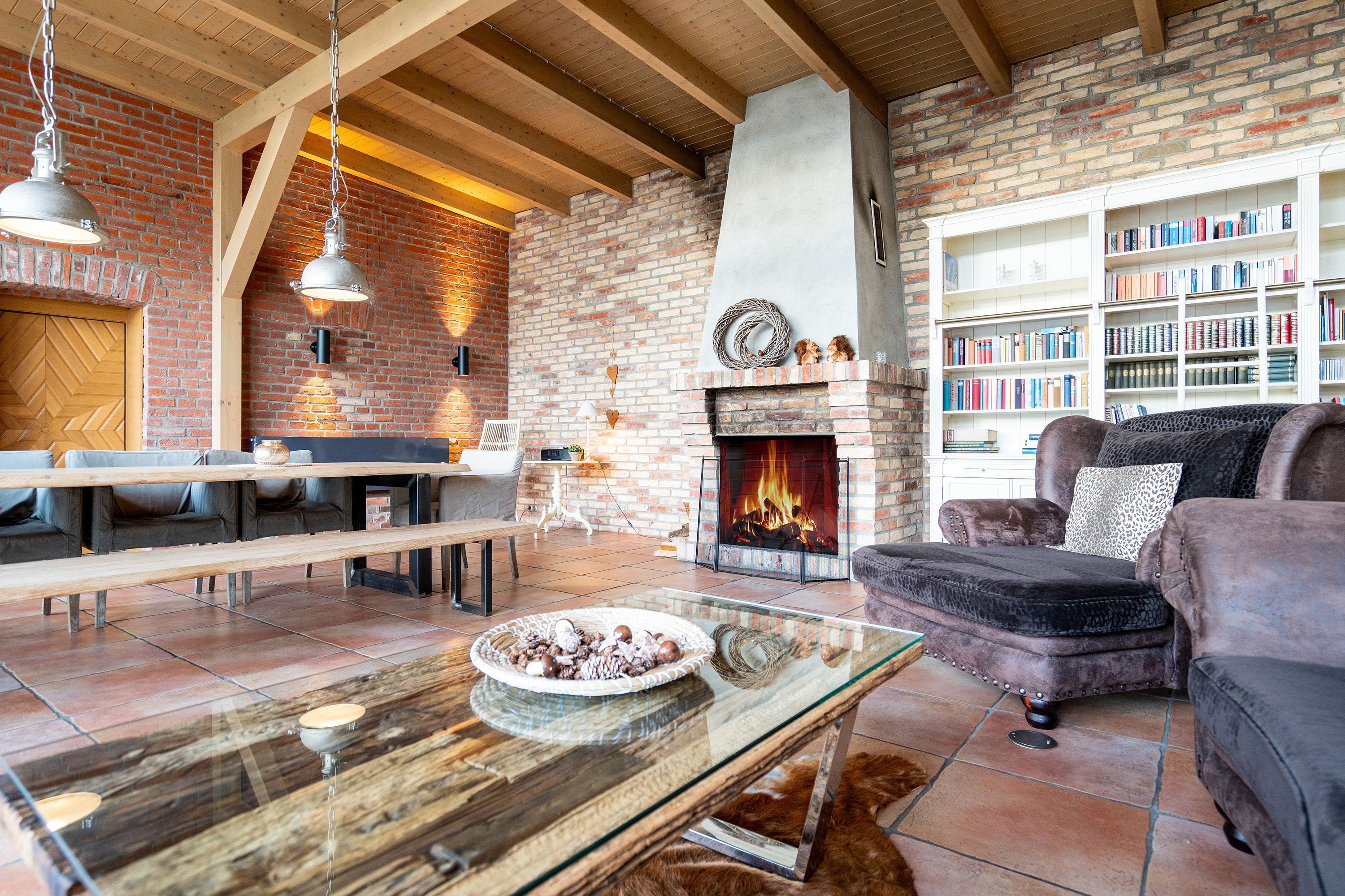 Im Inneren verschmelzen Industriedesign-Möbel mit rustikalen Echtholzmöbeln zu einem modernen und stilvollen Landhausstil. Großzügige Räume im Erdgeschoss ermöglichen gemeinsame Aktivitäten. Vom großzügigen Wohnraum mit offenem Kamin und Flachbildfernseher über urige Steinwände bis zu gemütlichen Sofalandschaften (mit Schlaffunktion) gelangt man zur Hauptküche. Der zentrale Essbereich bietet viel Platz zum Arbeiten und Kochen, sogar auf Induktionsplatten. Alle Geräte wie Spülmaschine, Kühl- und Gefrierschrank, Kaffeemaschine und Backofen stammen von hochwertigen Markenherstellern.