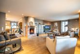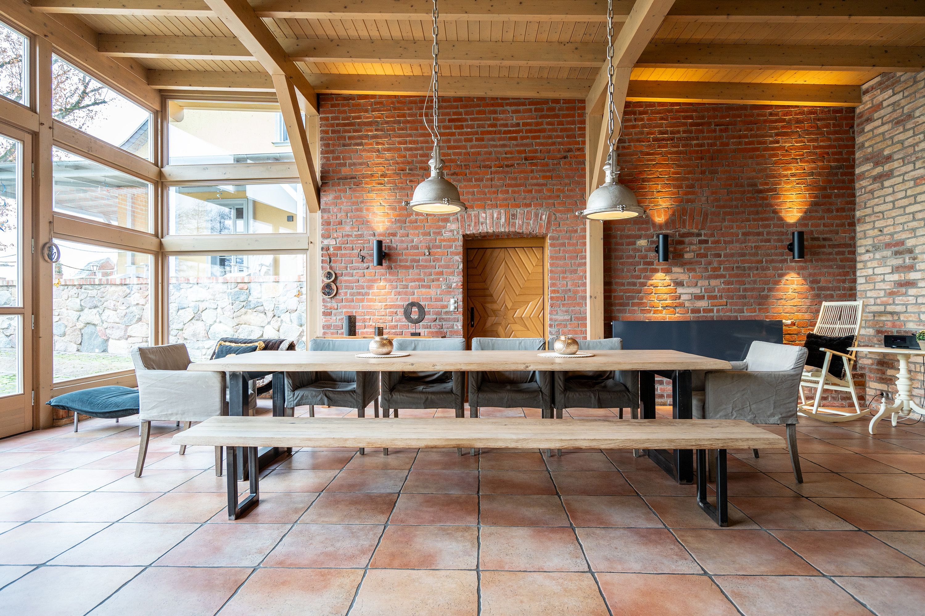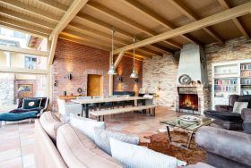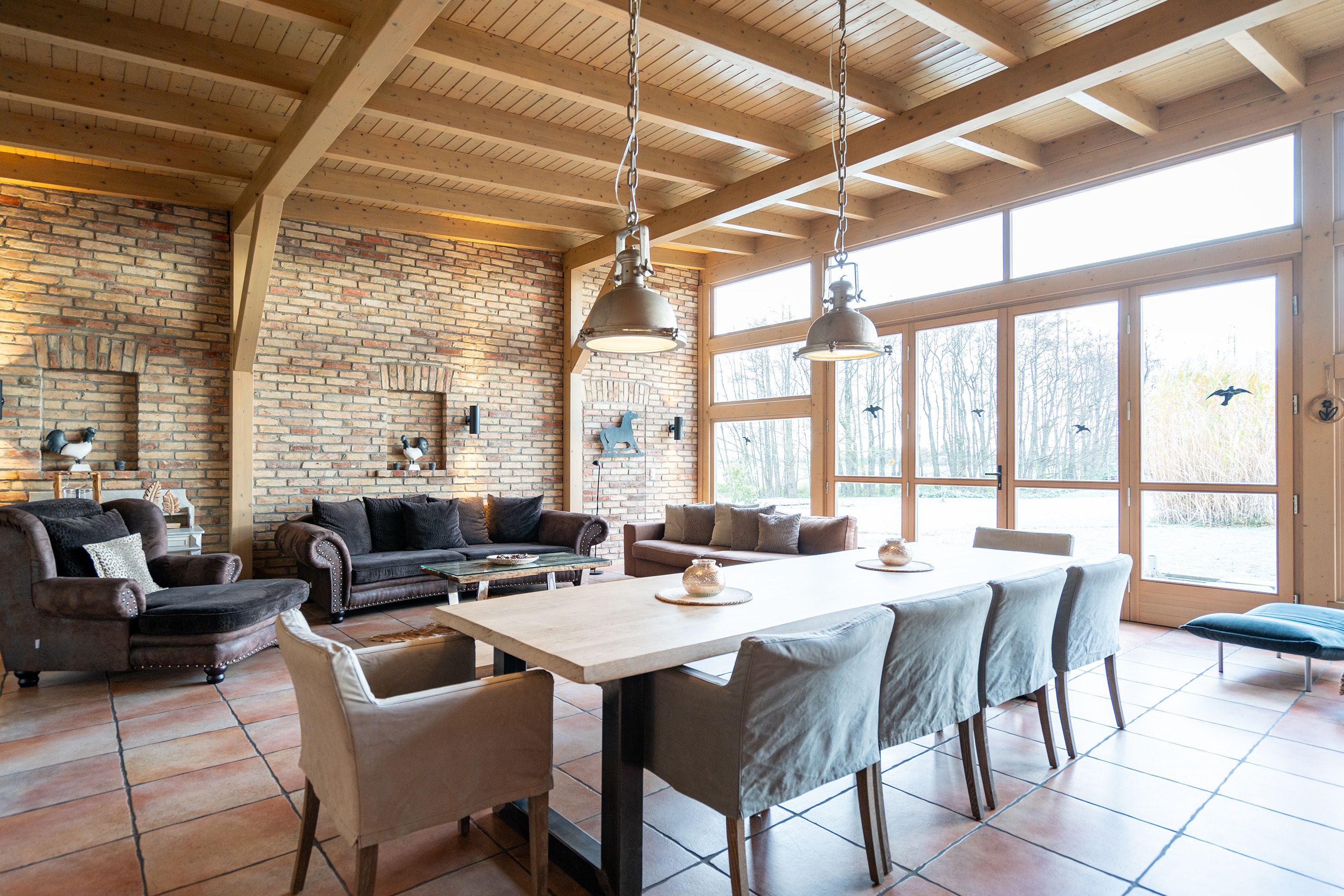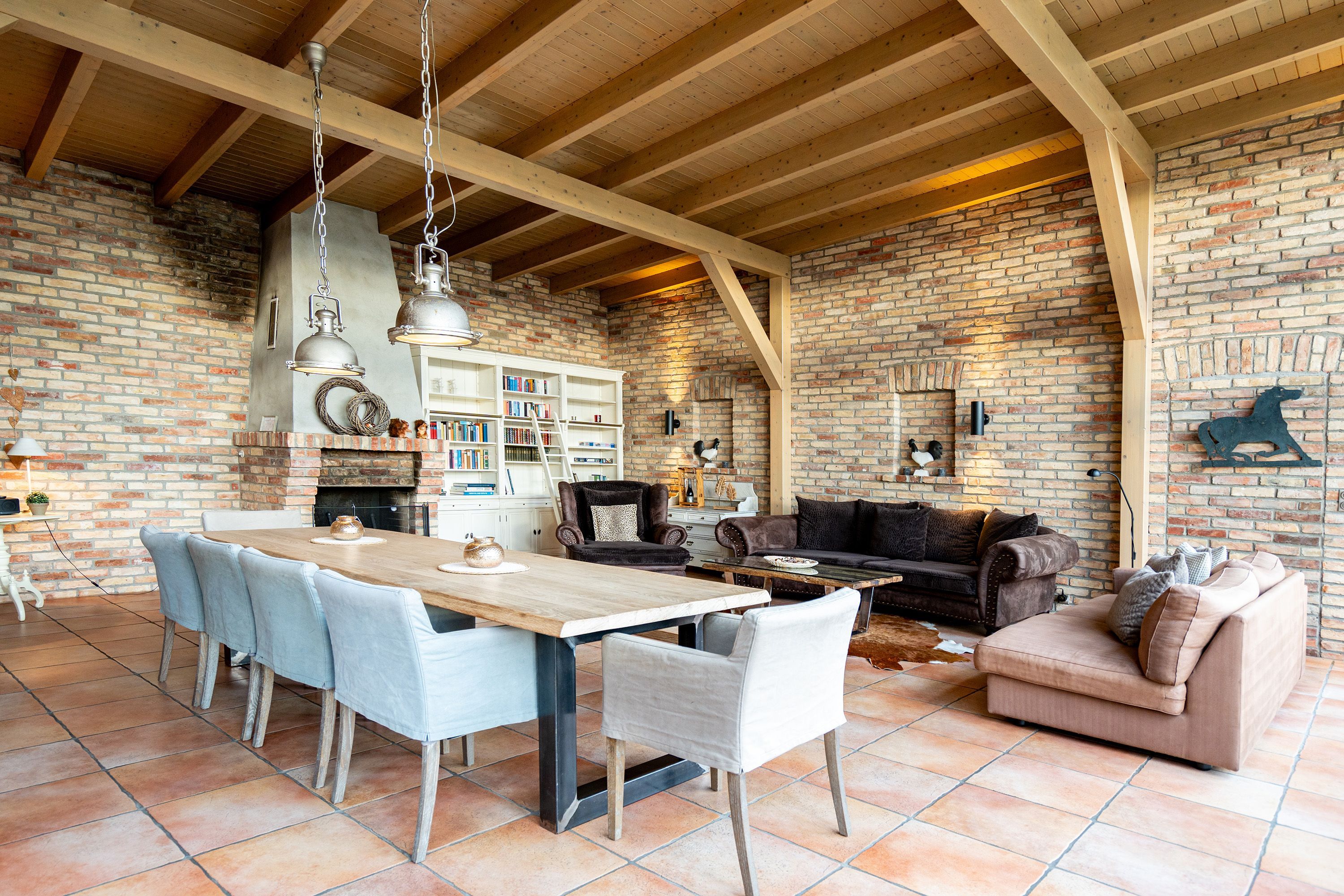 Im Inneren verschmelzen Industriedesign-Möbel mit rustikalen Echtholzmöbeln zu einem modernen und stilvollen Landhausstil. Großzügige Räume im Erdgeschoss ermöglichen gemeinsame Aktivitäten. Vom großzügigen Wohnraum mit offenem Kamin und Flachbildfernseher über urige Steinwände bis zu gemütlichen Sofalandschaften (mit Schlaffunktion) gelangt man zur Hauptküche. Der zentrale Essbereich bietet viel Platz zum Arbeiten und Kochen, sogar auf Induktionsplatten. Alle Geräte wie Spülmaschine, Kühl- und Gefrierschrank, Kaffeemaschine und Backofen stammen von hochwertigen Markenherstellern.
