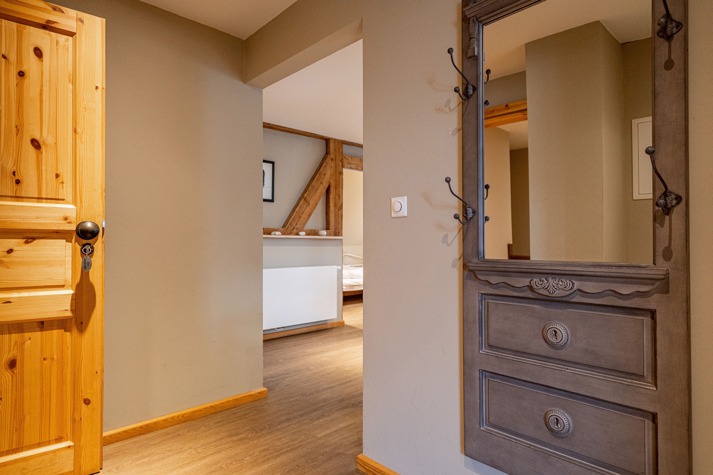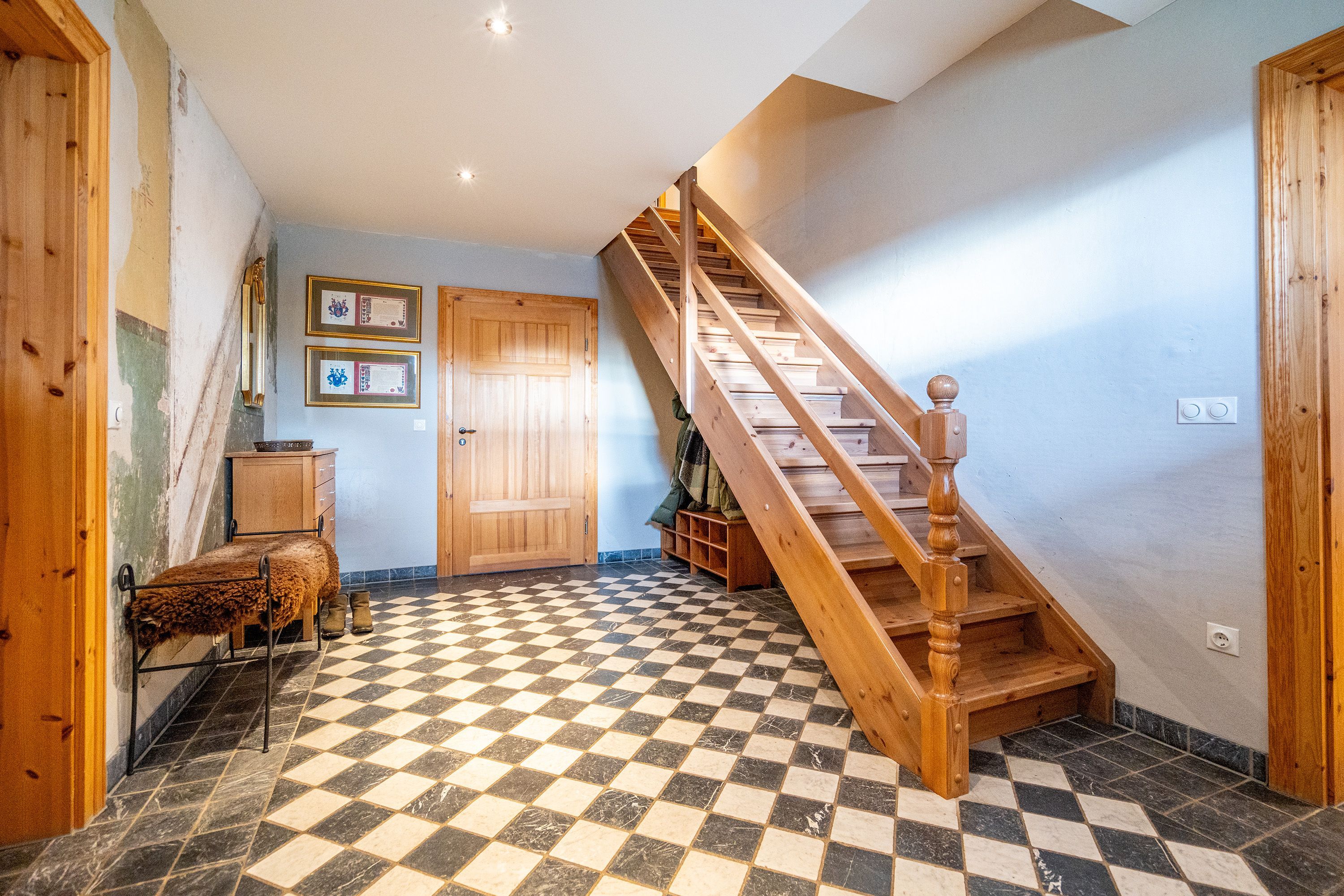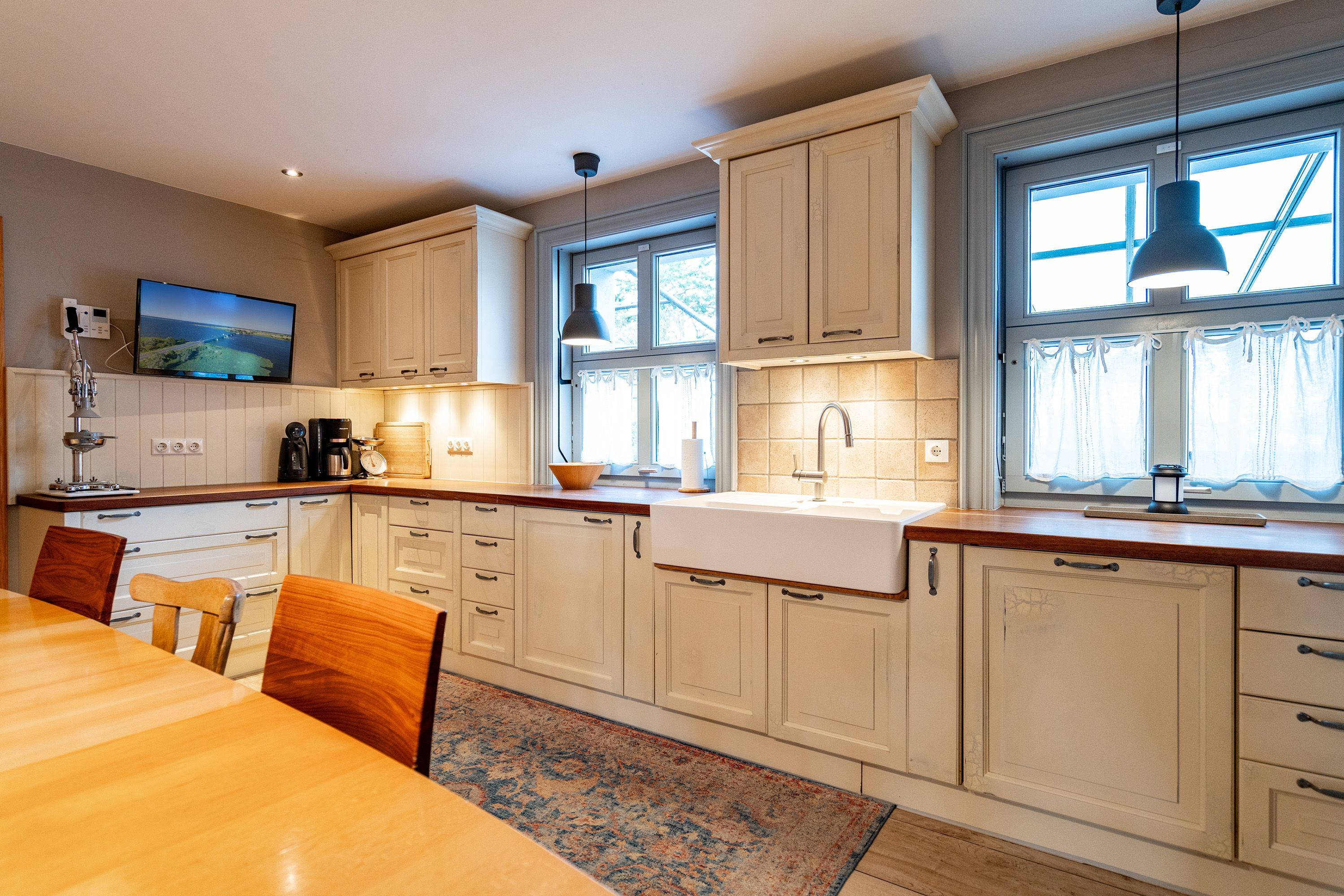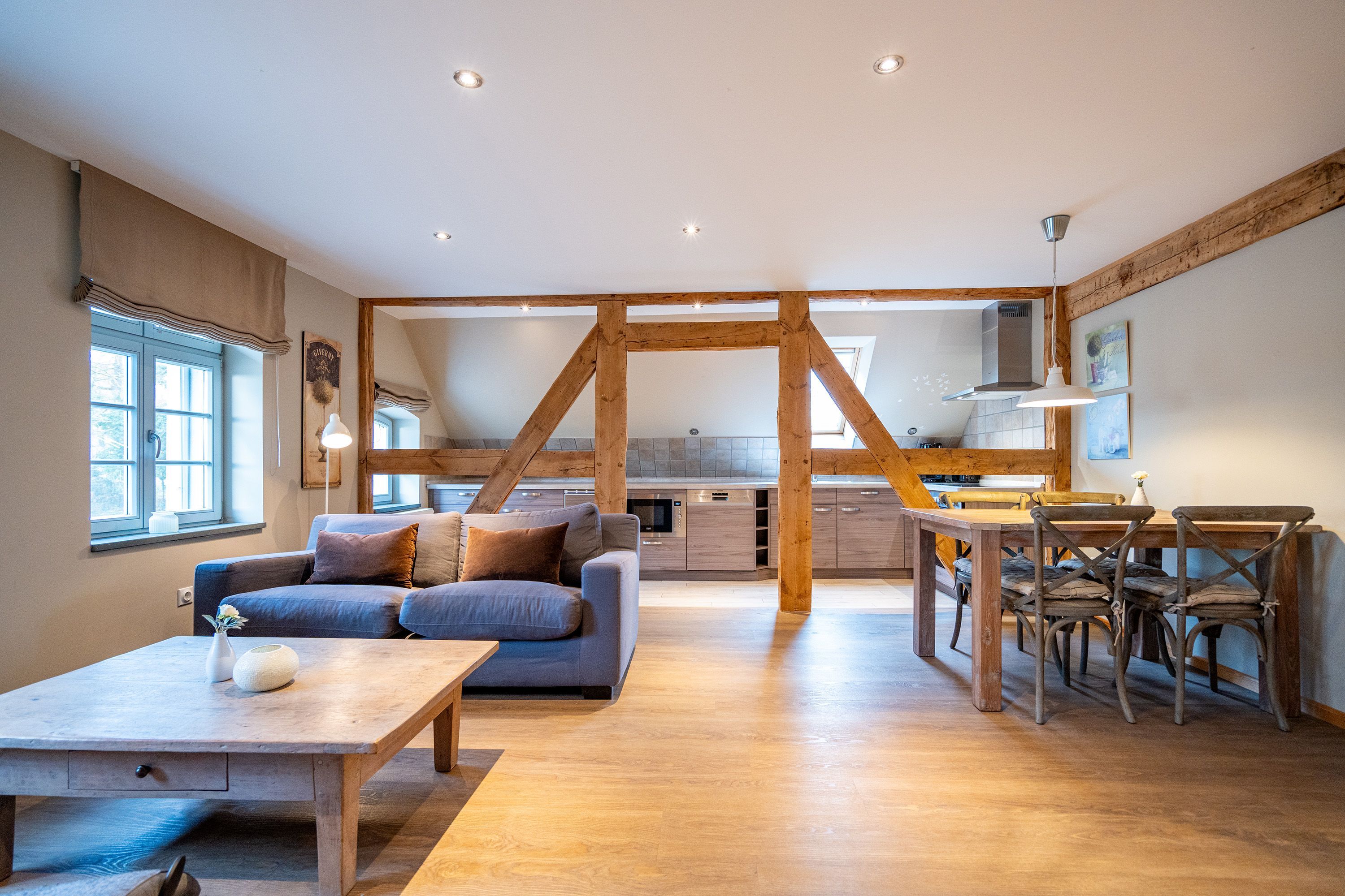 Im Inneren verschmelzen Industriedesign-Möbel mit rustikalen Echtholzmöbeln zu einem modernen und stilvollen Landhausstil. Großzügige Räume im Erdgeschoss ermöglichen gemeinsame Aktivitäten. Vom großzügigen Wohnraum mit offenem Kamin und Flachbildfernseher über urige Steinwände bis zu gemütlichen Sofalandschaften (mit Schlaffunktion) gelangt man zur Hauptküche. Der zentrale Essbereich bietet viel Platz zum Arbeiten und Kochen, sogar auf Induktionsplatten. Alle Geräte wie Spülmaschine, Kühl- und Gefrierschrank, Kaffeemaschine und Backofen stammen von hochwertigen Markenherstellern.