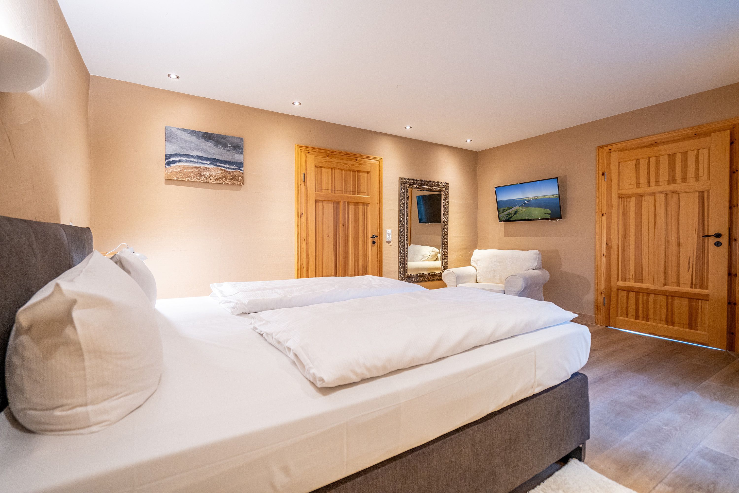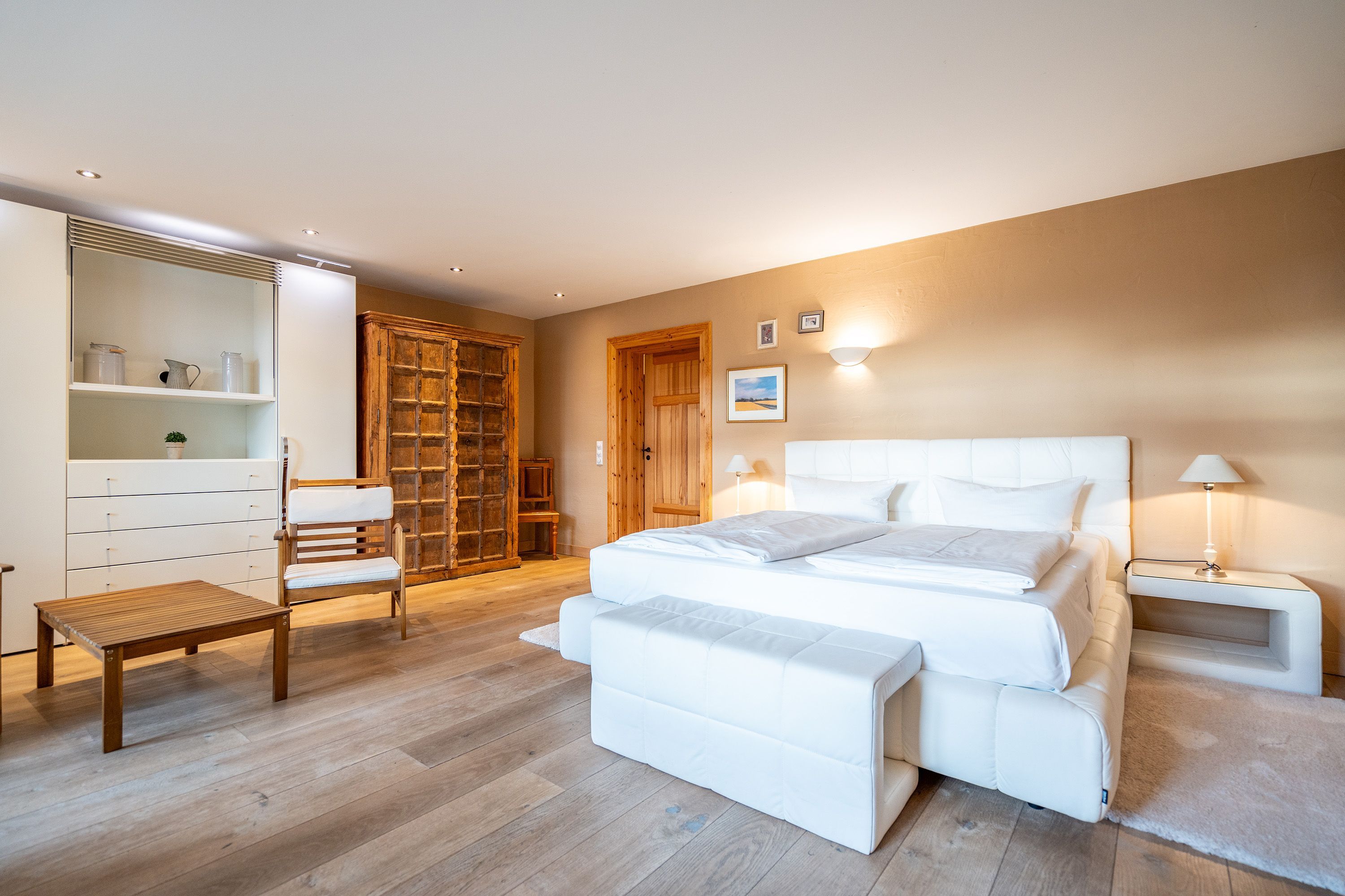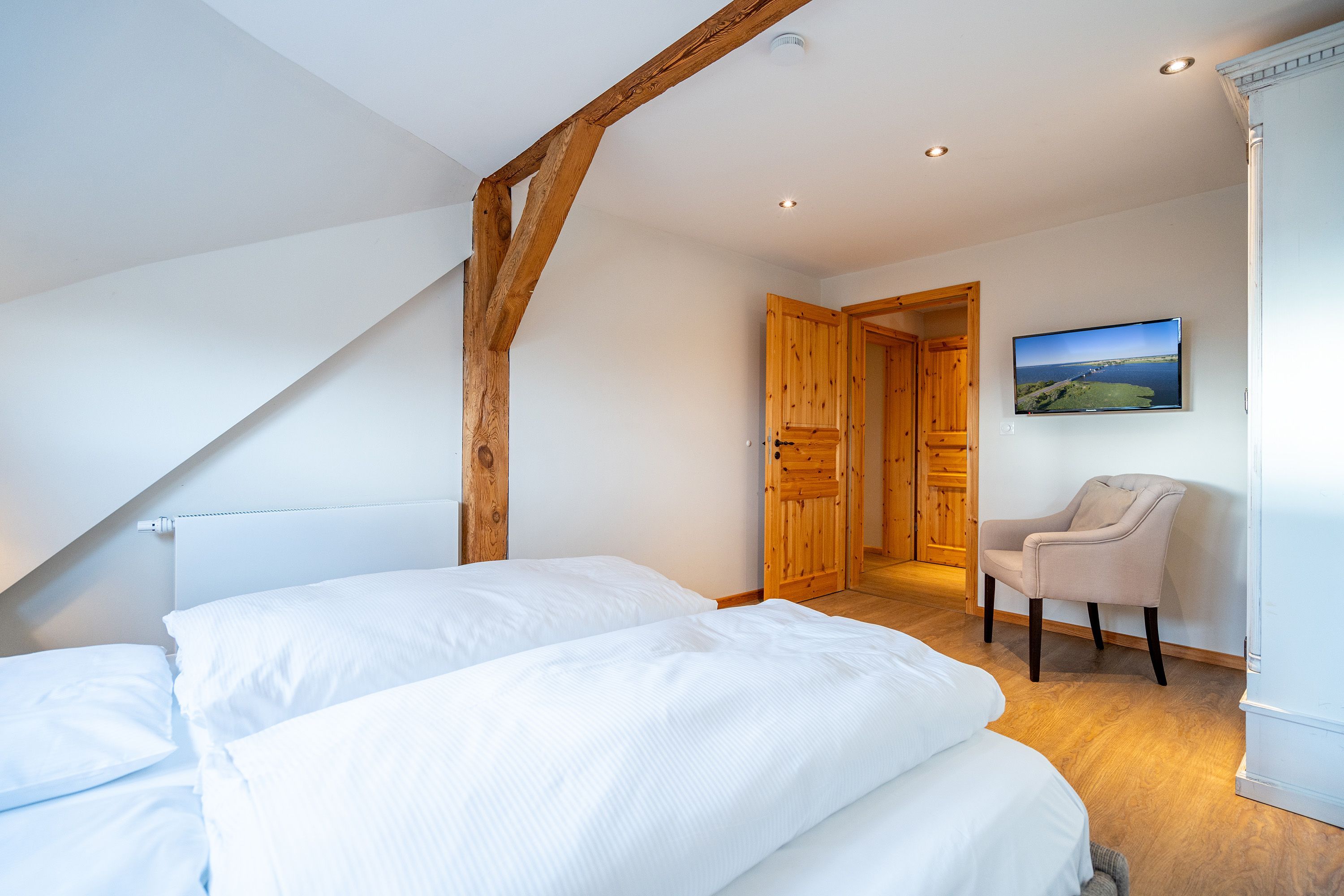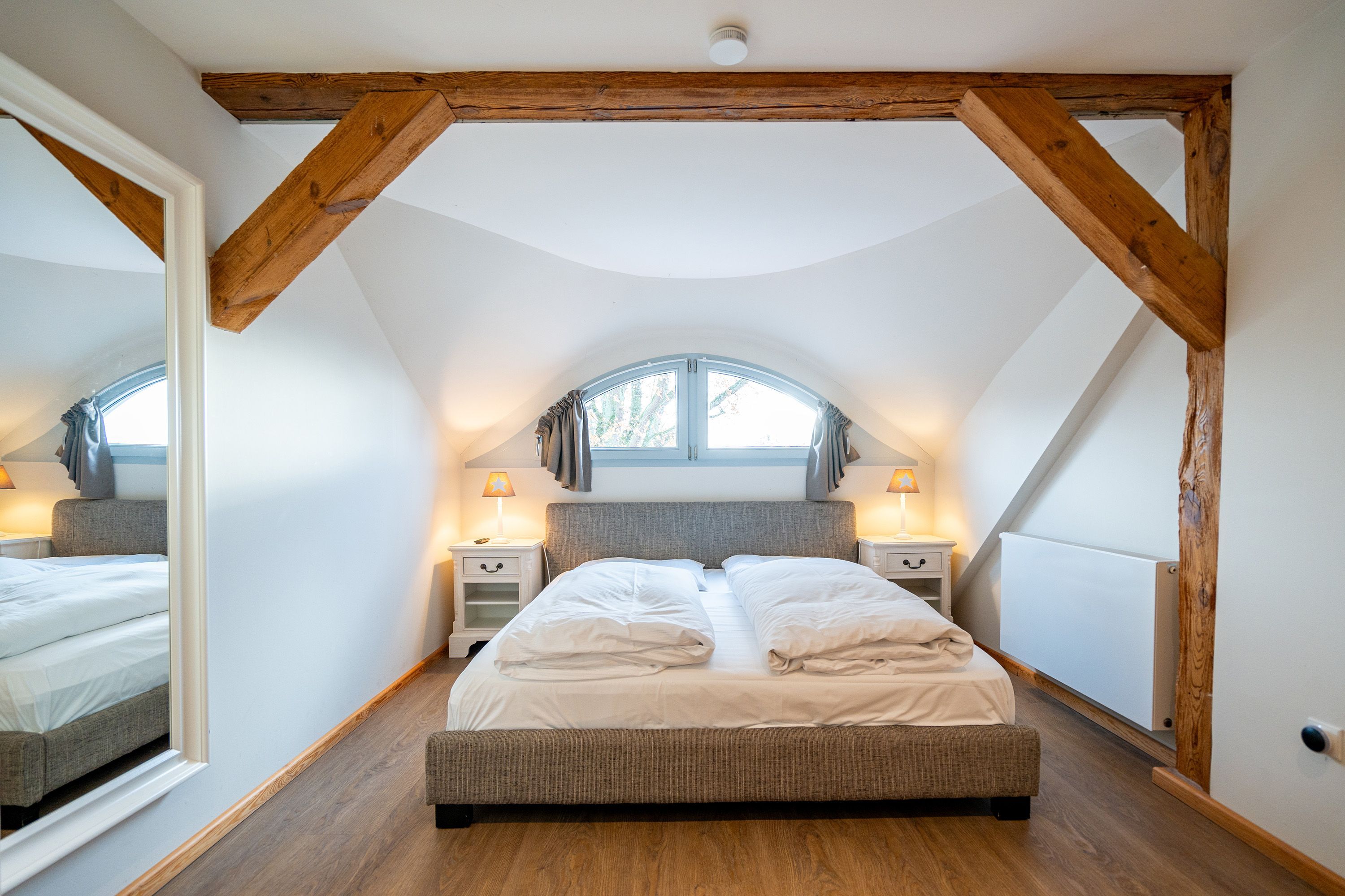 Im Erdgeschoss befinden sich auch zwei Schlafzimmer, eines mit einem großen Doppelboxspringbett (1,80 m x 2,00 m) und einem geräumigen Kleiderschrank, das andere ebenfalls mit einem Doppelboxspringbett (1,80 m x 2,00 m) und einem Zugang zum eigenen Bad mit Dusch-Badewanne, Waschtisch und WC. Ein weiteres Bad mit Dusche und WC befindet sich neben der Küche. Im ausgebauten Dachgeschoss gibt es zwei Schlafzimmer mit komfortablen Doppelbetten (1,80 m x 2,00 m) und jeweils einem eigenen Bad mit Duschbadewanne, Waschtisch und WC. Hier oben befinden sich außerdem zwei weitere Wohnbereiche mit Sofas und einer voll ausgestatteten offenen Küchenzeile (mit Backofen, Mikrowelle und Spülmaschine). Ein Wohnbereich führt zu einem kleinen Séparée mit zwei Einzelbetten (je 0,80 m x 2,20 m), während im zweiten Wohnbereich zusätzlich ein Daybed (als Aufbettung für eine weitere Person möglich) zu finden ist. Alle Betten sind allergikerfreundlich für einen gesunden Schlaf.?
