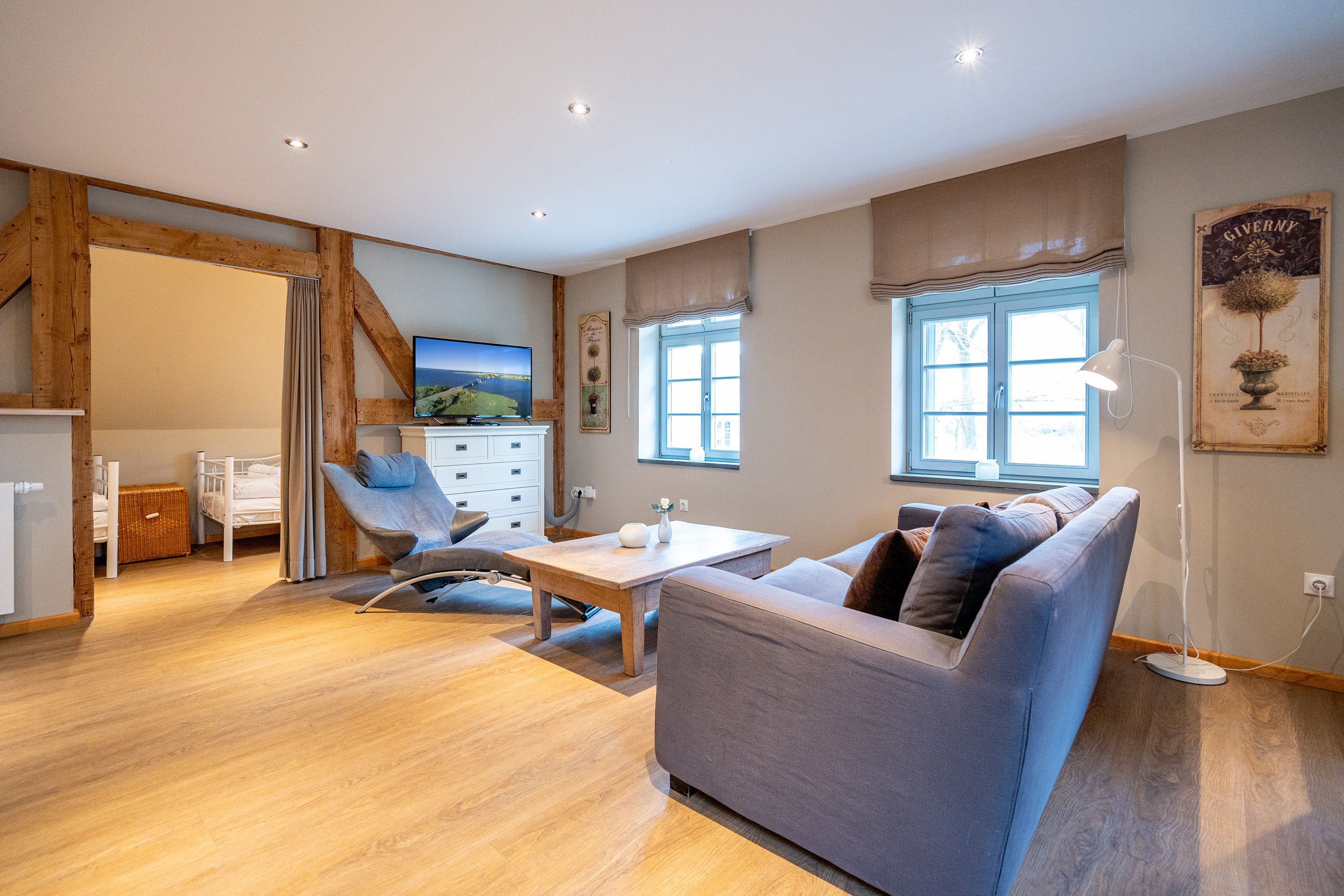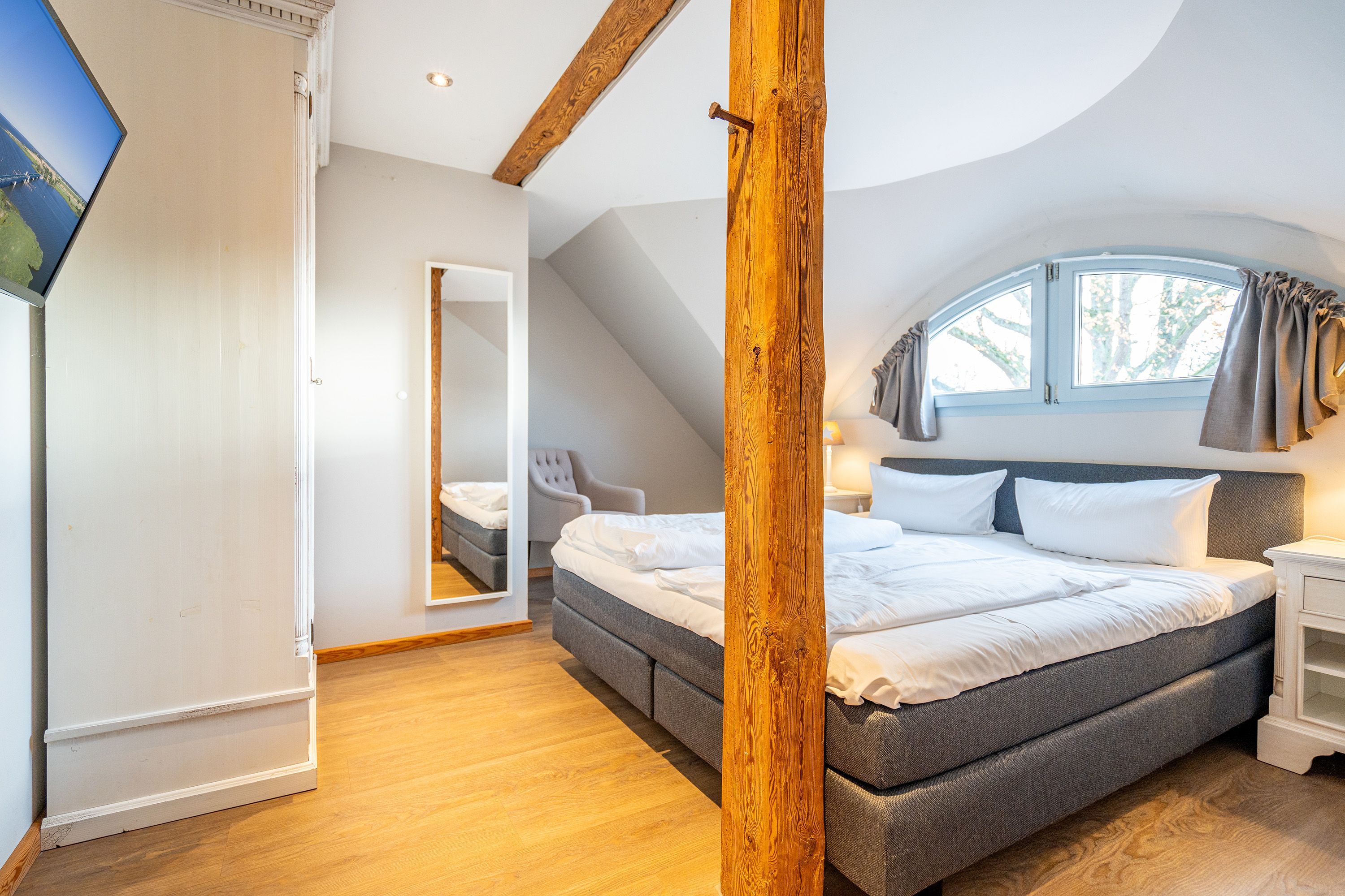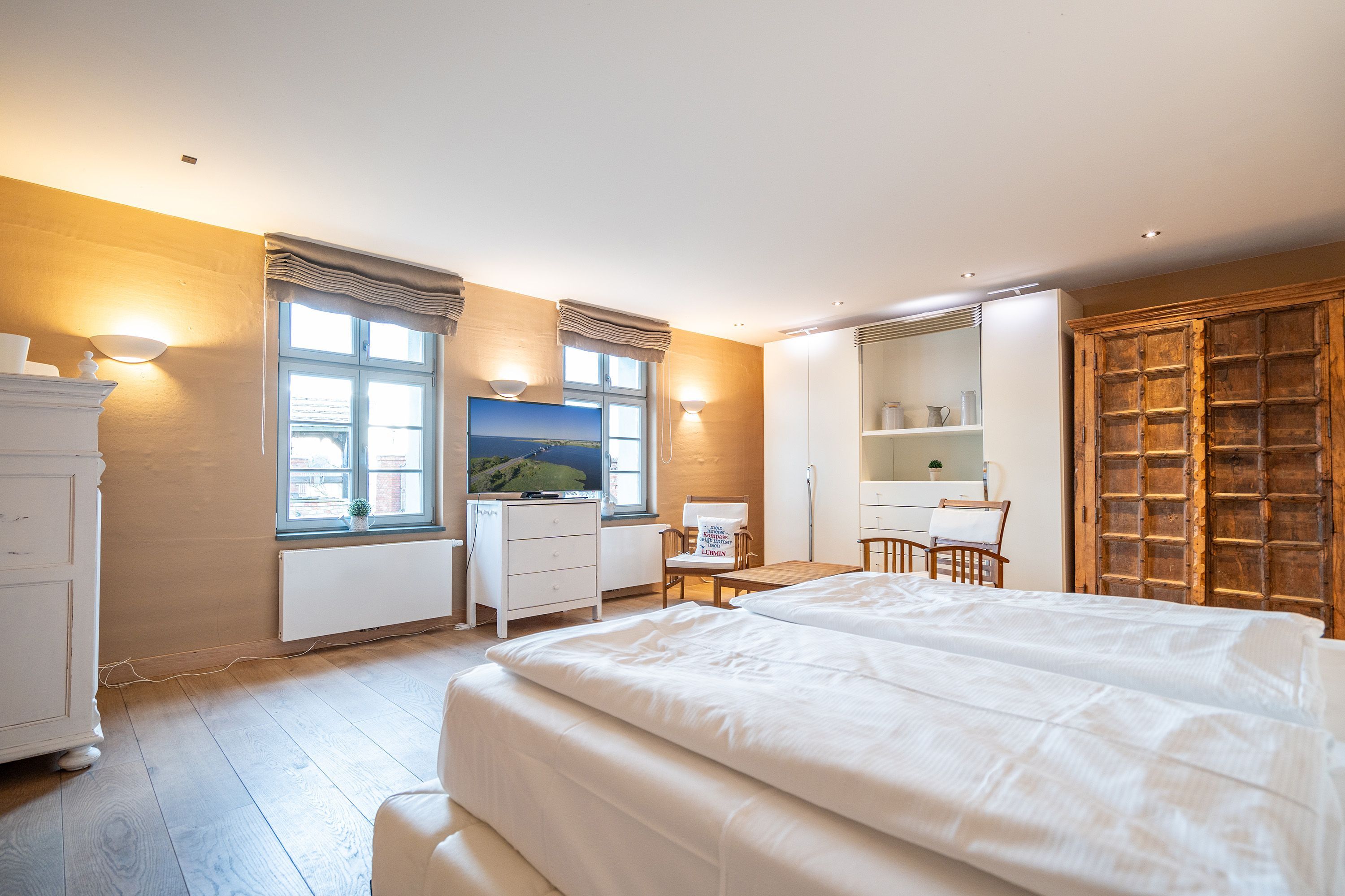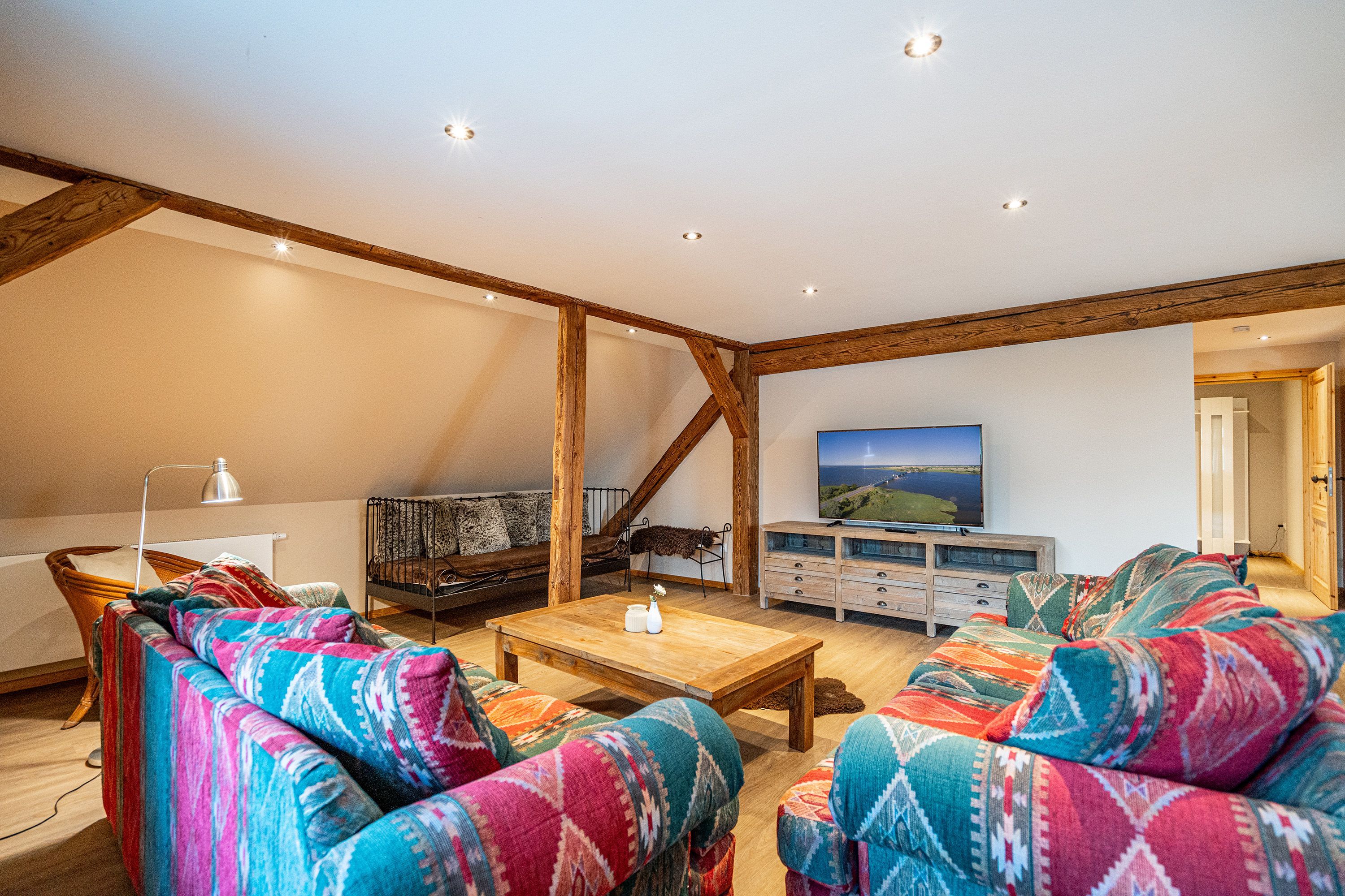 Im Erdgeschoss befinden sich auch zwei Schlafzimmer, eines mit einem großen Doppelboxspringbett (1,80 m x 2,00 m) und einem geräumigen Kleiderschrank, das andere ebenfalls mit einem Doppelboxspringbett (1,80 m x 2,00 m) und einem Zugang zum eigenen Bad mit Dusch-Badewanne, Waschtisch und WC. Ein weiteres Bad mit Dusche und WC befindet sich neben der Küche. Im ausgebauten Dachgeschoss gibt es zwei Schlafzimmer mit komfortablen Doppelbetten (1,80 m x 2,00 m) und jeweils einem eigenen Bad mit Duschbadewanne, Waschtisch und WC. Hier oben befinden sich außerdem zwei weitere Wohnbereiche mit Sofas und einer voll ausgestatteten offenen Küchenzeile (mit Backofen, Mikrowelle und Spülmaschine). Ein Wohnbereich führt zu einem kleinen Séparée mit zwei Einzelbetten (je 0,80 m x 2,20 m), während im zweiten Wohnbereich zusätzlich ein Daybed (als Aufbettung für eine weitere Person möglich) zu finden ist. Alle Betten sind allergikerfreundlich für einen gesunden Schlaf.?