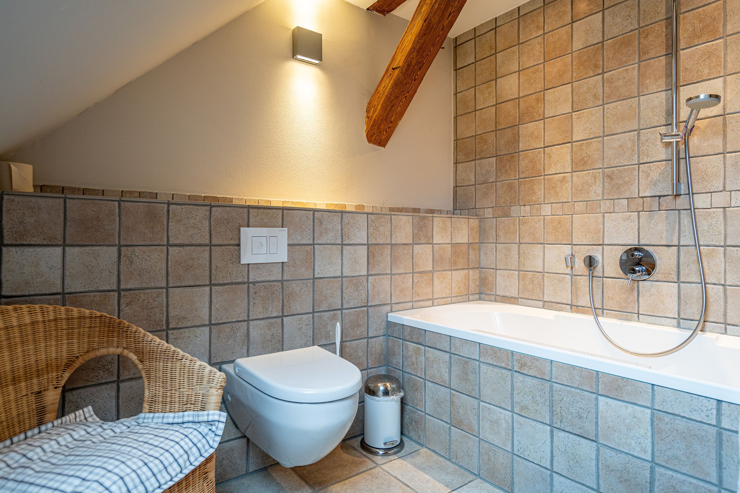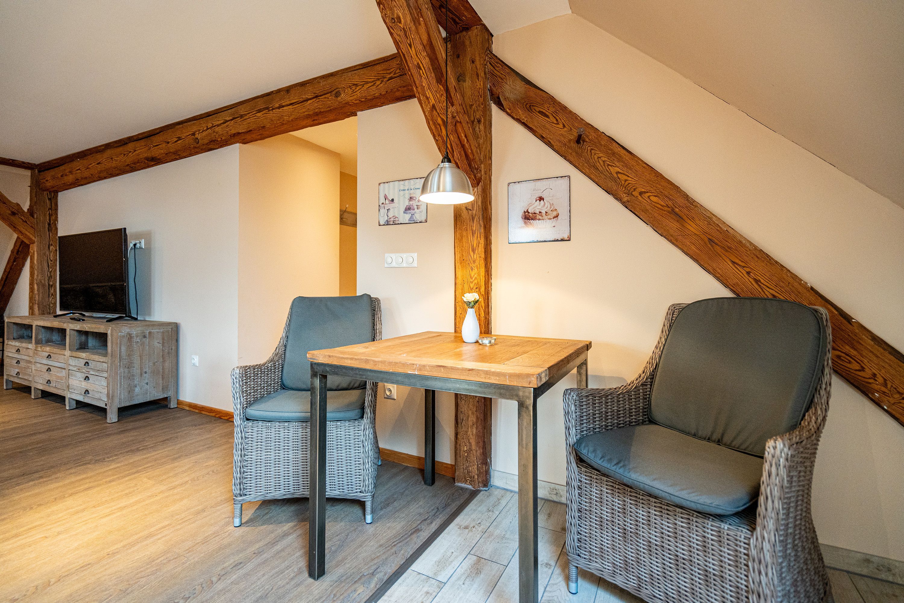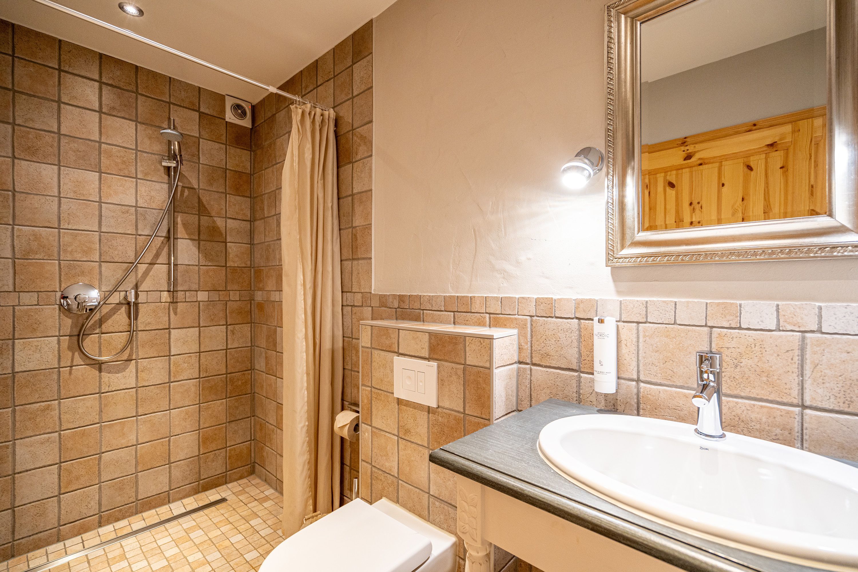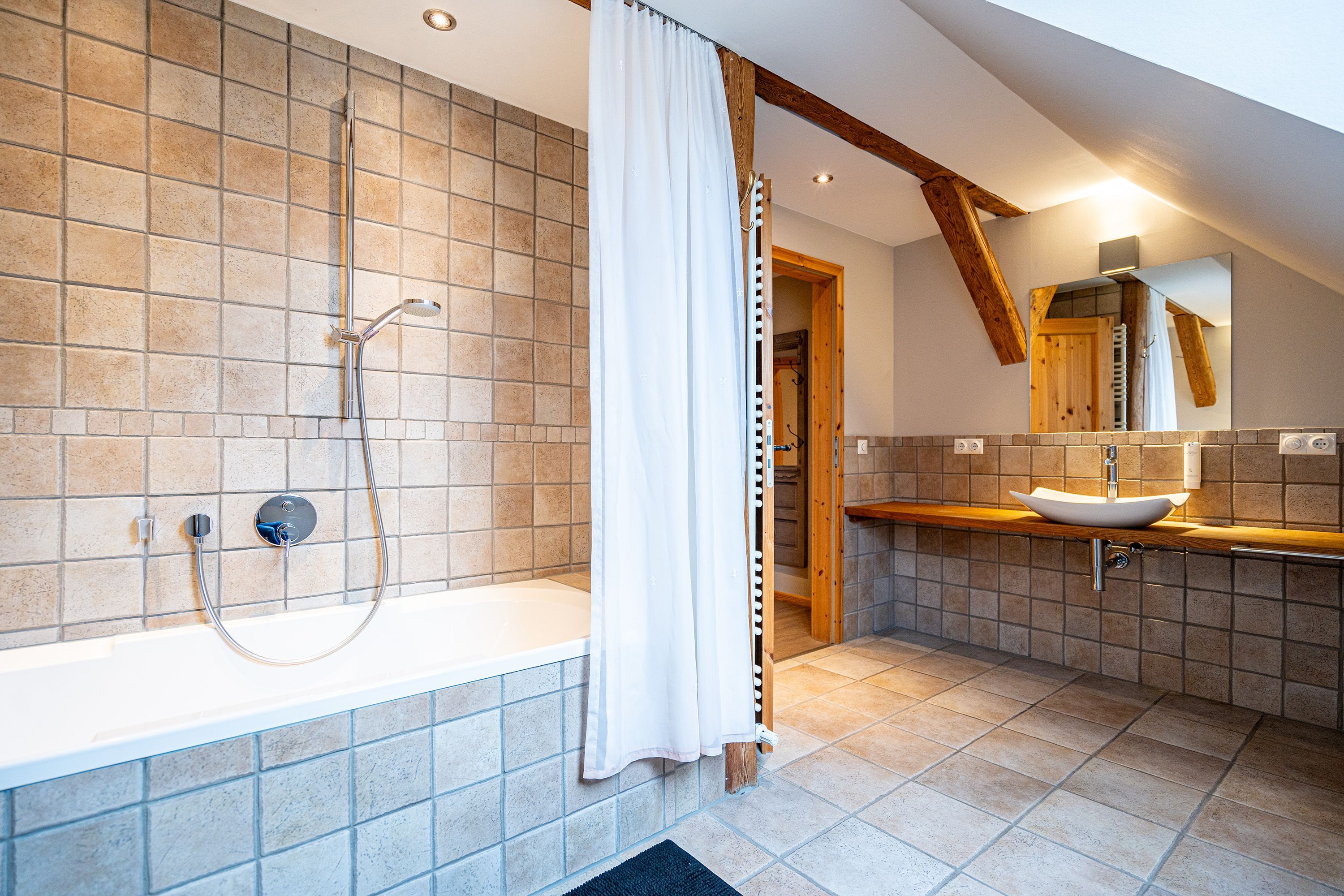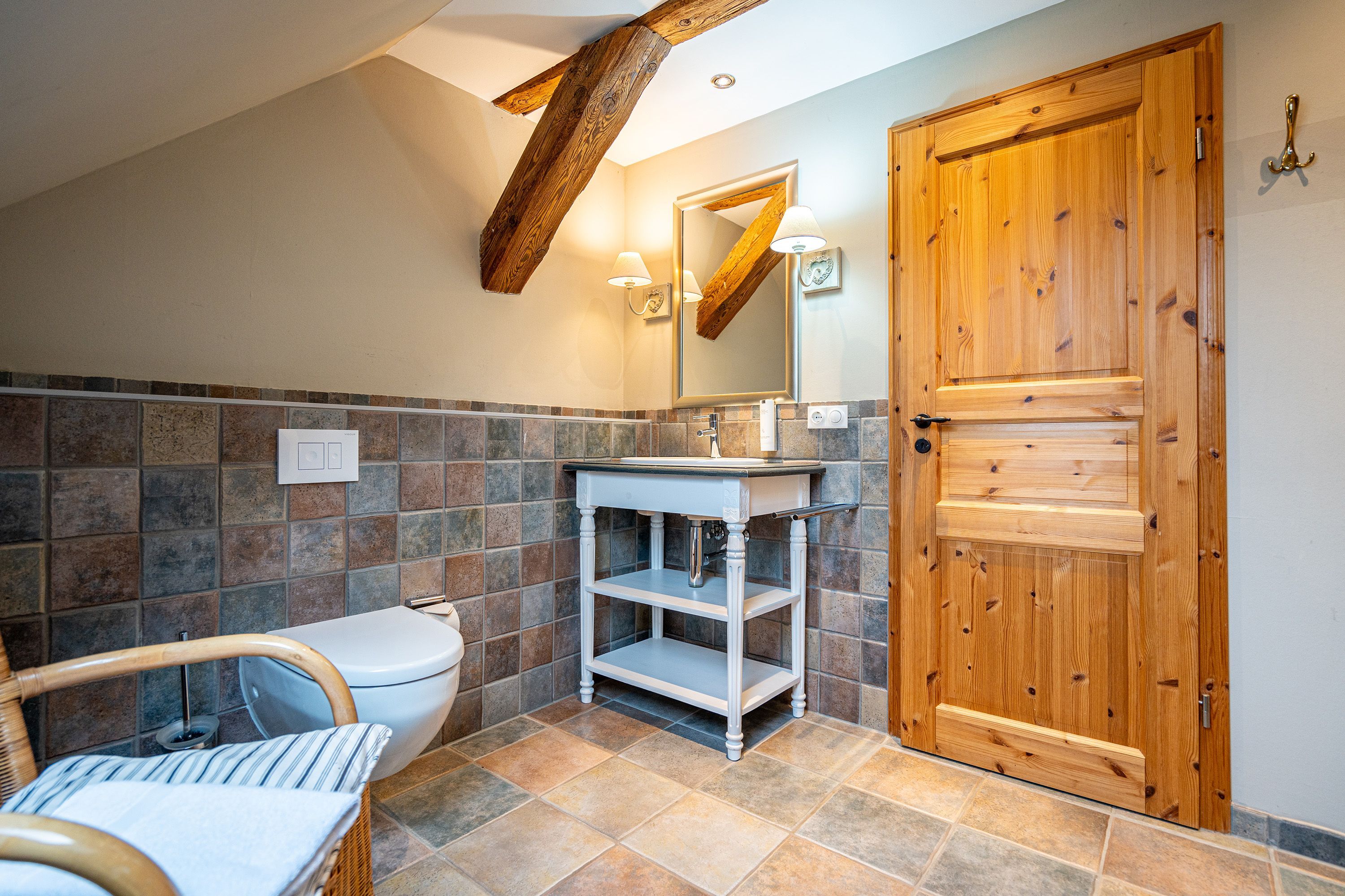 Im Erdgeschoss befinden sich auch zwei Schlafzimmer, eines mit einem großen Doppelboxspringbett (1,80 m x 2,00 m) und einem geräumigen Kleiderschrank, das andere ebenfalls mit einem Doppelboxspringbett (1,80 m x 2,00 m) und einem Zugang zum eigenen Bad mit Dusch-Badewanne, Waschtisch und WC. Ein weiteres Bad mit Dusche und WC befindet sich neben der Küche. Im ausgebauten Dachgeschoss gibt es zwei Schlafzimmer mit komfortablen Doppelbetten (1,80 m x 2,00 m) und jeweils einem eigenen Bad mit Duschbadewanne, Waschtisch und WC. Hier oben befinden sich außerdem zwei weitere Wohnbereiche mit Sofas und einer voll ausgestatteten offenen Küchenzeile (mit Backofen, Mikrowelle und Spülmaschine). Ein Wohnbereich führt zu einem kleinen Séparée mit zwei Einzelbetten (je 0,80 m x 2,20 m), während im zweiten Wohnbereich zusätzlich ein Daybed (als Aufbettung für eine weitere Person möglich) zu finden ist. Alle Betten sind allergikerfreundlich für einen gesunden Schlaf.?