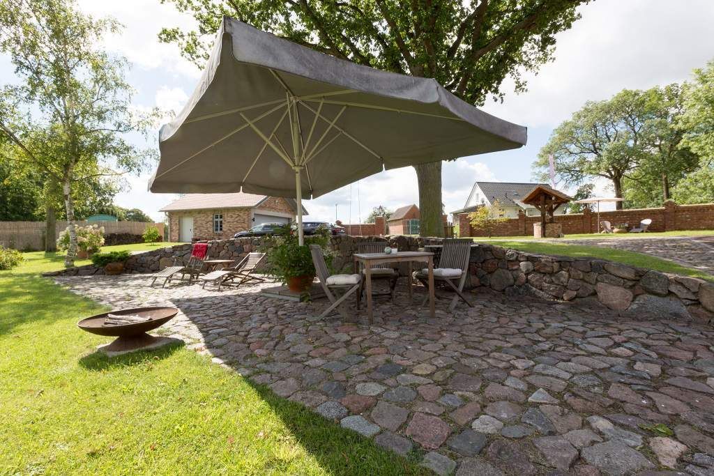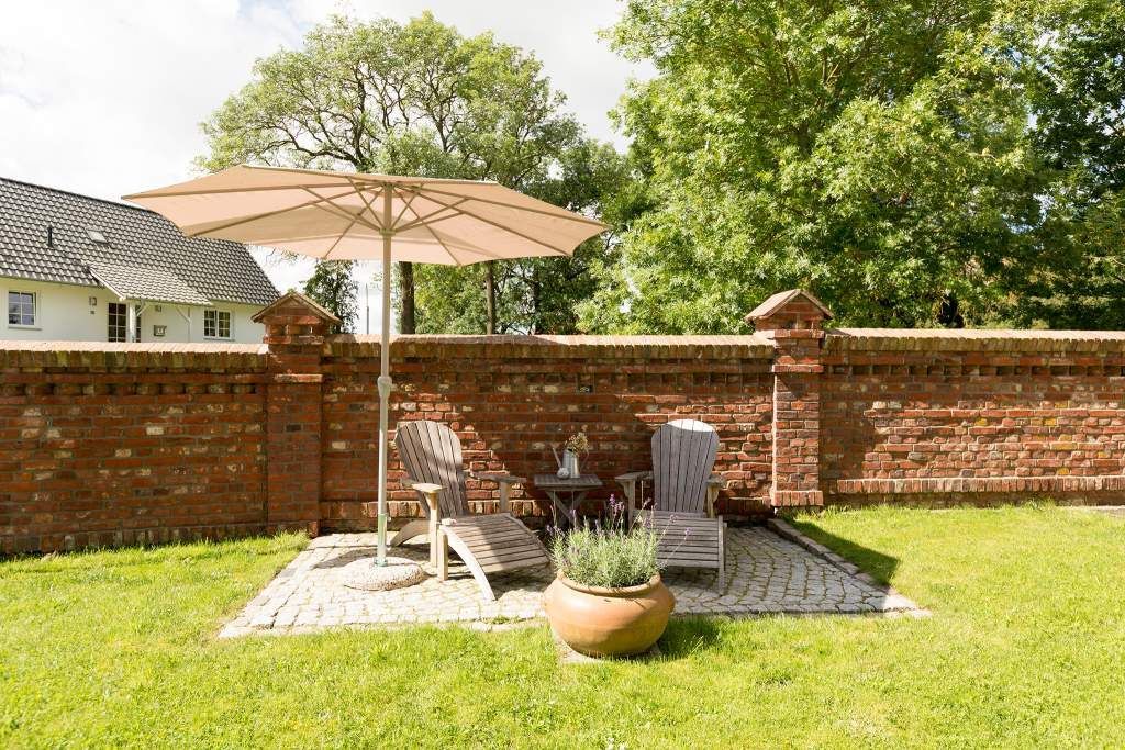 Hinter dem Haus erwartet Sie eine 45 Quadratmeter große Sonnenterrasse mit einem riesigen Sonnenschirm für Sonnenanbeter. Im gesamten Garten gibt es bequeme Liegen, um die nötige Portion Sonnenlicht zu tanken. Grillfreunde können ihren Appetit am Außengrill stillen.