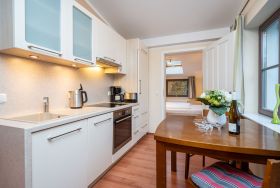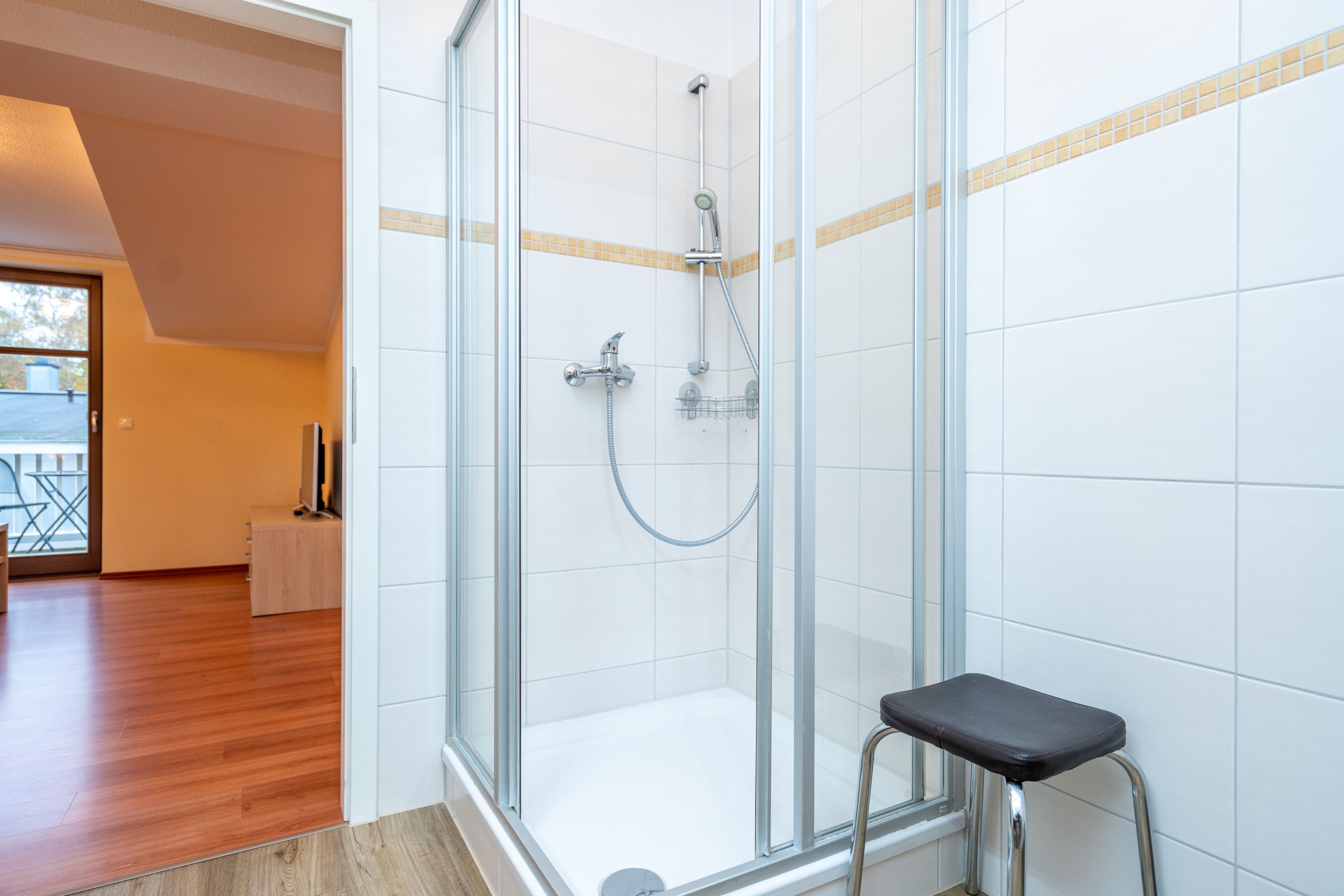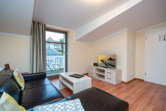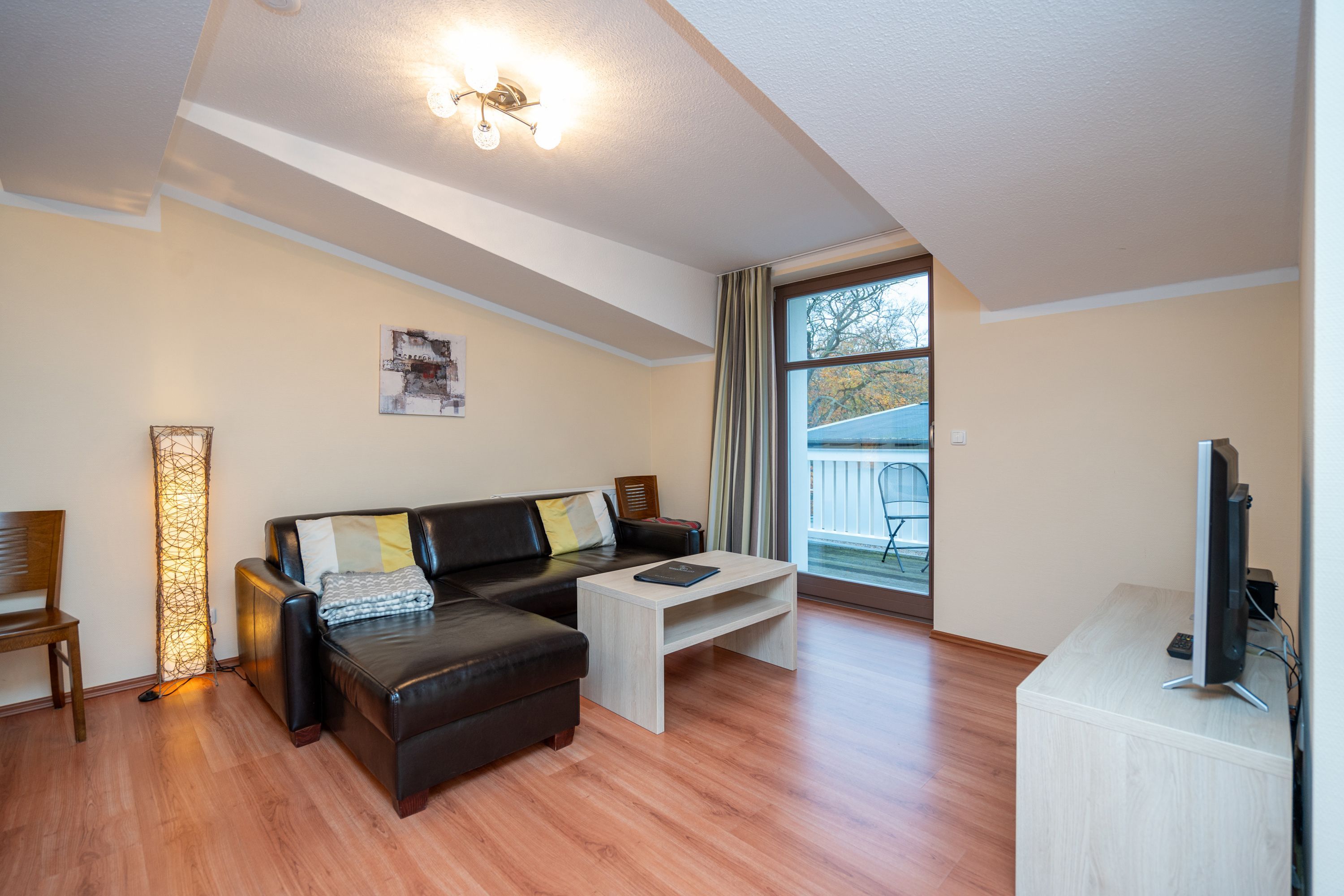 Klein, aber fein! Wohlfühlen von der ersten Minute an, das verspricht die Ferienwohnung 09 in der Villa Waldschloss für 2 Personen. Die helle, geschmackvolle Einrichtung wird Sie genauso begeistern, wie die Lage dieses Domizils. Es befindet sich im Dachgeschoss und ist nach Süden ausgerichtet, so dass Sie die Mittags- und Abendsonne auf Ihrem Balkon genießen können. An den Wohnbereich mit gemütlicher Sitzgruppe, schließt sich die offene, gut ausgestattete Küchenzeile mit Essplatz an. Nach einem erkundungsreichen Tag bietet das Schlafzimmer mit Doppelbett und großem Einbauschrank eine erholsame Nacht. Ihr Bad ist mit einer Dusche ausgestattet. Das WLAN-Netz im Haus kann kostenfrei genutzt werden.