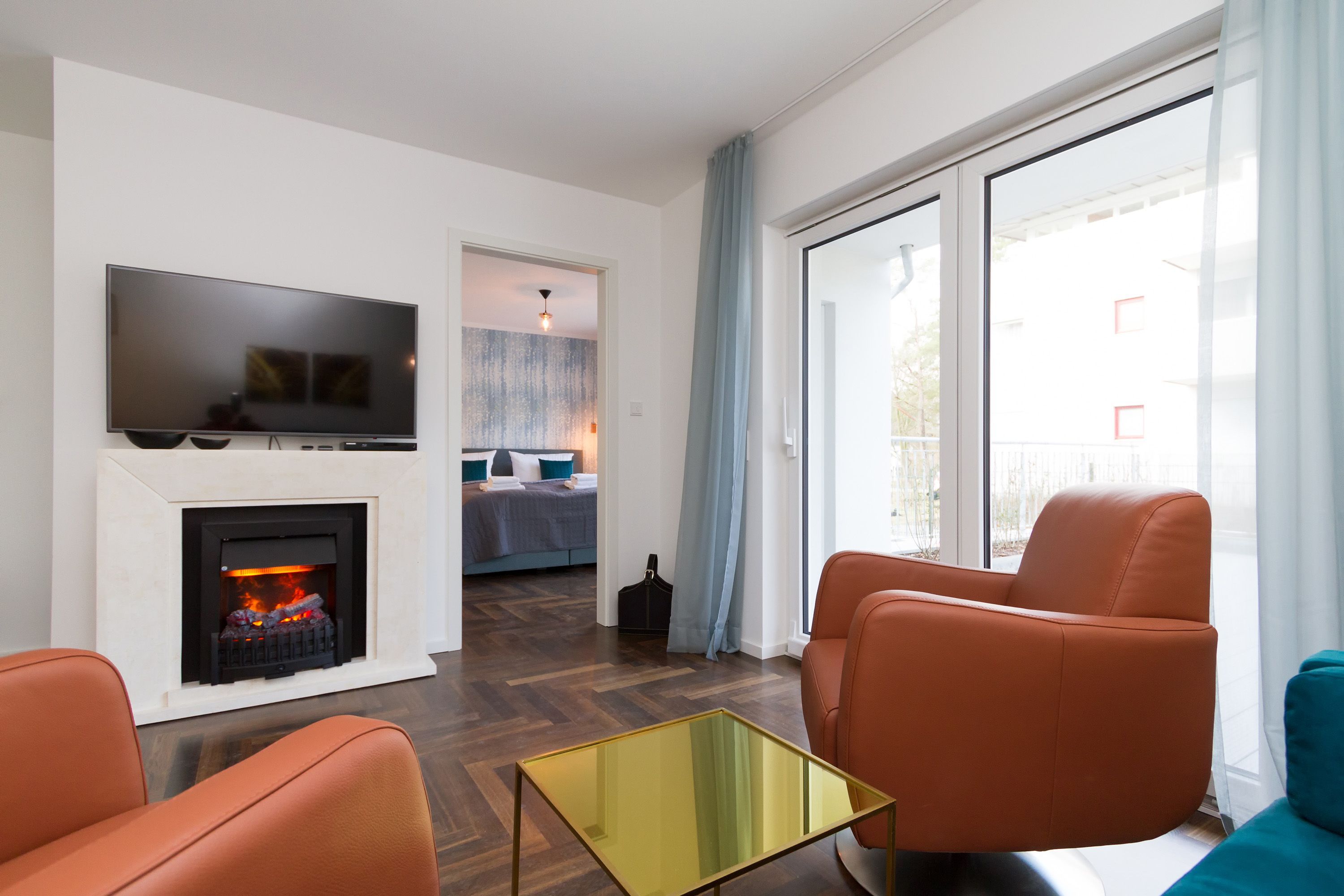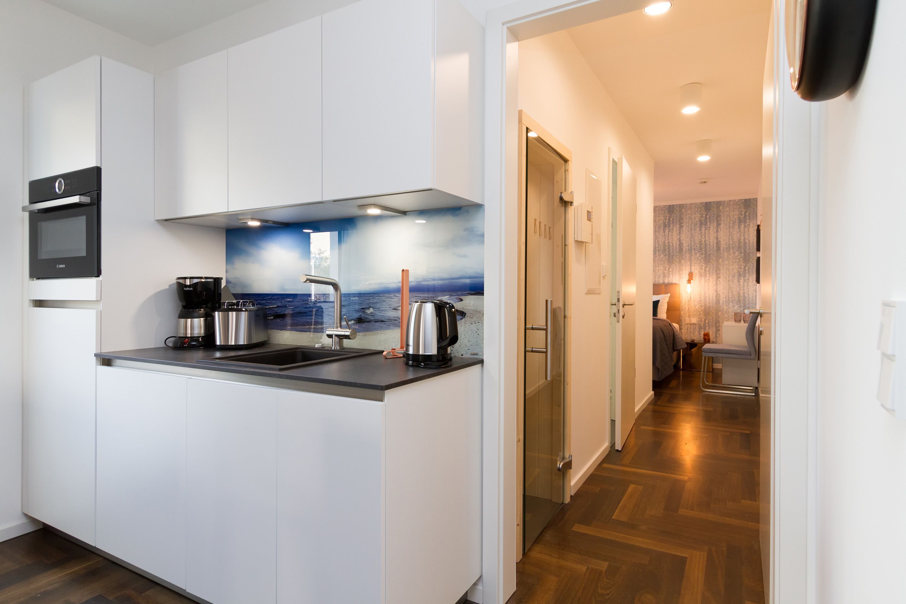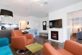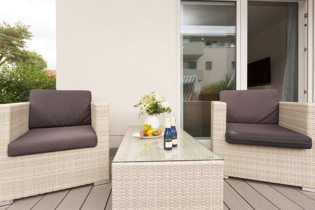 In der Ferienwohnung 01 (Erdgeschoss) erwartet Sie eine frische, moderne Urlaubswelt, die durch Hochwertigkeit, Stil und geschmackvolle Ausstattung überzeugt. Klare Linien - dennoch kuschelig, moderne Farben und cooler Style. Die von Innenarchitektenhand designte 3-Raum-Ferienwohnung (60 qm) ist für 2 bis 4 Personen (inklusive Kleinkind) ideal, um erholsame Tage auf Ihrer Lieblingsinsel zu verbringen. Schon nach dem Eintreten öffnet sich der Blick in den Wohnbereich mit gemütlicher Sitzgruppe, Flat-TV und modernem Elektrokamin, der per Knopfdruck Wohlfühlatmosphäre schafft. Der gut ausgestattete Küchenbereich mit schönem Essplatz schließt sich an. Das erste Schlafzimmer ist mit einem komfortablen Boxspringbett (1,80m x 2,00m), Einbauschrank und Flat-TV ausgestattet. Von hier hat man ebenfalls Zugang zur Terrasse und zum eigenen kleinen Duschbad mit WC. Das zweite Schlafzimmer verfügt über ein komfortables Boxspringbett (1,60m x 2,00m) und einen Flat-TV, auch hier steht ein eigenes Duschbad mit WC zur Verfügung. Klein aber fein, die wohnungseigene Sauna bietet nicht nur in der kalten Jahreszeit eine erholsame Abwechslung. Das Appartement punktet nicht nur innen, auch die großzügige Nord-West Terrasse (20qm) verspricht Usedomer Sonne, ausgestattet mit wertigen Gartenmöbeln und einem Strandkorb, lässt es sich hier wunderbar entspannen. Für Ihren Komfort sind die Betten bei der Anreise bezogen und Handtücher liegen bereit. Ein Pkw-Stellplatz steht in der Tiefgarage zur Verfügung (max. Einfahrtshöhe 1,93 m). Für den Tag am Meer steht Ihnen als besonderes Bonbon von Mitte Mai bis Ende September (je nach Witterung) ein Strandkorb am Strand kostenlos zur Verfügung.