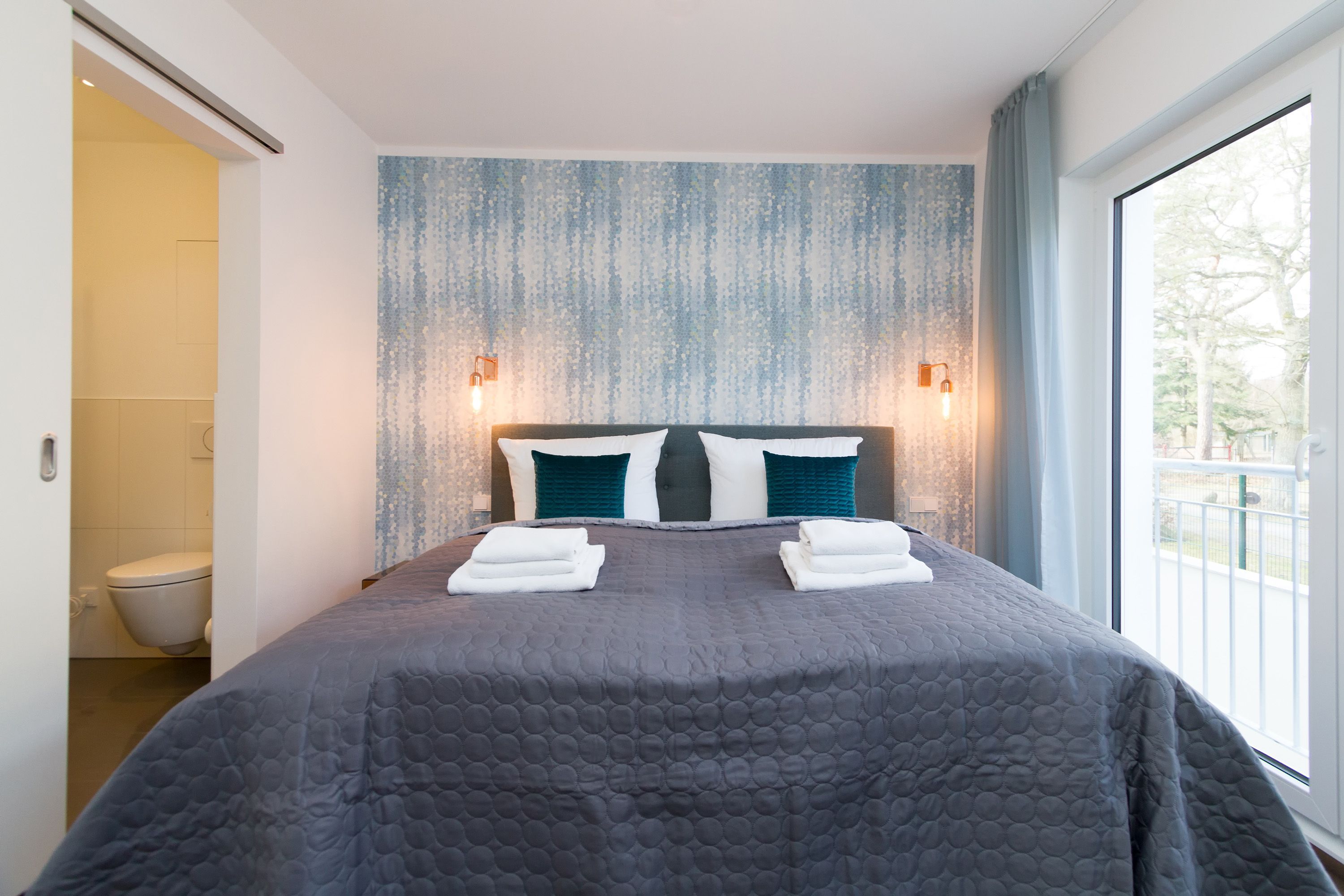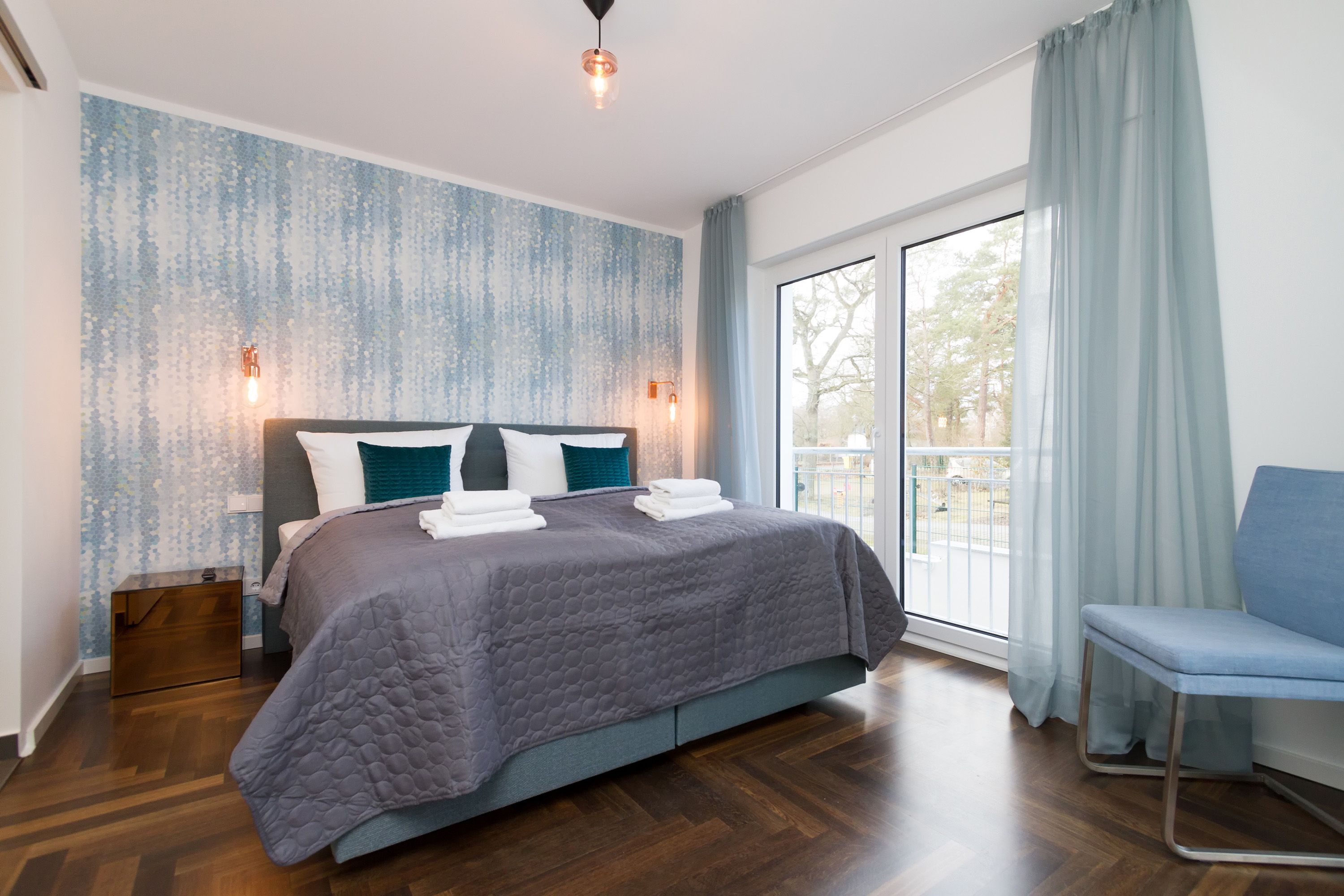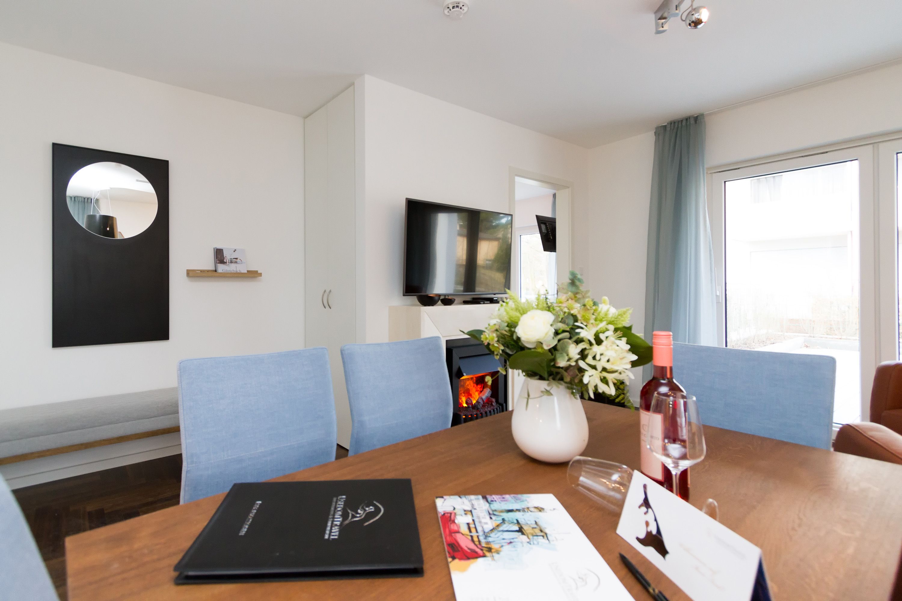 In der Ferienwohnung 01 (Erdgeschoss) erwartet Sie eine frische, moderne Urlaubswelt, die durch Hochwertigkeit, Stil und geschmackvolle Ausstattung überzeugt. Klare Linien - dennoch kuschelig, moderne Farben und cooler Style. Die von Innenarchitektenhand designte 3-Raum-Ferienwohnung (60 qm) ist für 2 bis 4 Personen (inklusive Kleinkind) ideal, um erholsame Tage auf Ihrer Lieblingsinsel zu verbringen. Schon nach dem Eintreten öffnet sich der Blick in den Wohnbereich mit gemütlicher Sitzgruppe, Flat-TV und modernem Elektrokamin, der per Knopfdruck Wohlfühlatmosphäre schafft. Der gut ausgestattete Küchenbereich mit schönem Essplatz schließt sich an. Das erste Schlafzimmer ist mit einem komfortablen Boxspringbett (1,80m x 2,00m), Einbauschrank und Flat-TV ausgestattet. Von hier hat man ebenfalls Zugang zur Terrasse und zum eigenen kleinen Duschbad mit WC. Das zweite Schlafzimmer verfügt über ein komfortables Boxspringbett (1,60m x 2,00m) und einen Flat-TV, auch hier steht ein eigenes Duschbad mit WC zur Verfügung. Klein aber fein, die wohnungseigene Sauna bietet nicht nur in der kalten Jahreszeit eine erholsame Abwechslung. Das Appartement punktet nicht nur innen, auch die großzügige Nord-West Terrasse (20qm) verspricht Usedomer Sonne, ausgestattet mit wertigen Gartenmöbeln und einem Strandkorb, lässt es sich hier wunderbar entspannen. Für Ihren Komfort sind die Betten bei der Anreise bezogen und Handtücher liegen bereit. Ein Pkw-Stellplatz steht in der Tiefgarage zur Verfügung (max. Einfahrtshöhe 1,93 m). Für den Tag am Meer steht Ihnen als besonderes Bonbon von Mitte Mai bis Ende September (je nach Witterung) ein Strandkorb am Strand kostenlos zur Verfügung.