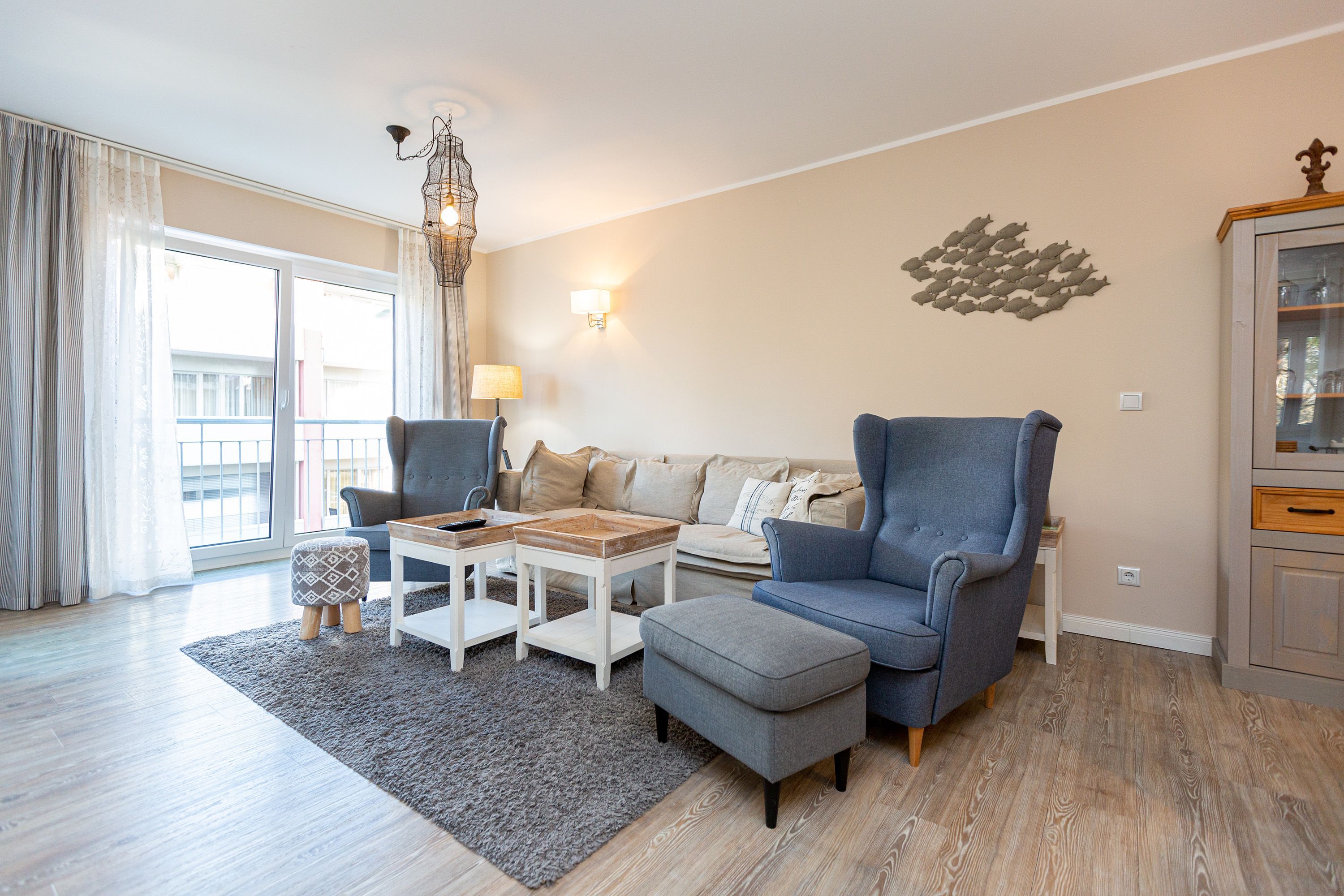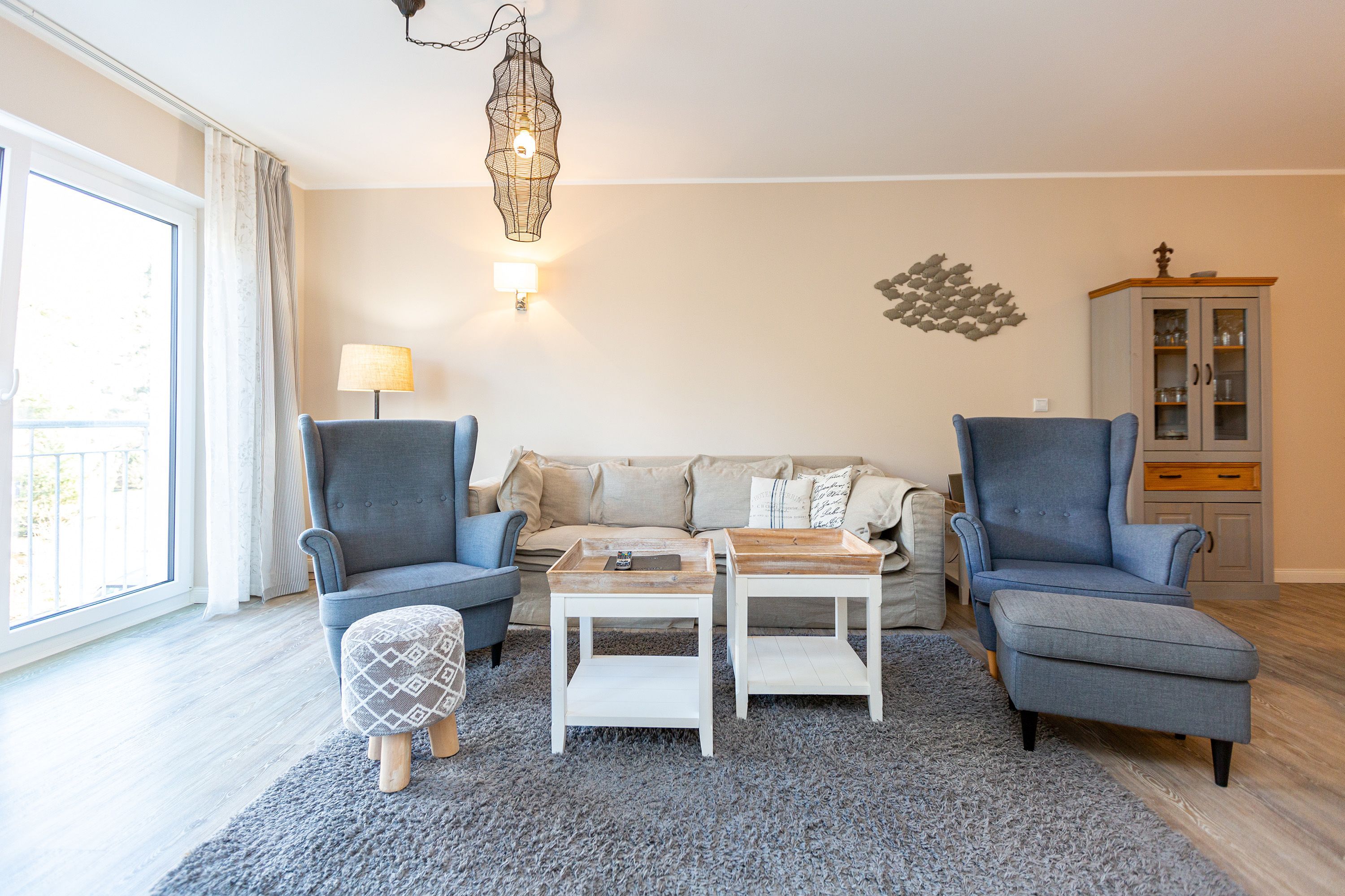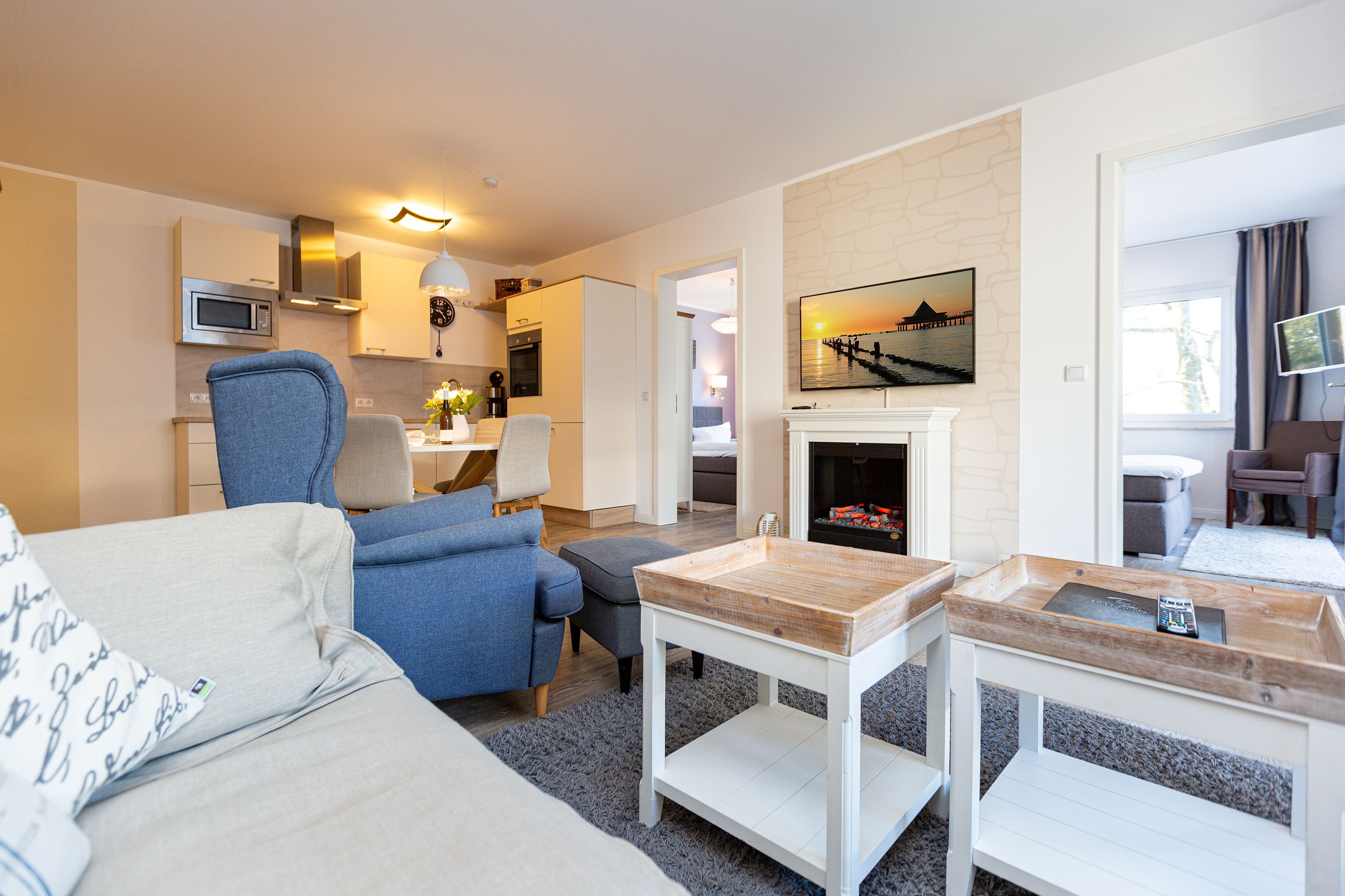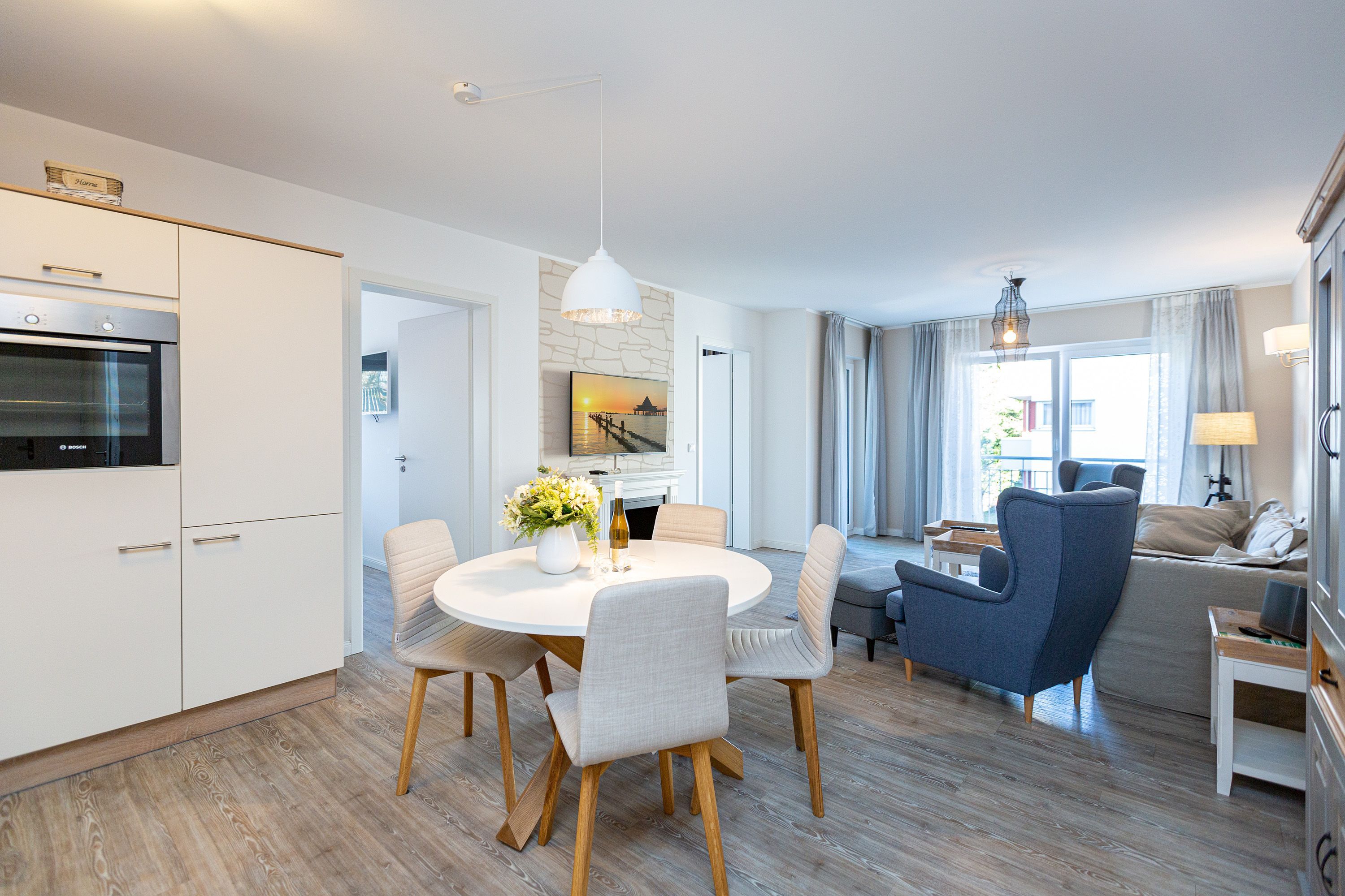 Erholen Sie sich in dieser, im Landhausstil gestalteten, 3-Raum-Ferienwohnung (67 qm) für 2 bis 4 Personen und ein Kleinkind (bis 2 Jahre im Kinderreisebett). Der Eingangsbereich mit Flurgarderobe geht über in die offene, komplett ausgestattete Küche mit rundem, schönen Essplatz. Hier schließt sich der gemütliche Wohnbereich an. Die bequeme Couch und der Flat-TV sind für entspannte TV-Abende bestens geeignet. Ein moderner Elektrokamin sorgt per Knopfdruck für eine kuschlige Wohlfühlatmosphäre. Zwei Schlafzimmer mit bequemen Doppelboxspringbetten (1,80m x 2,00m), Flat-TV (1x mit integriertem DVD-Player) und jeweils geräumigen Schrank sorgen für erholsamen Schlaf. Auf dem Süd-Westbalkon (Zugang vom Wohnbereich und aus einem Schlafzimmer) genießen Sie in den Nachmittags- und Abendstunden die Usedomer Sonne. Ein großes Duschbad mit WC ergänzt das Domizil. Für Ihren Komfort sind die Betten bei der Anreise bezogen und Handtücher liegen bereit. Das WLAN-Netz im Haus kann kostenfrei genutzt werden. Ein PKW-Stellplatz steht in der in der Tiefgarage (max. Einfahrtshöhe 1,93 m) zur Verfügung.