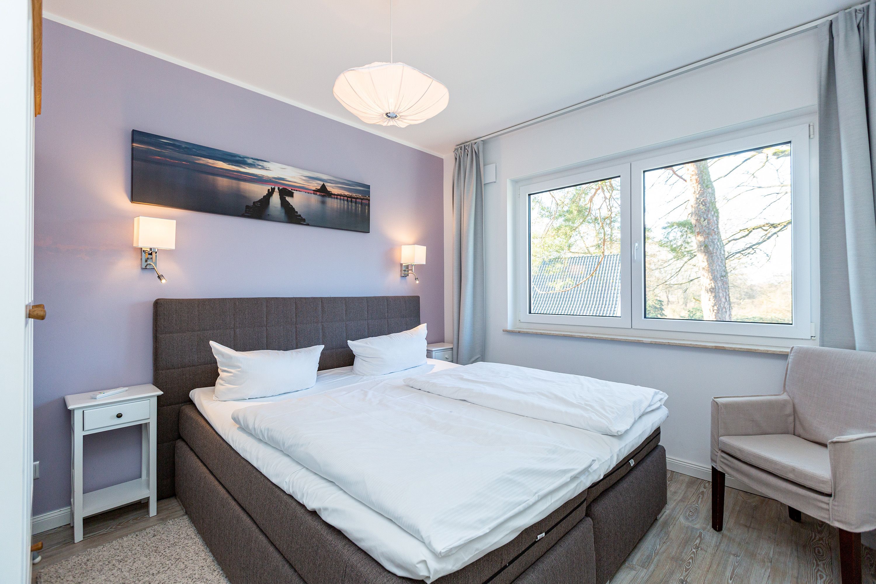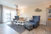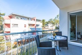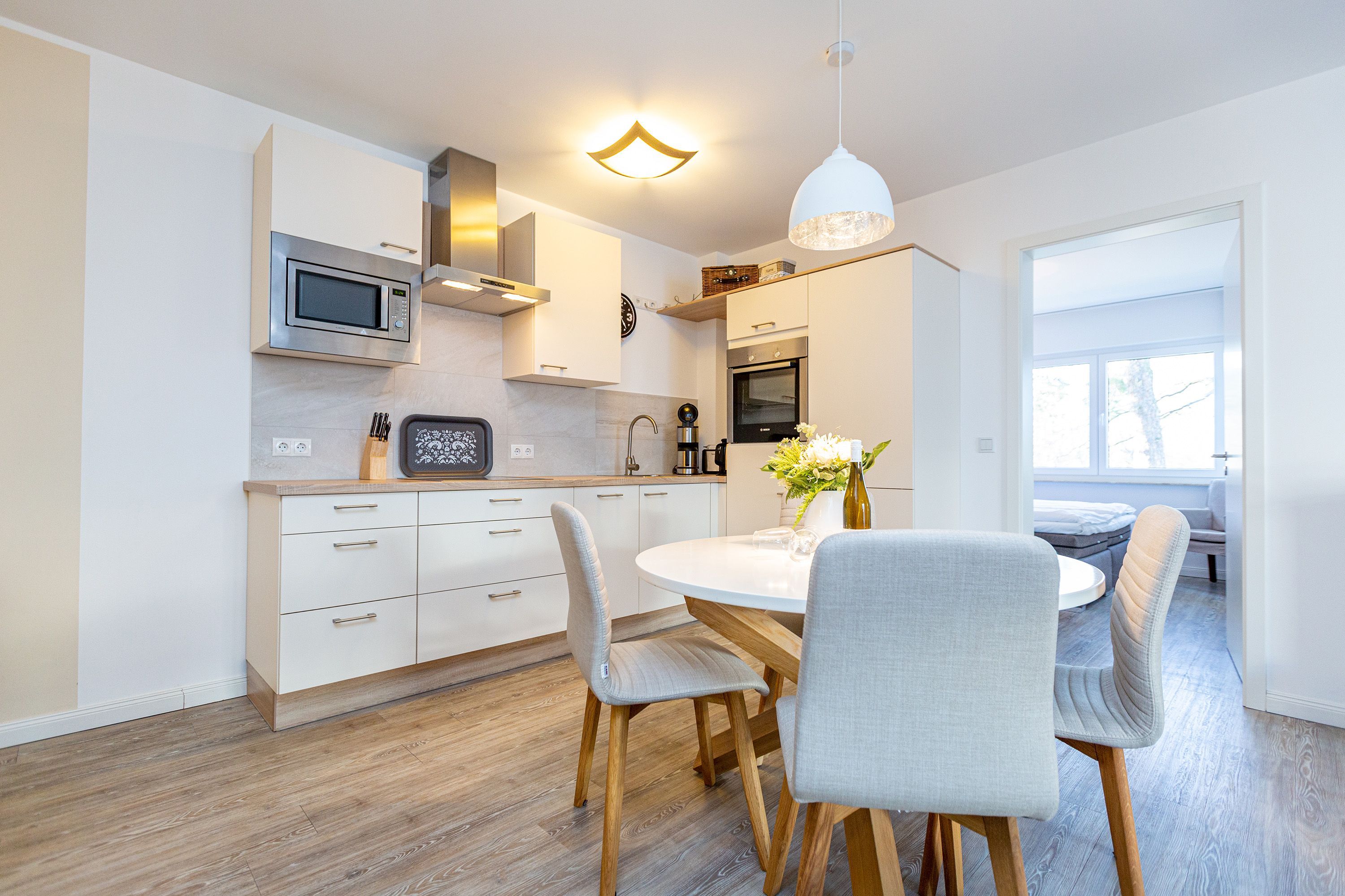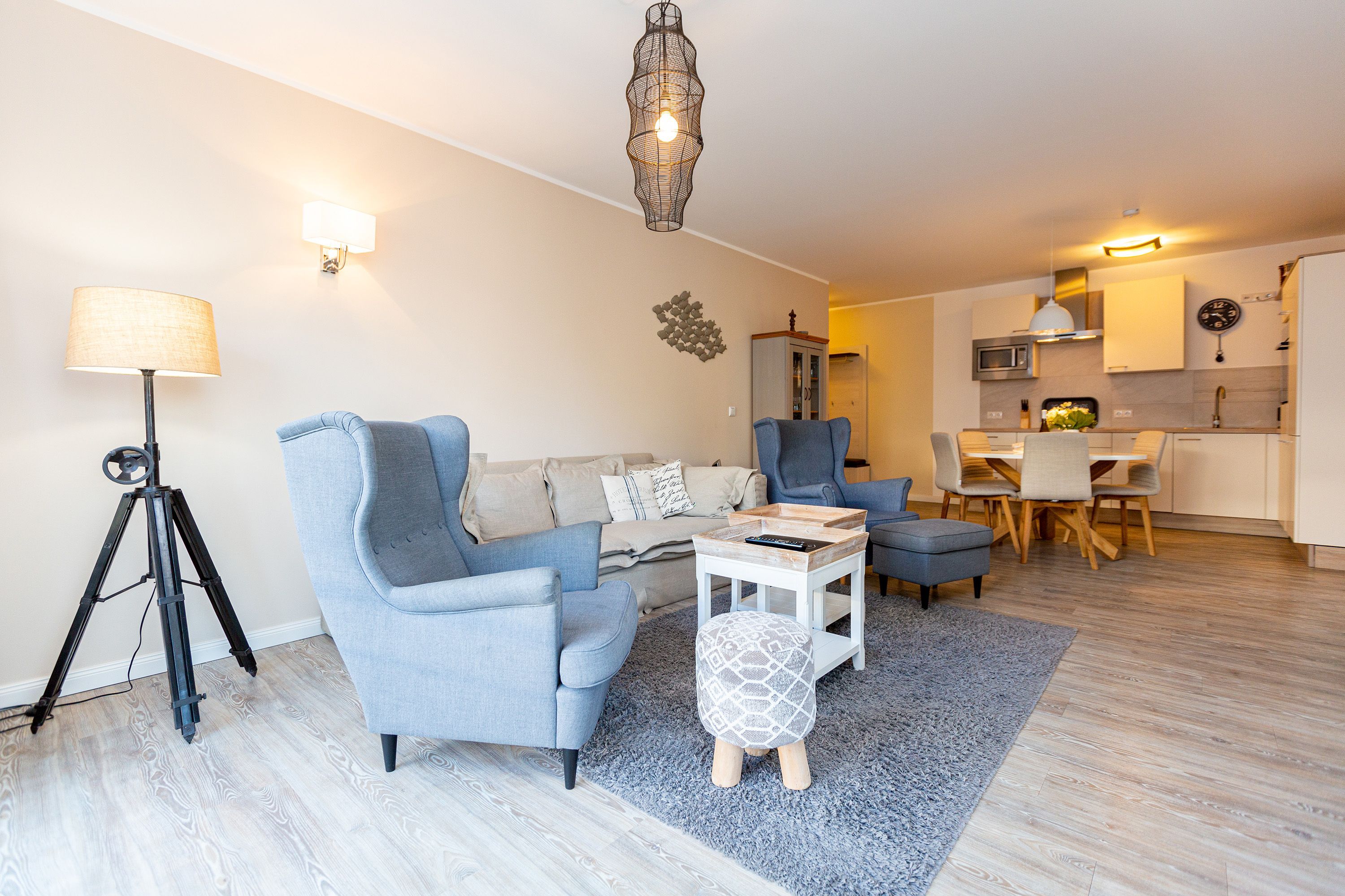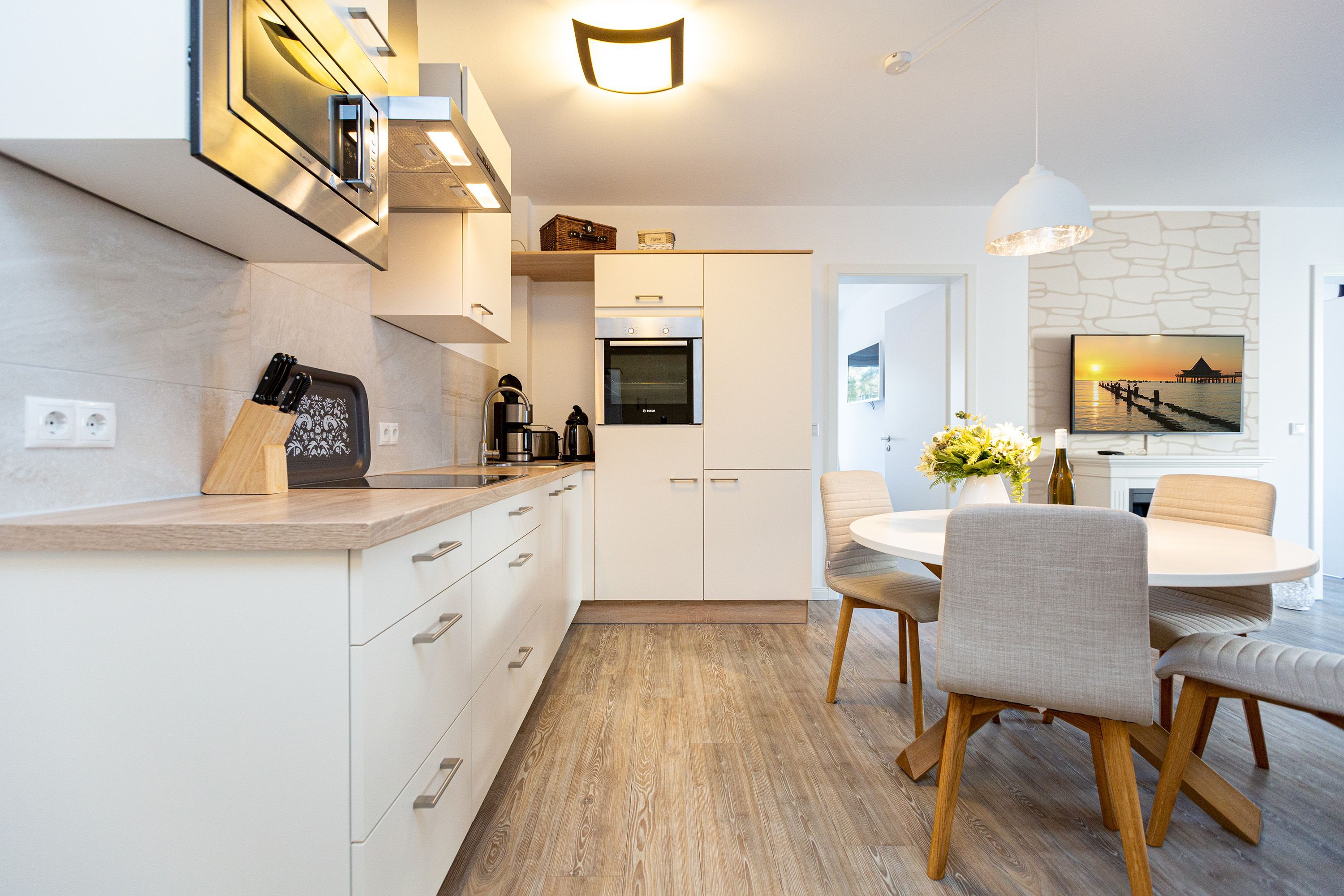 Erholen Sie sich in dieser, im Landhausstil gestalteten, 3-Raum-Ferienwohnung (67 qm) für 2 bis 4 Personen und ein Kleinkind (bis 2 Jahre im Kinderreisebett). Der Eingangsbereich mit Flurgarderobe geht über in die offene, komplett ausgestattete Küche mit rundem, schönen Essplatz. Hier schließt sich der gemütliche Wohnbereich an. Die bequeme Couch und der Flat-TV sind für entspannte TV-Abende bestens geeignet. Ein moderner Elektrokamin sorgt per Knopfdruck für eine kuschlige Wohlfühlatmosphäre. Zwei Schlafzimmer mit bequemen Doppelboxspringbetten (1,80m x 2,00m), Flat-TV (1x mit integriertem DVD-Player) und jeweils geräumigen Schrank sorgen für erholsamen Schlaf. Auf dem Süd-Westbalkon (Zugang vom Wohnbereich und aus einem Schlafzimmer) genießen Sie in den Nachmittags- und Abendstunden die Usedomer Sonne. Ein großes Duschbad mit WC ergänzt das Domizil. Für Ihren Komfort sind die Betten bei der Anreise bezogen und Handtücher liegen bereit. Das WLAN-Netz im Haus kann kostenfrei genutzt werden. Ein PKW-Stellplatz steht in der in der Tiefgarage (max. Einfahrtshöhe 1,93 m) zur Verfügung.