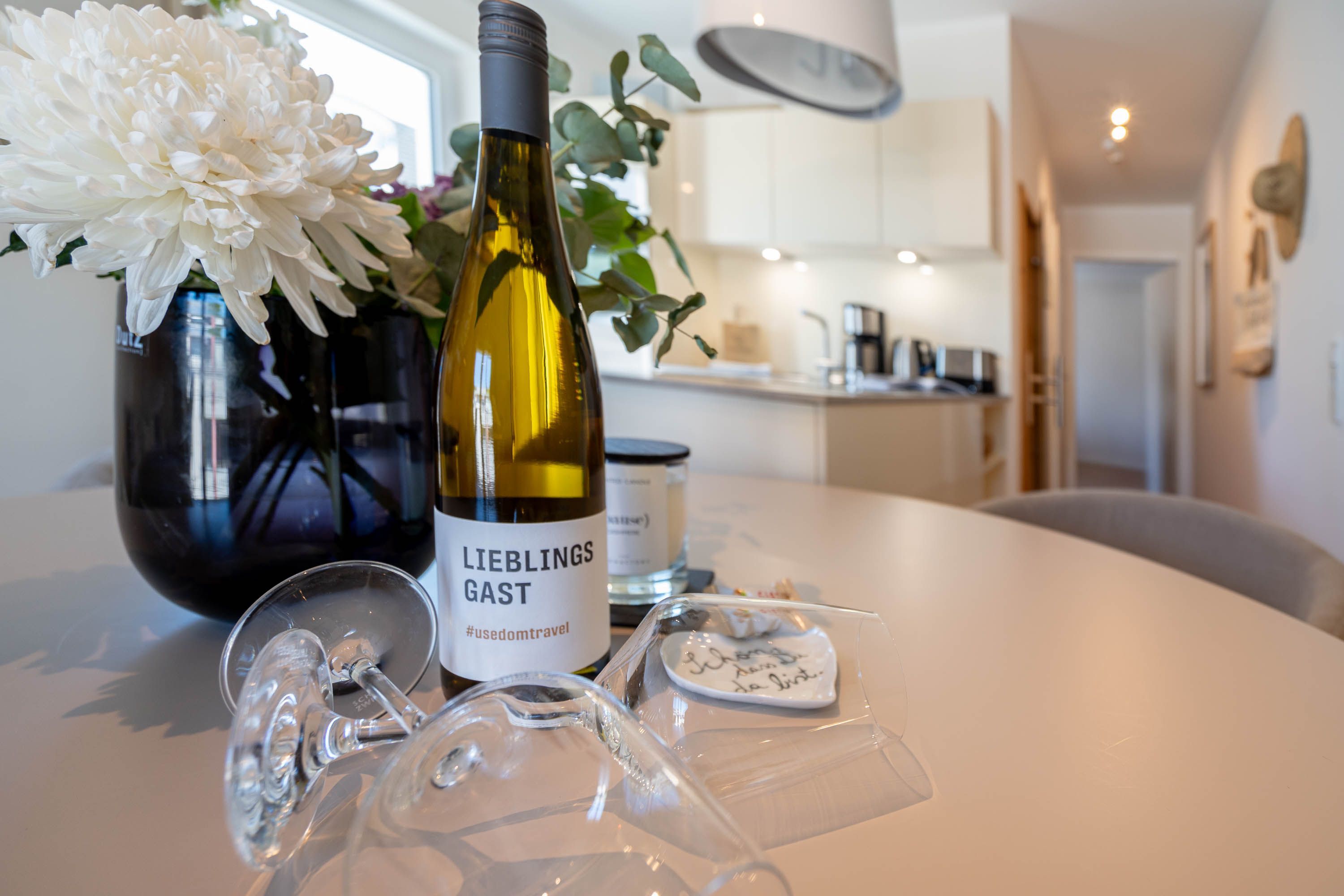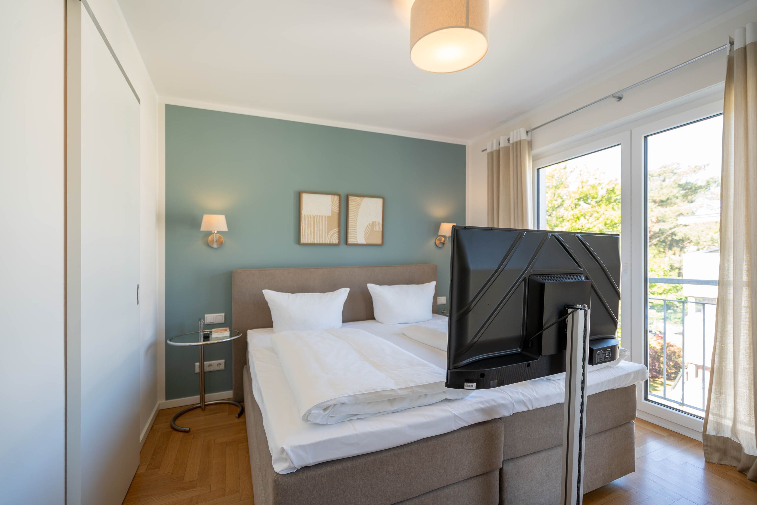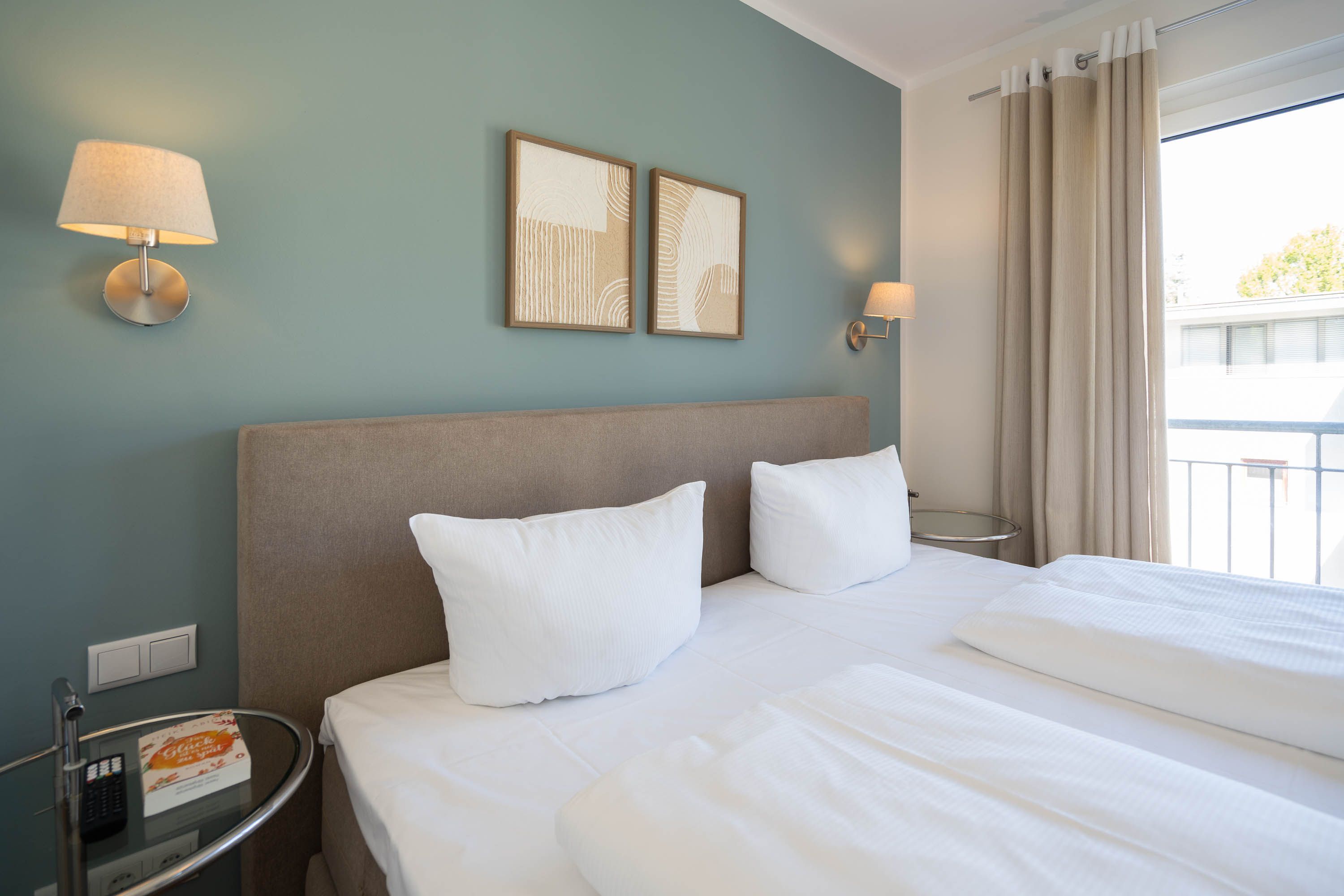 Ein kuscheliges Hideaway in einem modernen, komfortablen Neubau erwartet Sie im Appartement 13. Helle, luftige Farben, ausgesuchte Materialien und ein funktionaler Grundriss sorgen für eine entspannte, von Innenarchitektenhand designte Urlaubsstimmung. Eine ideale 3-Raum-Ferienwohnung (62 qm im 2. Obergeschoss) für 2 bis 4 Personen. Schon beim Eintreten offeriert sich Ihnen der gemütliche Wohnbereich mit bequemer Sitzgruppe, Flat-TV und einem per Knopfdruck zu bedienenden Elektrokamin der neuesten Generation. Vom Wohnbereich hat man Zugang zum schönen Westbalkon, der mit Gartenmöbel ausgestattet ist. Die, im Wohnbereich integrierte Küchenzeile ist ein kleines Raumwunder und hält alles parat, was Sie zum Kochen benötigen. Der angrenzende Esstisch bietet Platz für gemütliches Beisammensein. Klein aber fein, die wohnungseigene Sauna bietet nicht nur in der kalten Jahreszeit eine erholsame Abwechslung. Das erste Schlafzimmer ist mit einem komfortablen Boxspringbett (1,80m x 2,00m), Einbauschrank und Flat-TV ausgestattet, von hier hat man ebenfalls Zugang zum Balkon und zum eigenen kleinen Duschbad mit WC. Das zweite Schlafzimmer verfügt über ein komfortables Boxspringbett (1,60m x 2,00m) und einen Flat-TV, auch hier steht ein eigenes Duschbad mit WC zur Verfügung. Für das Urlaubsgepäck kann hier der Einbauschrank im Flur genutzt werden. Für Ihren Komfort sind die Betten bei der Anreise bezogen und Handtücher liegen bereit. Ein Pkw-Stellplatz steht in der Tiefgarage (max. Einfahrtshöhe 1,93 m) zur Verfügung.