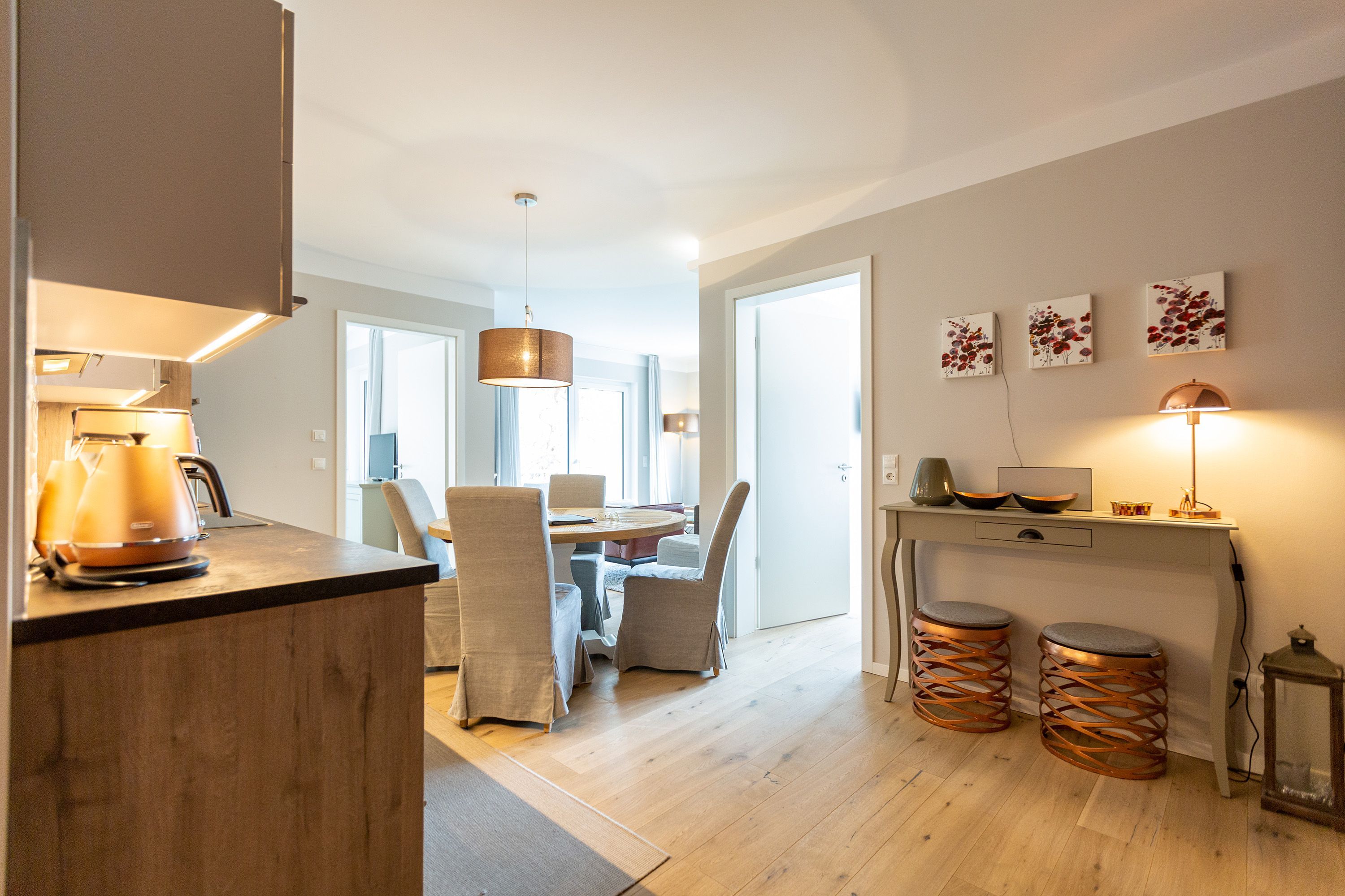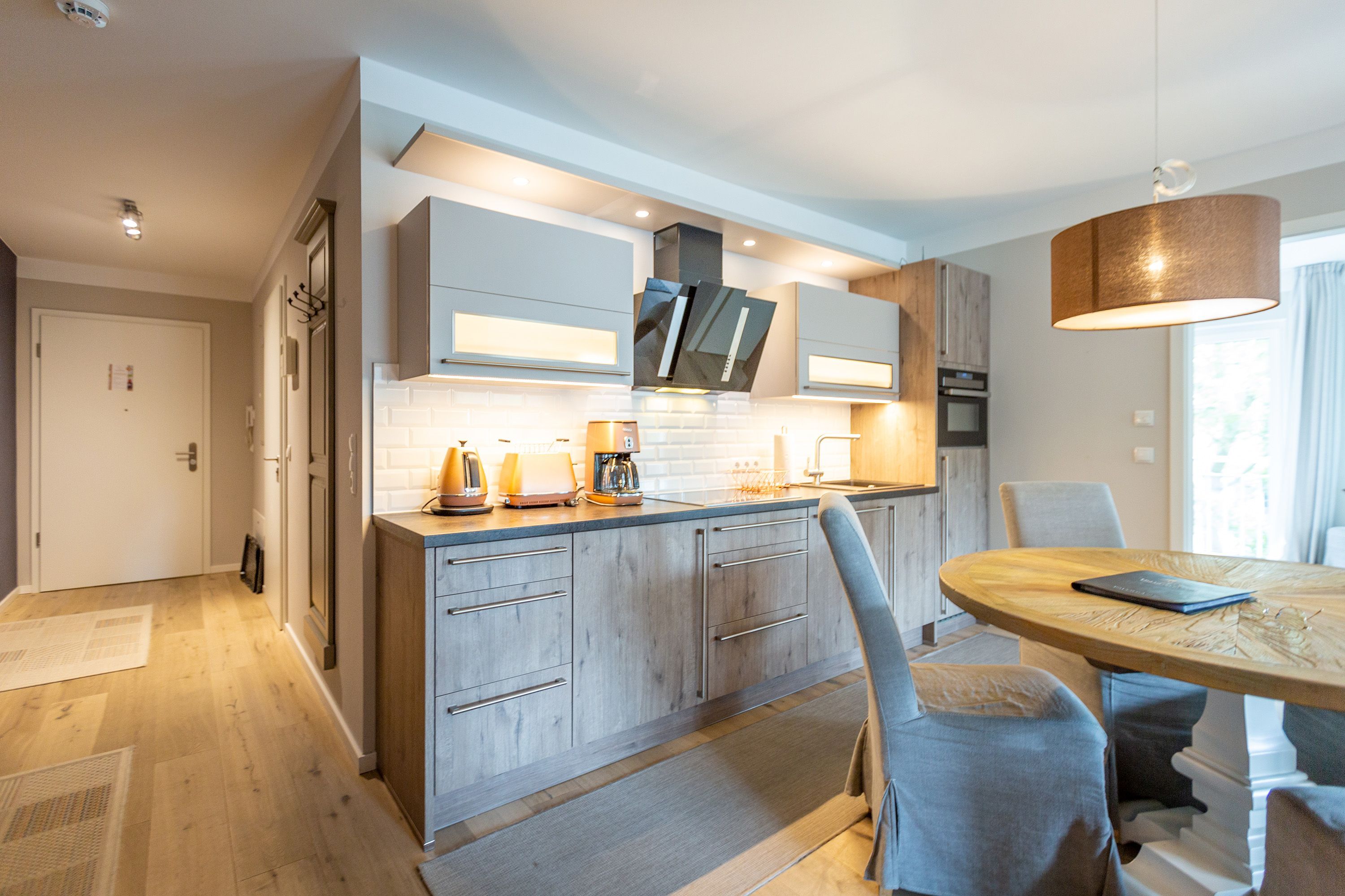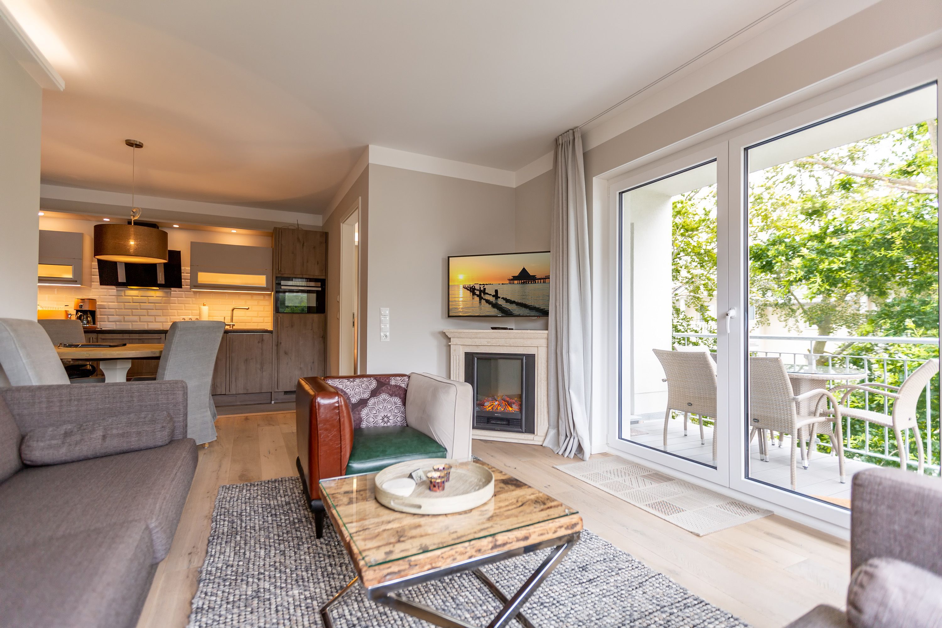 Sie lieben das Besondere? Sie schätzen Design und Geschmack? Willkommen im Appartement 17! Freuen Sie sich auf ein von Innenarchitektenhand designtes Wohnkonzept, dass überzeugt und begeistert. Geschmackvolles Design, wertige Stoffe und abgestimmte Farben sorgen für Hochwertigkeit, Stil und Behaglichkeit. Ein ideales Urlaubziel für bis zu 4 Personen. Schon beim Eintreten empfängt Sie der große, stylische Eingangsbereich. Zentrales Herz der Wohnung ist die moderne, komplett ausgestattete Küche (u.a. mit Kapselmaschine von Bosch für Tassimo Kapseln) mit tollem Essplatz, der nicht nur perfekt zum Dinieren, sondern auch ideal als lebendige Kommunikationsinsel dient. Der helle, lichtdurchflutete Wohnbereich ist loungig, cool und gemütlich zugleich. Auf Ihrer stylischen Sofainsel lässt es sich herrlich lümmeln und relaxen. Ein moderner Elektrokamin (mit Heizmöglichkeit) schafft per Knopfdruck eine kuschlige Wohlfühlatmosphäre. Auch die weitere technische Ausstattung des Appartements ist ebenfalls sehr überzeugend: insgesamt 3 Flat-TV's (Wohnzimmer sowie jedes Schlafzimmer) sowie Mini-Hifianlage mit iPod-Dock verstehen sich von selbst. Beide, sehr geschmackvoll gestaltete Schlafzimmer empfangen Sie mit komfortablen Doppelboxspringbetten (1,80m x 2,00m) und sorgen für entspannte Nächte, von einem haben Sie einen seitlichen Blick zur Ostsee. Die Betten sind bei Anreise bezogen und Handtücher liegen bereit (Erstausstattung). Das schicke Wellnessbad bietet neben der großen Dusche eine moderne Sauna, ein besonderes Highlight nicht nur in der Nebensaison. Der Südbalkon, selbstverständlich mit wertigen Gartenmöbel ausgestattet, bietet schöne Ausblicke auf die Umgebung der Maxim-Gorki-Straße. Auch die Ostsee schimmert durch die Kiefern der Dünen. Sie haben Ihr perfektes Design-Domizil ganz nahe am Meer gefunden! Ein PKW-Stellplatz steht in der Tiefgarage zur Verfügung (max. Einfahrtshöhe 1,93 m). Das WLAN-Netz ist kostenfrei nutzbar. Ihre Fahrräder können Sie gern im wohnungseigenen Kellerraum abstellen.