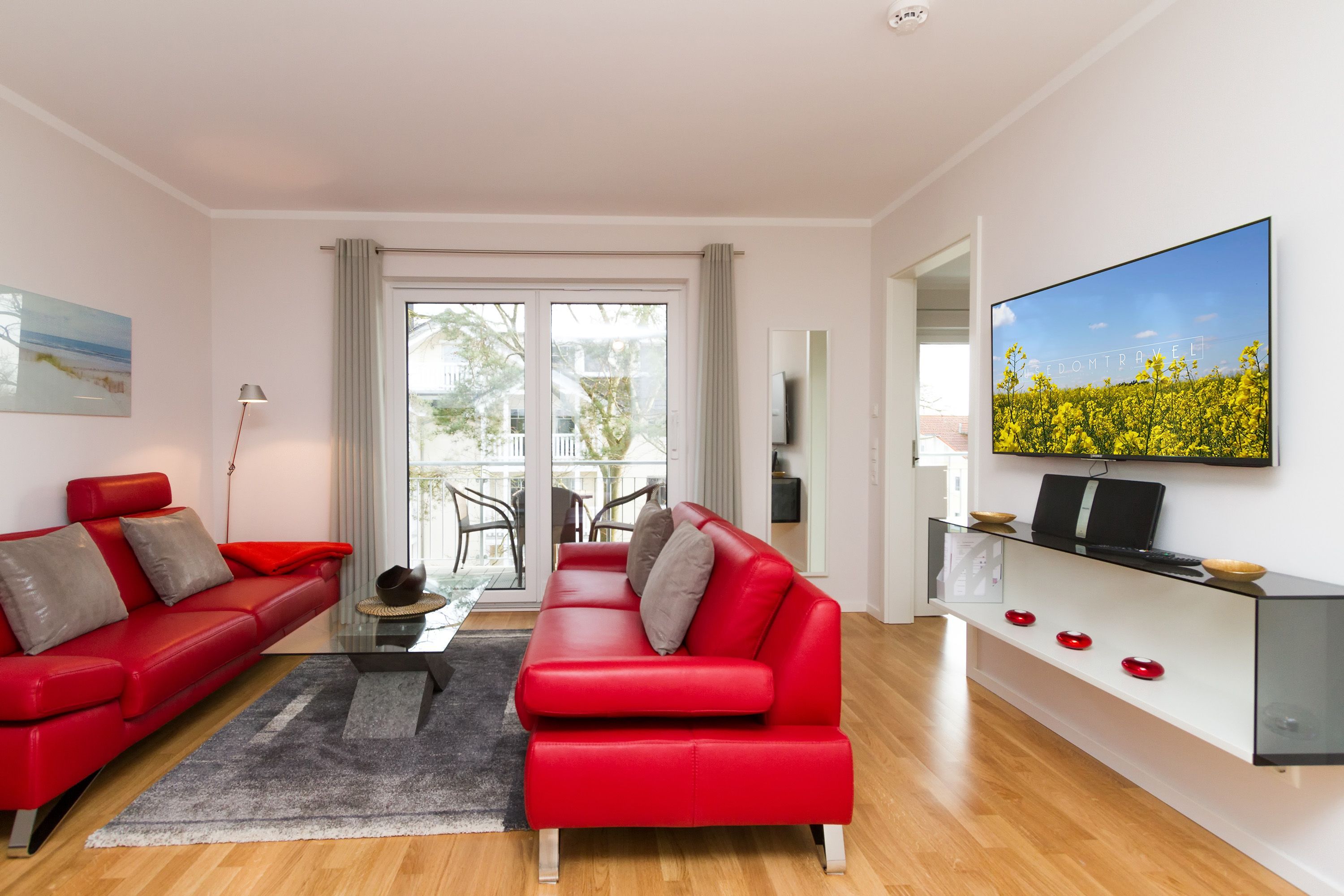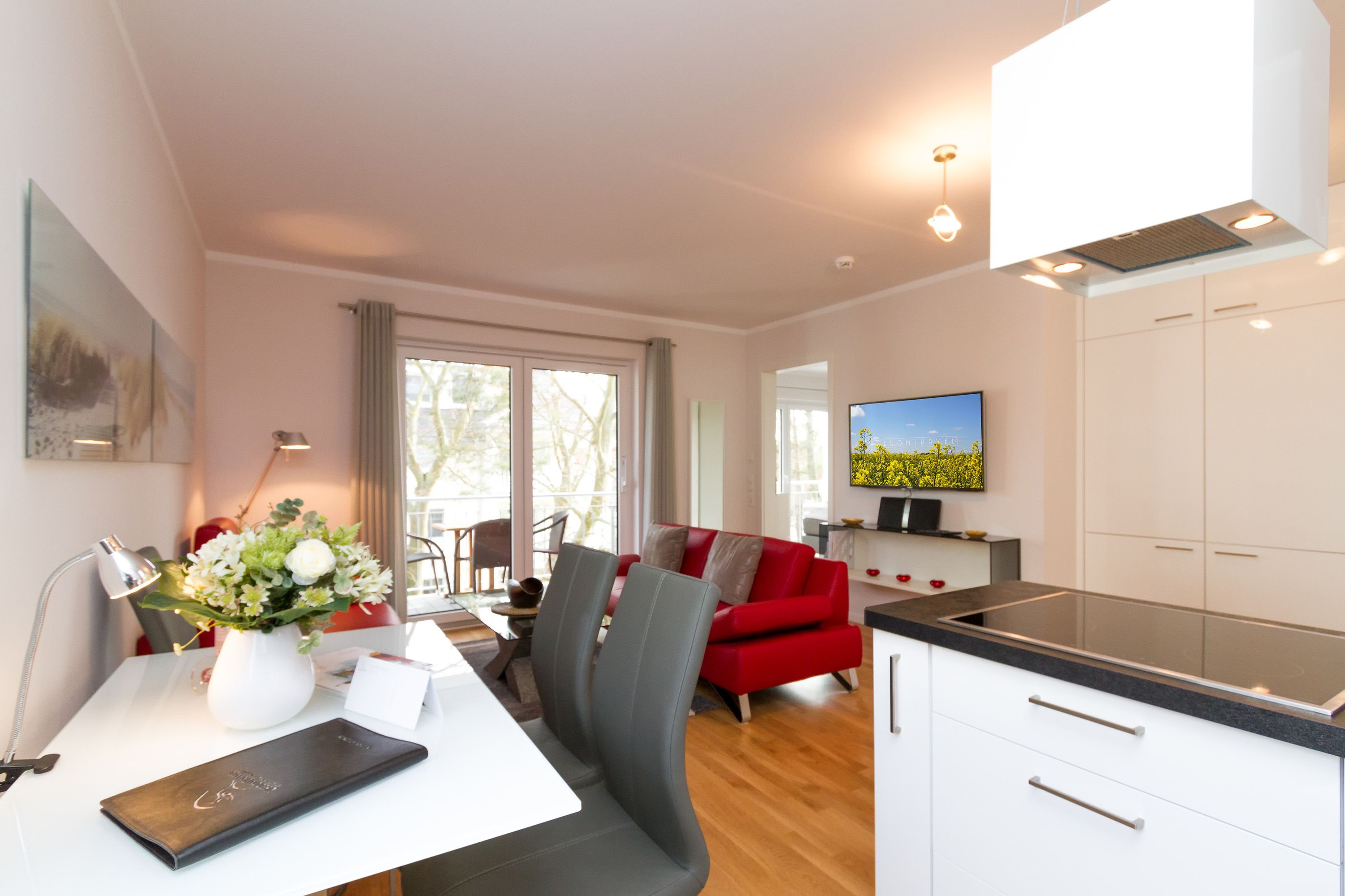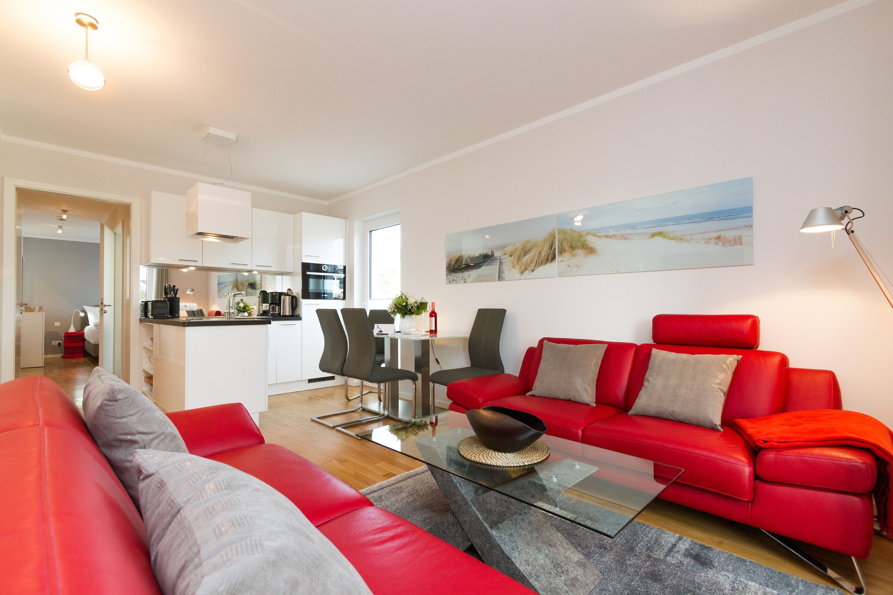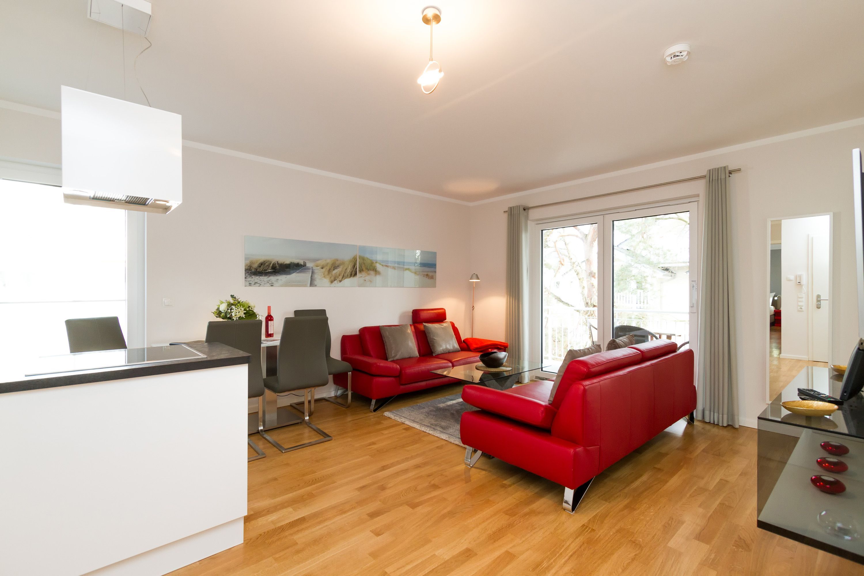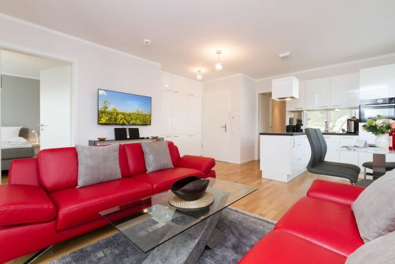 Klare Linie und kräftige Farben, ausgesuchte Materialien und ein modernes Design überzeugen im Appartement 18. Eintreten und Wohlfühlen ist hier die Devise, denn der Wohlfühlfaktor kommt hier nicht zu kurz! Die 3-Raum-Ferienwohnung (62 qm) für 4 Personen inklusive Kleinkind befindet sich im 2. Obergeschoss der Dünenresidenz. Schon beim Eintreten offeriert sich der helle Wohnbereich, ausgestattet mit zwei modernen Ledersofas und Flat-TV. Die angrenzende, offene Küche mit Essplatz fügt sich harmonisch ein und ist natürlich komplett ausgestattet. Zwei Schlafzimmer mit jeweils eigenem Bad bieten einen idealen Rückzugsort. Das erste Schlafzimmer verfügt über ein komfortables Doppelboxspringbett (1,80m x 2,00m), ein kleines Duschbad und Zugang zum Balkon. Das zweite Schlafzimmer wartet mit einem bequemen Doppelboxspringbett (1,60m x 2,00m) und Flat-TV auf, hier ist eine eigene Sauna im Duschbad integriert. Die Usedomer Sonne genießen Sie schon beim Frühstück auf dem Ostbalkon, ausgestattet mit Gartenmöbeln. Hier kann man bei ein bisschen Meerblick wunderbar Relaxen. Für Ihren Komfort sind die Betten bei der Anreise bezogen und Handtücher liegen bereit. Ein Pkw-Stellplatz steht in der Tiefgarage zur Verfügung (max. Einfahrtshöhe 1,93 m). Das Wlan-Netz kann kostenlos genutzt werden.