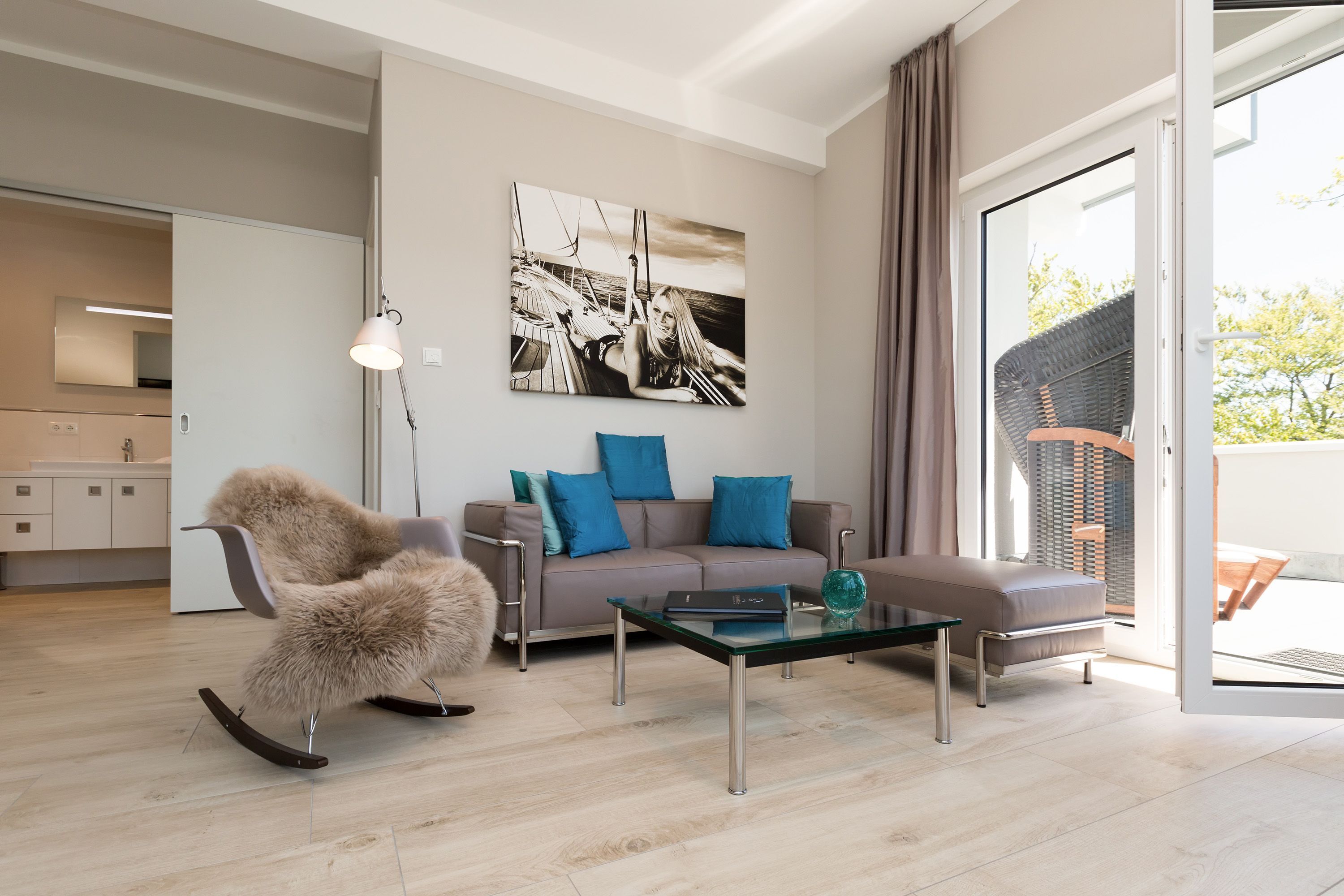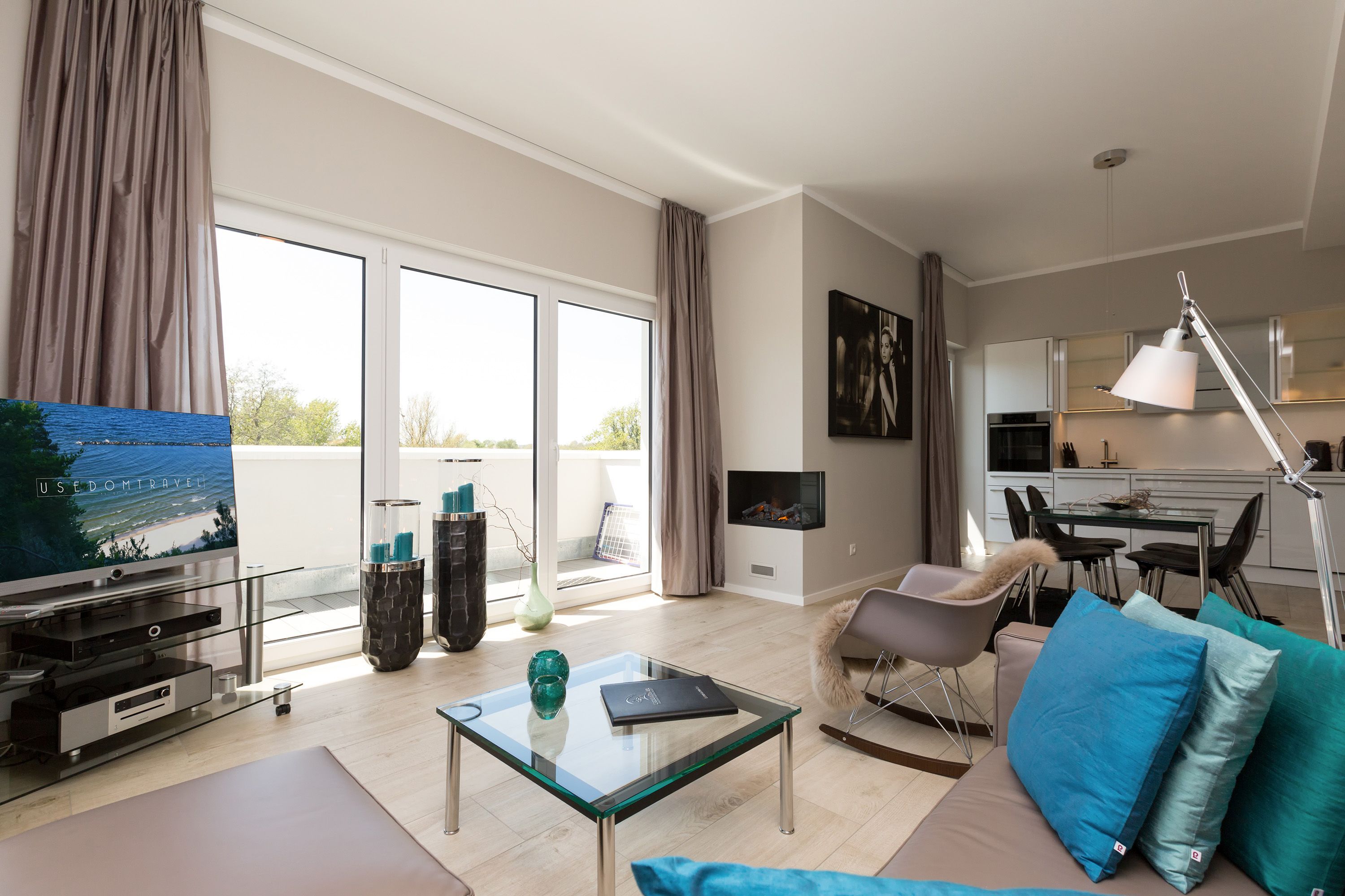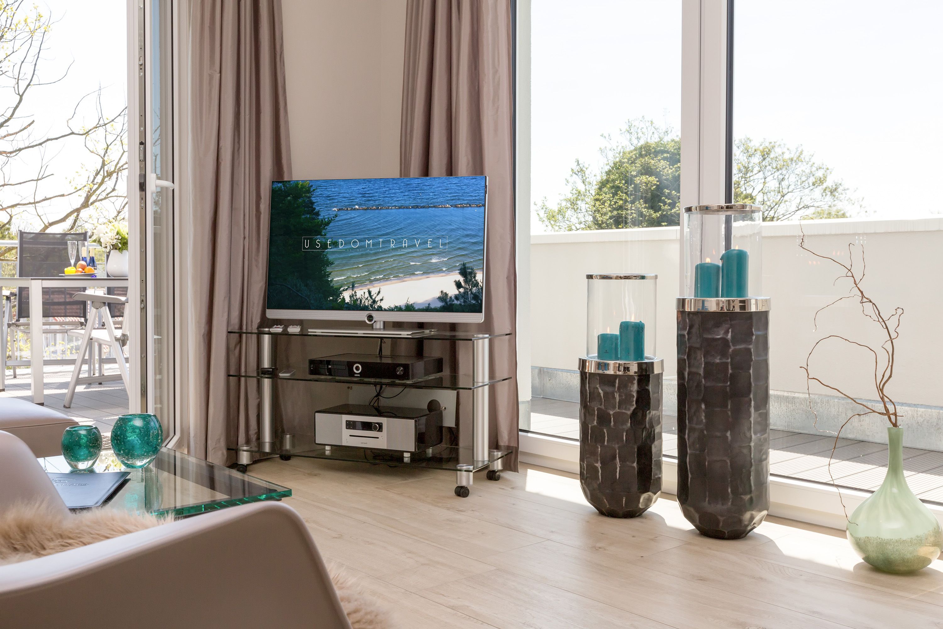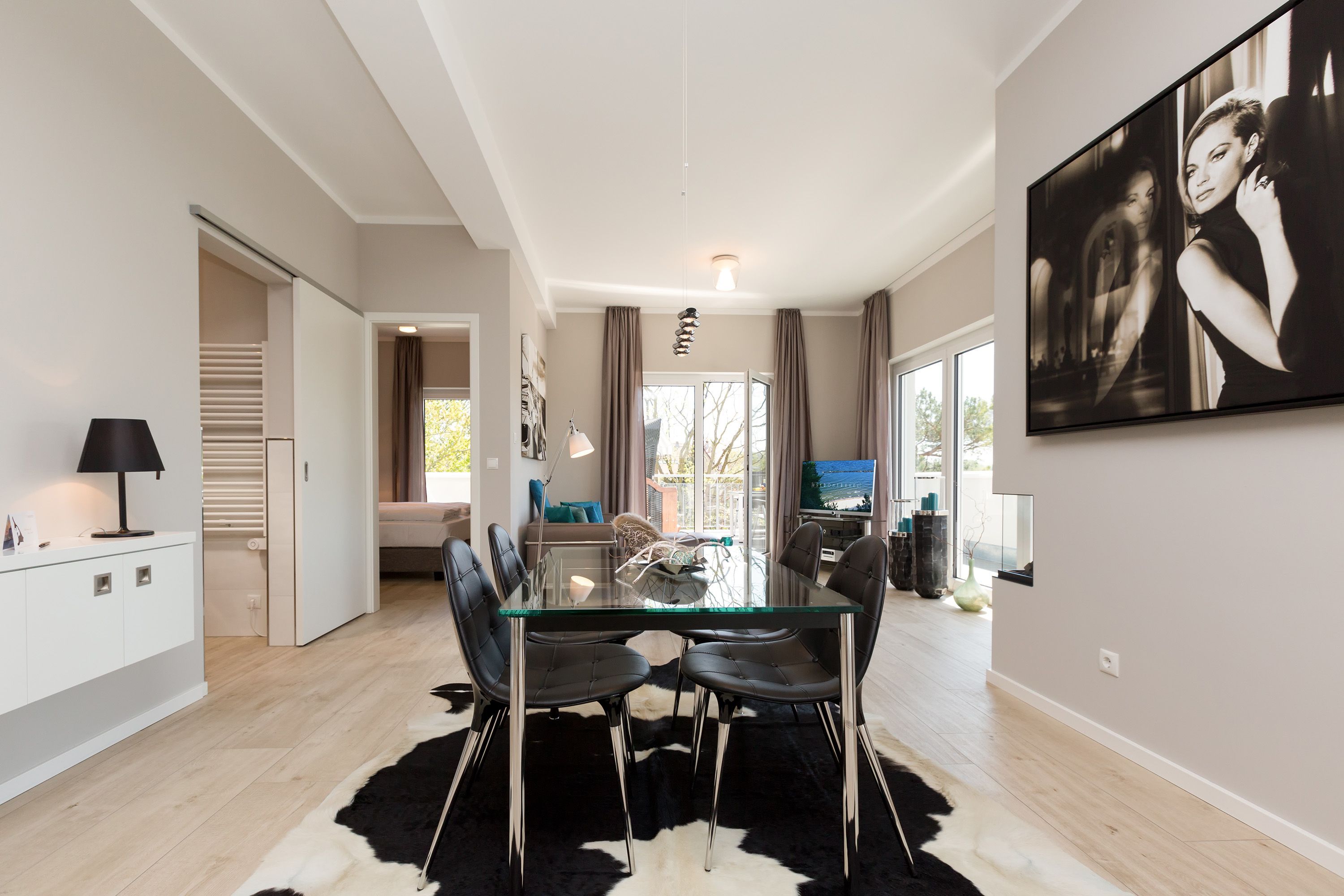 Design at it´s best! Im Appartement 21 genießen Sie Ihren Urlaub auf hohem Niveau. In dieser lichtdurchfluteten, luxuriösen 2-Raum-Ferienwohnung (64 qm) verstehen sich stylische Wohnelemente und wertiges Design von selbst. Abgestimmte Farben und Stoffe, ausgewählte Designermöbel von Cassina und die wunderschönen Fotocollagen sorgen für ein harmonisches Wohnerlebnis für 2 Personen und ein Kleinkind (im Babyreisebett). Der Eingangsbereich mit Garderobe öffnet sich und die offene, komplett ausgestattete Küche schließt sich an. Hier ist alles vorhanden, was ein Hobbykoch sich wünscht. Der schöne Essplatz ist der Mittelpunkt der Wohnung, hier lässt es sich besonders schön zusammen sitzen. Der Wohnbereich mit stylischer Couch und Flat-TV, Blue-Ray-Player und eine Hifi-Anlage mit ipod-Dock lädt zum Relaxen ein. Der moderne Elektrokamin schafft per Knopfdruck den perfekten Rahmen für einen kuschligen Abend. Das Schlafzimmer mit exklusivem Treca interiors Paris Doppelboxspringbett (1,80 x 2,00m), Flat-TV und wertigem Einbauschrank und ein Bad mit großer Dusche und WC ergänzt die Wohnung. Ein besonderes Highlight ihres Urlaubsdomizils ist die großzügige Ost-Süd-Dachterrasse. Mit Gartenmöbeln und gemütlichem Strandkorb ausgestattet, bietet sie schöne Ausblicke auf die Umgebung der Maxim-Gorki-Straße. Auch die Ostsee schimmert durch die Kiefern der Dünen. Erholung garantiert. Für Ihren Komfort sind die Betten bei der Anreise bezogen und Handtücher liegen bereit. Für kleine Gäste kann ein Kinderreisebett und ein Kinderhochstuhl (gegen Gebühr) bestellt werden. Ein Pkw-Stellplatz steht in der Tiefgarage zur Verfügung (max. Einfahrtshöhe 1,93 m).