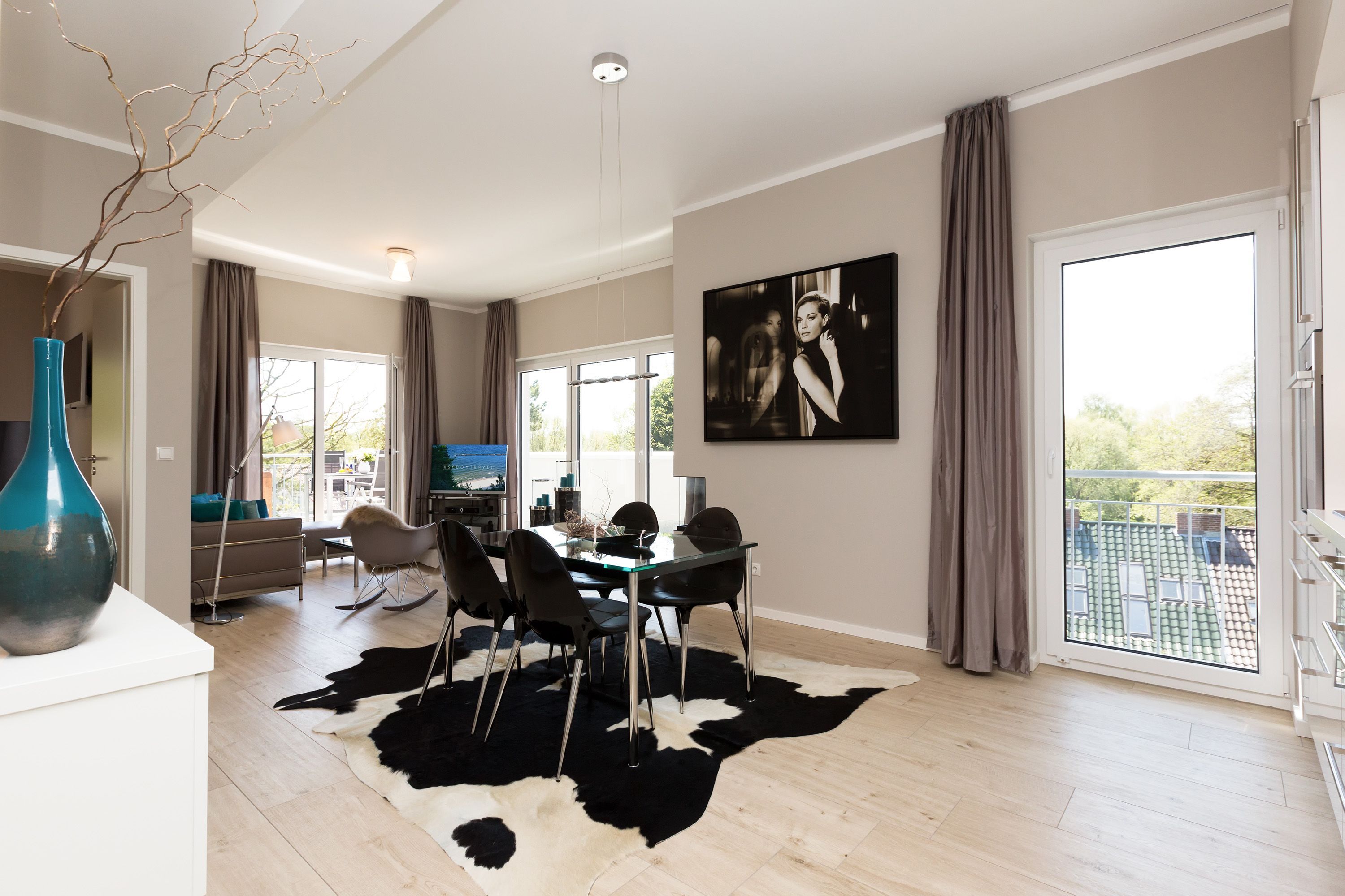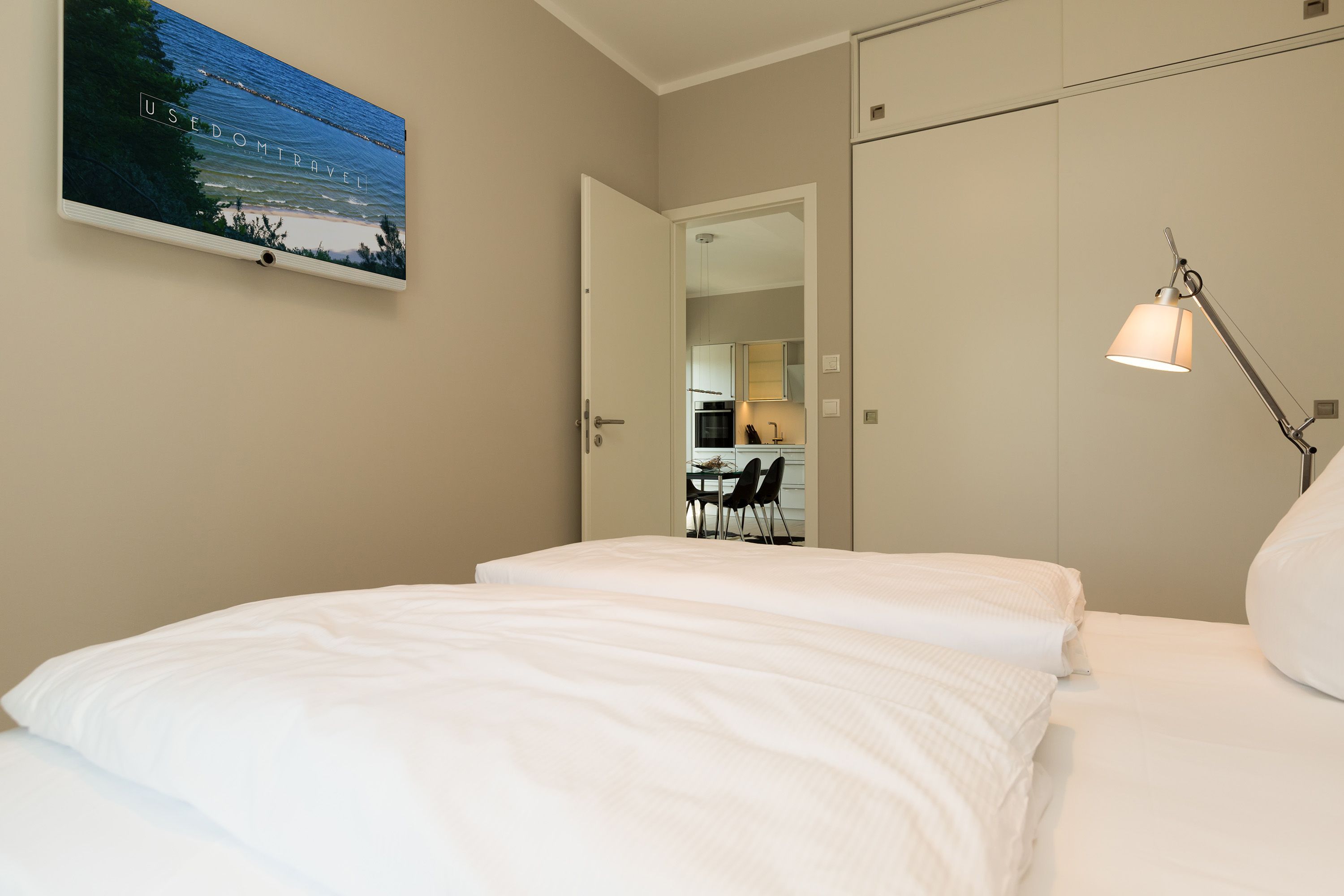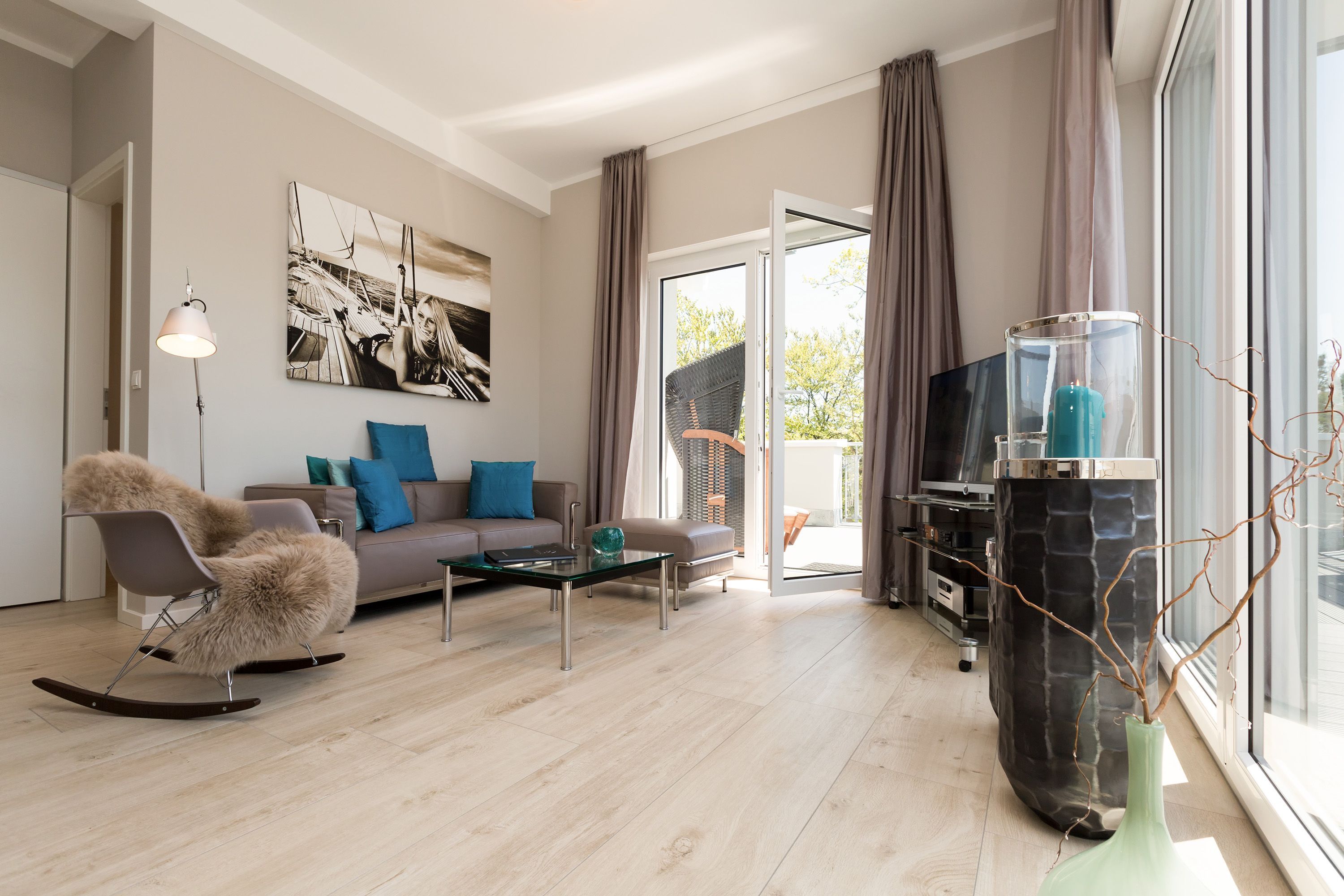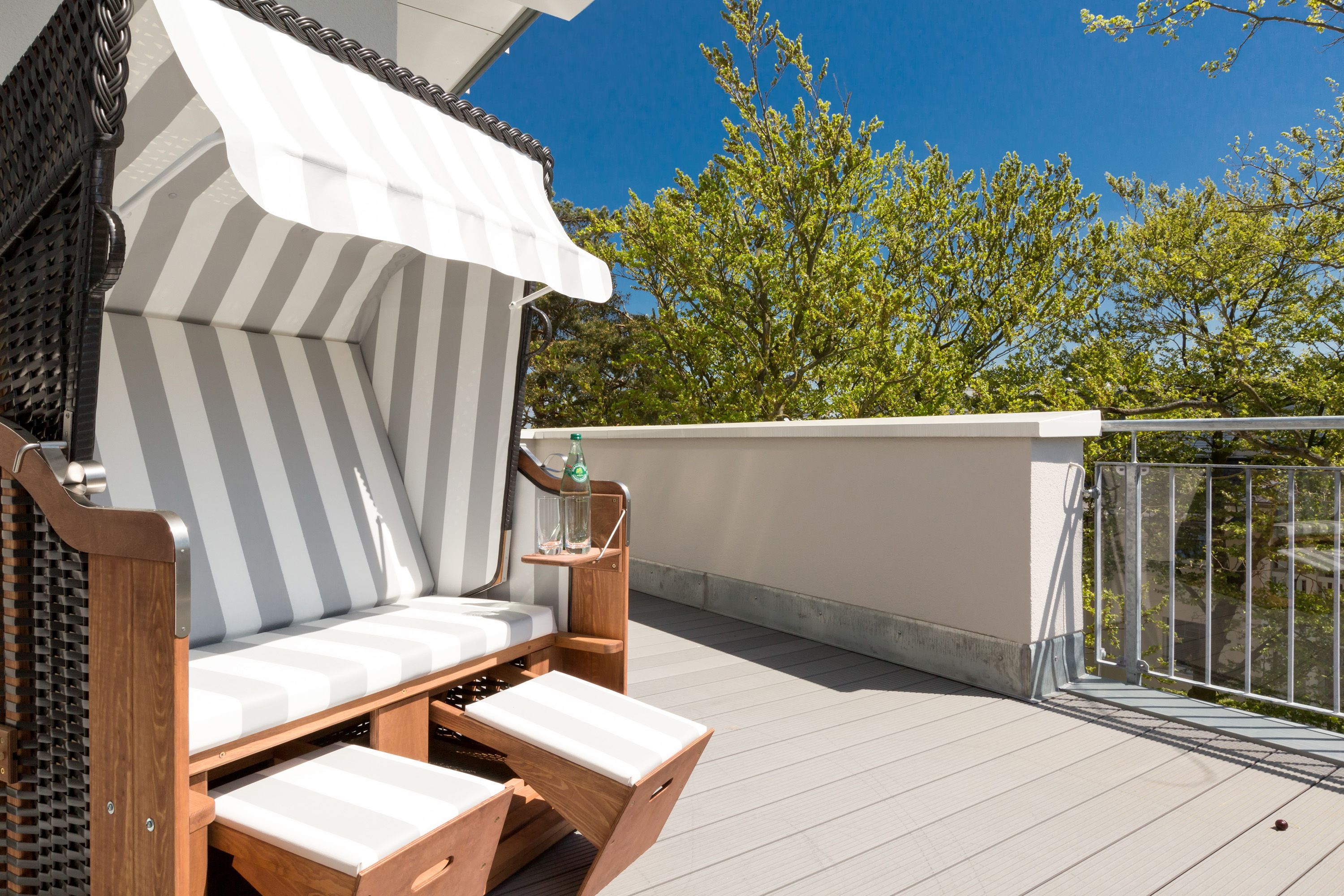 Design at it´s best! Im Appartement 21 genießen Sie Ihren Urlaub auf hohem Niveau. In dieser lichtdurchfluteten, luxuriösen 2-Raum-Ferienwohnung (64 qm) verstehen sich stylische Wohnelemente und wertiges Design von selbst. Abgestimmte Farben und Stoffe, ausgewählte Designermöbel von Cassina und die wunderschönen Fotocollagen sorgen für ein harmonisches Wohnerlebnis für 2 Personen und ein Kleinkind (im Babyreisebett). Der Eingangsbereich mit Garderobe öffnet sich und die offene, komplett ausgestattete Küche schließt sich an. Hier ist alles vorhanden, was ein Hobbykoch sich wünscht. Der schöne Essplatz ist der Mittelpunkt der Wohnung, hier lässt es sich besonders schön zusammen sitzen. Der Wohnbereich mit stylischer Couch und Flat-TV, Blue-Ray-Player und eine Hifi-Anlage mit ipod-Dock lädt zum Relaxen ein. Der moderne Elektrokamin schafft per Knopfdruck den perfekten Rahmen für einen kuschligen Abend. Das Schlafzimmer mit exklusivem Treca interiors Paris Doppelboxspringbett (1,80 x 2,00m), Flat-TV und wertigem Einbauschrank und ein Bad mit großer Dusche und WC ergänzt die Wohnung. Ein besonderes Highlight ihres Urlaubsdomizils ist die großzügige Ost-Süd-Dachterrasse. Mit Gartenmöbeln und gemütlichem Strandkorb ausgestattet, bietet sie schöne Ausblicke auf die Umgebung der Maxim-Gorki-Straße. Auch die Ostsee schimmert durch die Kiefern der Dünen. Erholung garantiert. Für Ihren Komfort sind die Betten bei der Anreise bezogen und Handtücher liegen bereit. Für kleine Gäste kann ein Kinderreisebett und ein Kinderhochstuhl (gegen Gebühr) bestellt werden. Ein Pkw-Stellplatz steht in der Tiefgarage zur Verfügung (max. Einfahrtshöhe 1,93 m).